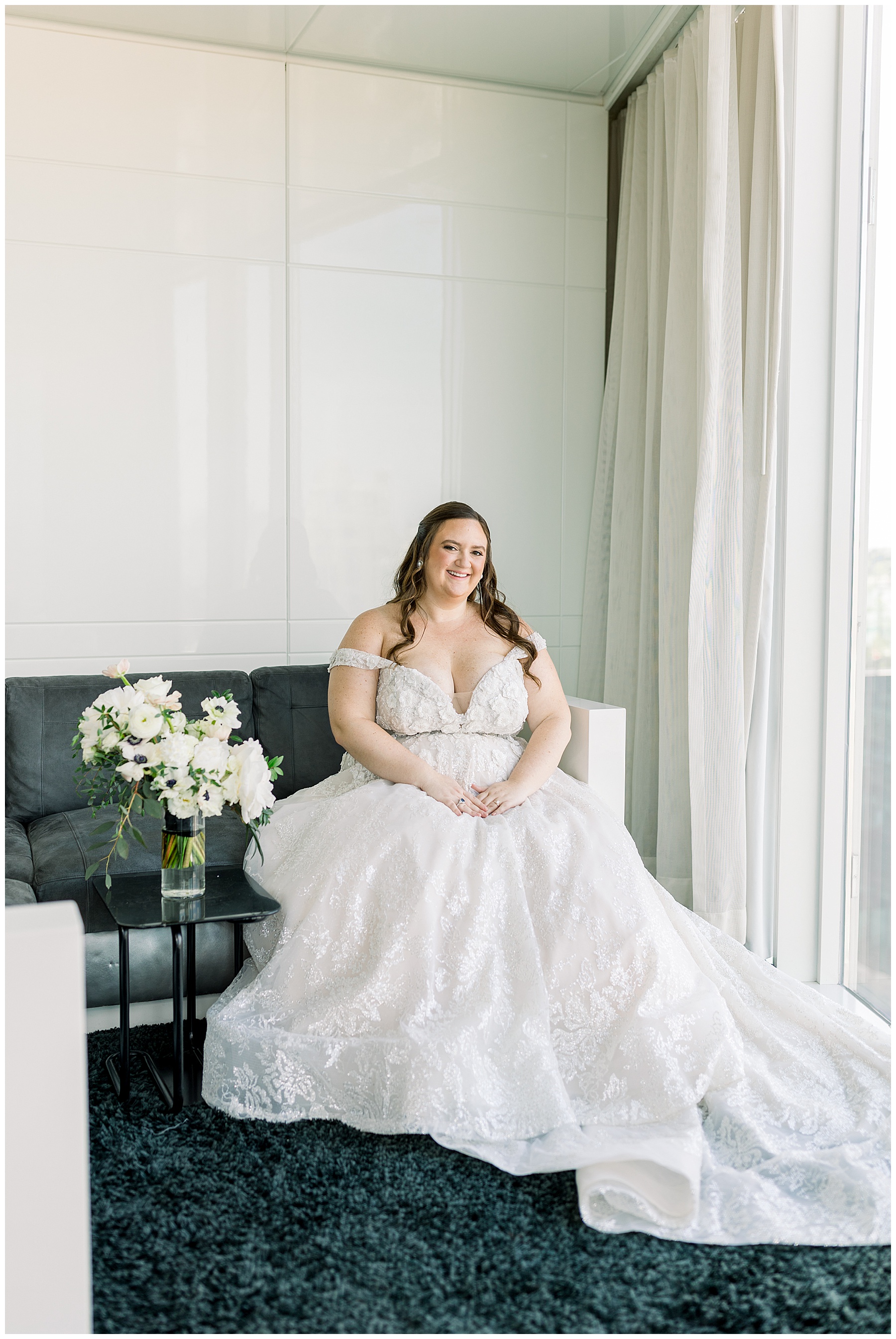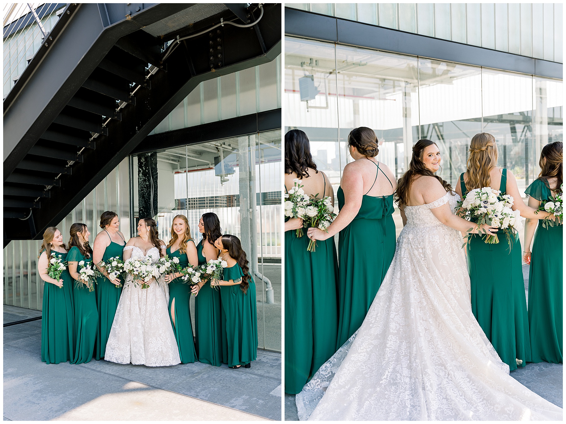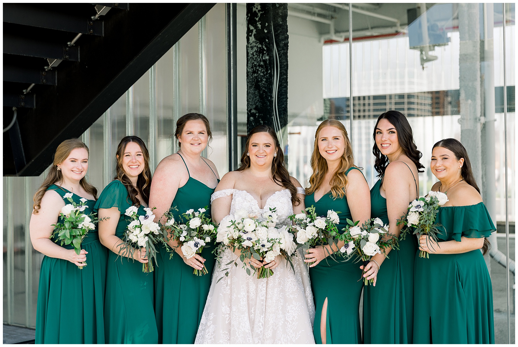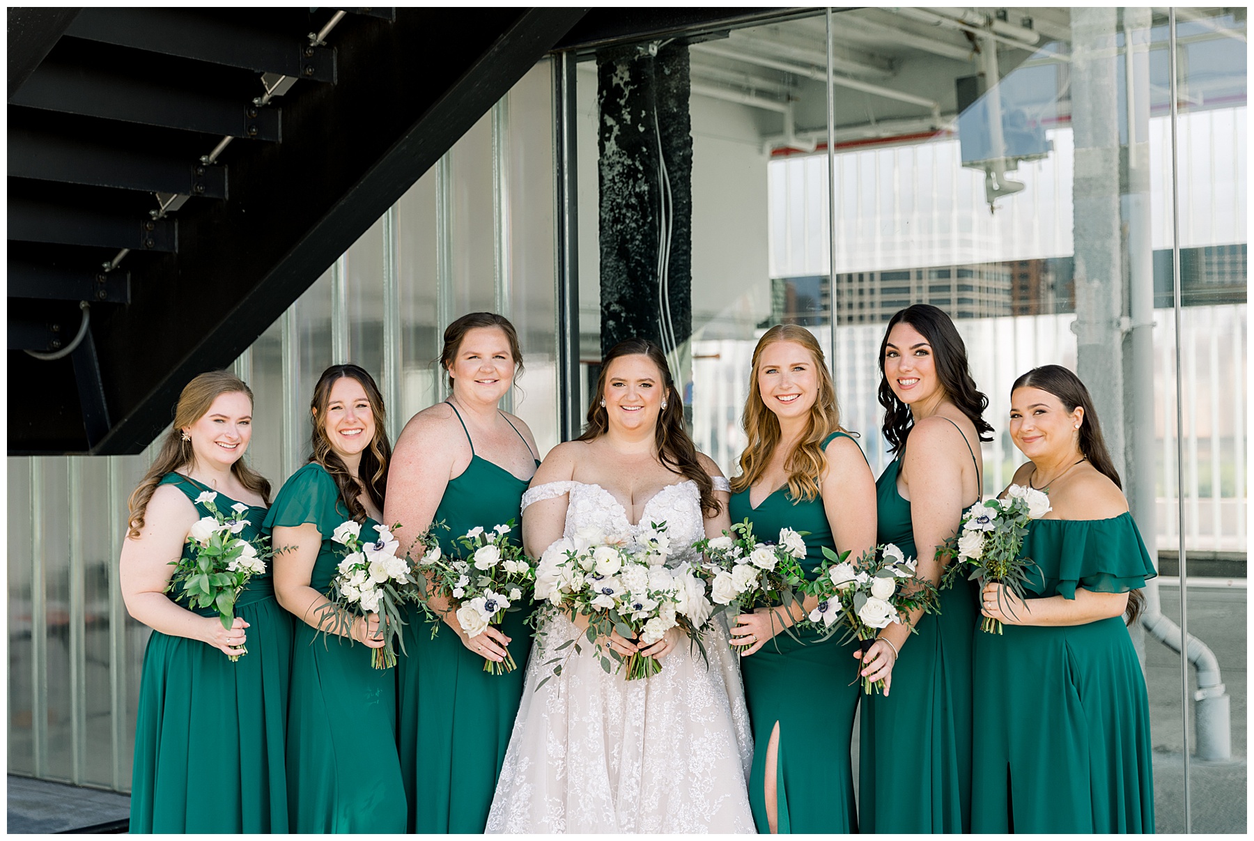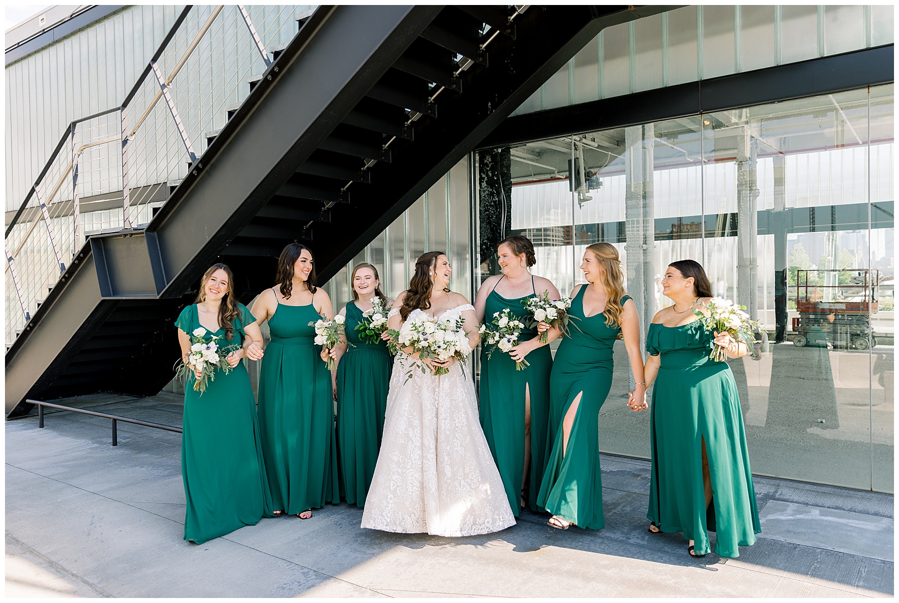 All of Carleigh’s bridesmaids were so sweet & fun, and I also loved including Carleigh’s brand-new nephew, Everette, in some of the photos! The Empire Suite’s black/white interior was a perfect compliment to their wedding color palette! Next, we headed over to the venue to photograph all the Bridesmaids photos, and found the coolest black staircase to incorporate more of the black color scheme & city/urban vibes into the photos. (Plus thank GOD for the shade!!!) I just love how unique those photos turned out! :)