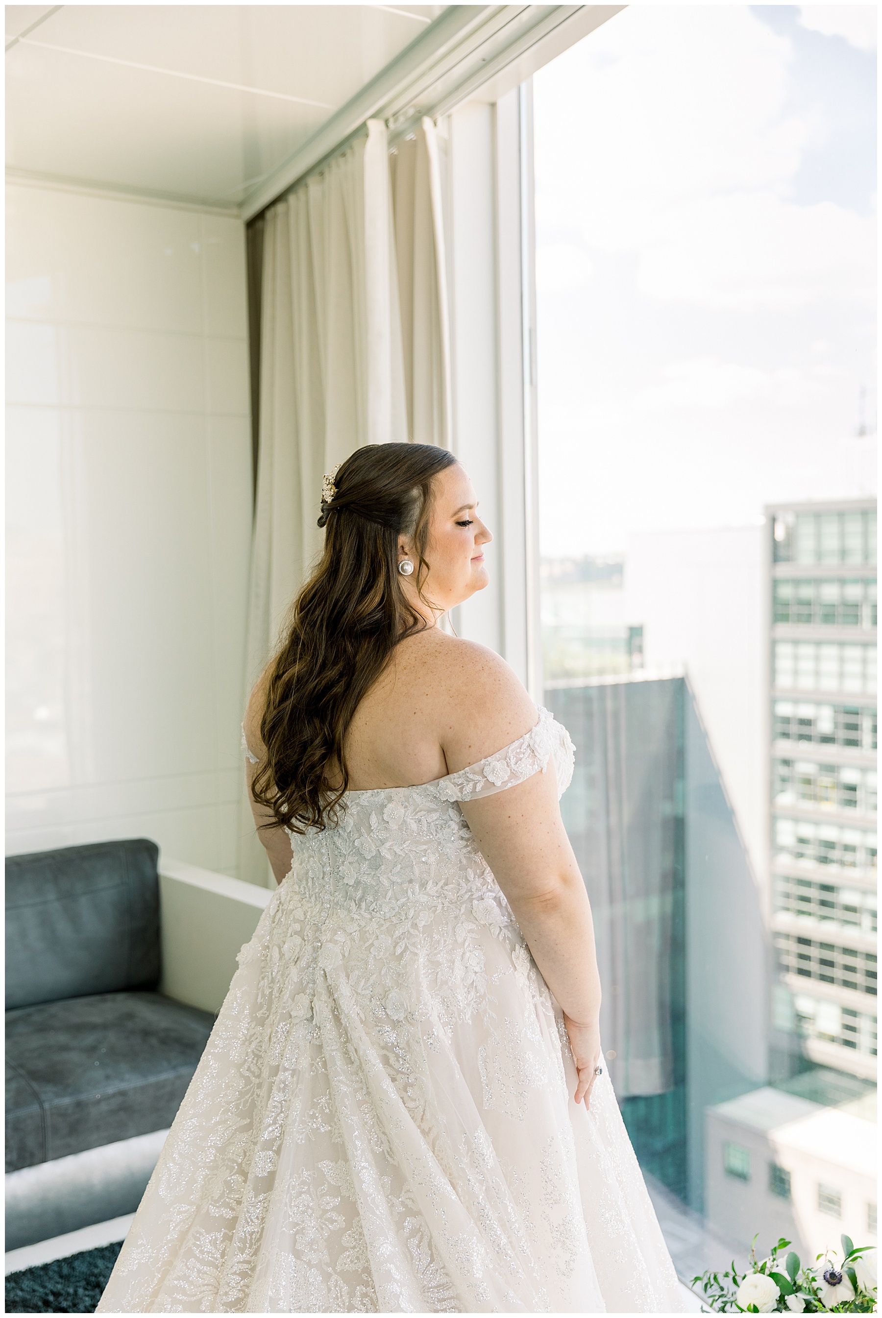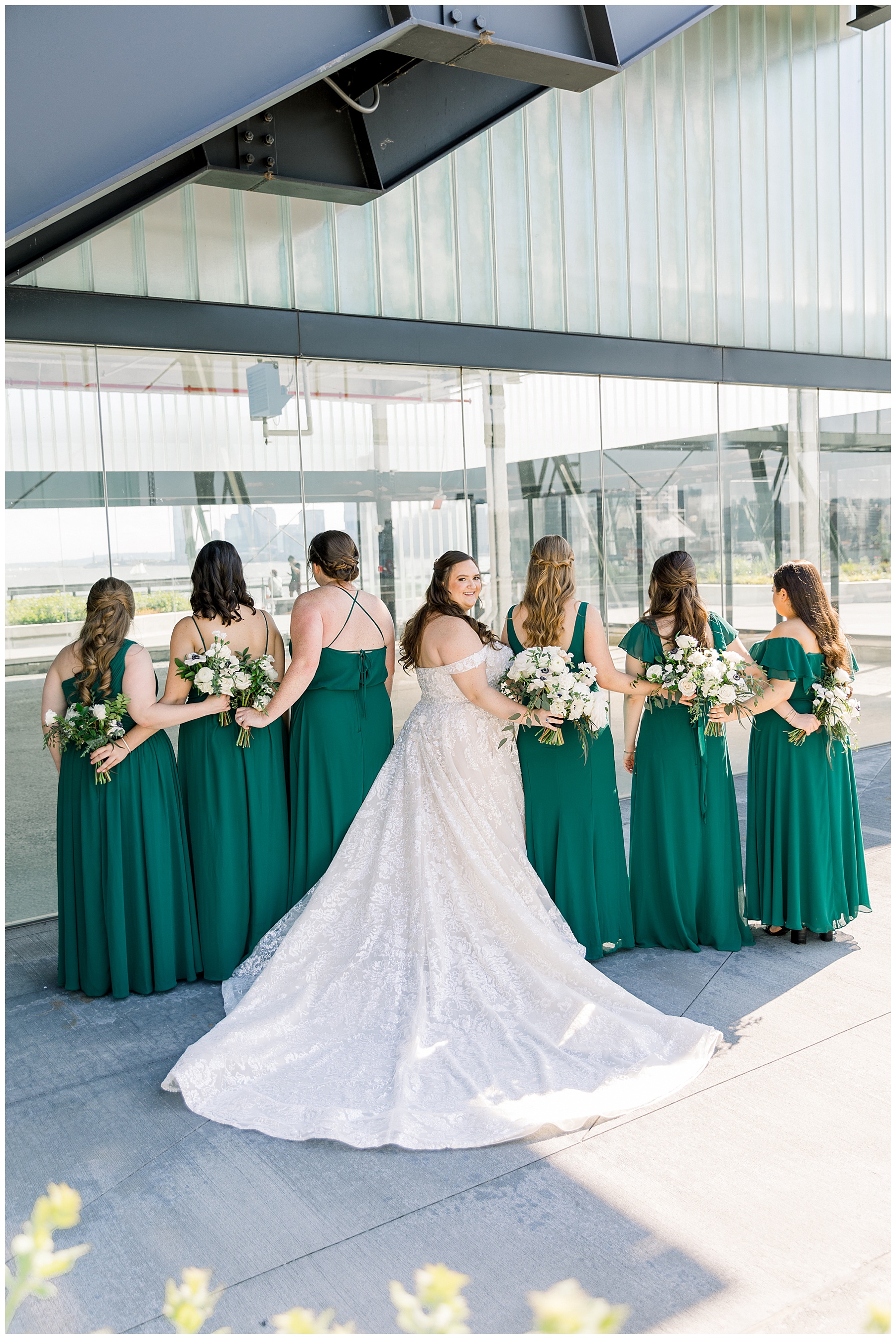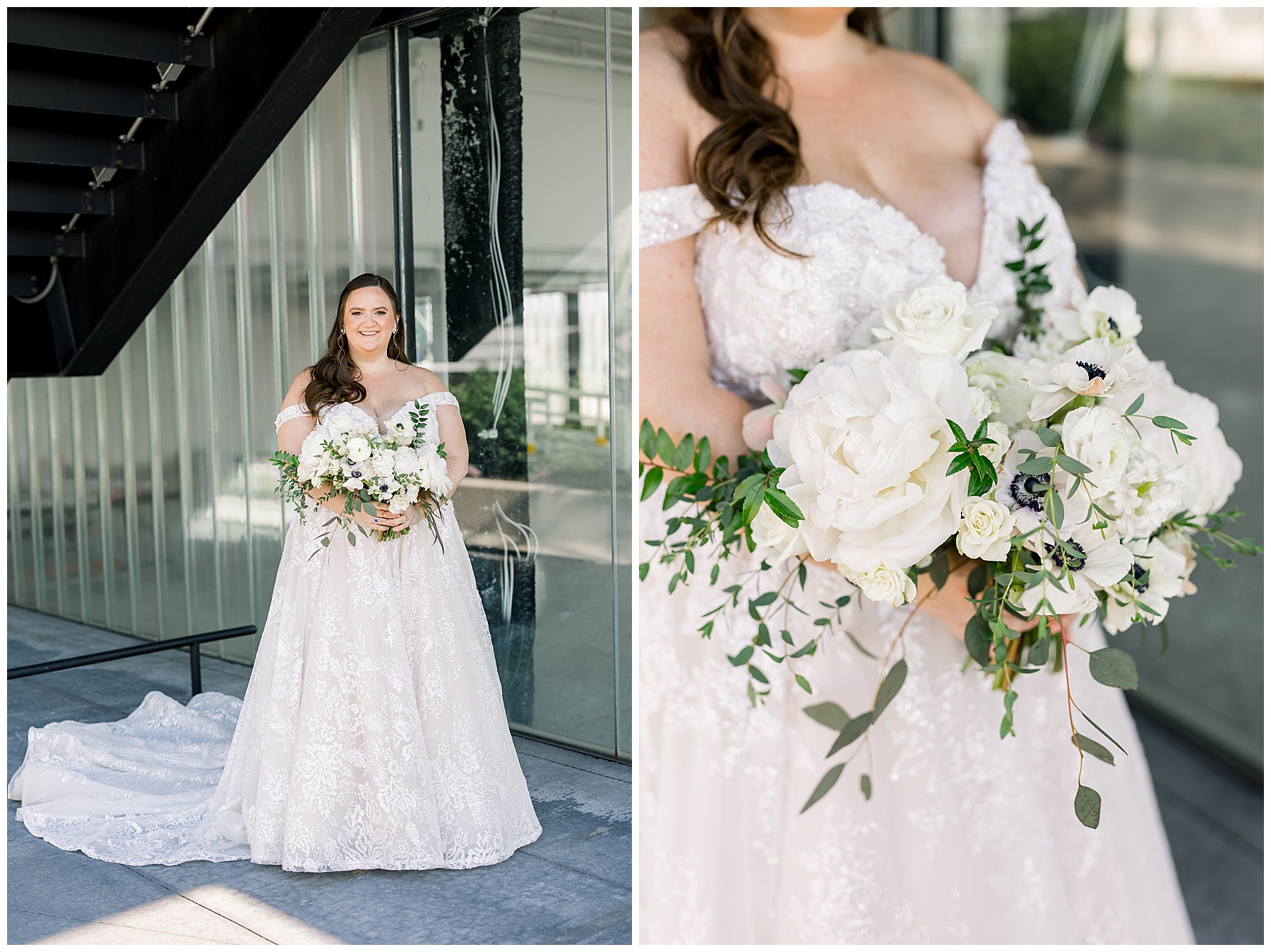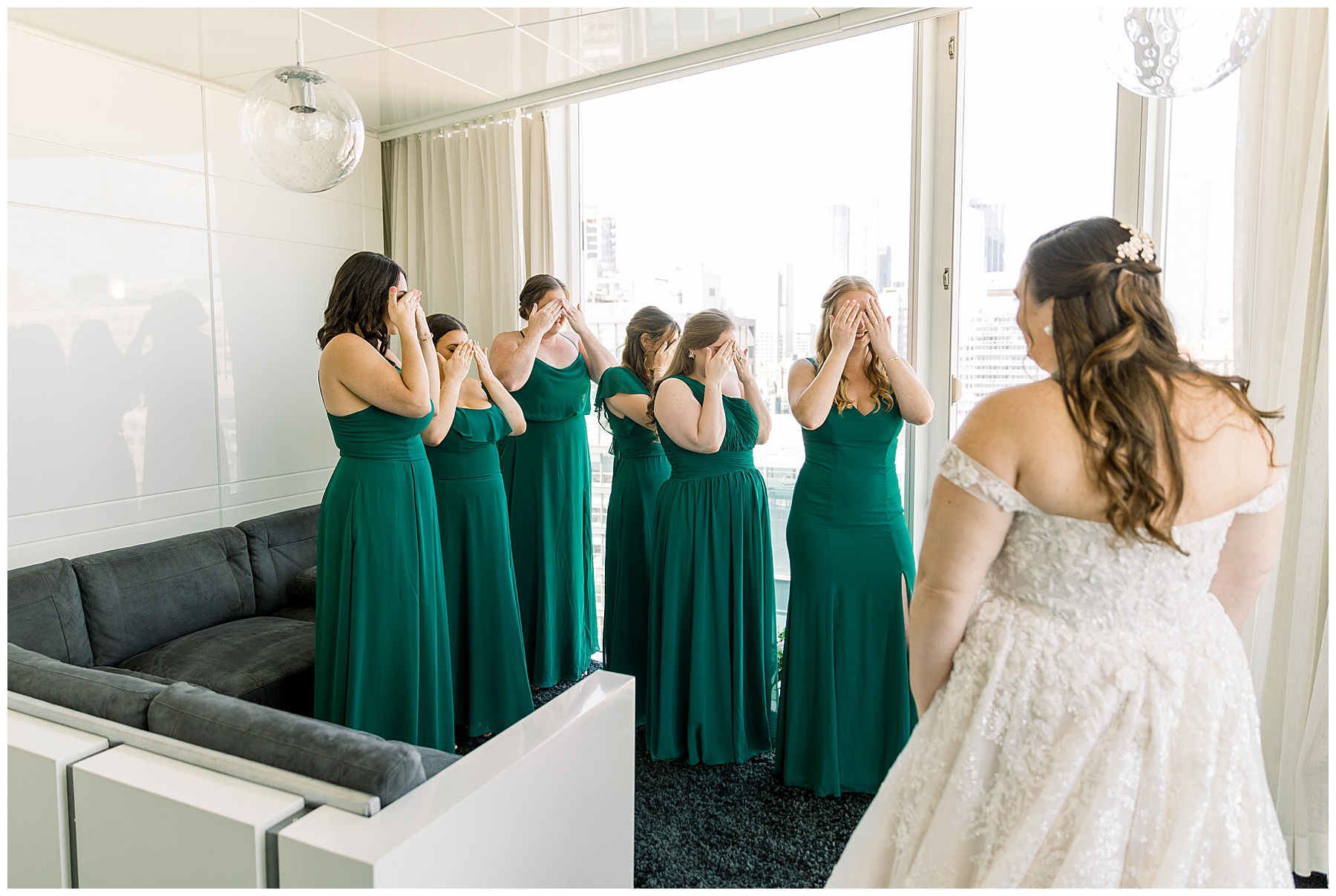All of Carleigh’s bridesmaids were so sweet & fun, and I also loved including Carleigh’s brand-new nephew, Everette, in some of the photos! The Empire Suite’s black/white interior was a perfect compliment to their wedding color palette! Next, we headed over to the venue to photograph all the Bridesmaids photos, and found the coolest black staircase to incorporate more of the black color scheme & city/urban vibes into the photos. (Plus thank GOD for the shade!!!) I just love how unique those photos turned out! :)