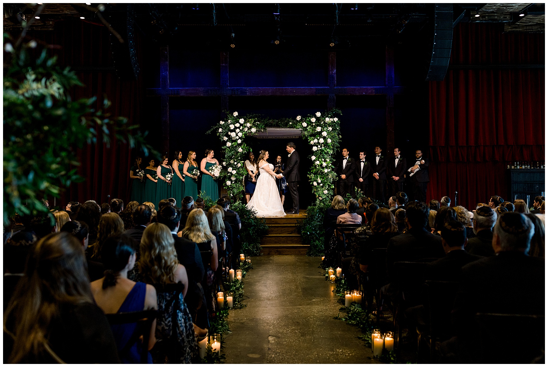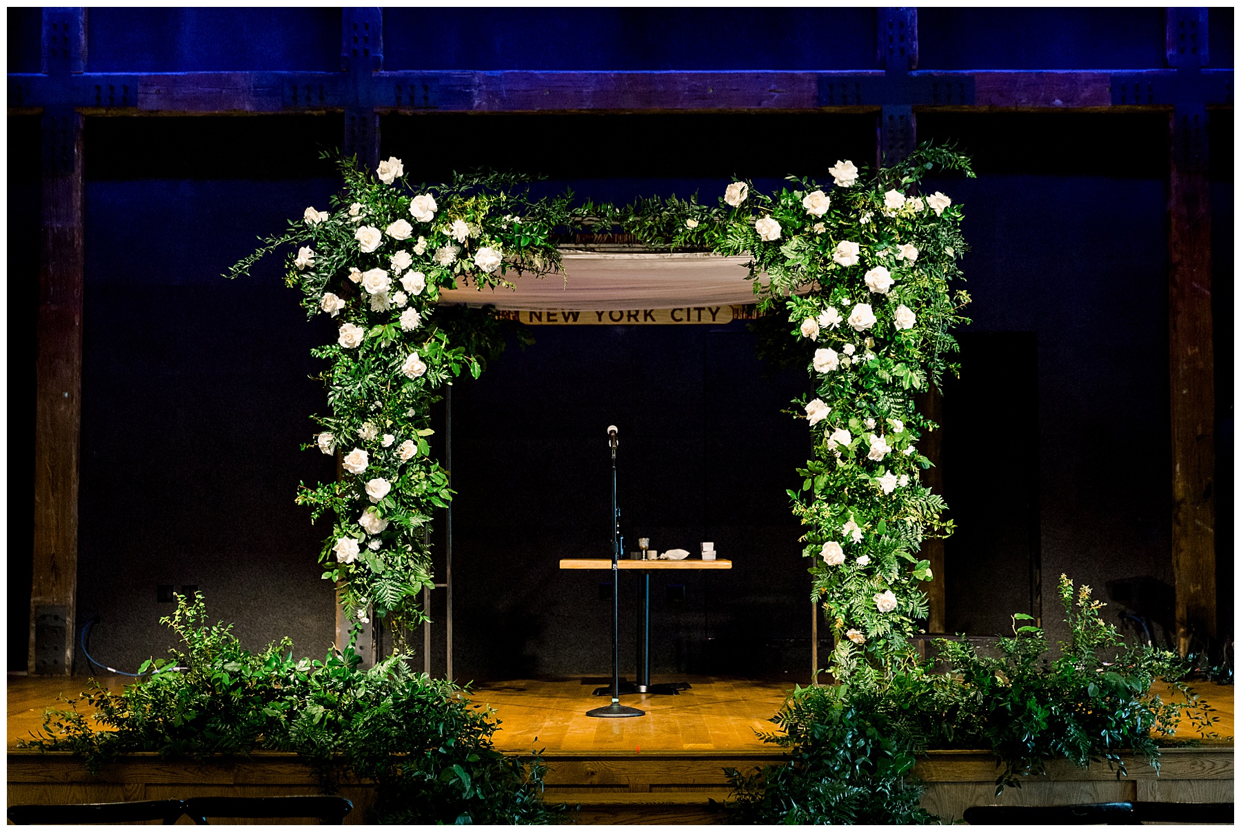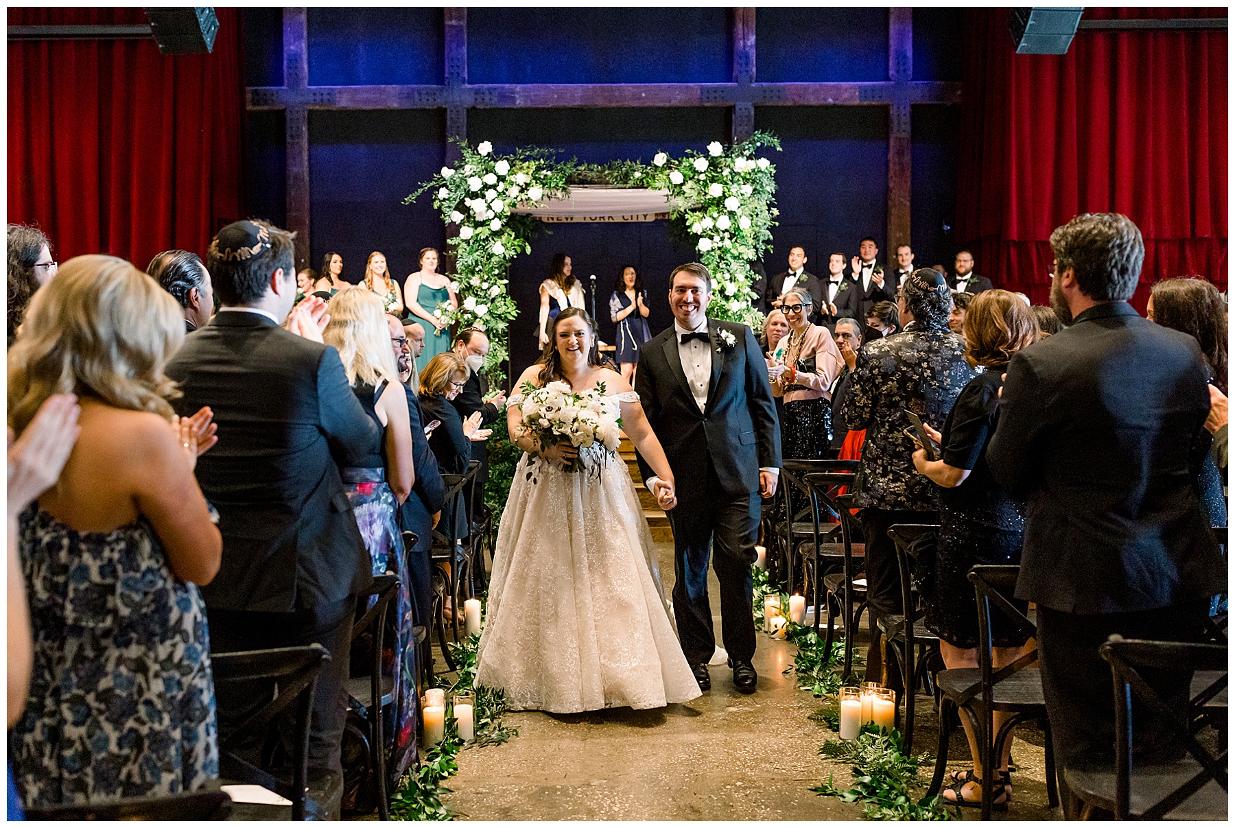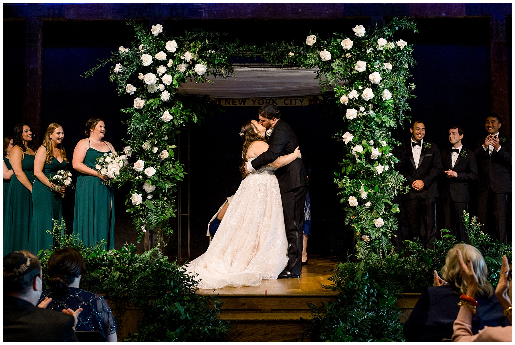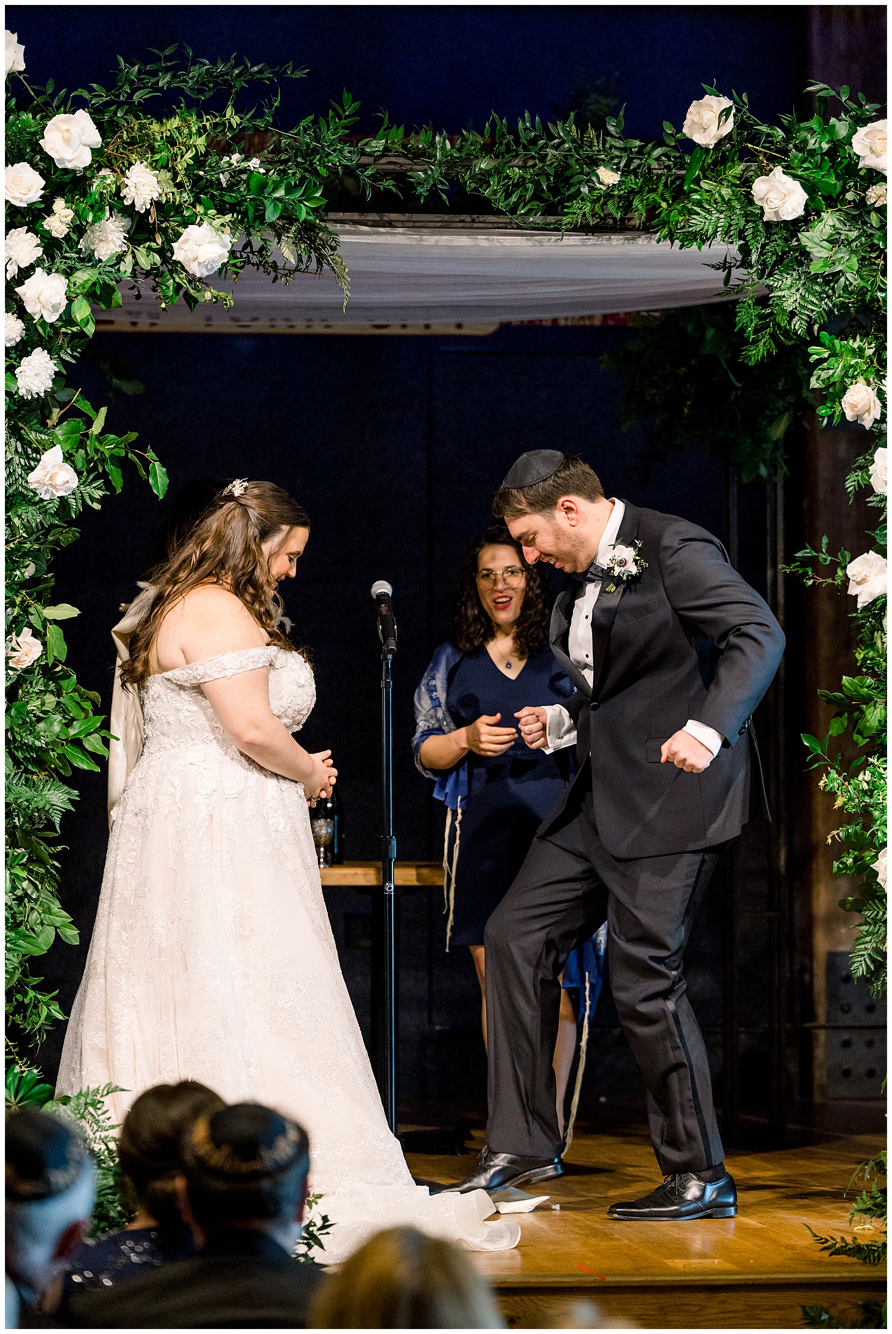 City Winery was transformed from the night before being a concert venue – into a beautiful Jewish wedding ceremony space. The chuppah was covered in greenery & white roses, and I especially loved how the stairs up to the stage were covered in greenery – so romantic. We had educated ourselves in some of the Jewish wedding traditions, and were excited to experience our first Jewish ceremony. There is so much tradition and family included into the ceremony – making it so meaningful and special. All the guests laughed when Carleigh & Ian had chosen a line from a Beyonce song to be quoted during the ceremony – and the whole ceremony was just really custom to be 100% “them”. Ian was most looking forward to stomping on the glass (be sure to see their beautiful custom glass they had made especially for this!)