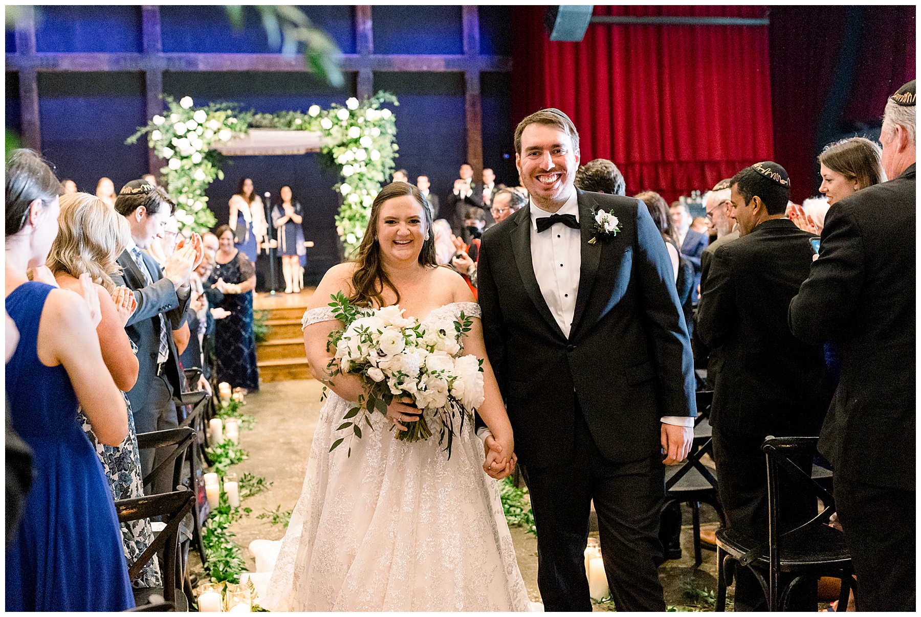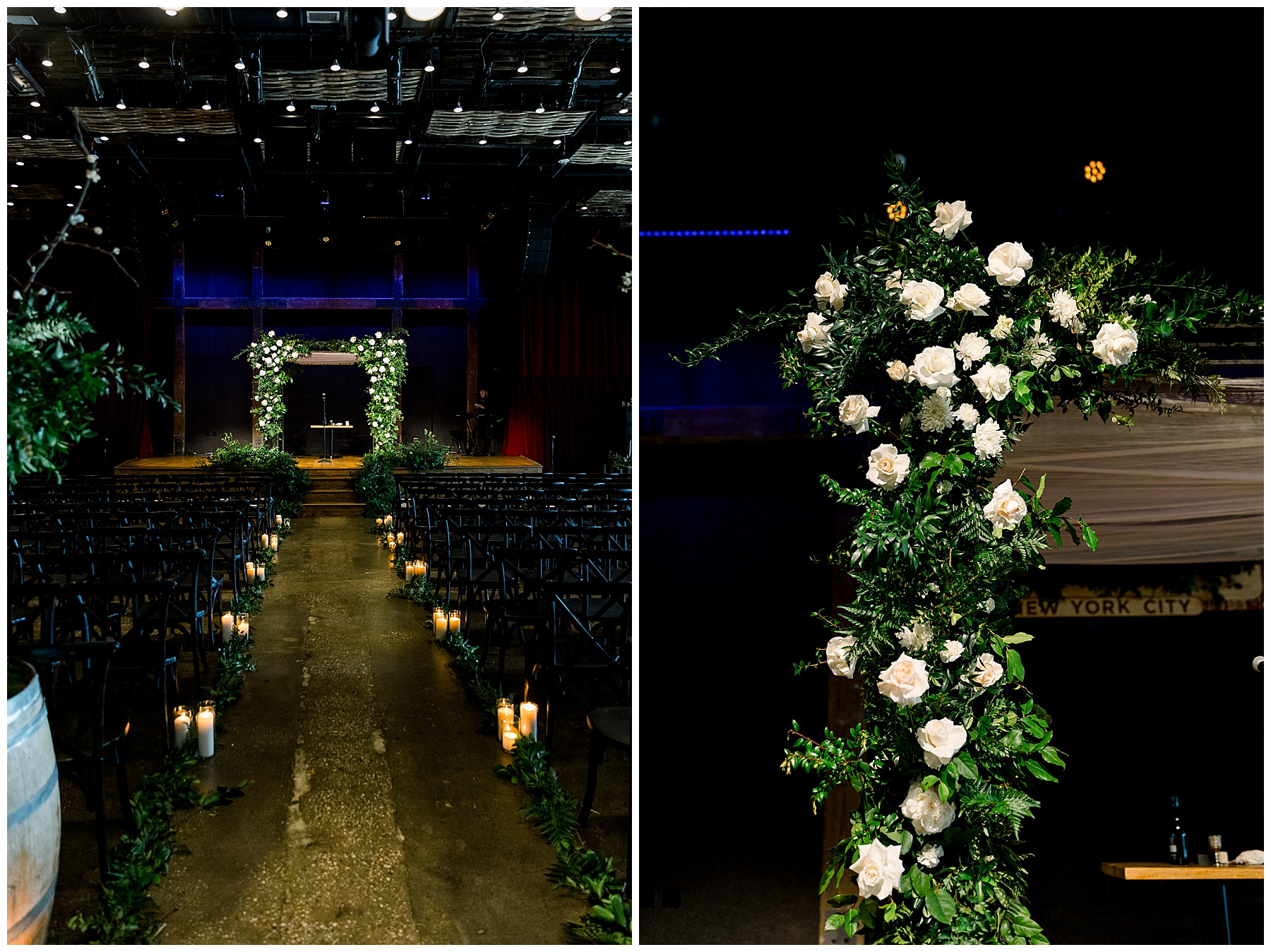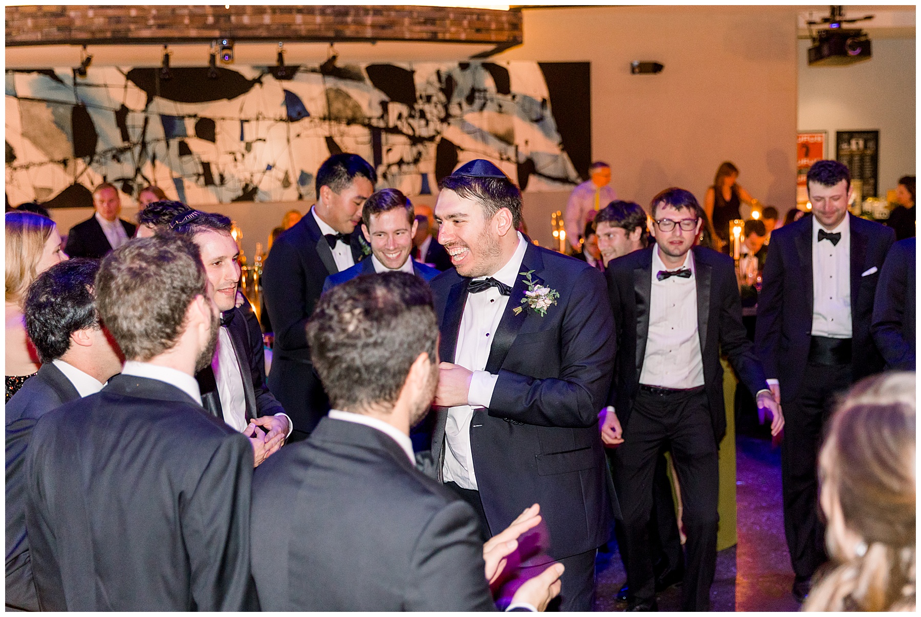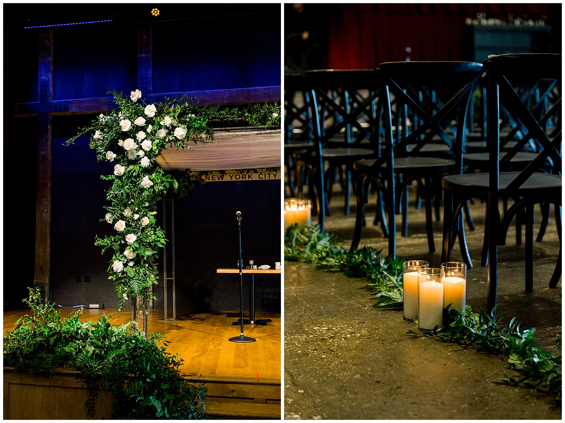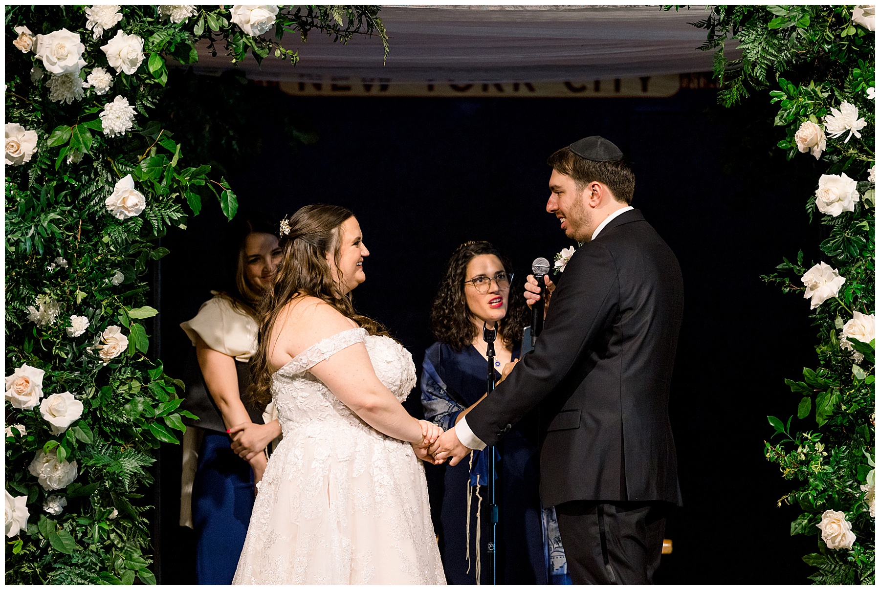 City Winery was transformed from the night before being a concert venue – into a beautiful Jewish wedding ceremony space. The chuppah was covered in greenery & white roses, and I especially loved how the stairs up to the stage were covered in greenery – so romantic. We had educated ourselves in some of the Jewish wedding traditions, and were excited to experience our first Jewish ceremony. There is so much tradition and family included into the ceremony – making it so meaningful and special. All the guests laughed when Carleigh & Ian had chosen a line from a Beyonce song to be quoted during the ceremony – and the whole ceremony was just really custom to be 100% “them”. Ian was most looking forward to stomping on the glass (be sure to see their beautiful custom glass they had made especially for this!)