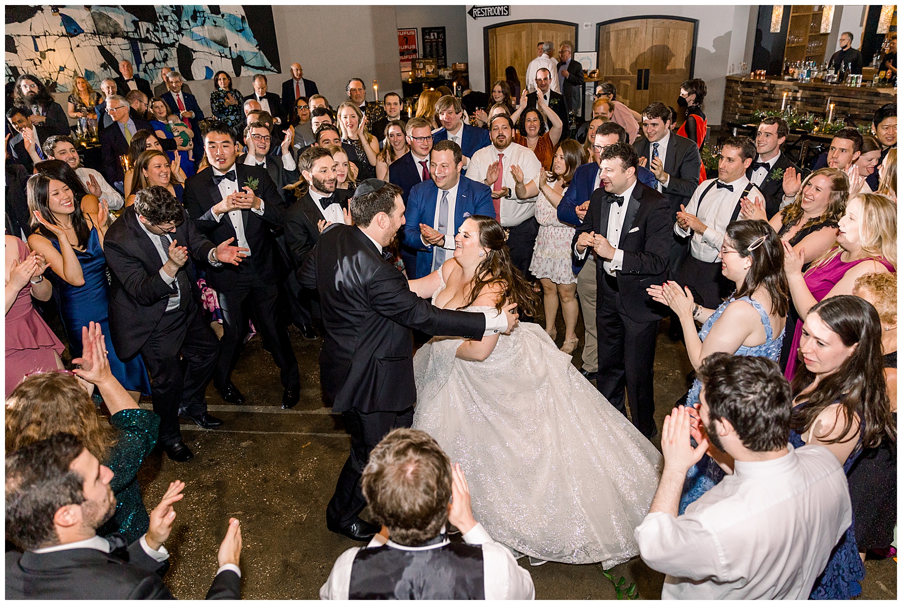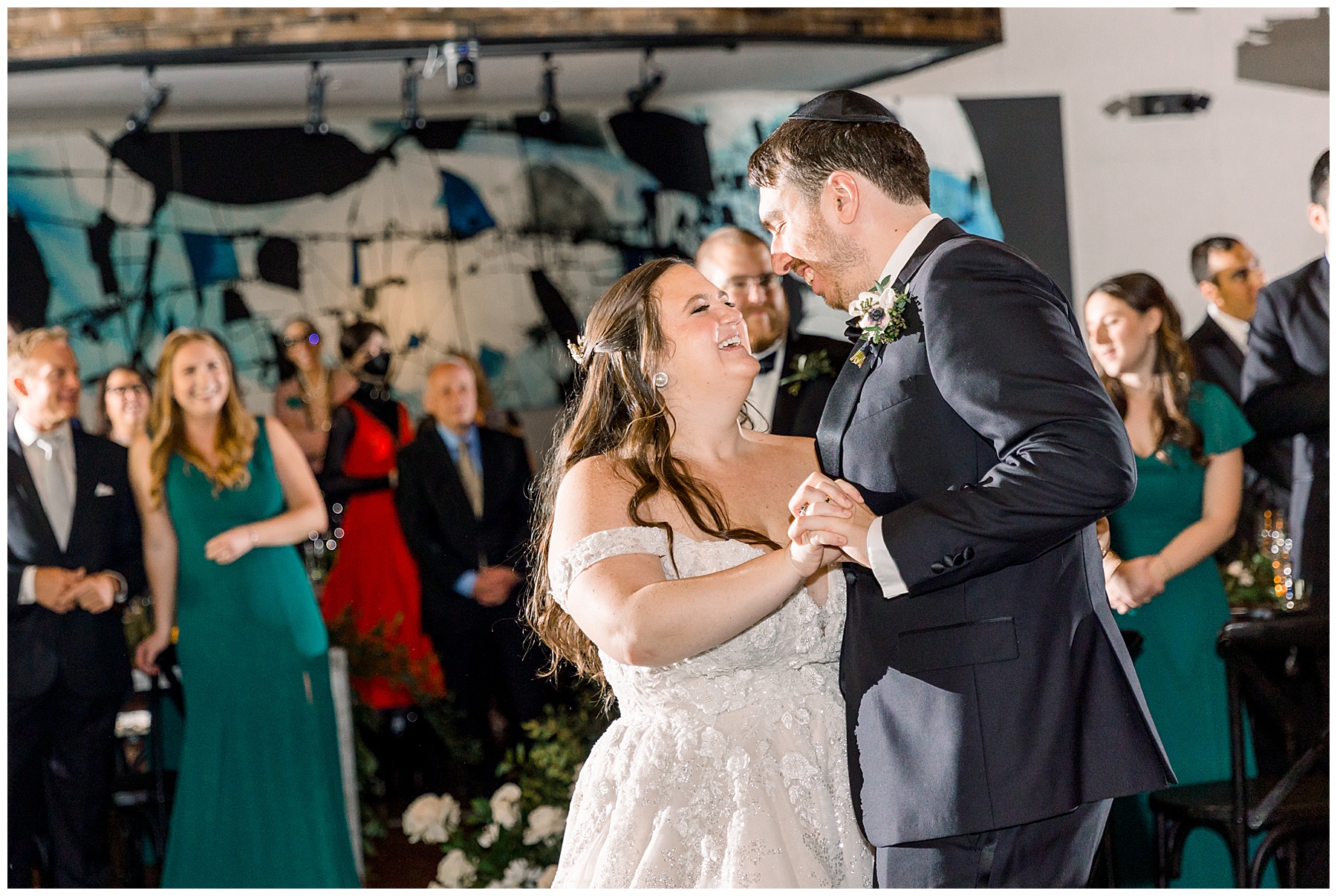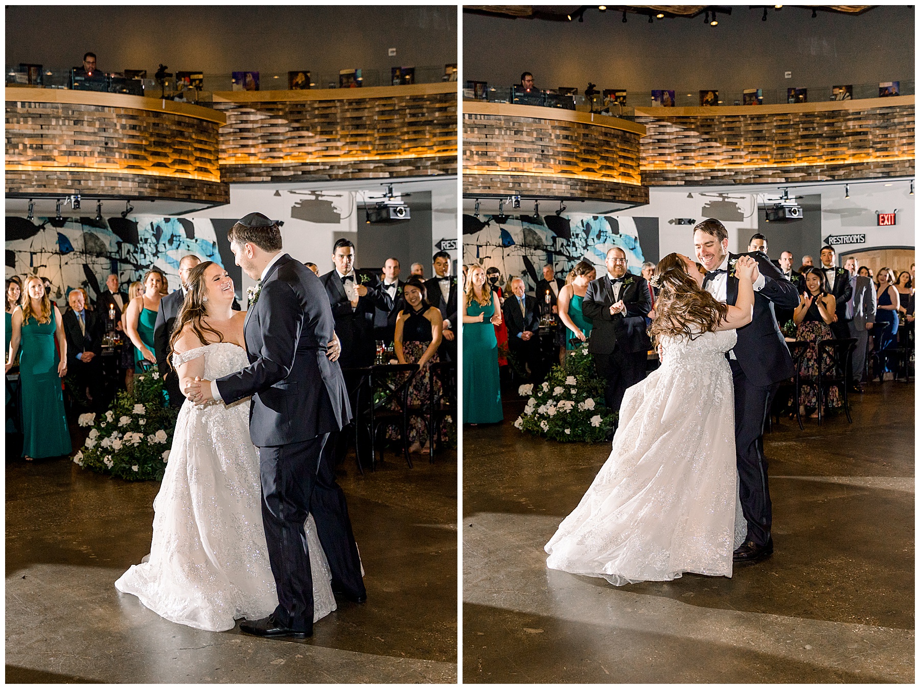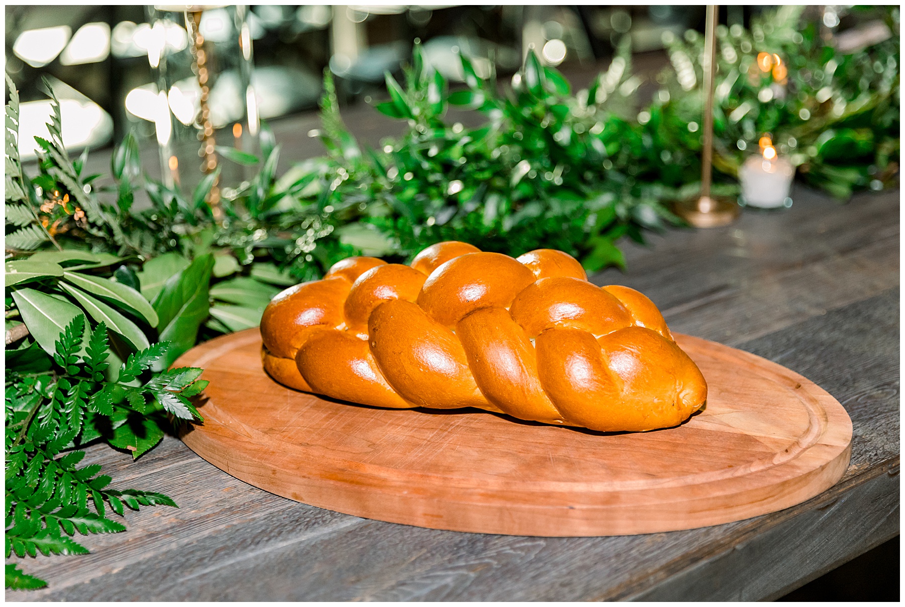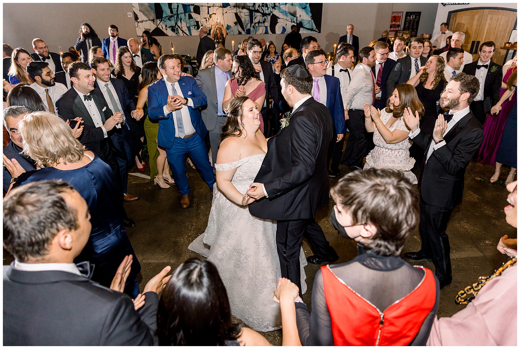 City Winery was transformed from the night before being a concert venue – into a beautiful Jewish wedding ceremony space. The chuppah was covered in greenery & white roses, and I especially loved how the stairs up to the stage were covered in greenery – so romantic. We had educated ourselves in some of the Jewish wedding traditions, and were excited to experience our first Jewish ceremony. There is so much tradition and family included into the ceremony – making it so meaningful and special. All the guests laughed when Carleigh & Ian had chosen a line from a Beyonce song to be quoted during the ceremony – and the whole ceremony was just really custom to be 100% “them”. Ian was most looking forward to stomping on the glass (be sure to see their beautiful custom glass they had made especially for this!)