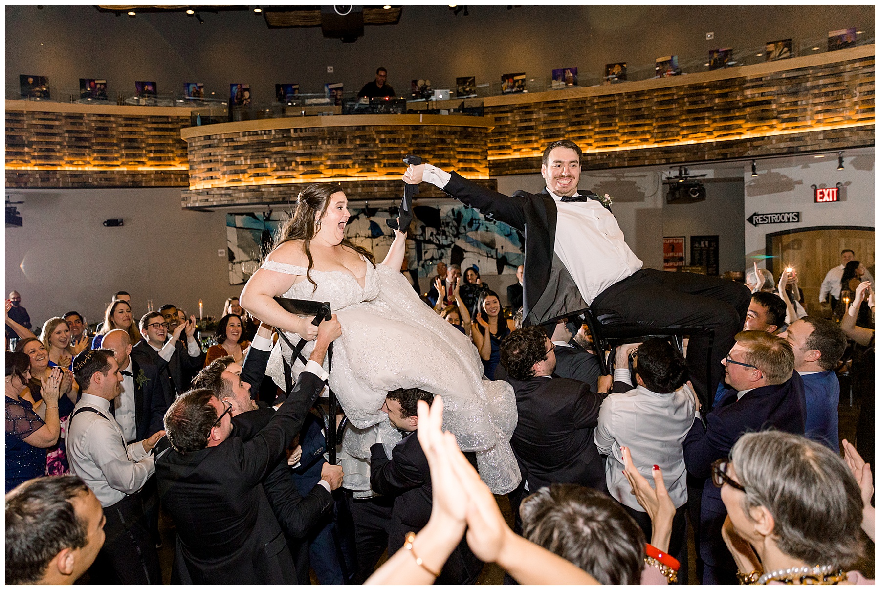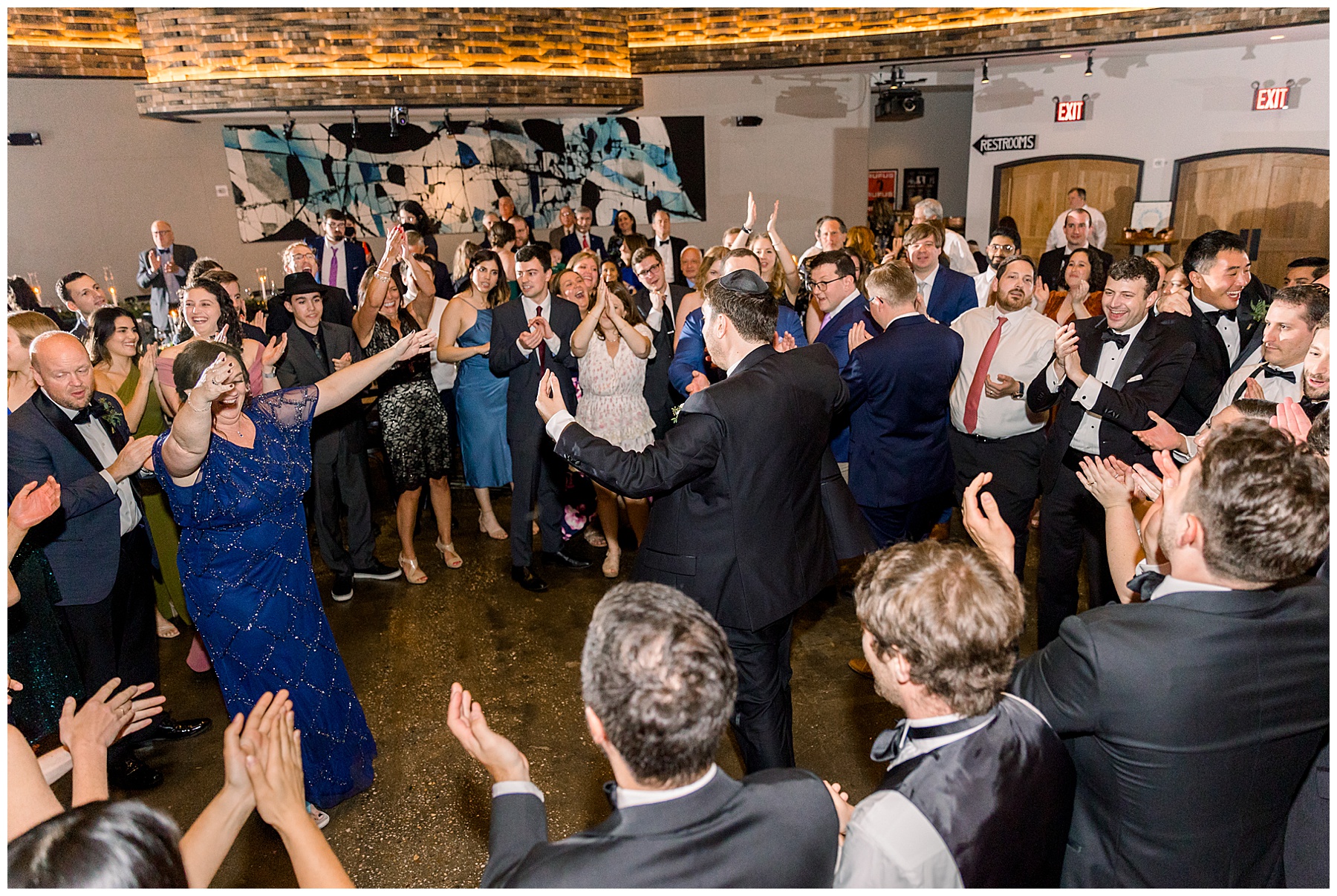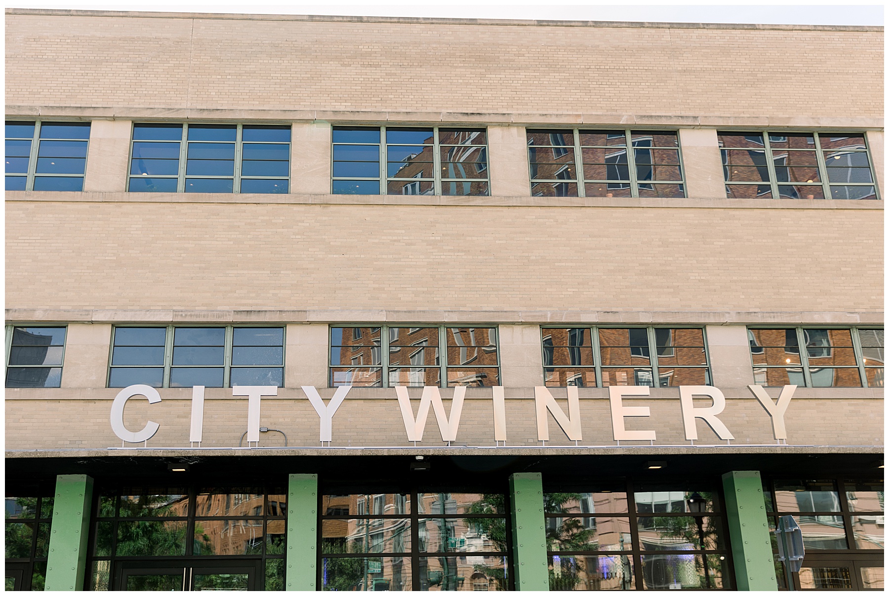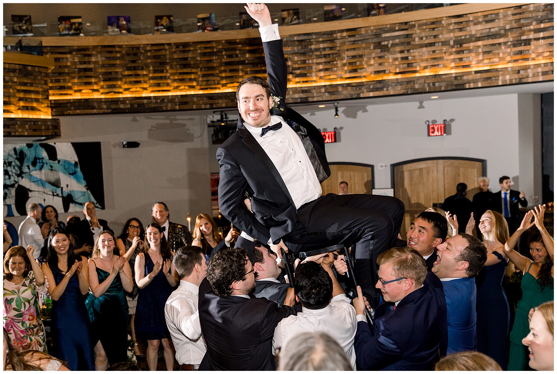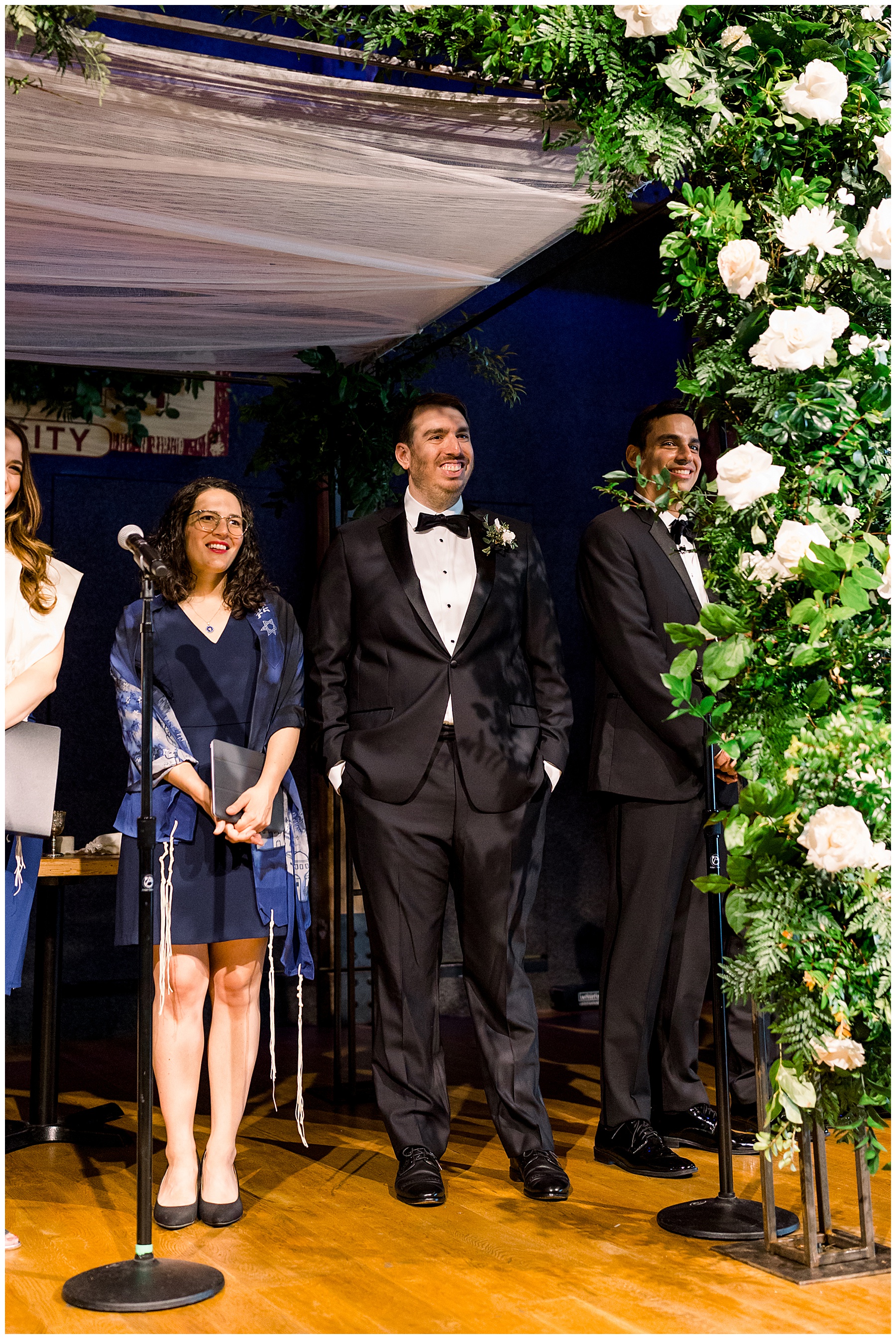 City Winery was transformed from the night before being a concert venue – into a beautiful Jewish wedding ceremony space. The chuppah was covered in greenery & white roses, and I especially loved how the stairs up to the stage were covered in greenery – so romantic. We had educated ourselves in some of the Jewish wedding traditions, and were excited to experience our first Jewish ceremony. There is so much tradition and family included into the ceremony – making it so meaningful and special. All the guests laughed when Carleigh & Ian had chosen a line from a Beyonce song to be quoted during the ceremony – and the whole ceremony was just really custom to be 100% “them”. Ian was most looking forward to stomping on the glass (be sure to see their beautiful custom glass they had made especially for this!)