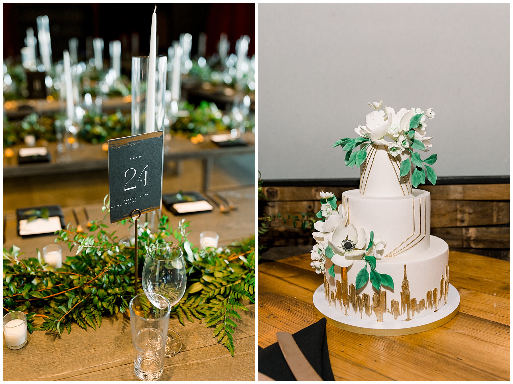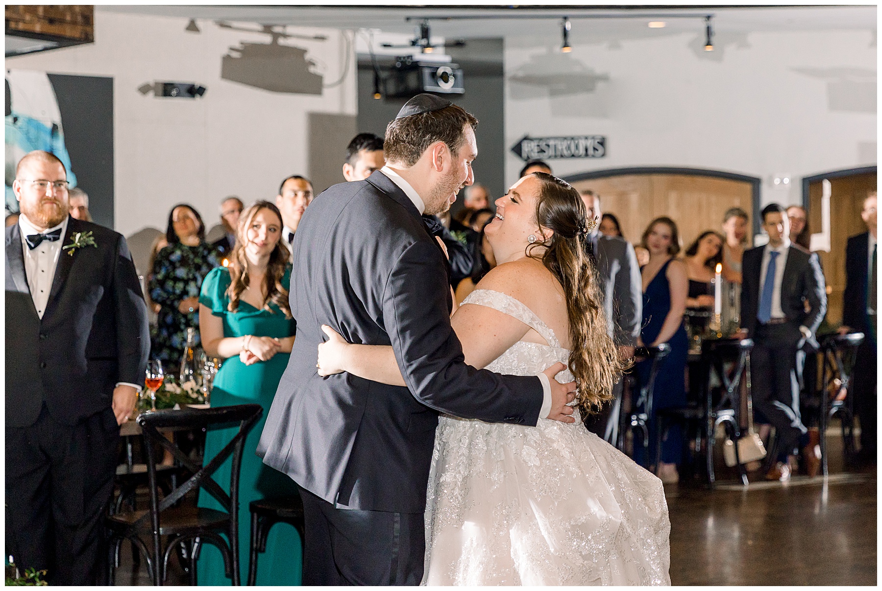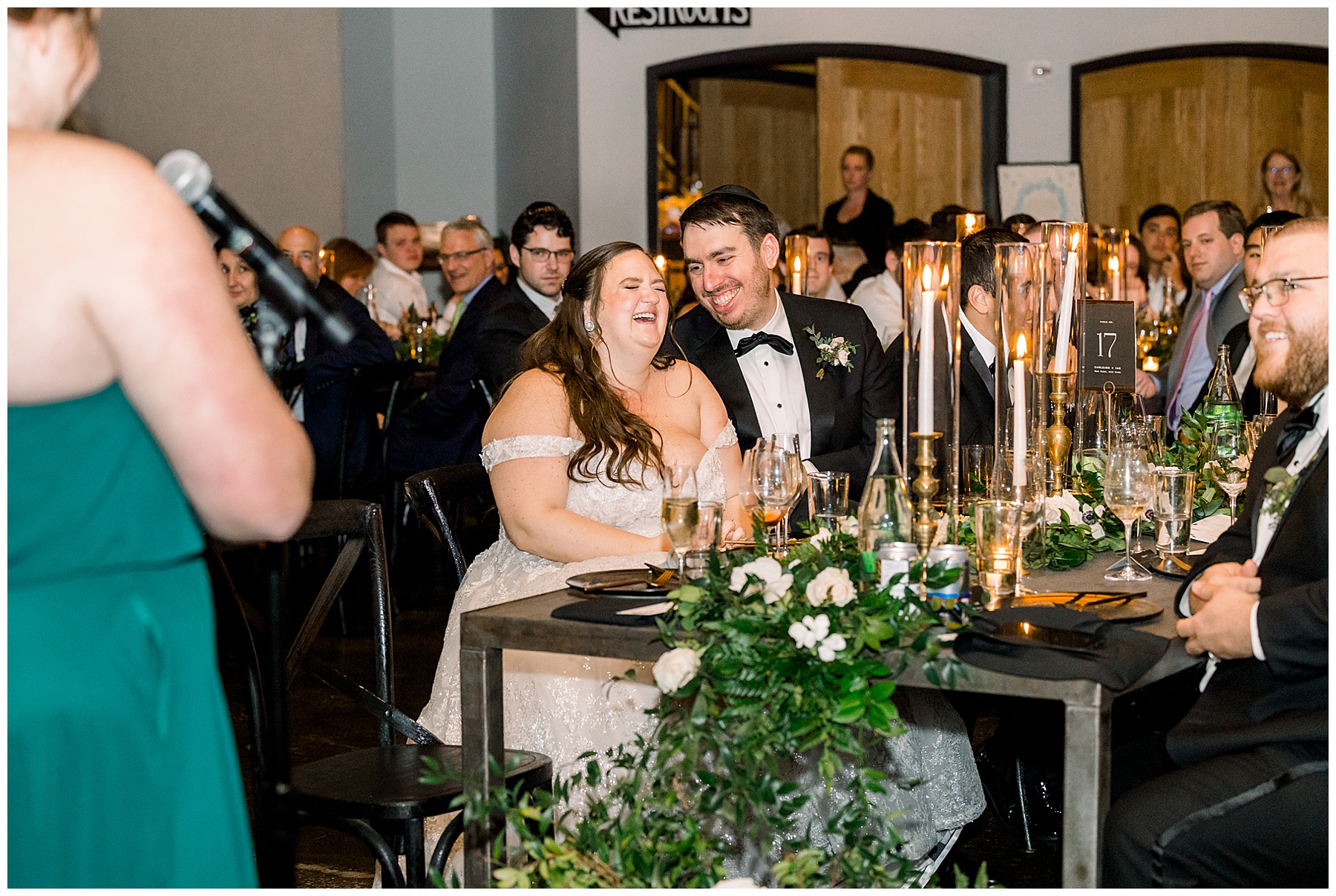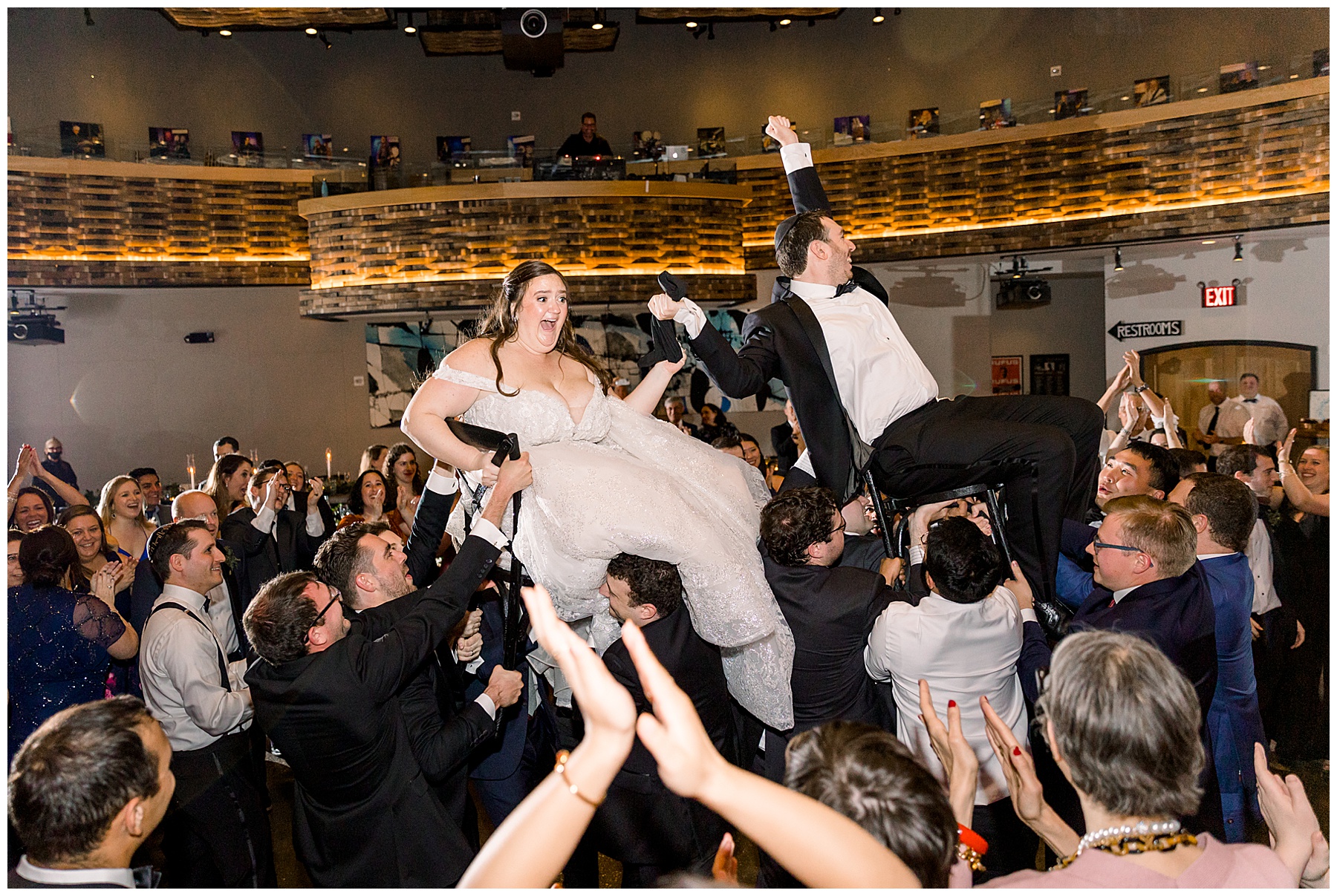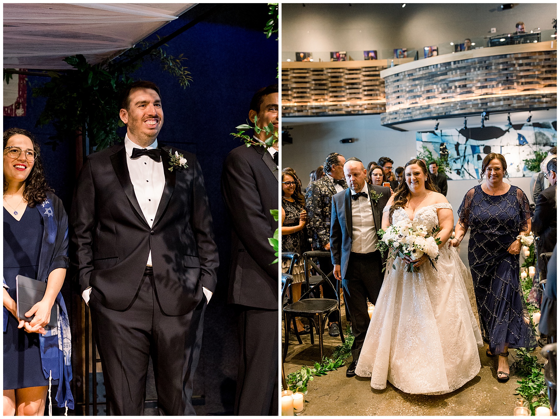 City Winery was transformed from the night before being a concert venue – into a beautiful Jewish wedding ceremony space. The chuppah was covered in greenery & white roses, and I especially loved how the stairs up to the stage were covered in greenery – so romantic. We had educated ourselves in some of the Jewish wedding traditions, and were excited to experience our first Jewish ceremony. There is so much tradition and family included into the ceremony – making it so meaningful and special. All the guests laughed when Carleigh & Ian had chosen a line from a Beyonce song to be quoted during the ceremony – and the whole ceremony was just really custom to be 100% “them”. Ian was most looking forward to stomping on the glass (be sure to see their beautiful custom glass they had made especially for this!)