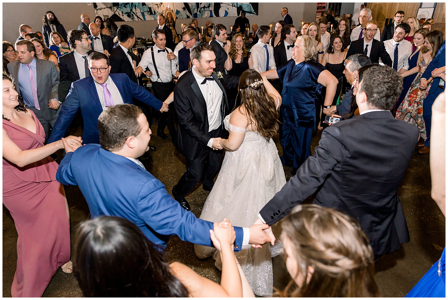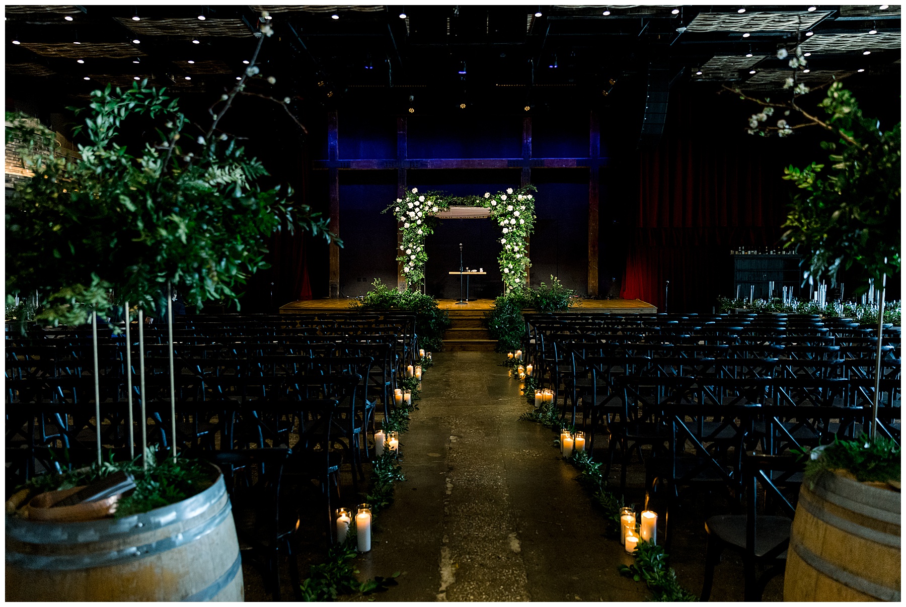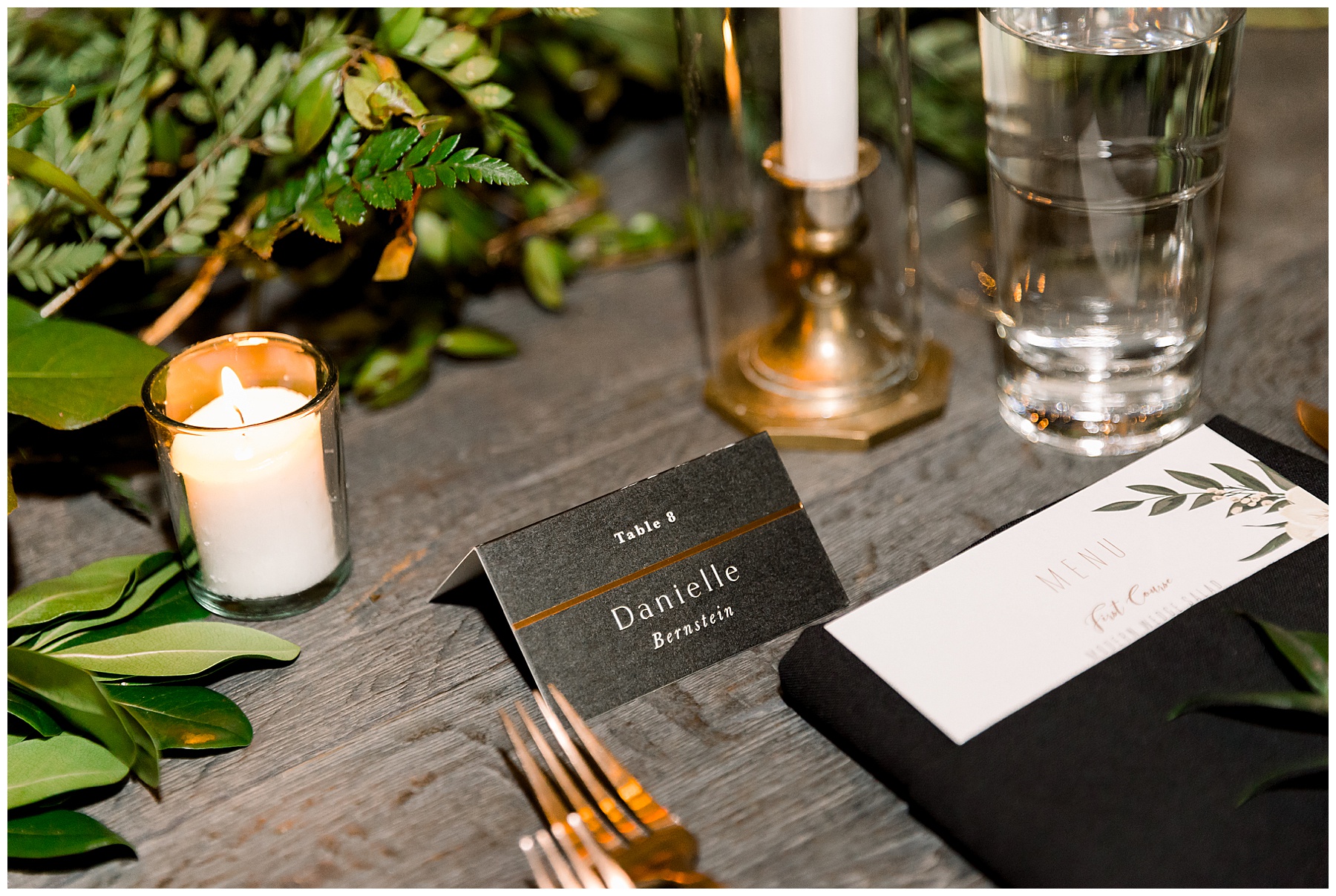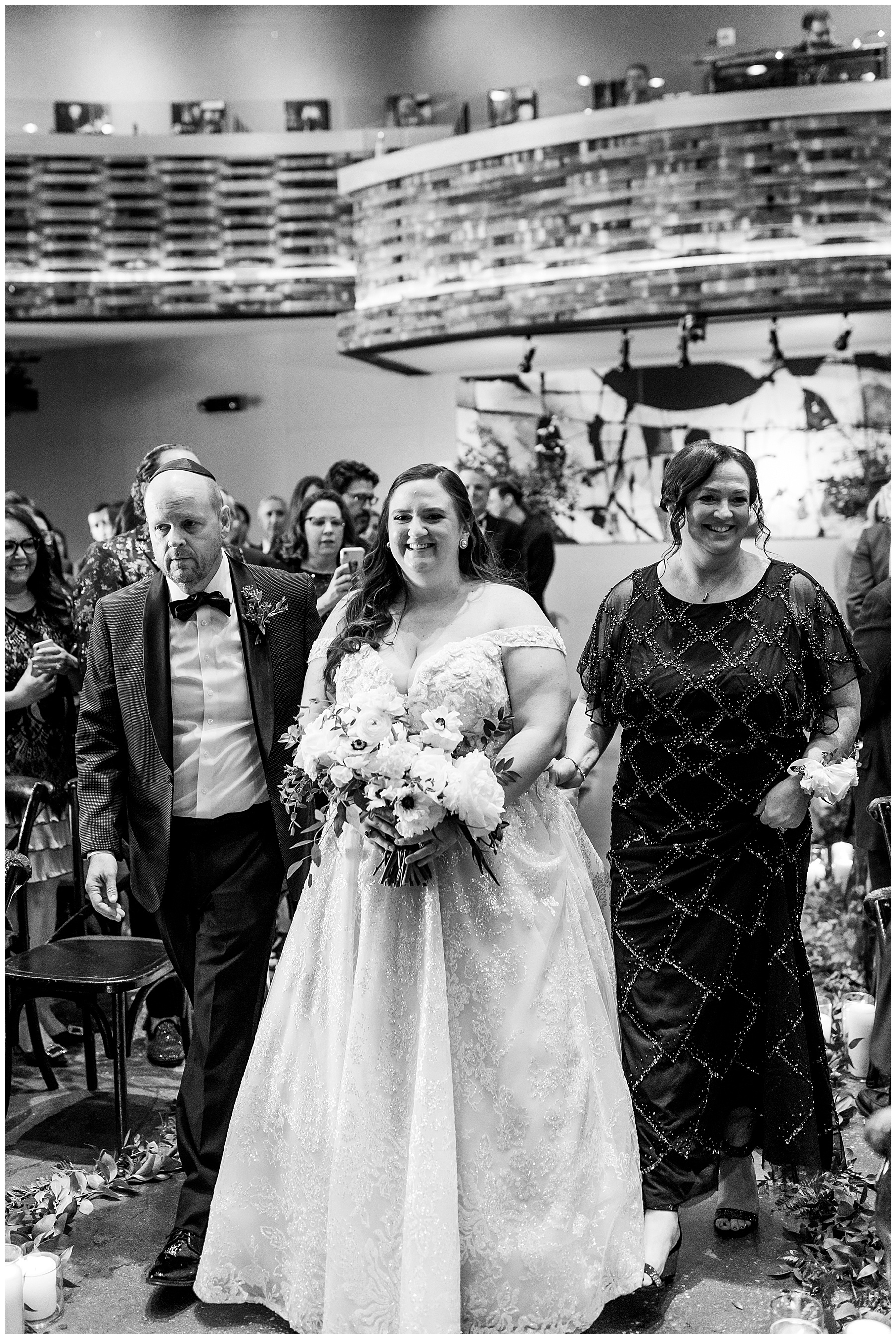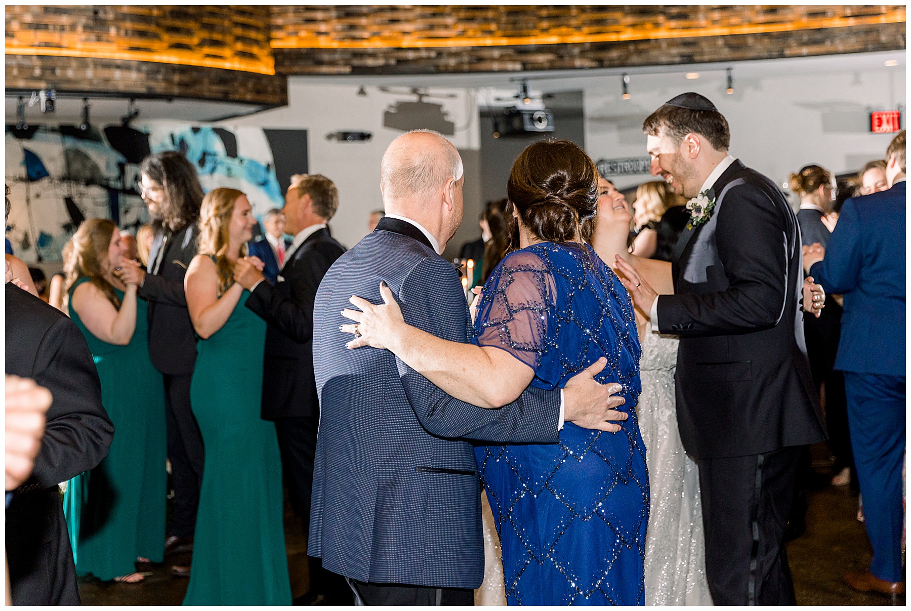 City Winery was transformed from the night before being a concert venue – into a beautiful Jewish wedding ceremony space. The chuppah was covered in greenery & white roses, and I especially loved how the stairs up to the stage were covered in greenery – so romantic. We had educated ourselves in some of the Jewish wedding traditions, and were excited to experience our first Jewish ceremony. There is so much tradition and family included into the ceremony – making it so meaningful and special. All the guests laughed when Carleigh & Ian had chosen a line from a Beyonce song to be quoted during the ceremony – and the whole ceremony was just really custom to be 100% “them”. Ian was most looking forward to stomping on the glass (be sure to see their beautiful custom glass they had made especially for this!)