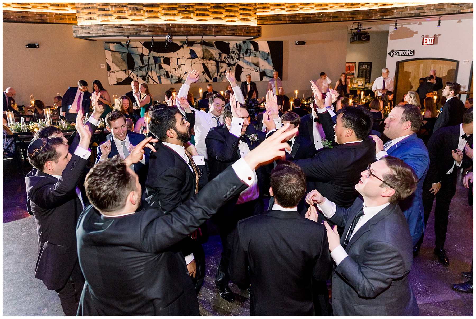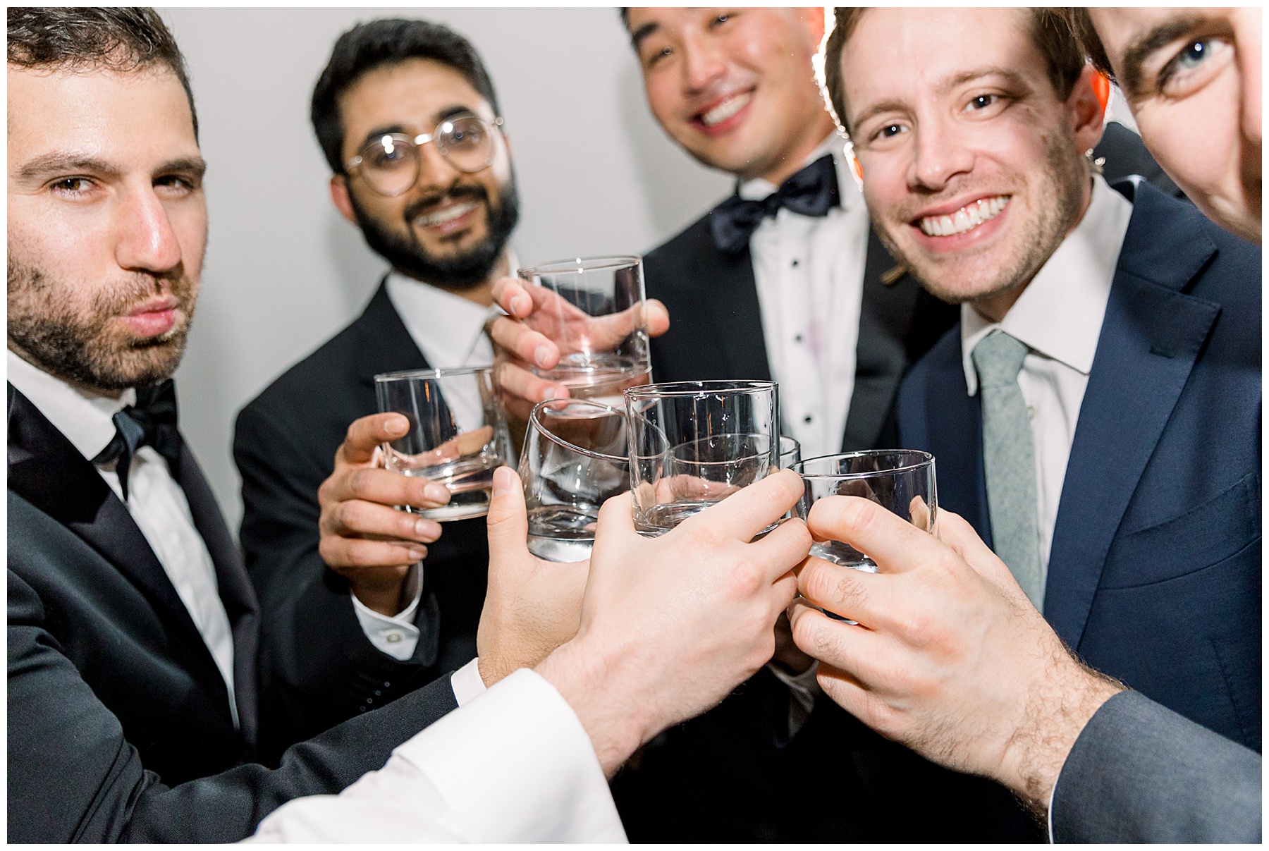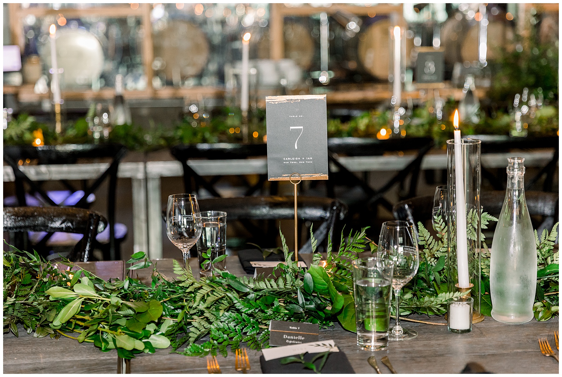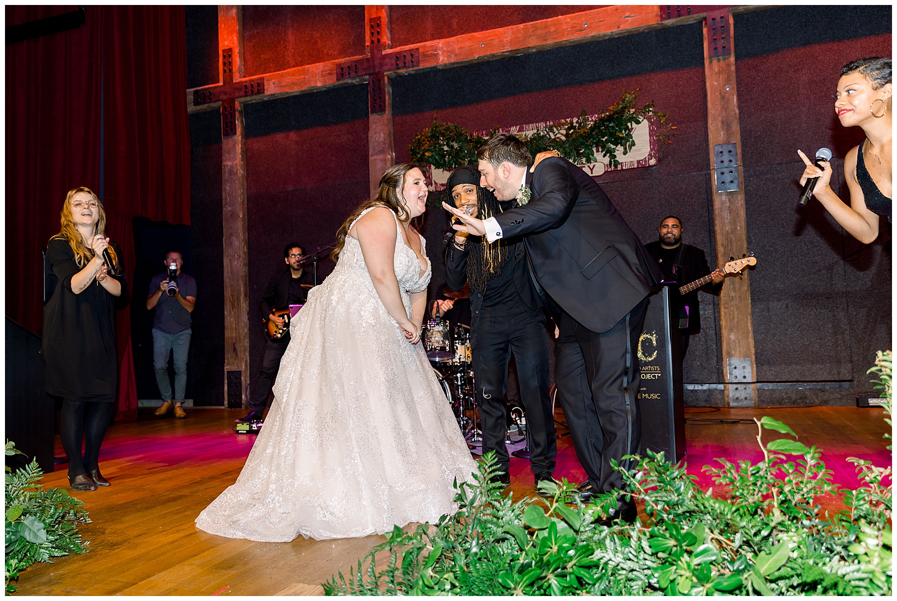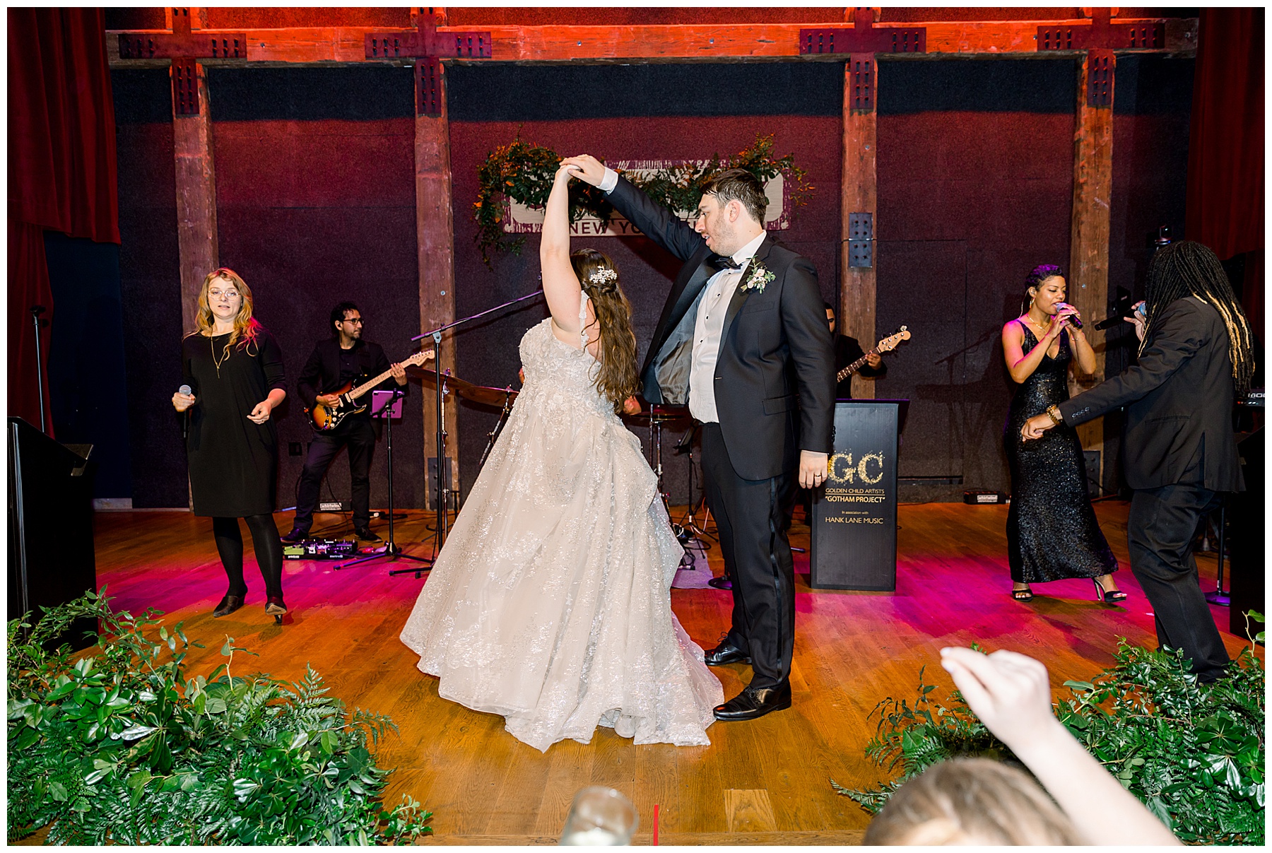 City Winery was transformed from the night before being a concert venue – into a beautiful Jewish wedding ceremony space. The chuppah was covered in greenery & white roses, and I especially loved how the stairs up to the stage were covered in greenery – so romantic. We had educated ourselves in some of the Jewish wedding traditions, and were excited to experience our first Jewish ceremony. There is so much tradition and family included into the ceremony – making it so meaningful and special. All the guests laughed when Carleigh & Ian had chosen a line from a Beyonce song to be quoted during the ceremony – and the whole ceremony was just really custom to be 100% “them”. Ian was most looking forward to stomping on the glass (be sure to see their beautiful custom glass they had made especially for this!)