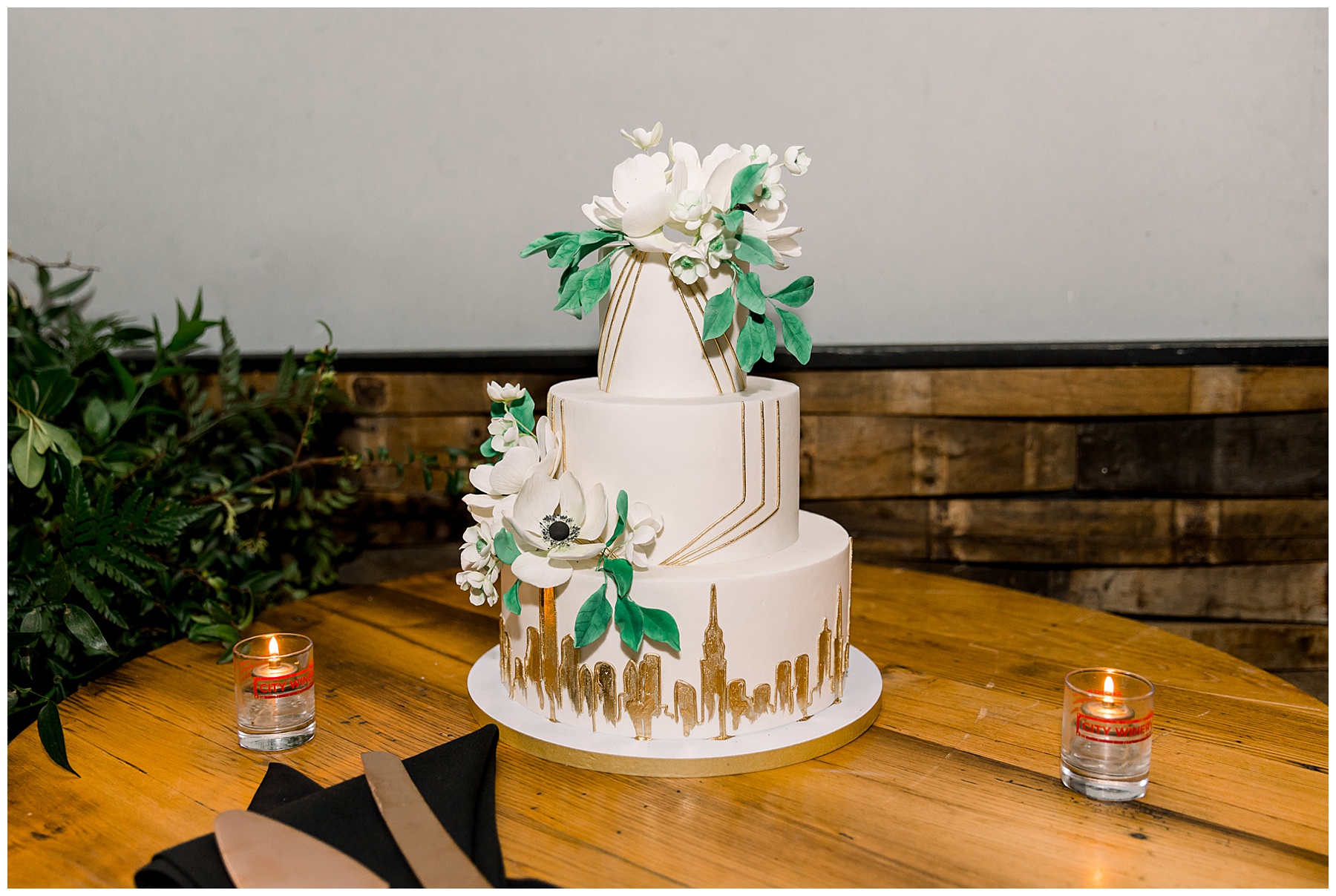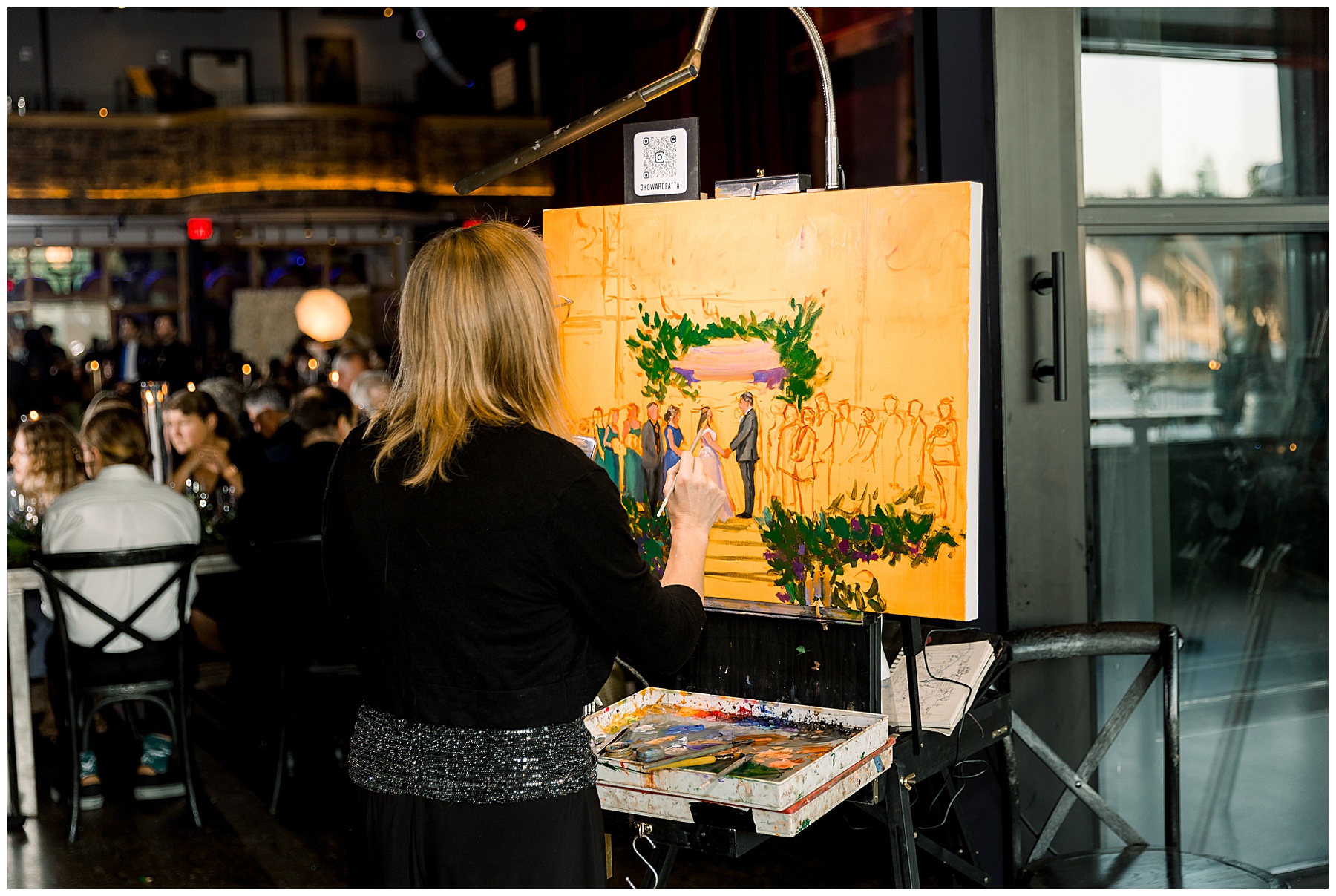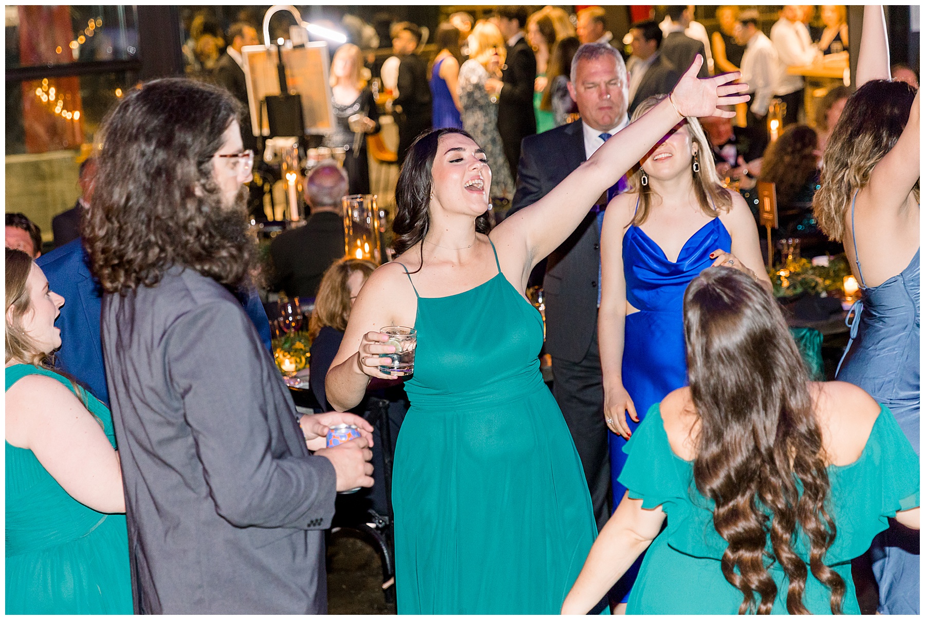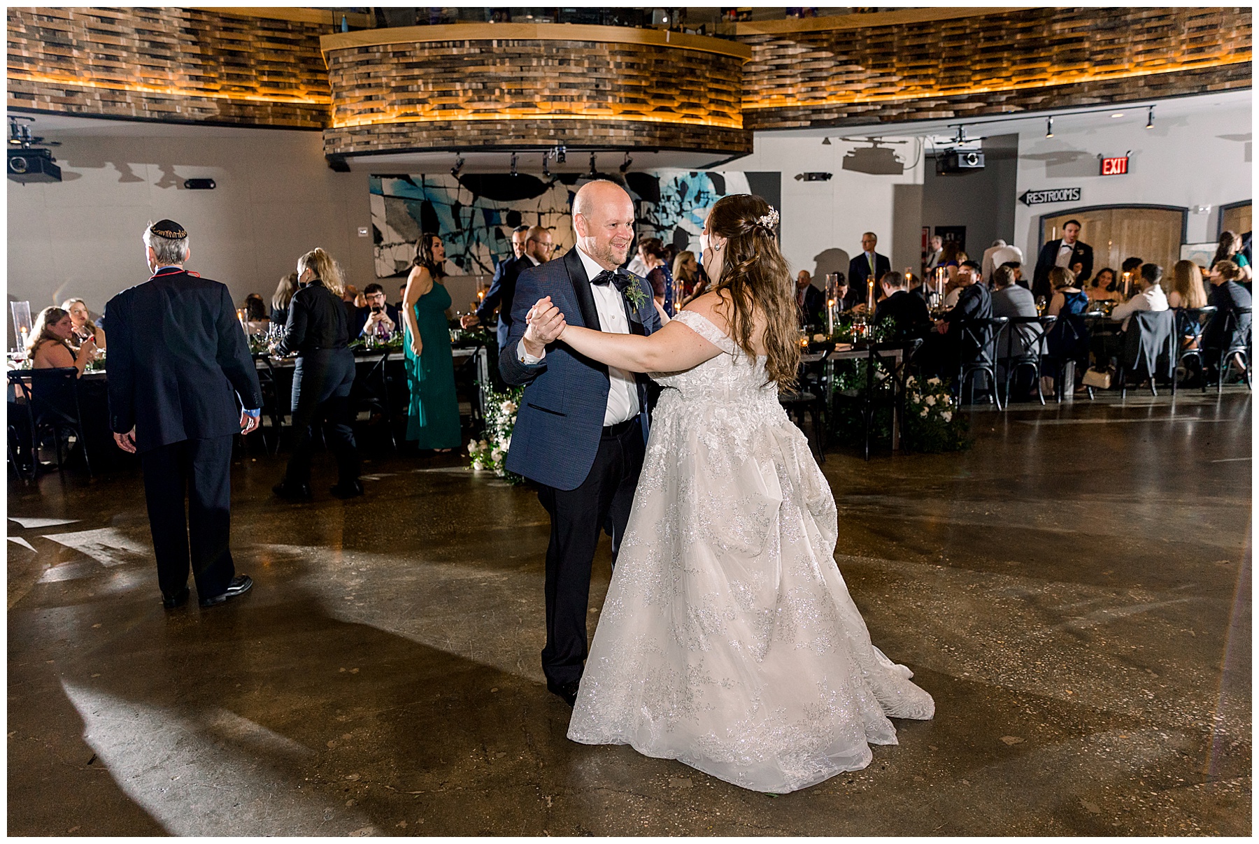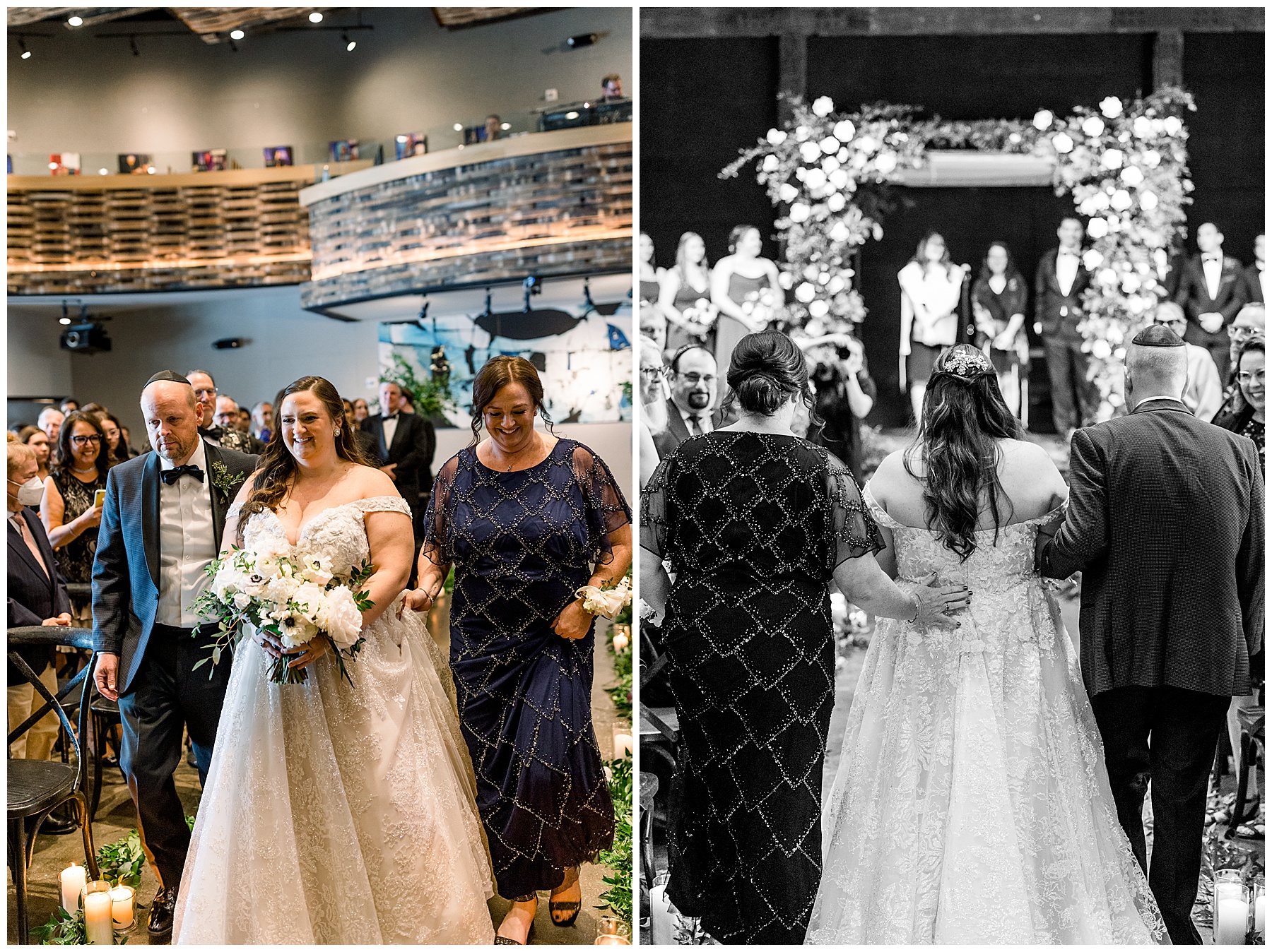 City Winery was transformed from the night before being a concert venue – into a beautiful Jewish wedding ceremony space. The chuppah was covered in greenery & white roses, and I especially loved how the stairs up to the stage were covered in greenery – so romantic. We had educated ourselves in some of the Jewish wedding traditions, and were excited to experience our first Jewish ceremony. There is so much tradition and family included into the ceremony – making it so meaningful and special. All the guests laughed when Carleigh & Ian had chosen a line from a Beyonce song to be quoted during the ceremony – and the whole ceremony was just really custom to be 100% “them”. Ian was most looking forward to stomping on the glass (be sure to see their beautiful custom glass they had made especially for this!)