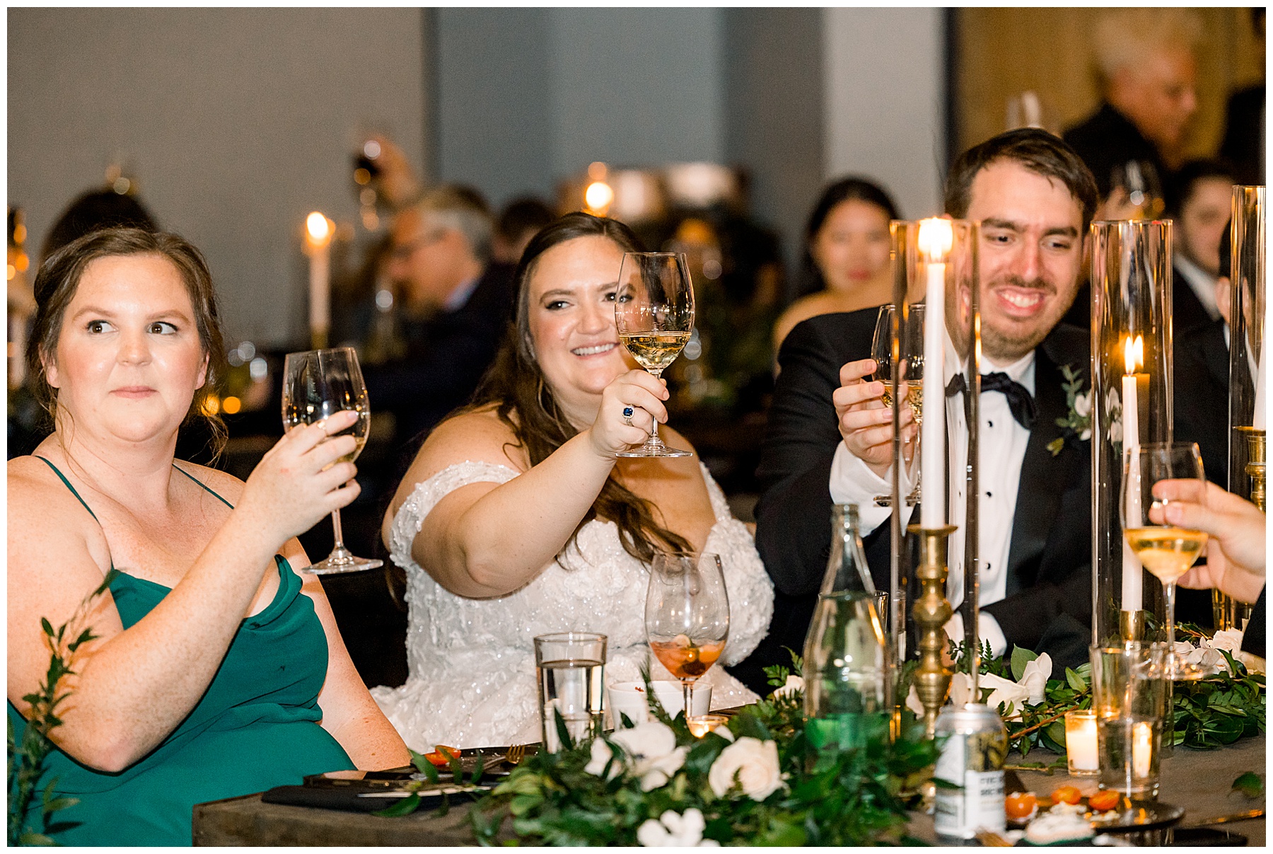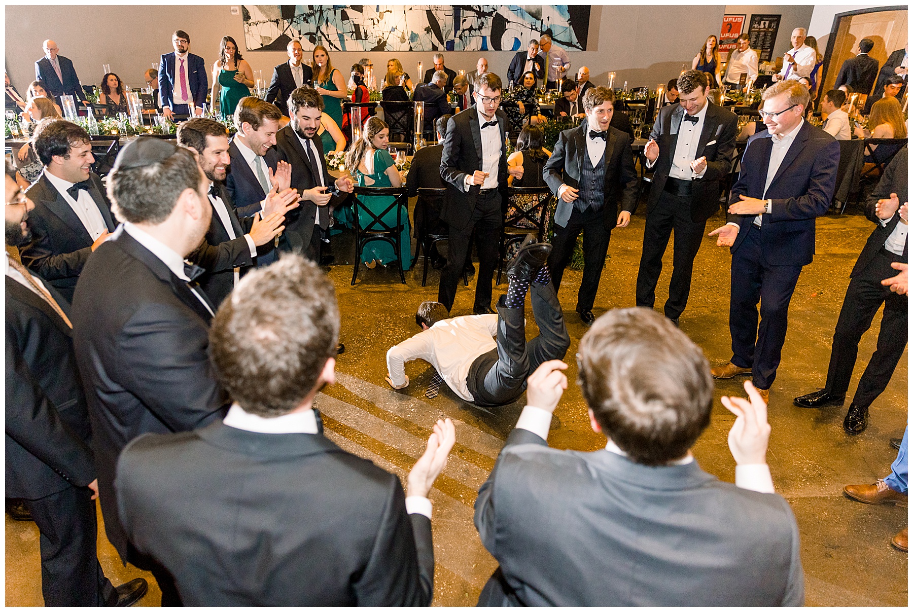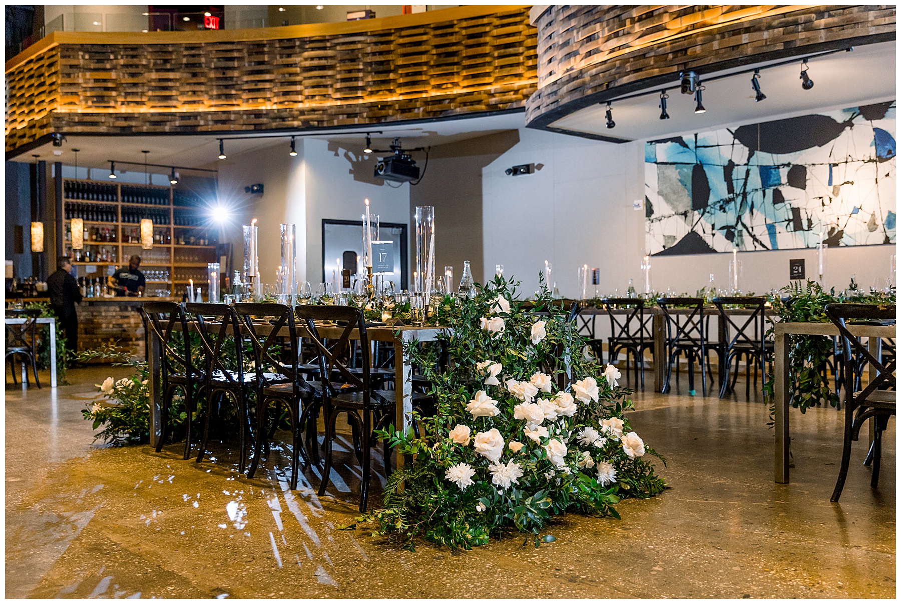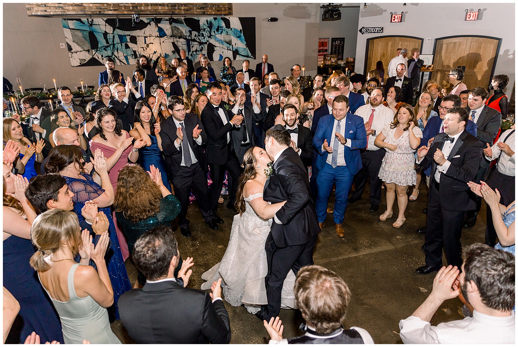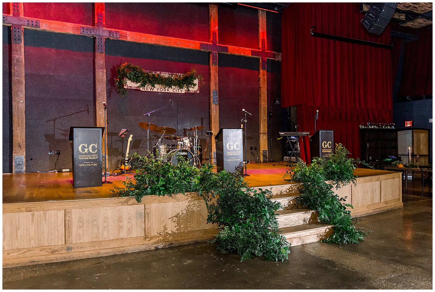 City Winery was transformed from the night before being a concert venue – into a beautiful Jewish wedding ceremony space. The chuppah was covered in greenery & white roses, and I especially loved how the stairs up to the stage were covered in greenery – so romantic. We had educated ourselves in some of the Jewish wedding traditions, and were excited to experience our first Jewish ceremony. There is so much tradition and family included into the ceremony – making it so meaningful and special. All the guests laughed when Carleigh & Ian had chosen a line from a Beyonce song to be quoted during the ceremony – and the whole ceremony was just really custom to be 100% “them”. Ian was most looking forward to stomping on the glass (be sure to see their beautiful custom glass they had made especially for this!)