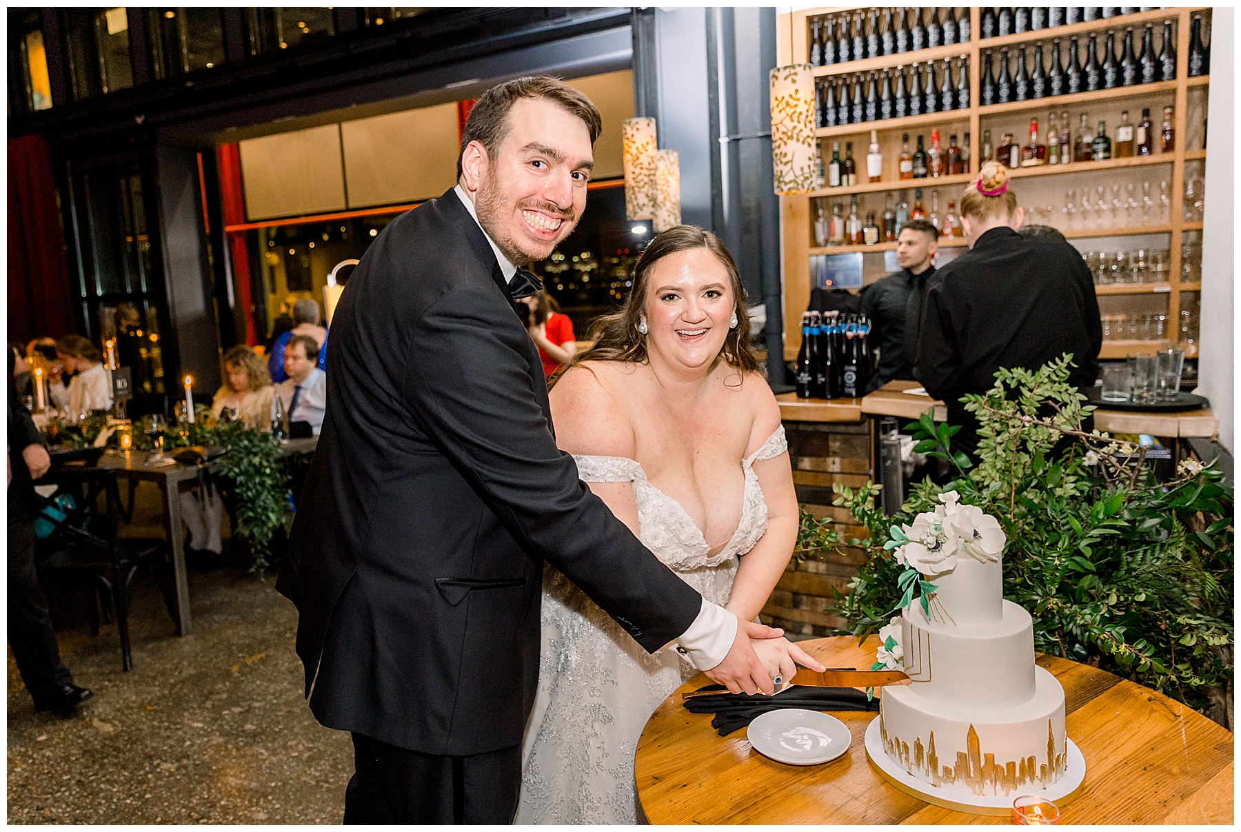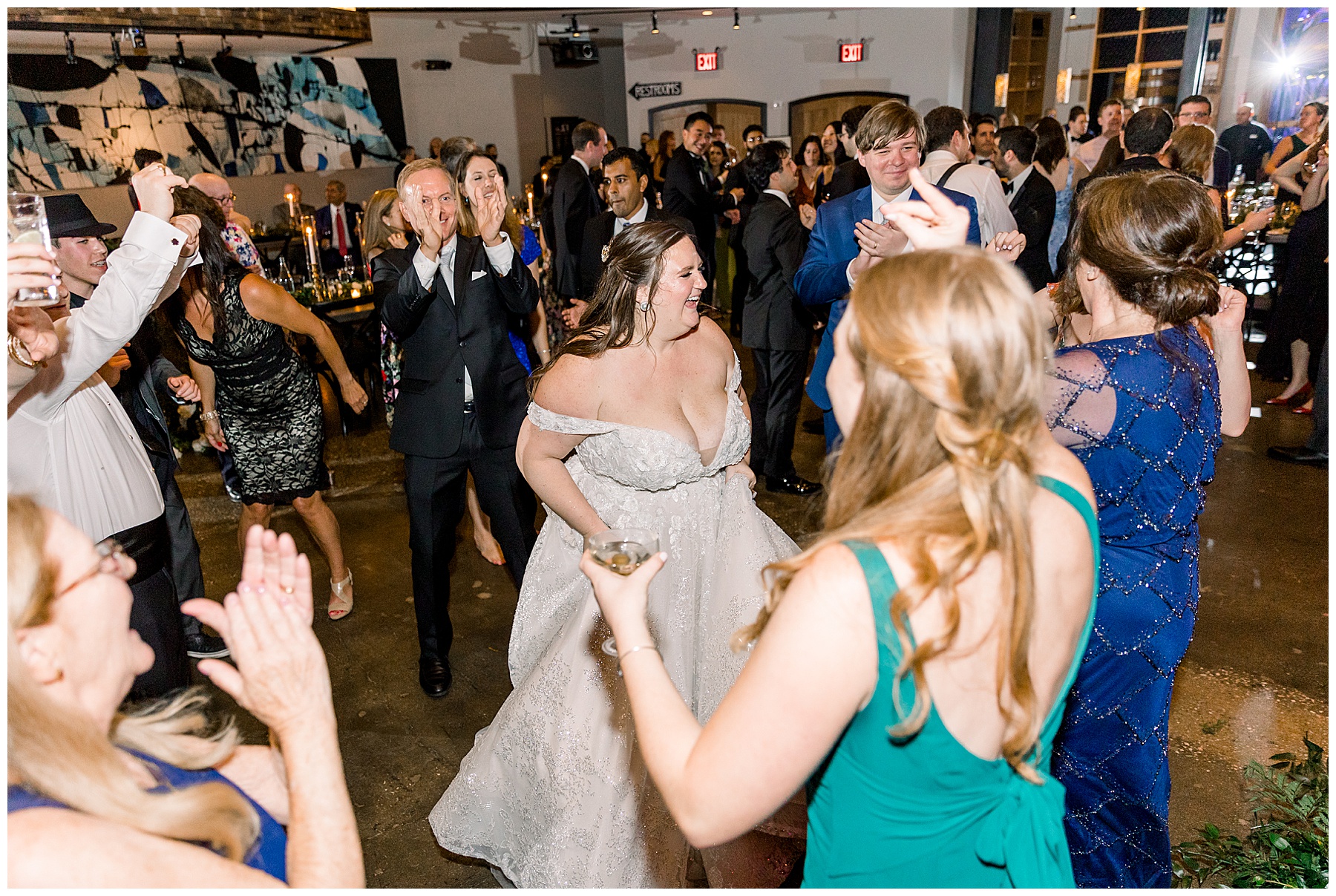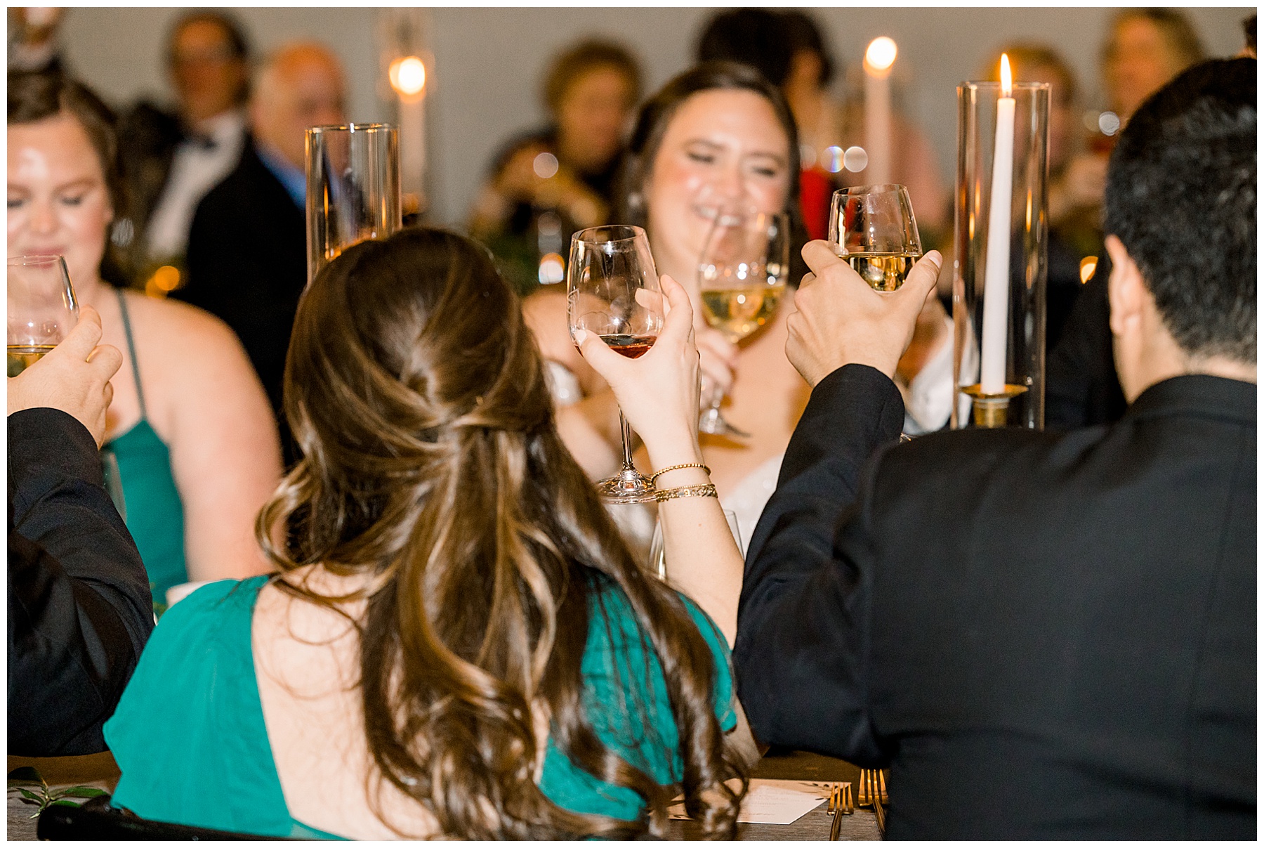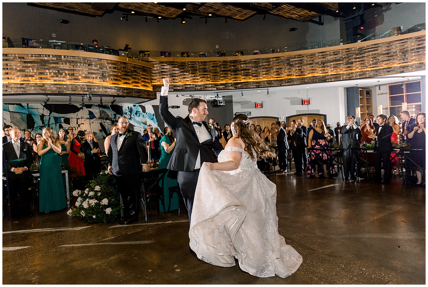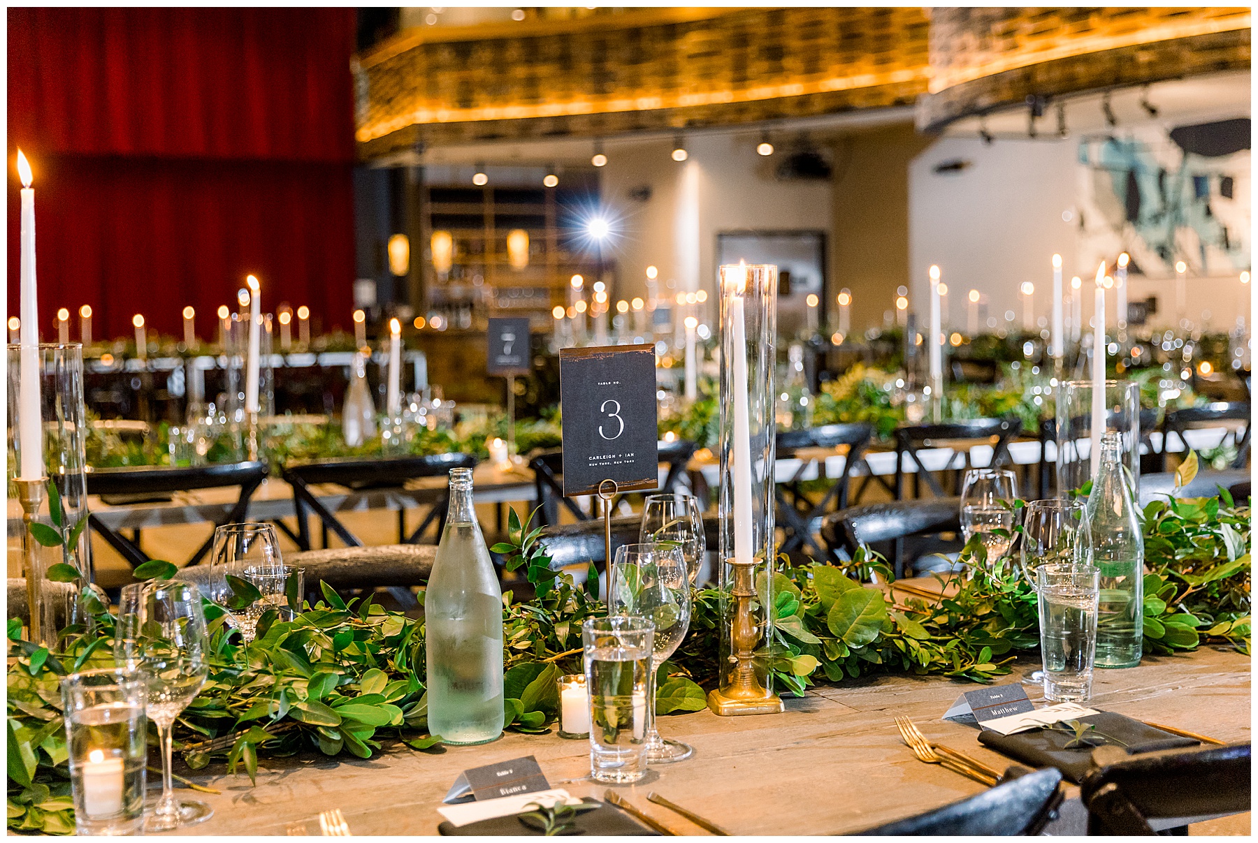 City Winery was transformed from the night before being a concert venue – into a beautiful Jewish wedding ceremony space. The chuppah was covered in greenery & white roses, and I especially loved how the stairs up to the stage were covered in greenery – so romantic. We had educated ourselves in some of the Jewish wedding traditions, and were excited to experience our first Jewish ceremony. There is so much tradition and family included into the ceremony – making it so meaningful and special. All the guests laughed when Carleigh & Ian had chosen a line from a Beyonce song to be quoted during the ceremony – and the whole ceremony was just really custom to be 100% “them”. Ian was most looking forward to stomping on the glass (be sure to see their beautiful custom glass they had made especially for this!)