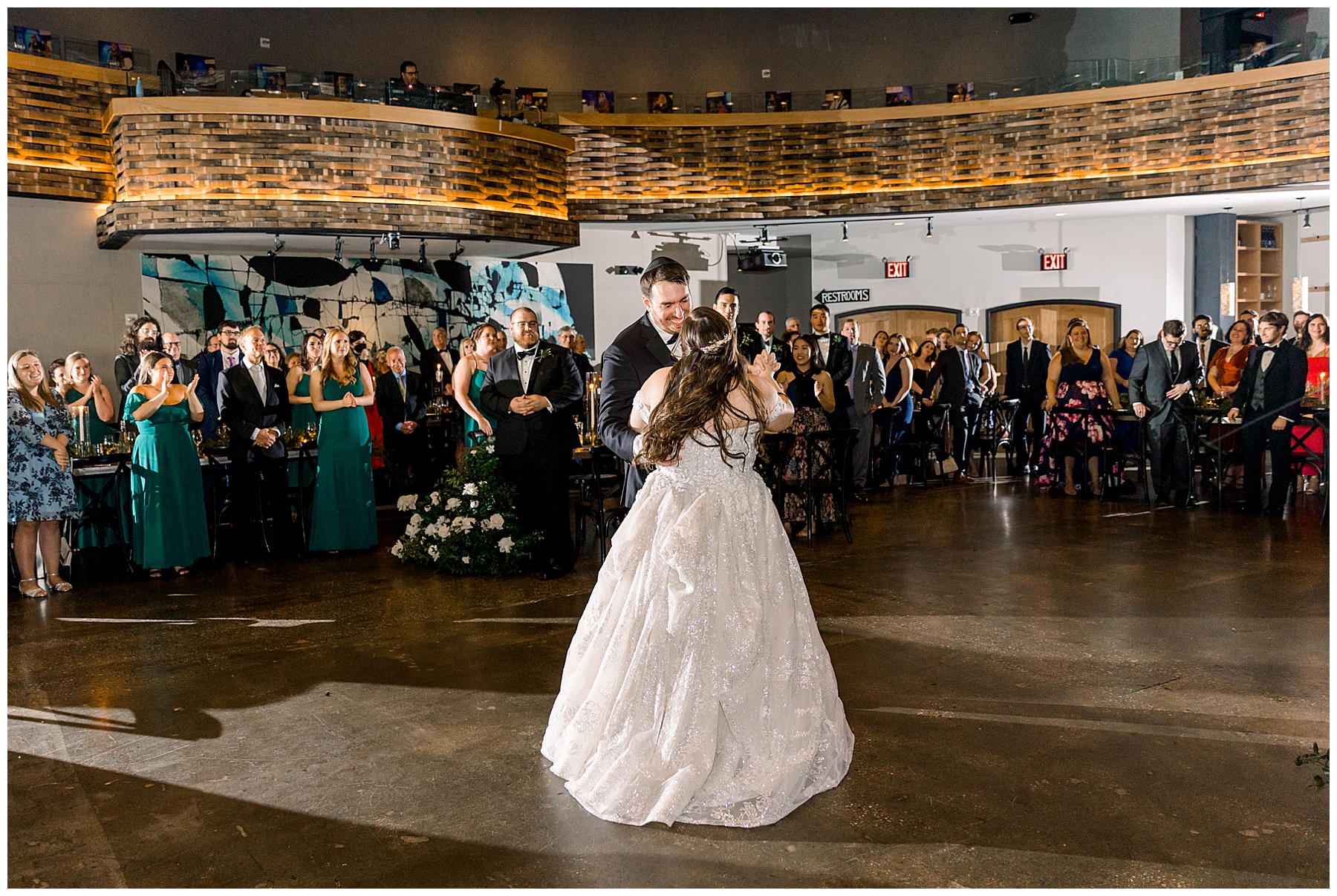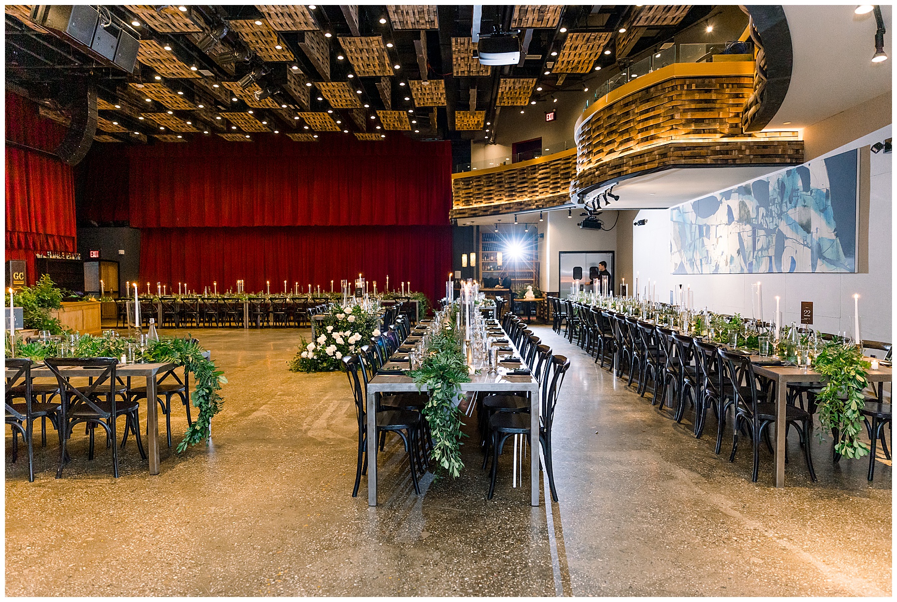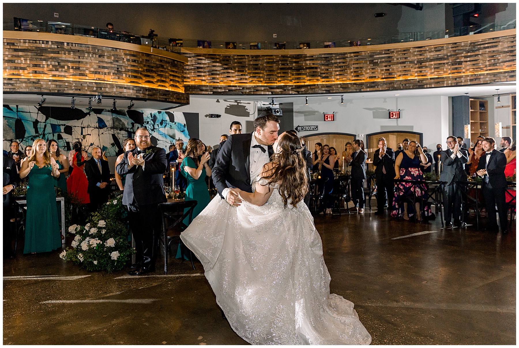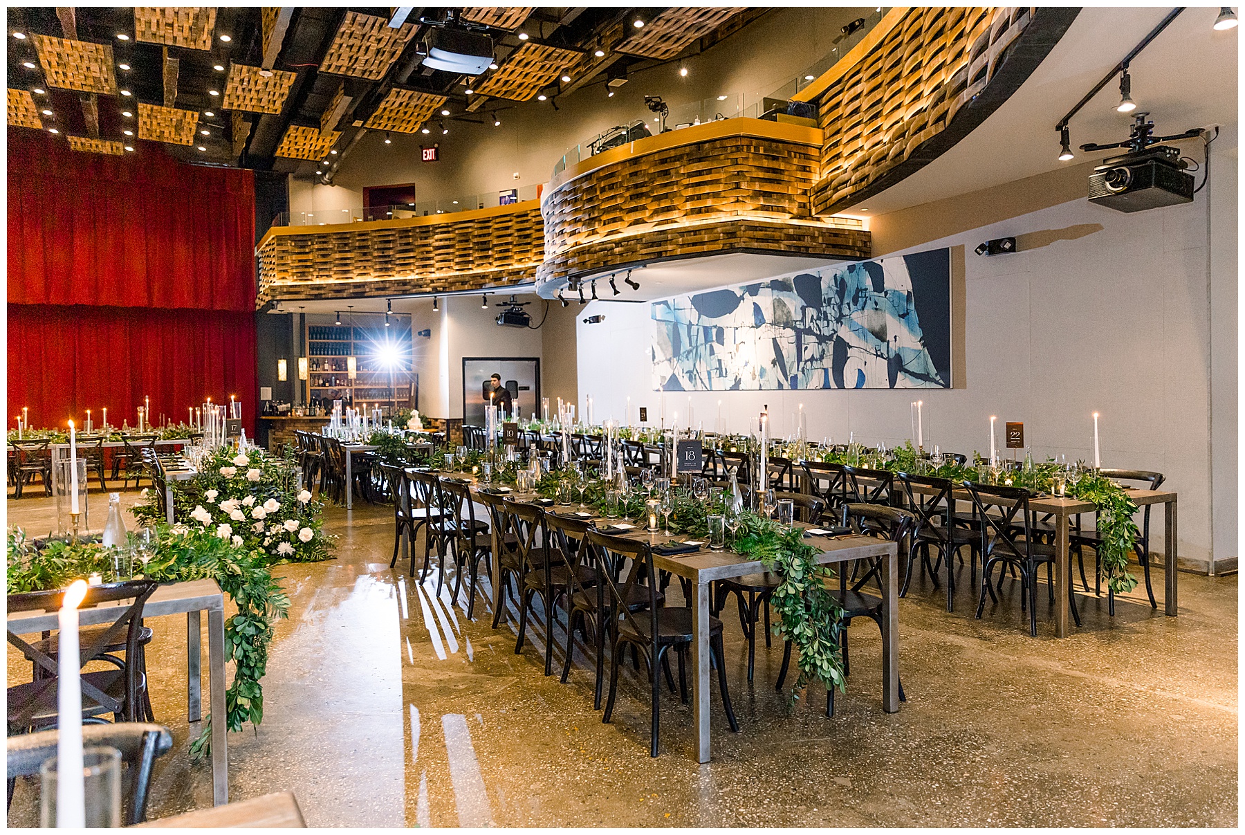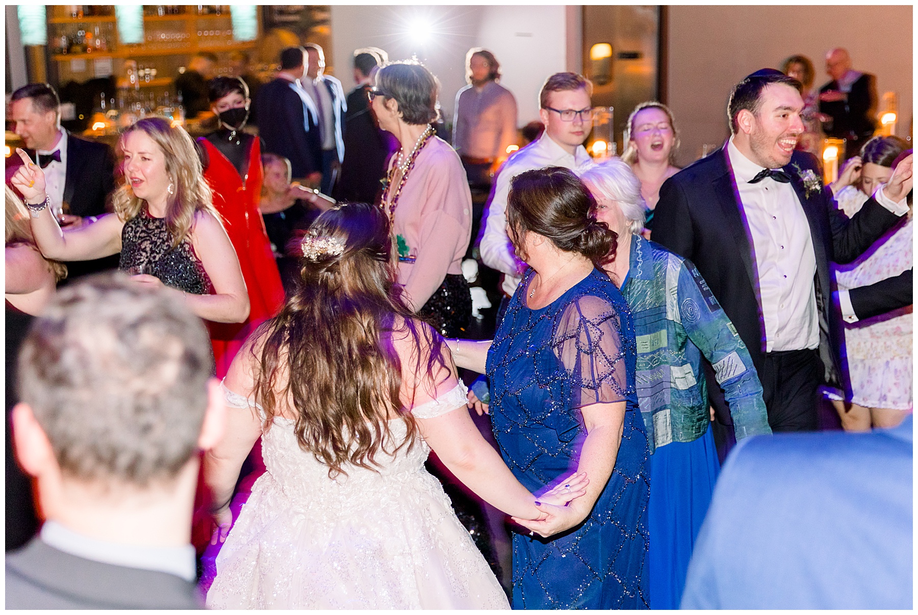 City Winery was transformed from the night before being a concert venue – into a beautiful Jewish wedding ceremony space. The chuppah was covered in greenery & white roses, and I especially loved how the stairs up to the stage were covered in greenery – so romantic. We had educated ourselves in some of the Jewish wedding traditions, and were excited to experience our first Jewish ceremony. There is so much tradition and family included into the ceremony – making it so meaningful and special. All the guests laughed when Carleigh & Ian had chosen a line from a Beyonce song to be quoted during the ceremony – and the whole ceremony was just really custom to be 100% “them”. Ian was most looking forward to stomping on the glass (be sure to see their beautiful custom glass they had made especially for this!)