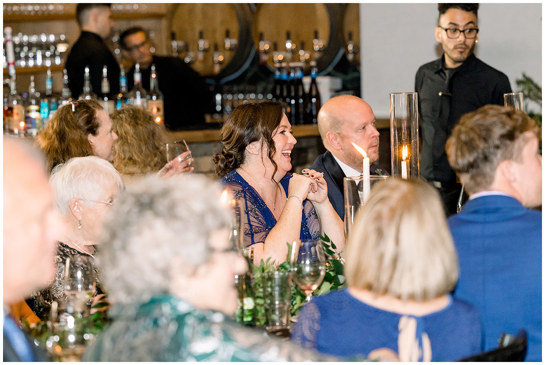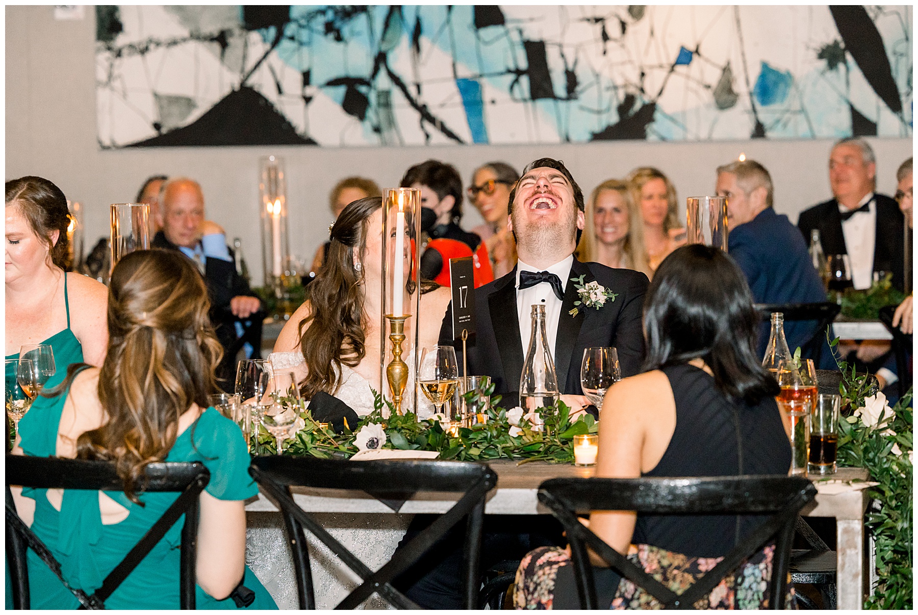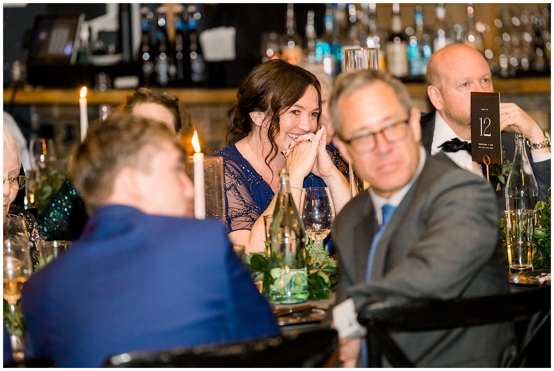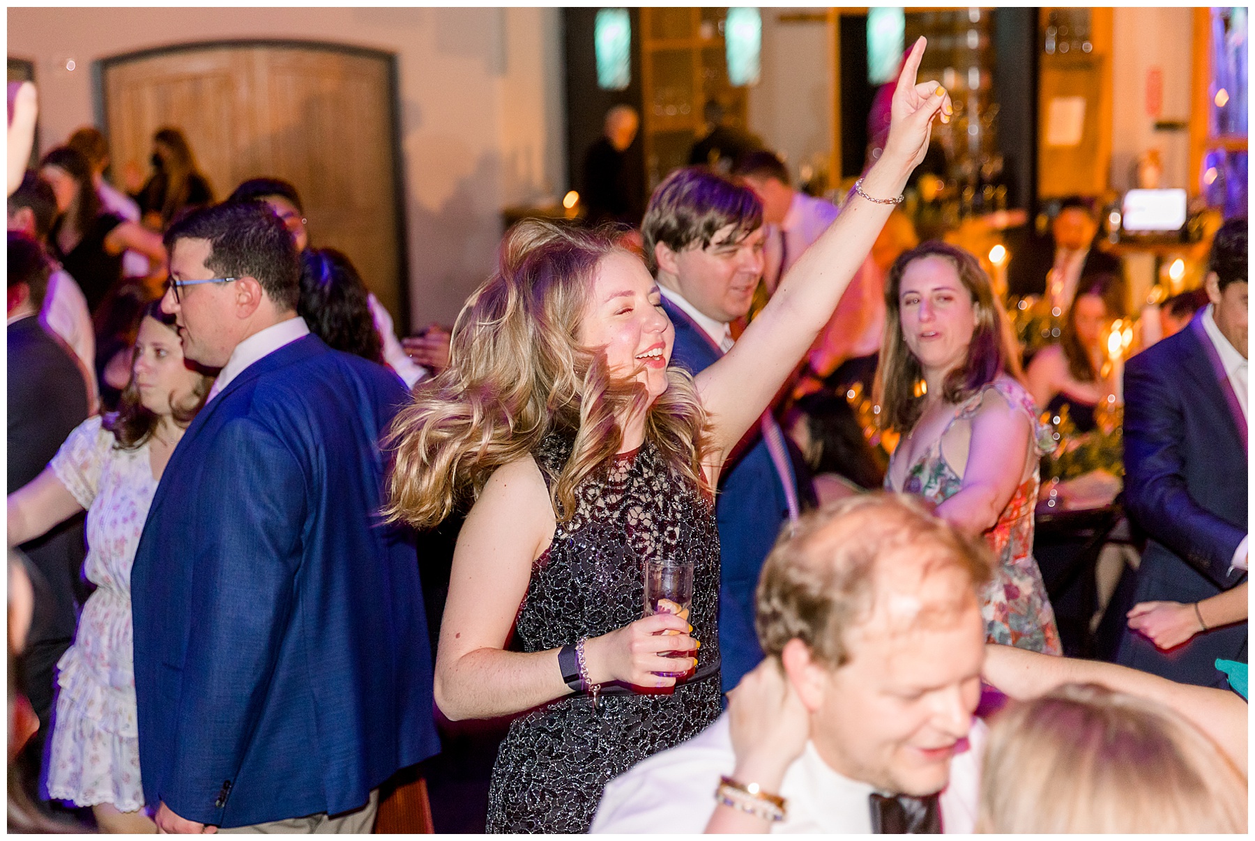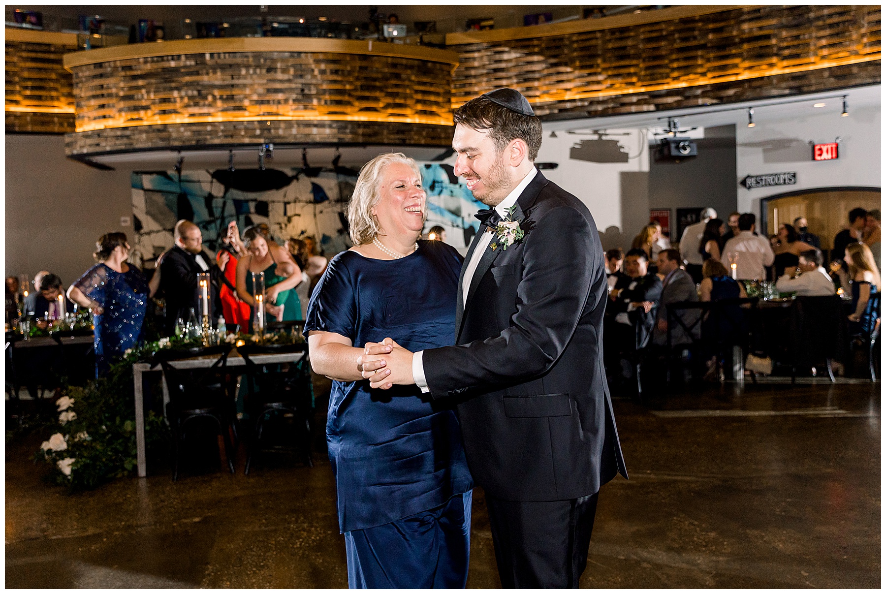 City Winery was transformed from the night before being a concert venue – into a beautiful Jewish wedding ceremony space. The chuppah was covered in greenery & white roses, and I especially loved how the stairs up to the stage were covered in greenery – so romantic. We had educated ourselves in some of the Jewish wedding traditions, and were excited to experience our first Jewish ceremony. There is so much tradition and family included into the ceremony – making it so meaningful and special. All the guests laughed when Carleigh & Ian had chosen a line from a Beyonce song to be quoted during the ceremony – and the whole ceremony was just really custom to be 100% “them”. Ian was most looking forward to stomping on the glass (be sure to see their beautiful custom glass they had made especially for this!)