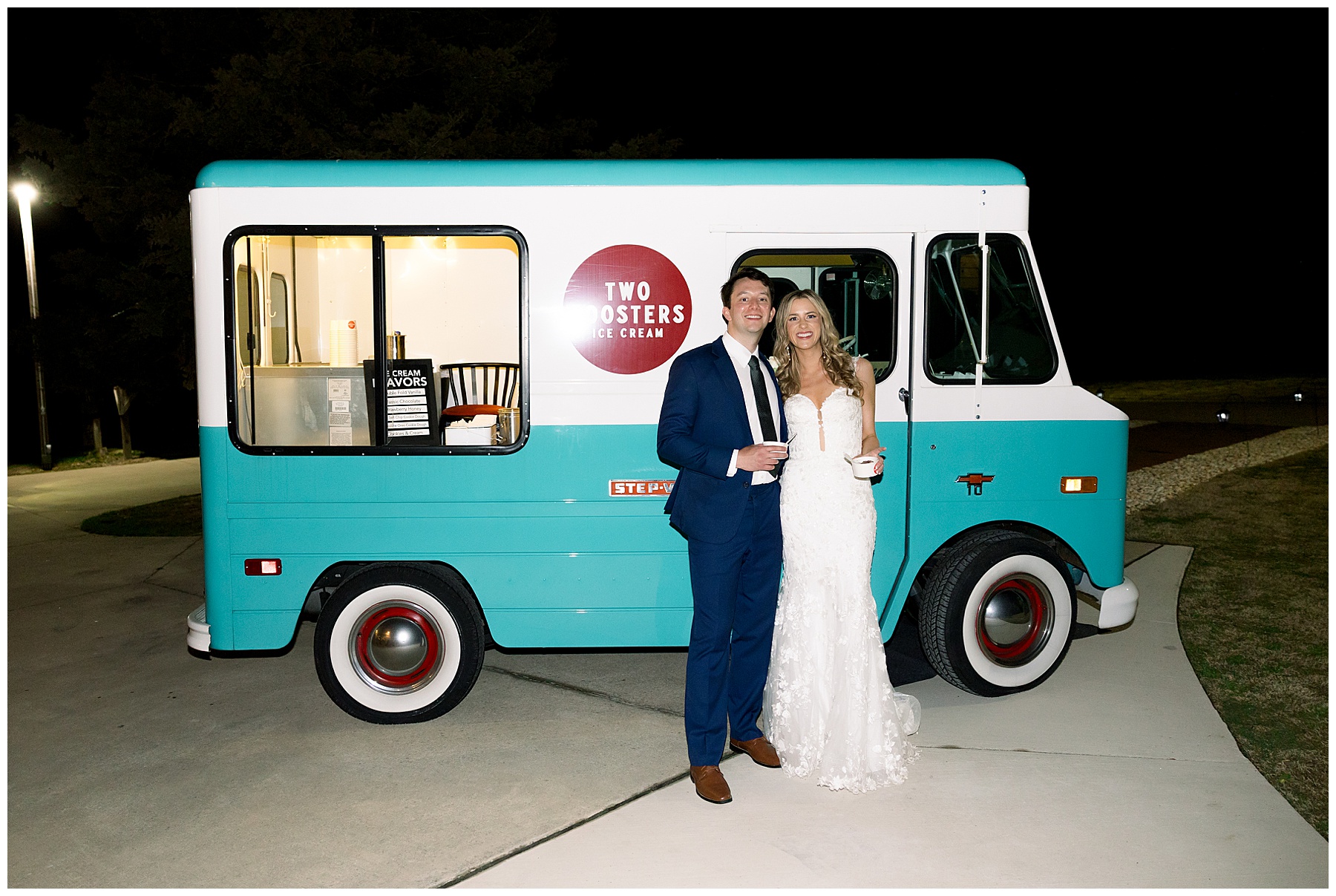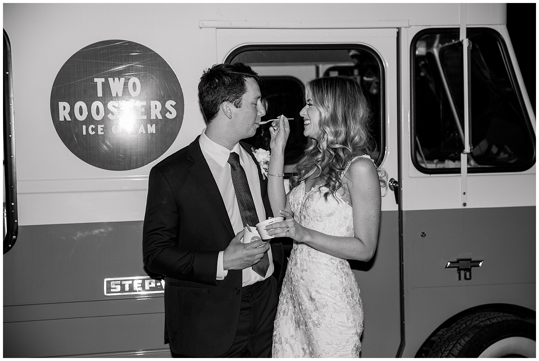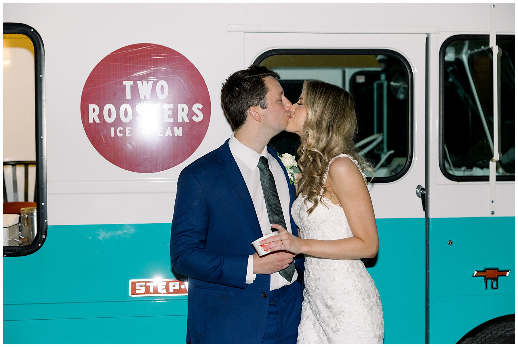 The reception kicked off with Entrances (with Caroline & Sean doing their secret handshake!) First Dances, a delicious dinner, and then the band Dance Candy took it away! Caroline & Sean treated their guests to not only a yummy cake, open bar with specialty drinks, but ALSO Two Roosters Ice Cream truck came and guests could get unlimited ice cream! I got a chocolate Oreo cookie dough flavor and it was SO GOOD!!!