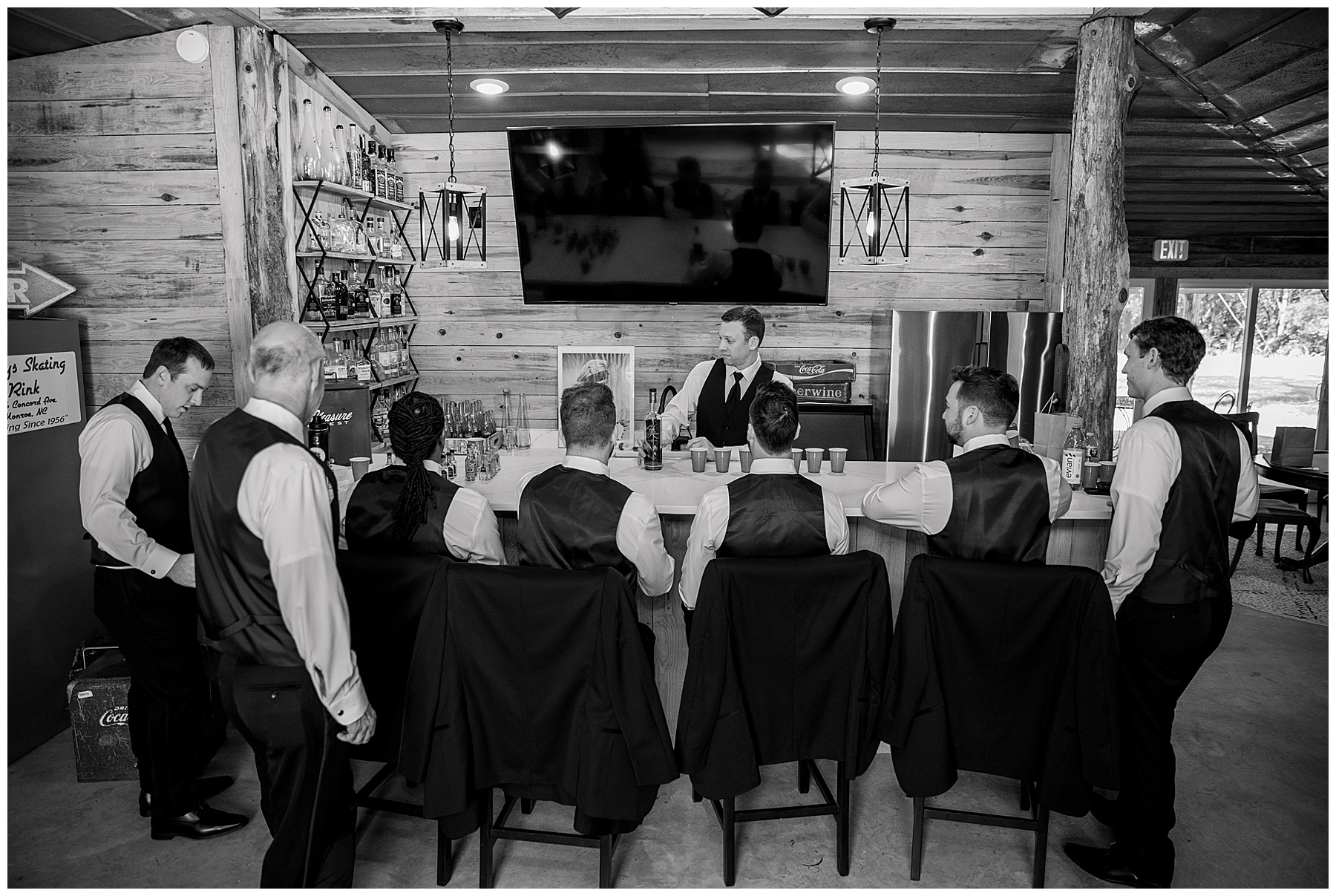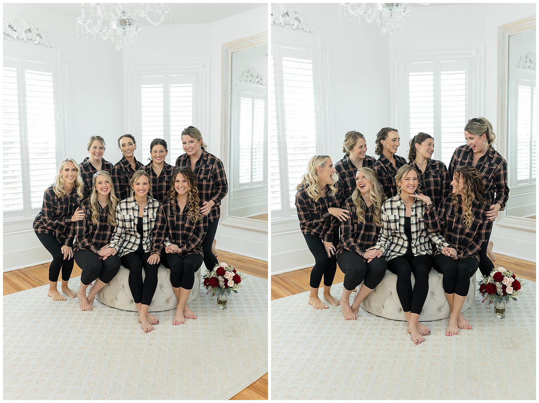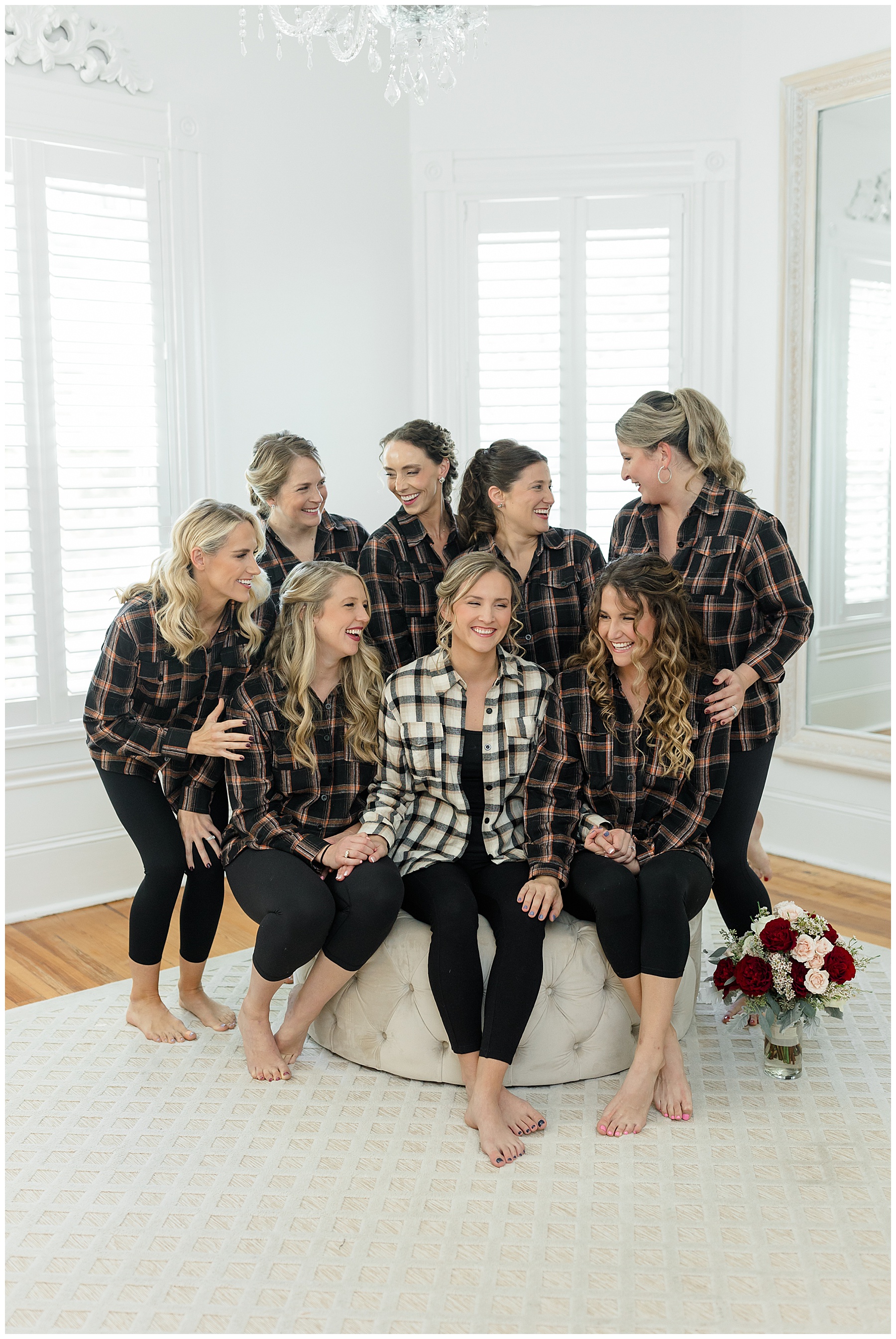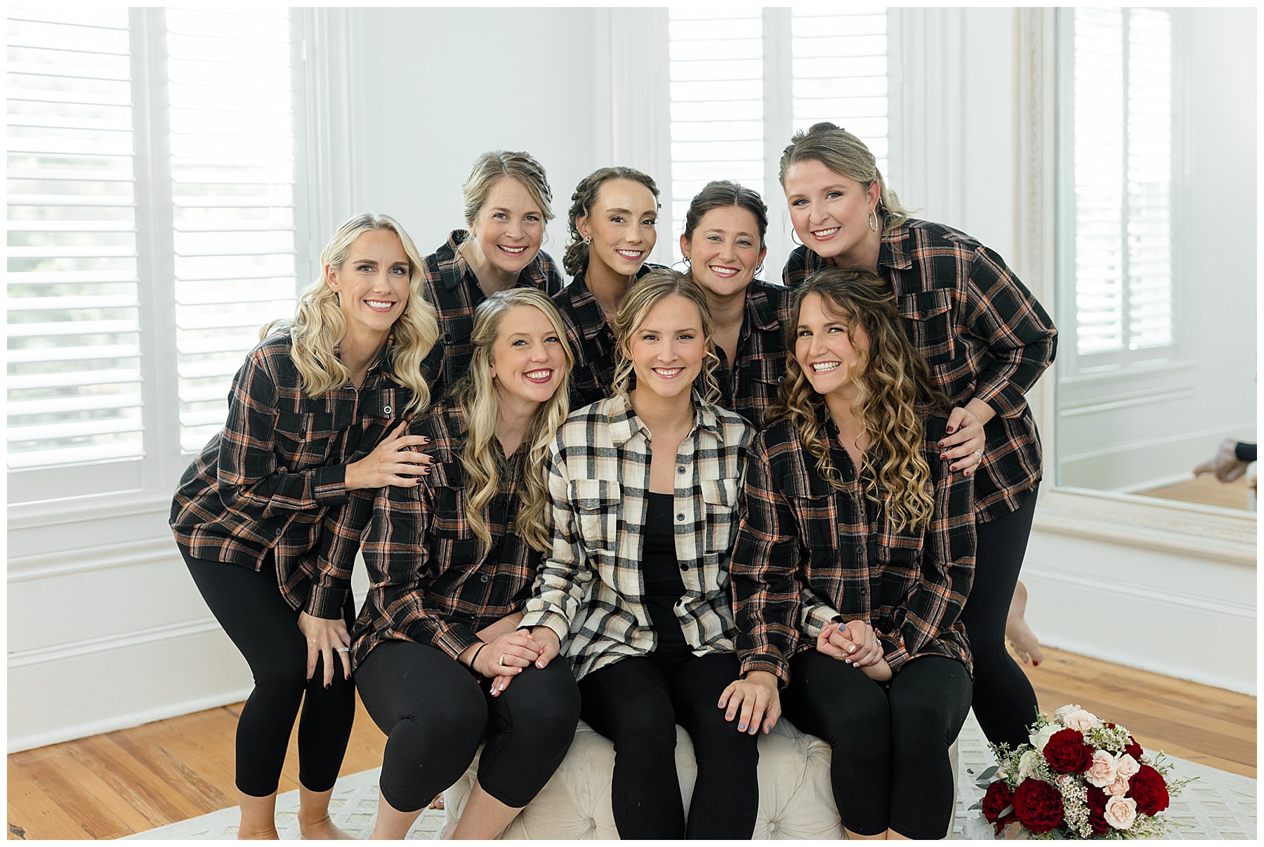 Courtney & the girls had the ENTIRE upstairs of the venue for getting ready spaces! They enjoyed getting glam & wearing their flannels – while listening to a custom playlist of each of their go-to karaoke songs! It was so cute to see how much fun they were all having together! While they were getting glammed, I enjoyed photographing Courtney’s detail photos – it’s not every day that I get to use my favorite color (BLACK!) for details, so that was fun for me!! (A few notes about her details: the pocket watch she carried in her dress pocket – it was a gift the night before from her Aunt – originally being her great-great-grandfather’s watch! The veil was her Aunt’s veil, and the perfume was her mom’s!)