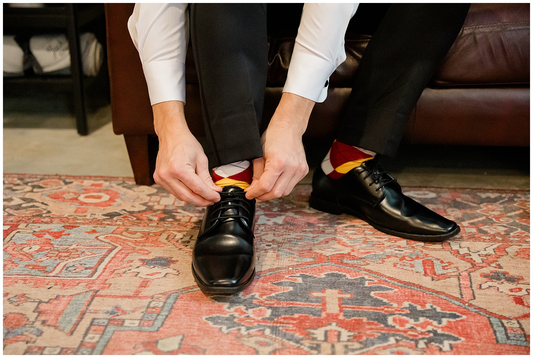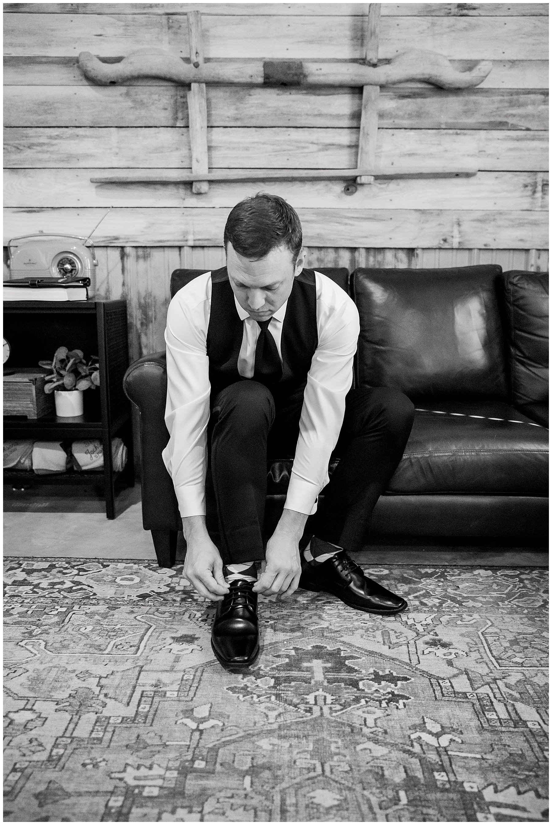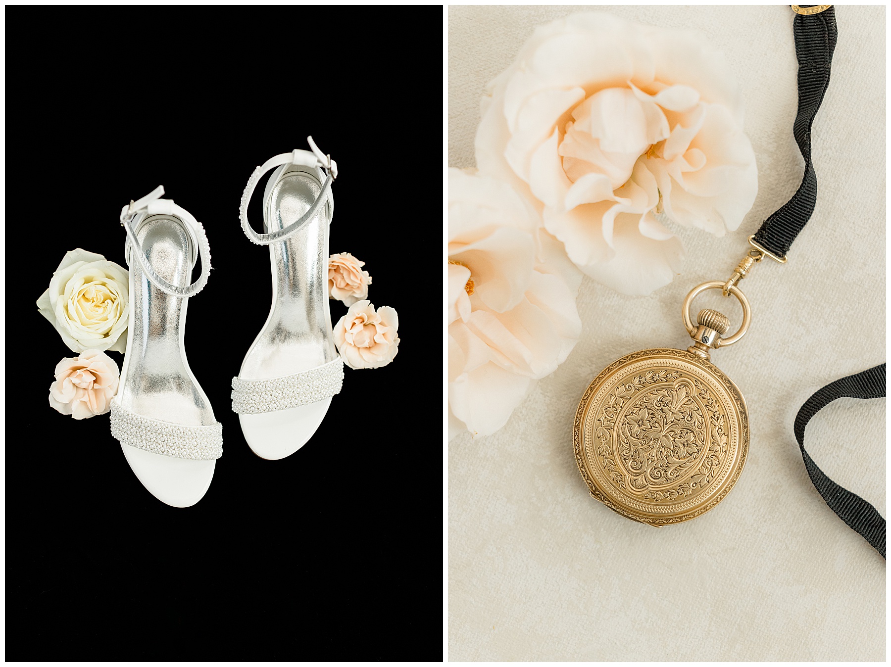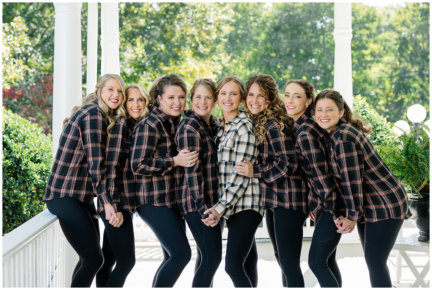 Courtney & the girls had the ENTIRE upstairs of the venue for getting ready spaces! They enjoyed getting glam & wearing their flannels – while listening to a custom playlist of each of their go-to karaoke songs! It was so cute to see how much fun they were all having together! While they were getting glammed, I enjoyed photographing Courtney’s detail photos – it’s not every day that I get to use my favorite color (BLACK!) for details, so that was fun for me!! (A few notes about her details: the pocket watch she carried in her dress pocket – it was a gift the night before from her Aunt – originally being her great-great-grandfather’s watch! The veil was her Aunt’s veil, and the perfume was her mom’s!)