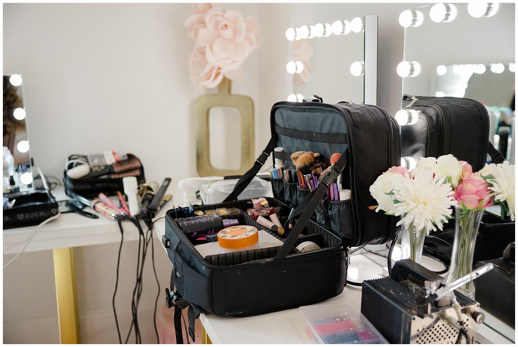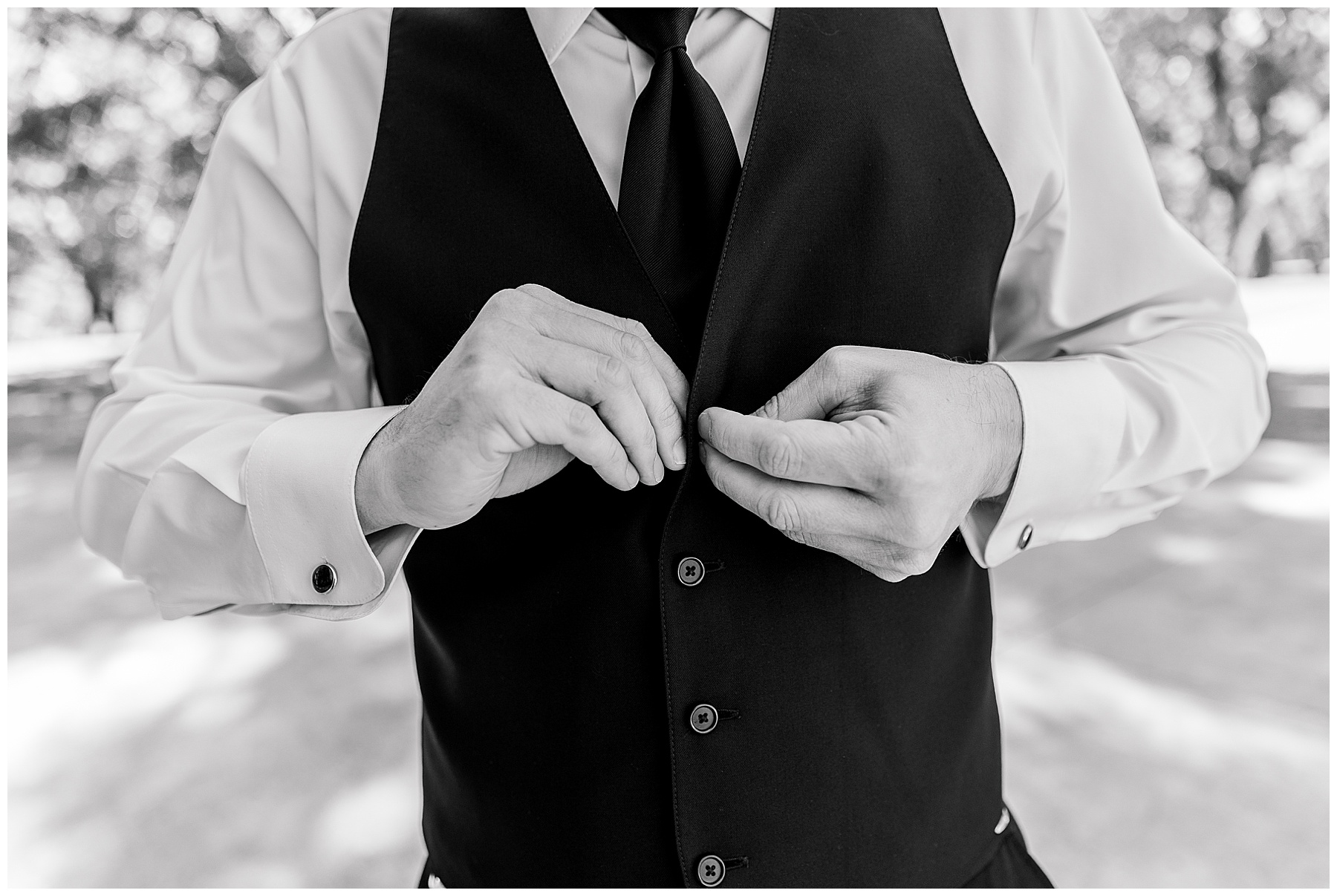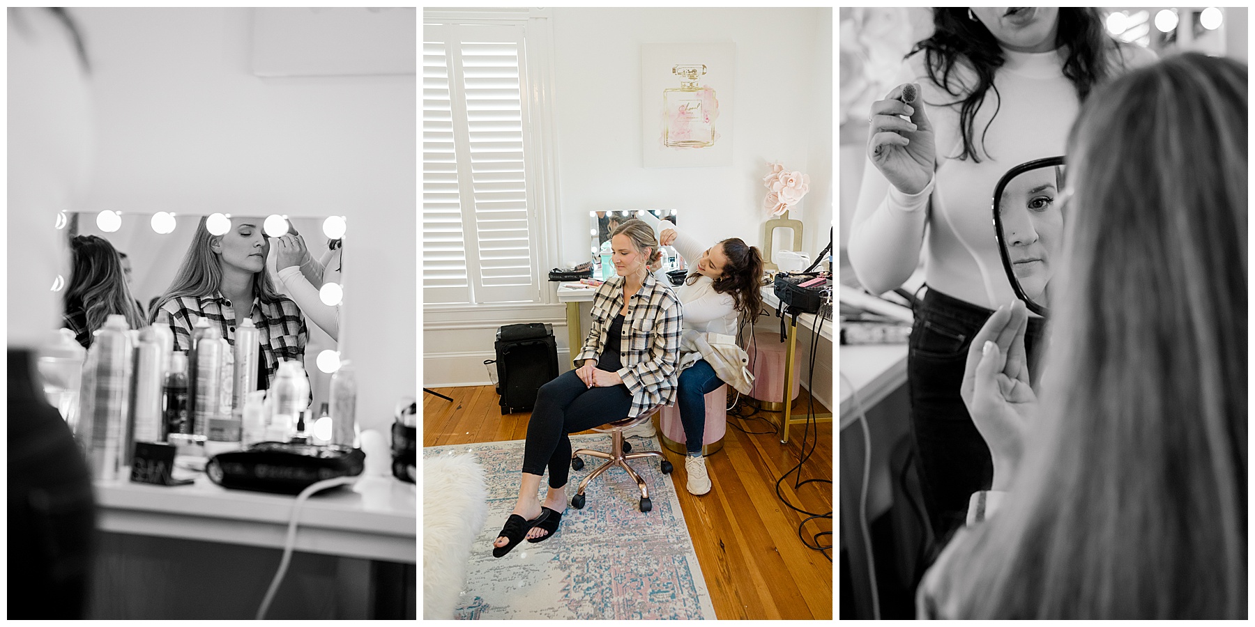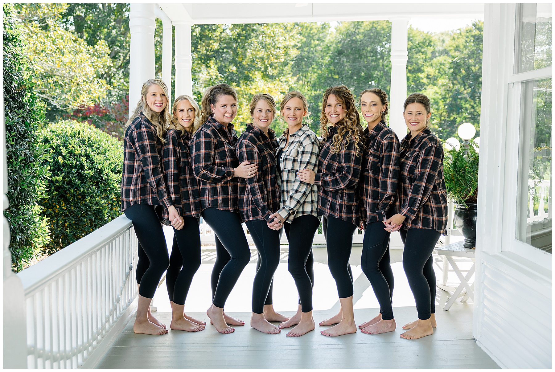 Courtney & the girls had the ENTIRE upstairs of the venue for getting ready spaces! They enjoyed getting glam & wearing their flannels – while listening to a custom playlist of each of their go-to karaoke songs! It was so cute to see how much fun they were all having together! While they were getting glammed, I enjoyed photographing Courtney’s detail photos – it’s not every day that I get to use my favorite color (BLACK!) for details, so that was fun for me!! (A few notes about her details: the pocket watch she carried in her dress pocket – it was a gift the night before from her Aunt – originally being her great-great-grandfather’s watch! The veil was her Aunt’s veil, and the perfume was her mom’s!)