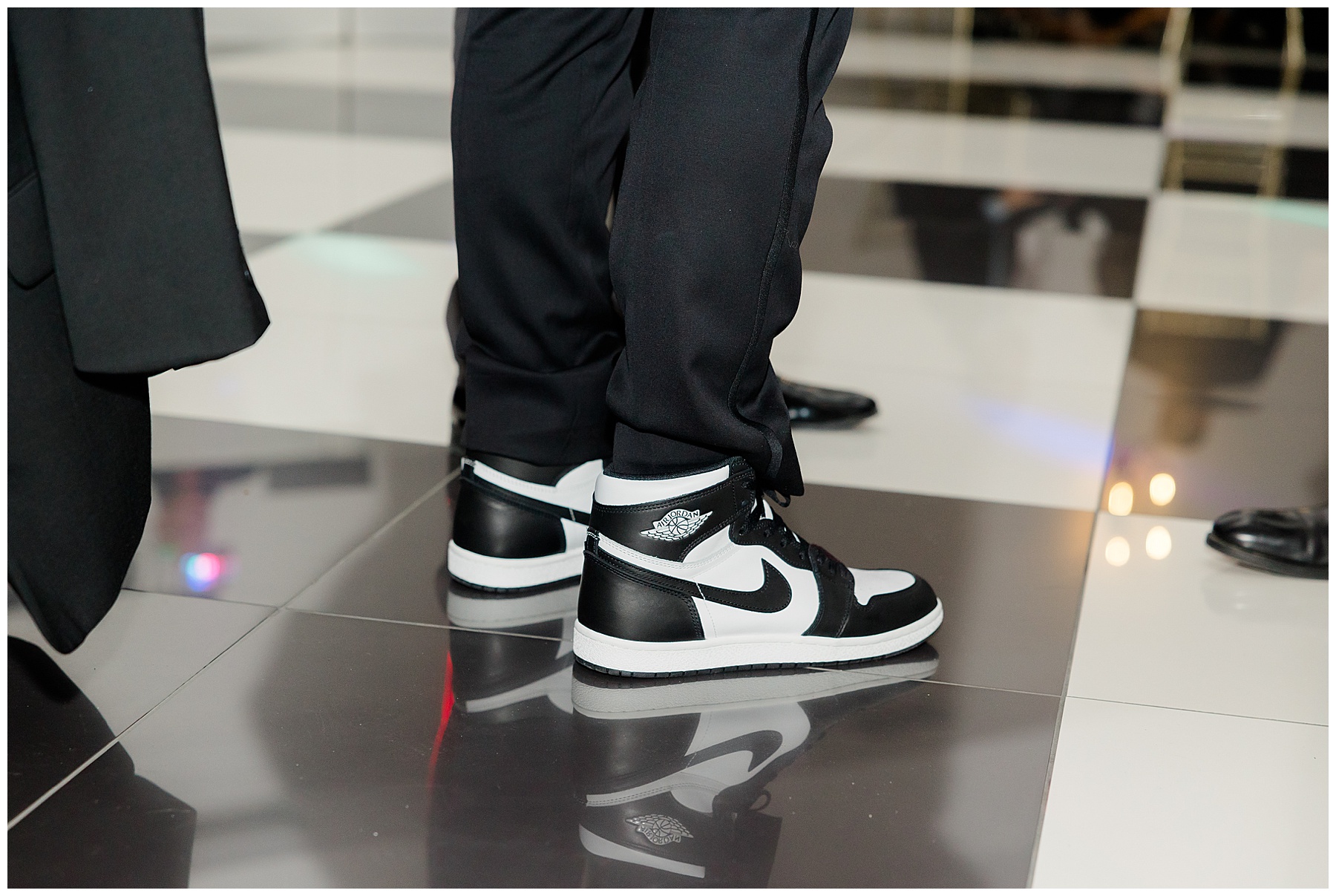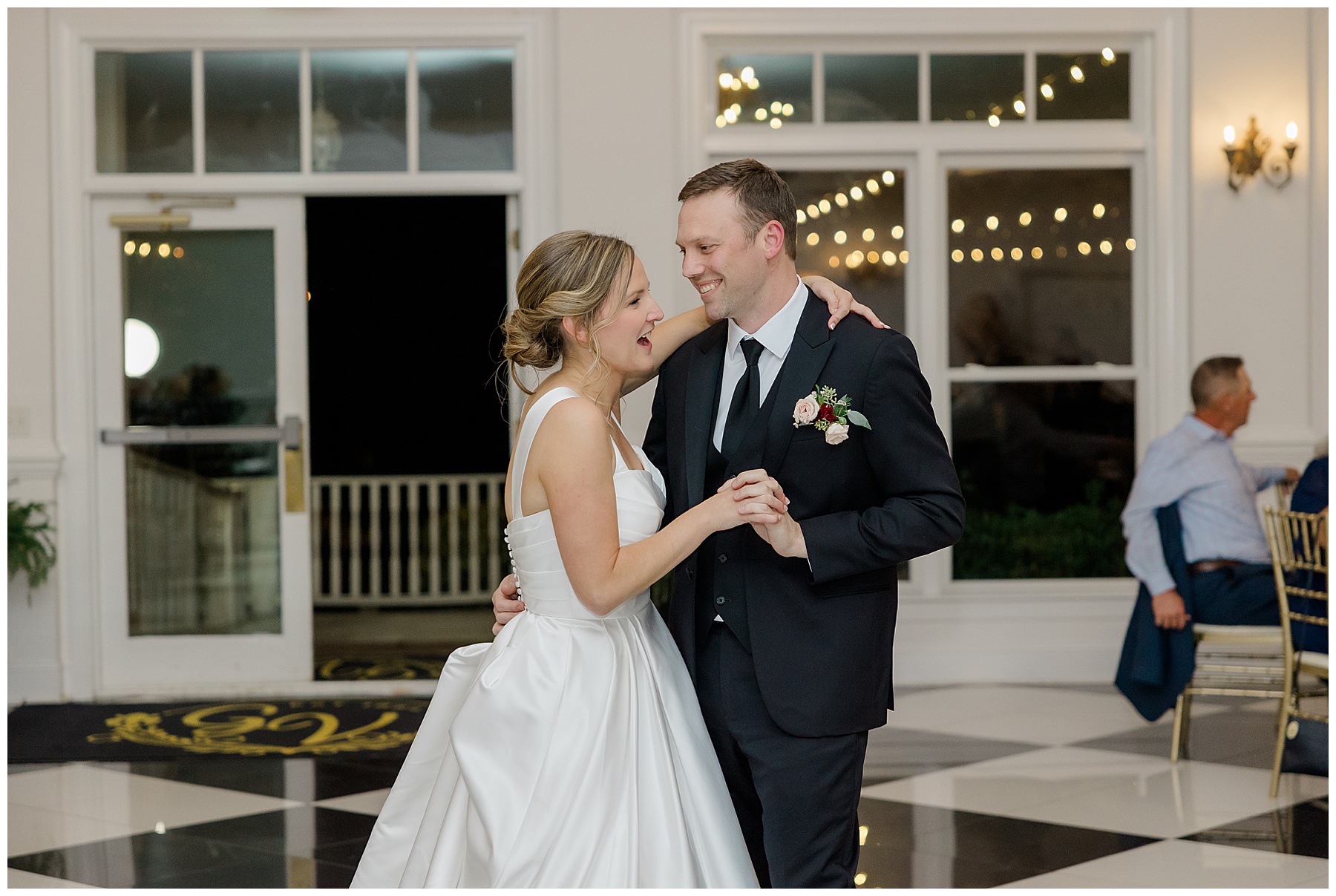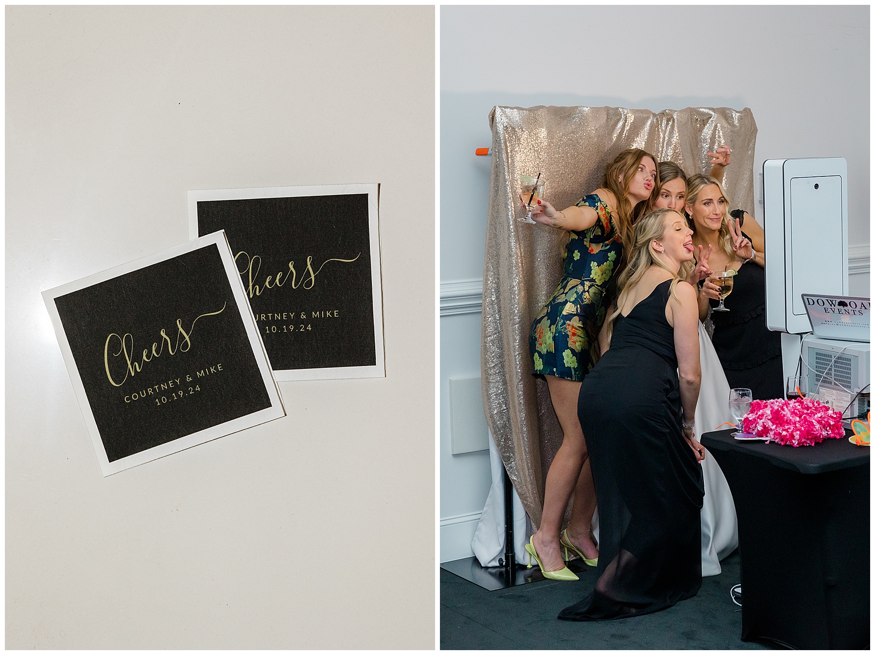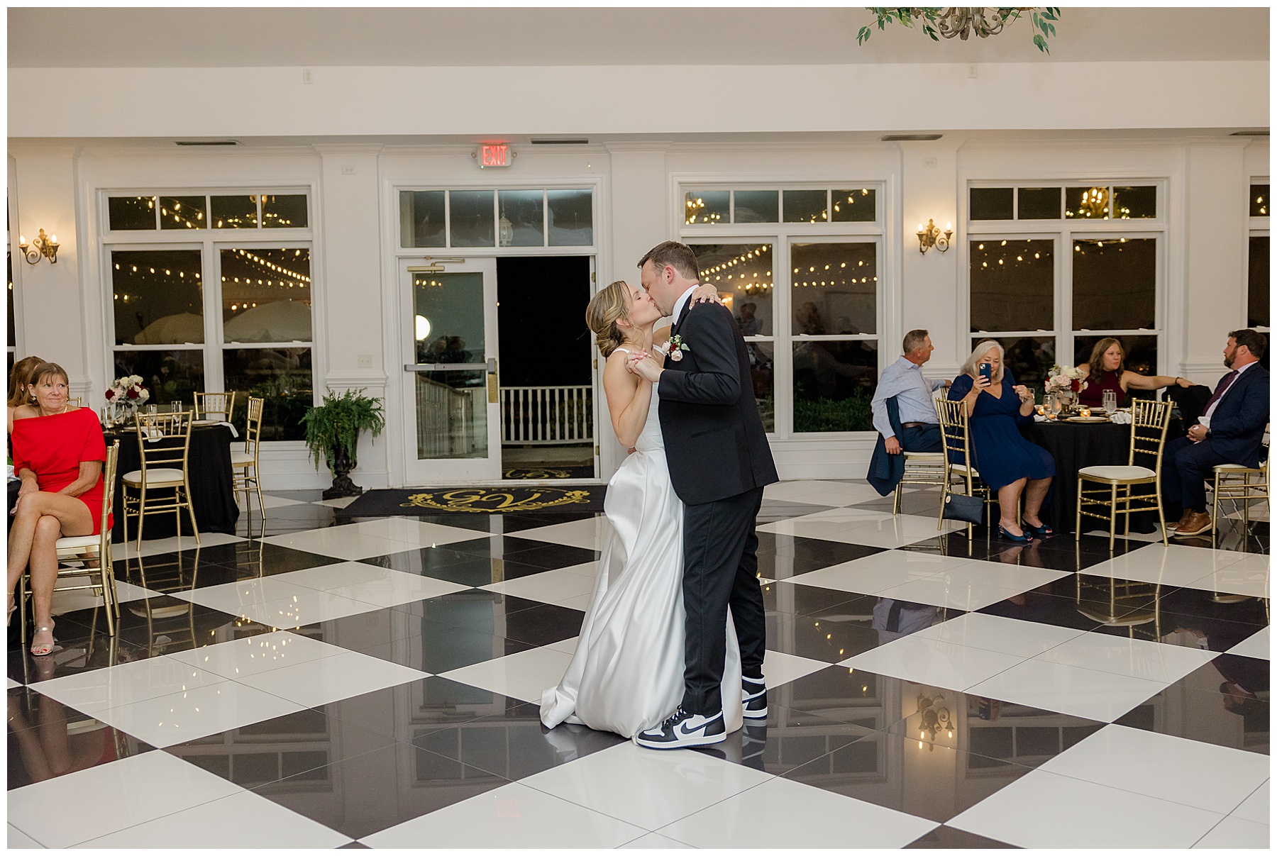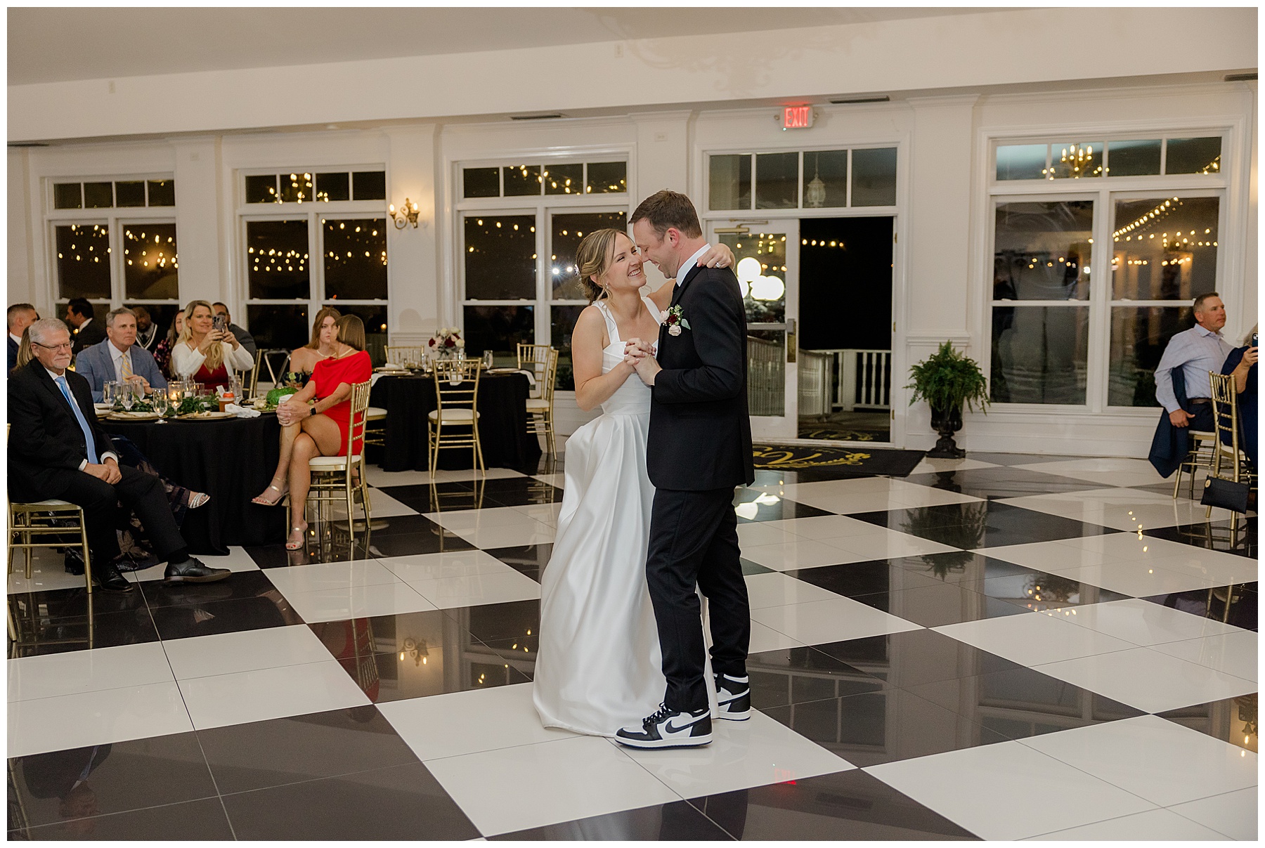 The reception kicked off in the beautiful ballroom! Speaking of “kicks” – Mike and Courtney changed into Nikes for the reception & it was really fun to show their personalities like that! I LOVED the black/white flooring in the reception ballroom, it was so classic! Dinner was absolutely delicious – and following dinner was lots of cake, speeches & toasts, and then a full night of dancing, PhotoBooth photos, firepit conversations, and everyone was having a blast!! Courtney & Mike made such a big effort to spend quality time with their family and friends all night!