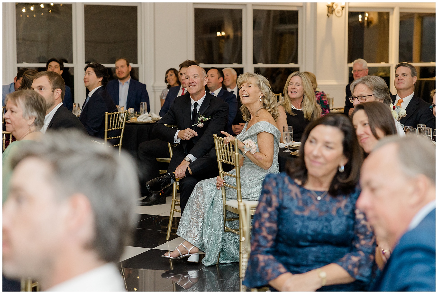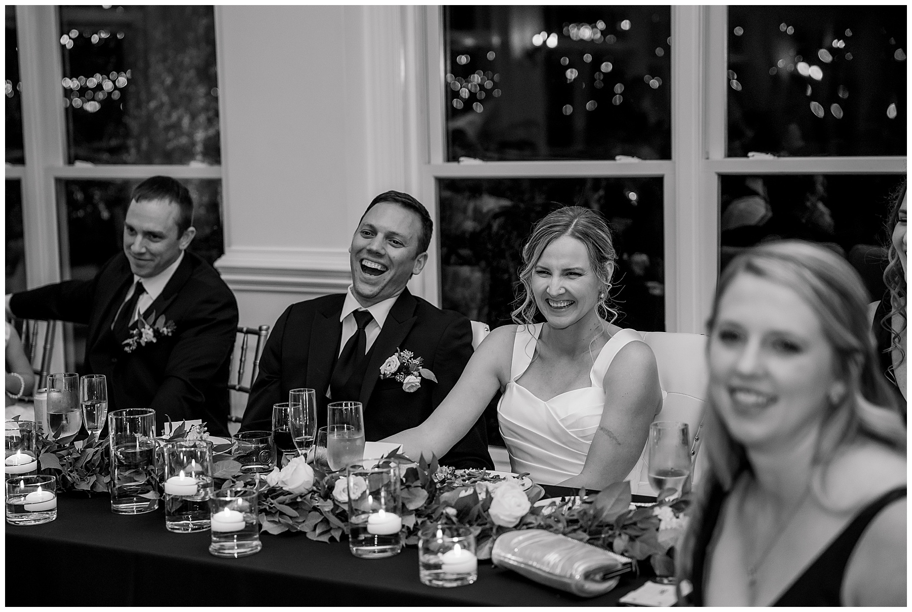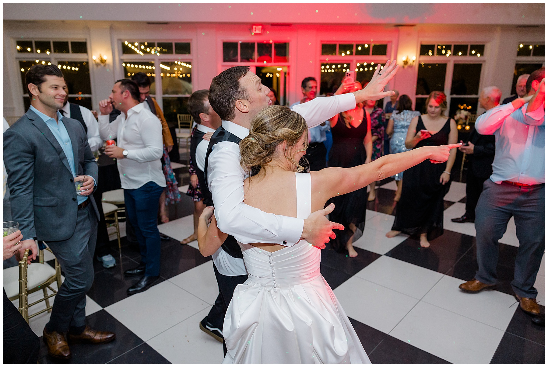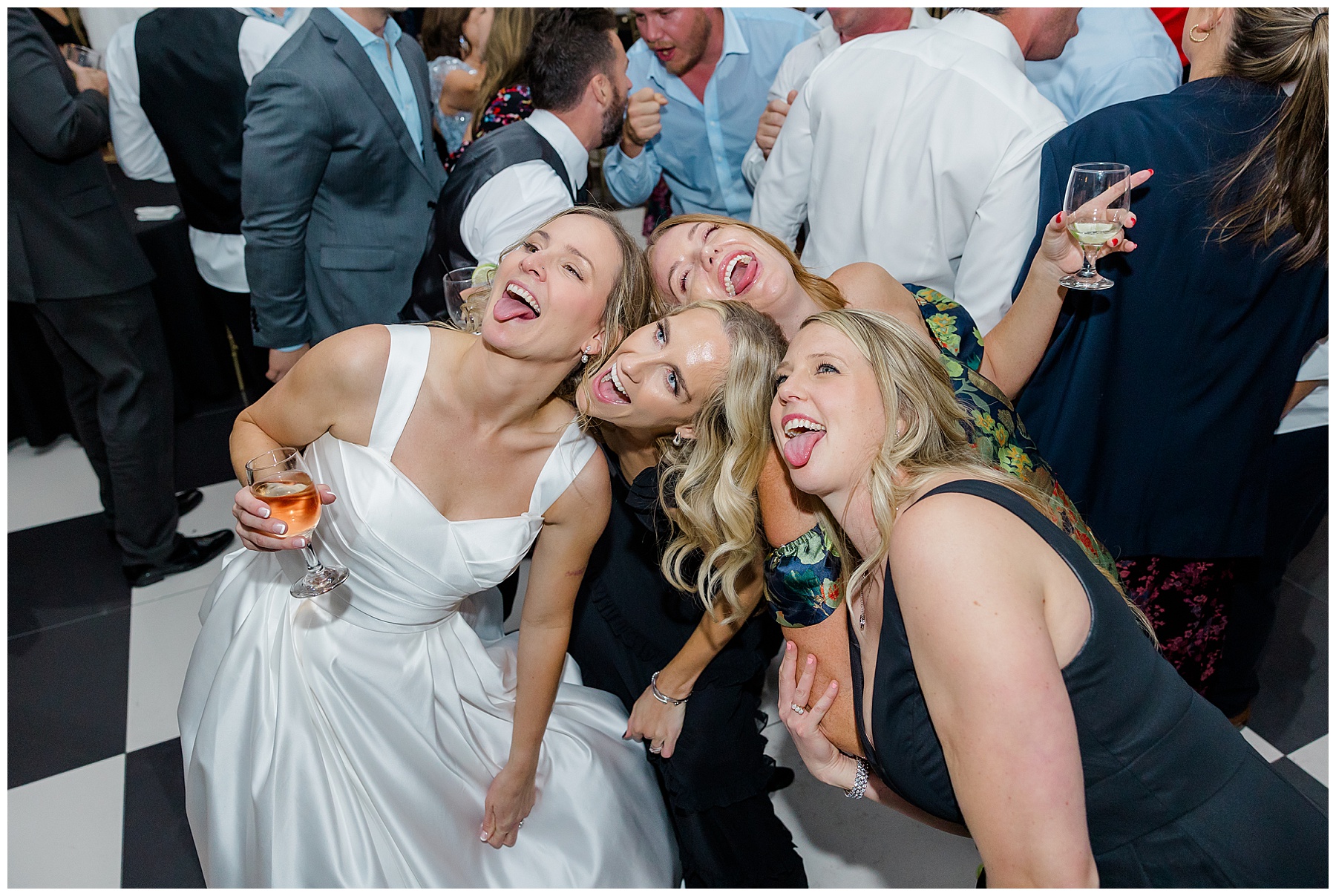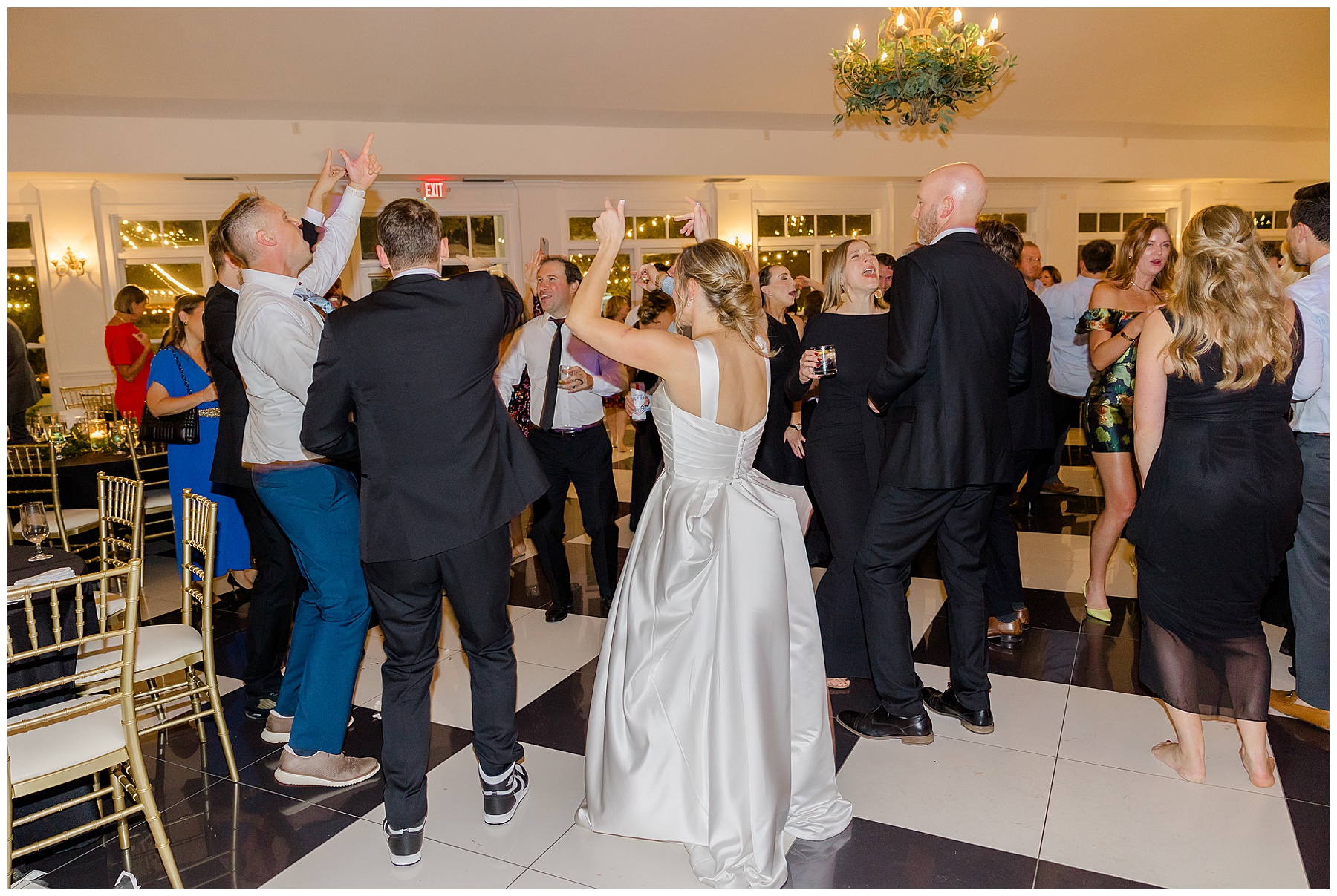The reception kicked off in the beautiful ballroom! Speaking of “kicks” – Mike and Courtney changed into Nikes for the reception & it was really fun to show their personalities like that! I LOVED the black/white flooring in the reception ballroom, it was so classic! Dinner was absolutely delicious – and following dinner was lots of cake, speeches & toasts, and then a full night of dancing, PhotoBooth photos, firepit conversations, and everyone was having a blast!! Courtney & Mike made such a big effort to spend quality time with their family and friends all night!