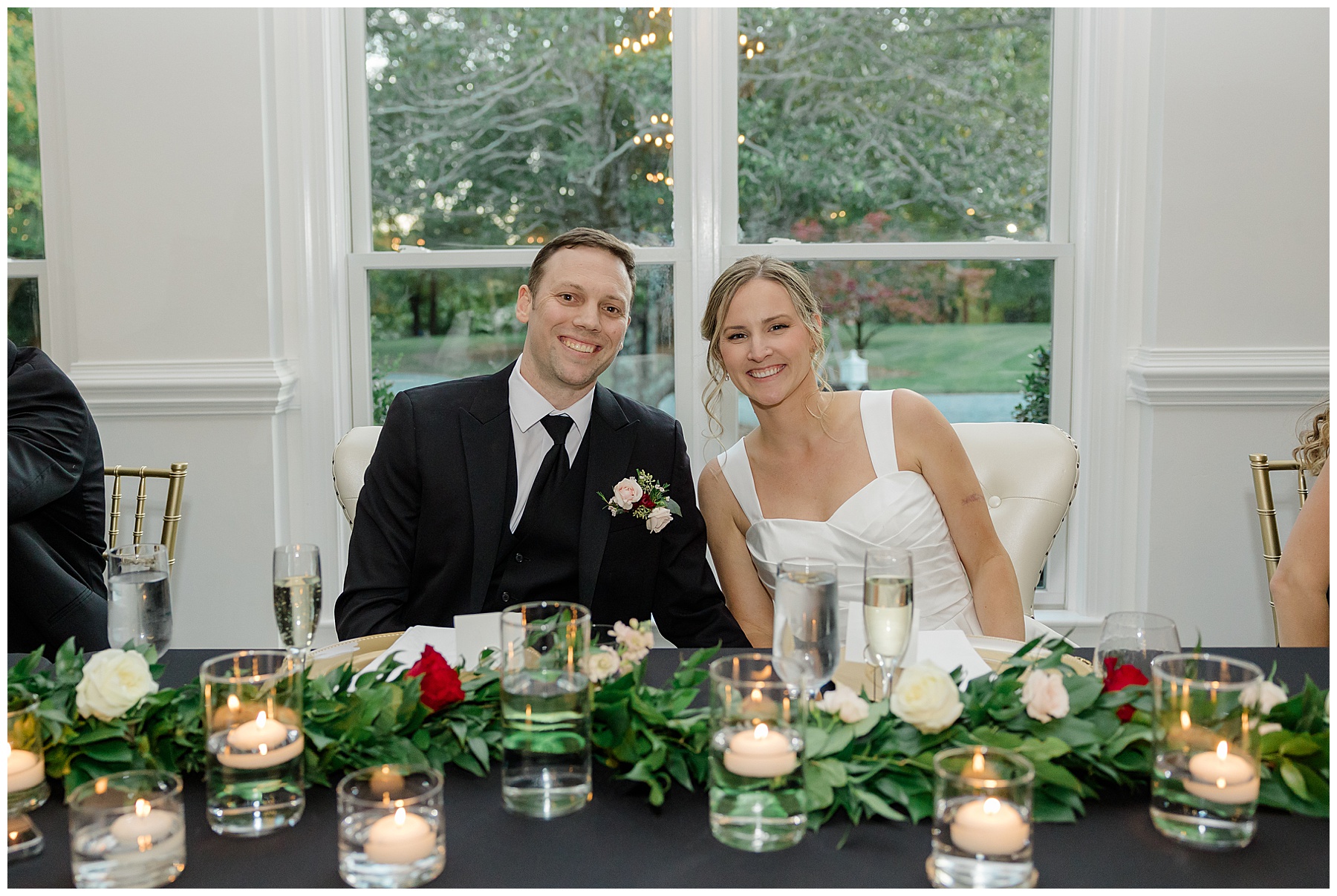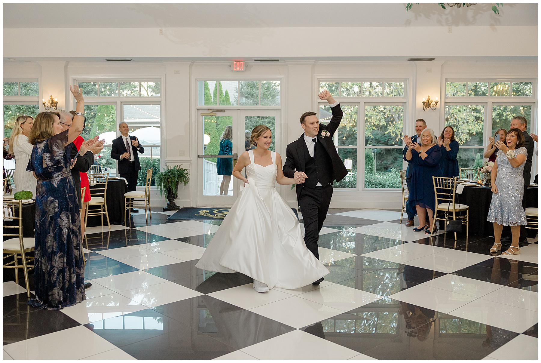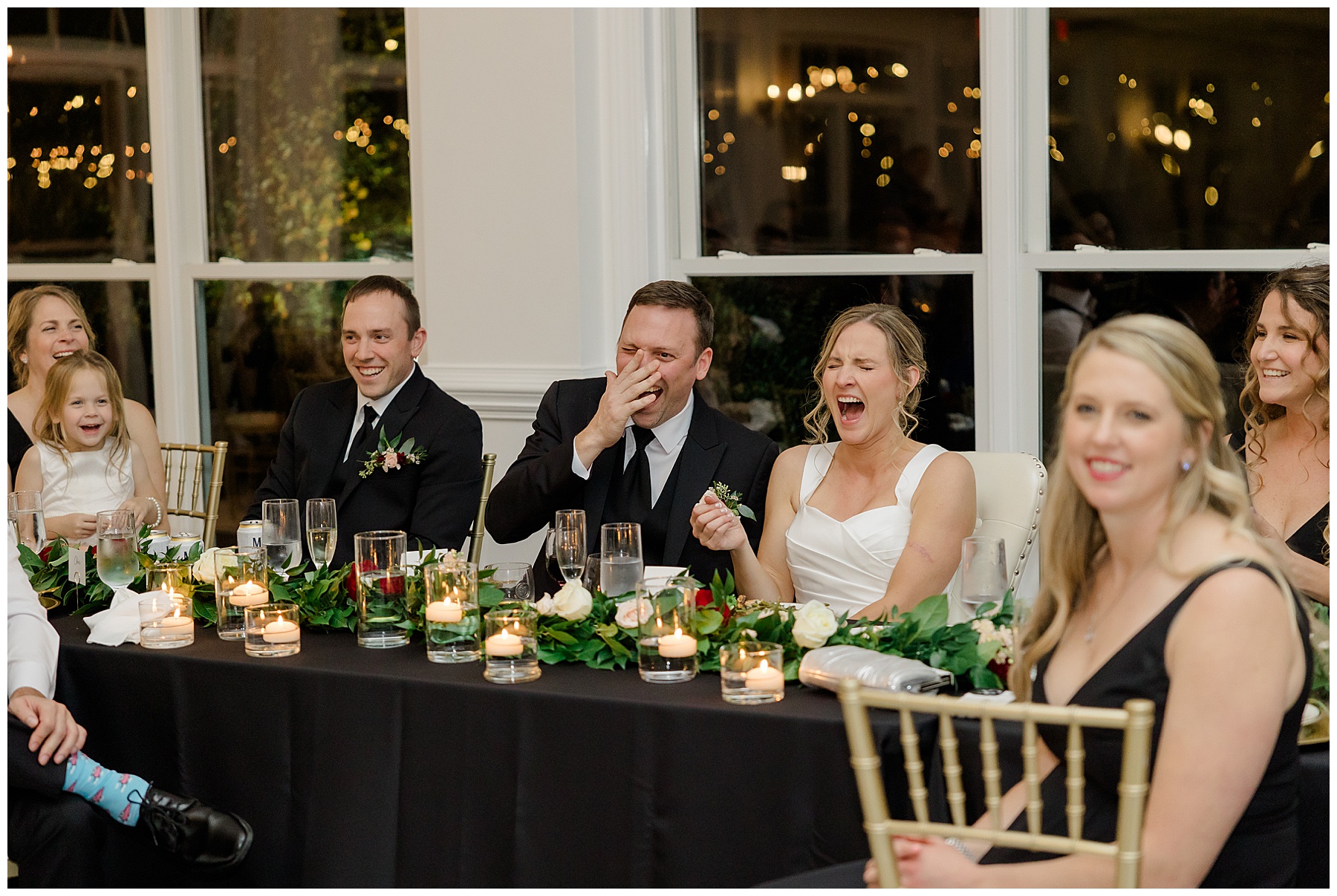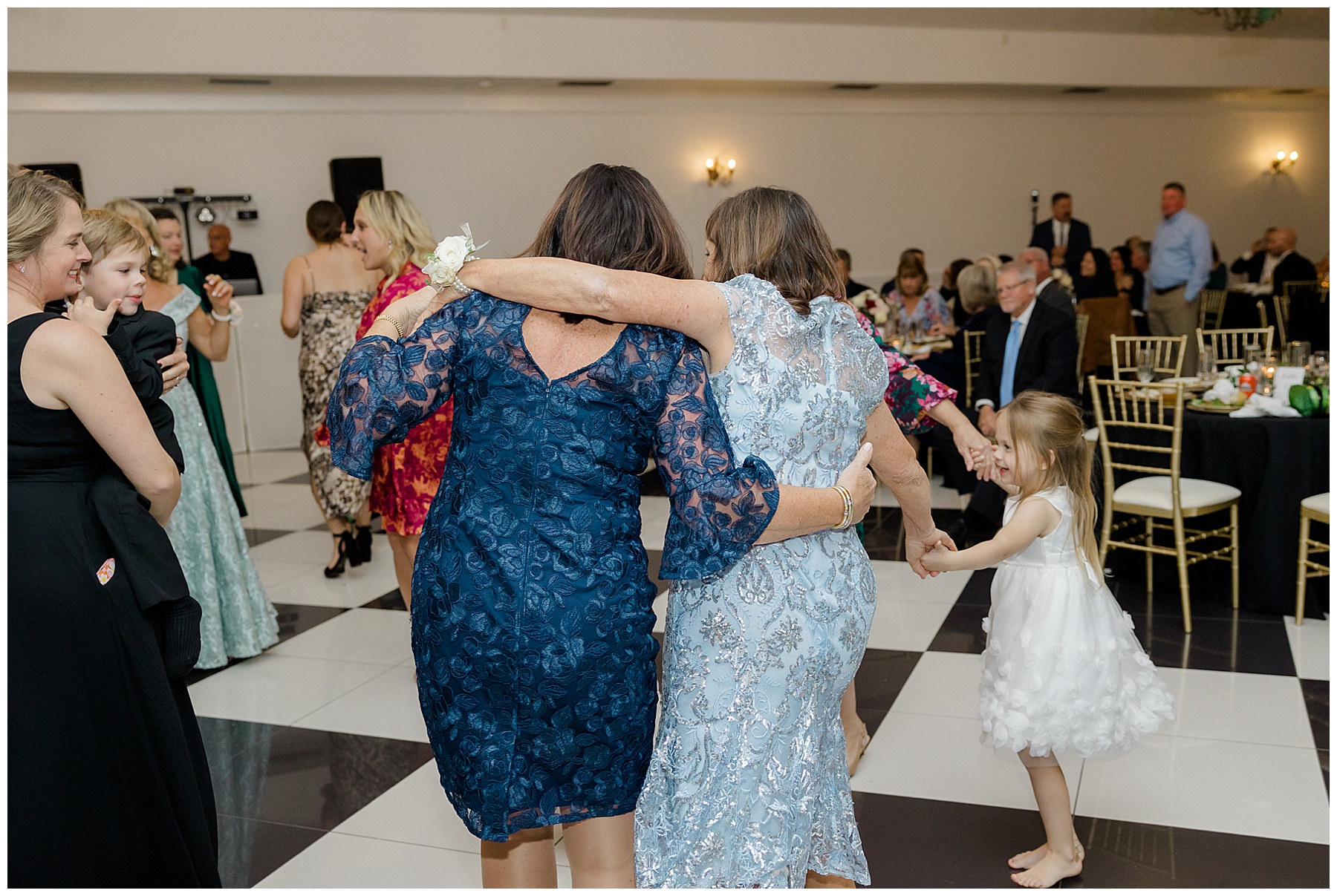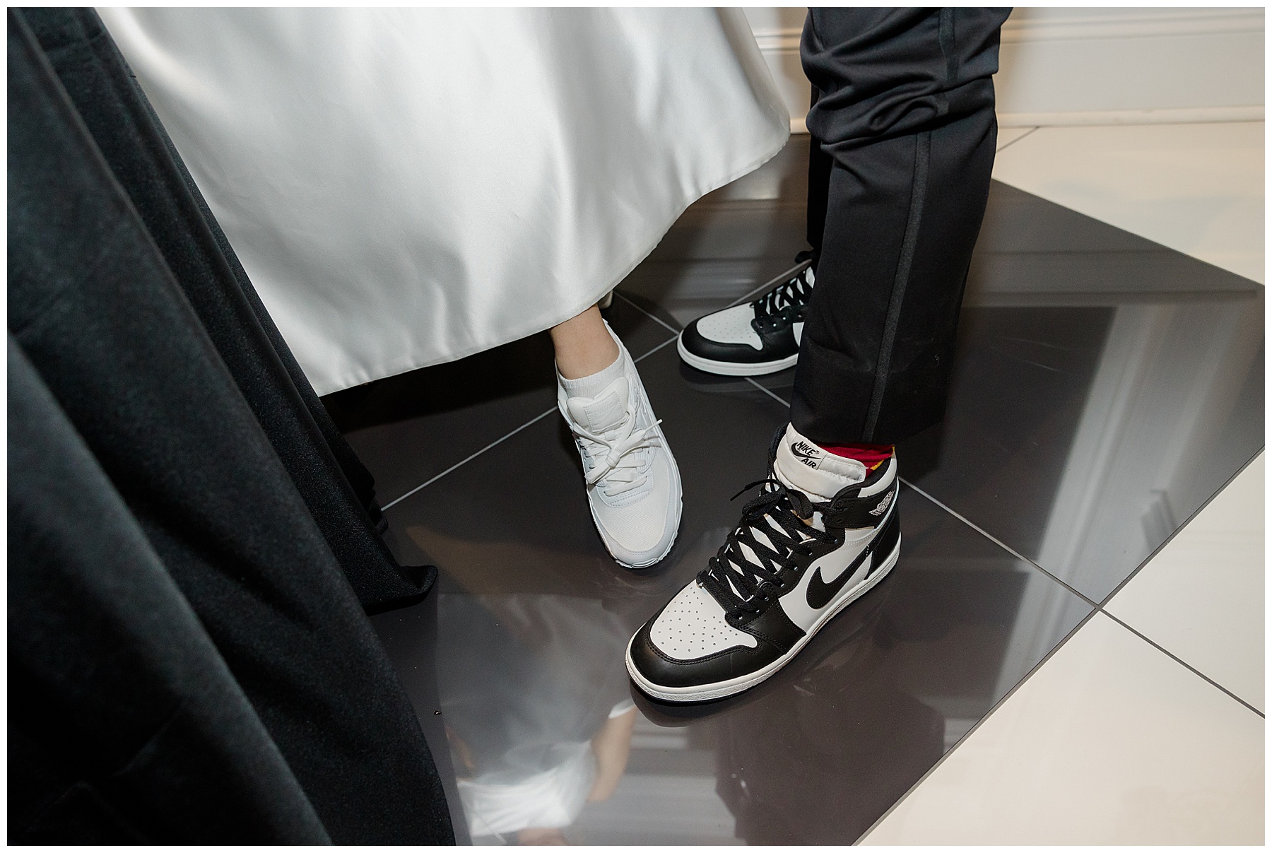 The reception kicked off in the beautiful ballroom! Speaking of “kicks” – Mike and Courtney changed into Nikes for the reception & it was really fun to show their personalities like that! I LOVED the black/white flooring in the reception ballroom, it was so classic! Dinner was absolutely delicious – and following dinner was lots of cake, speeches & toasts, and then a full night of dancing, PhotoBooth photos, firepit conversations, and everyone was having a blast!! Courtney & Mike made such a big effort to spend quality time with their family and friends all night!