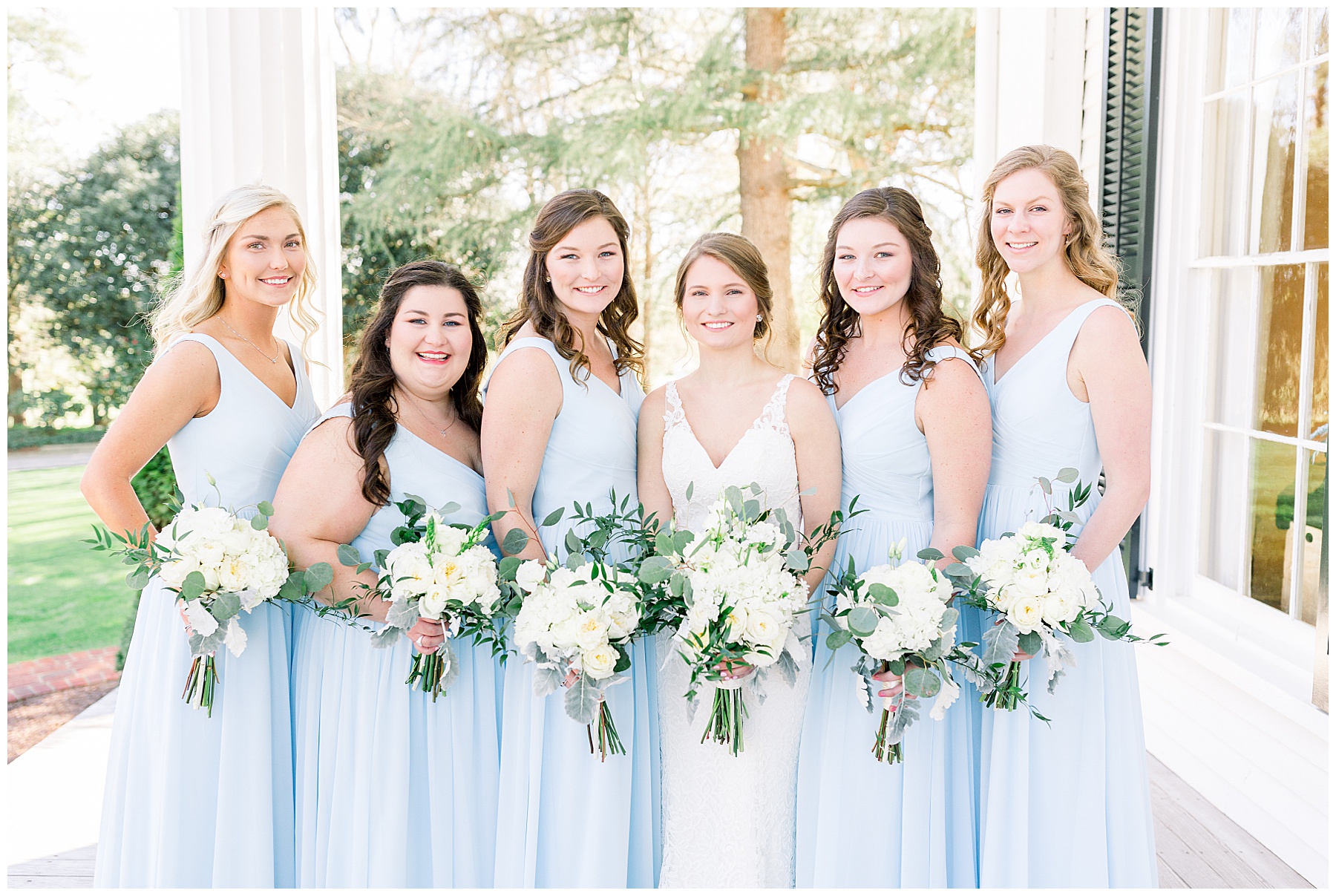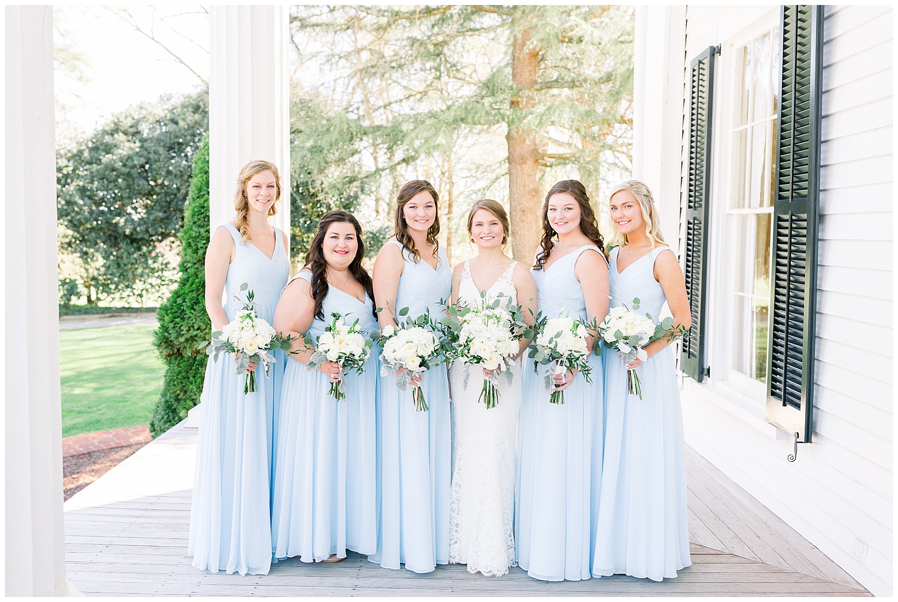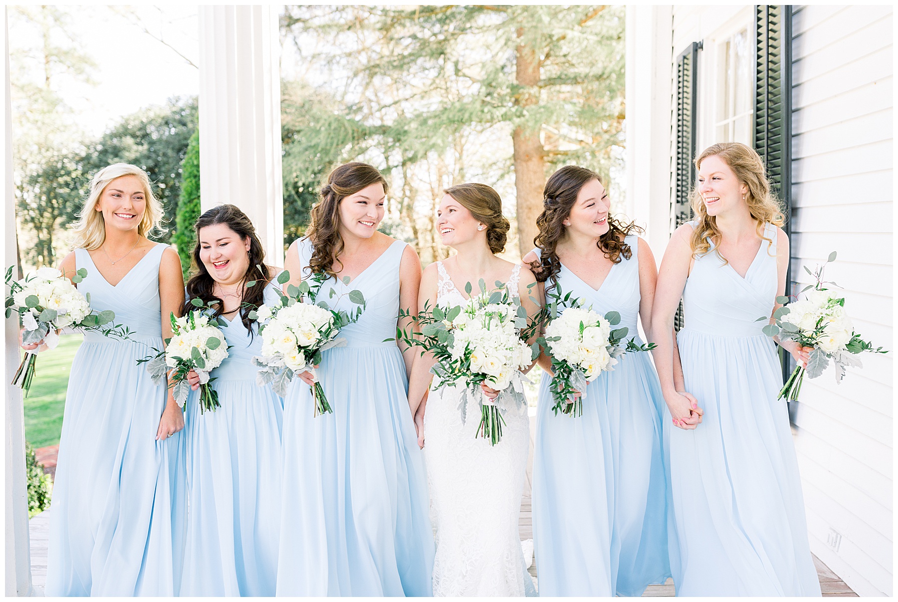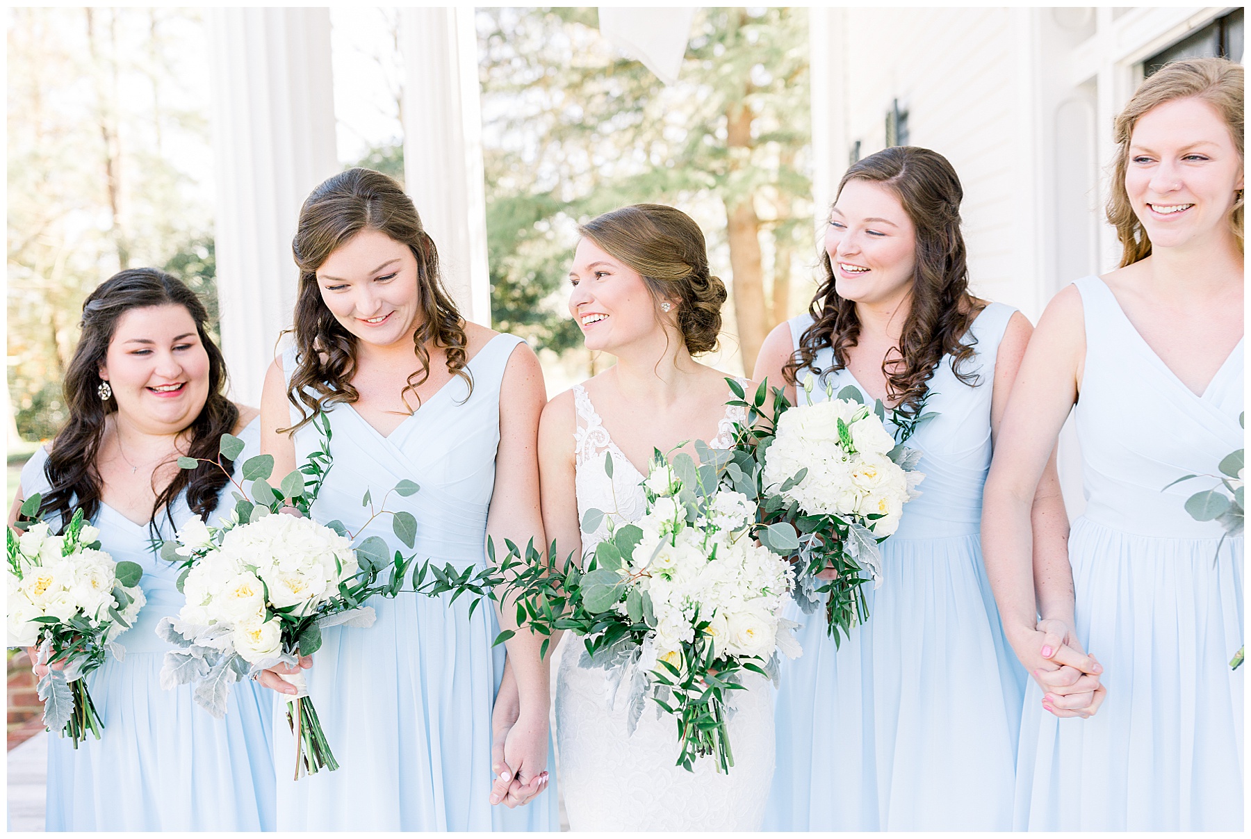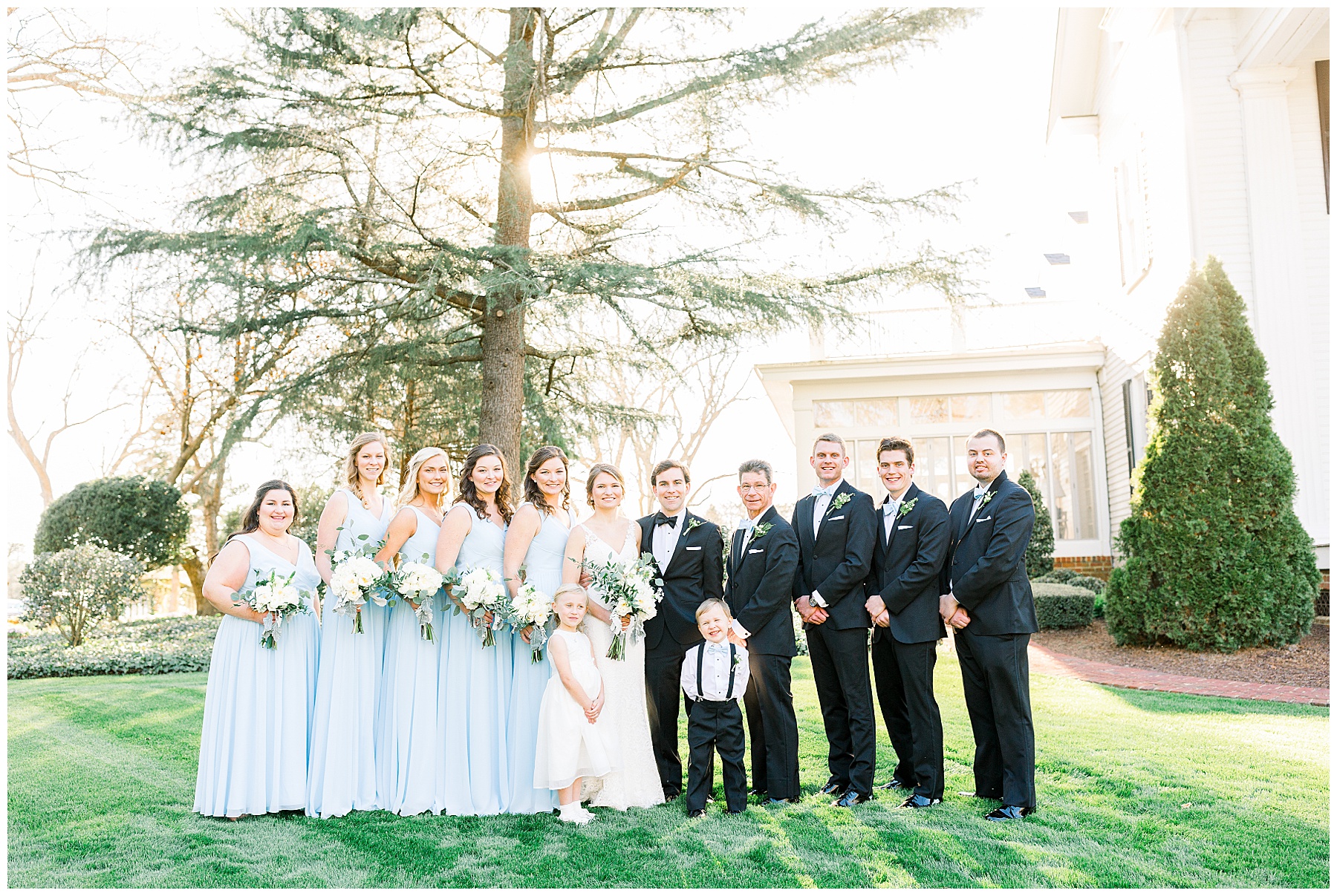 As both UNC grads, Emily and Matthew used touches of soft “Tarheel blue” throughout the day, and I LOVED how classic the guys looked in their tuxes, with a little pop of blue on their bowties! The ladies looked stunning in the blue with white and greenery in their bouquets! It was one of my FAVORITE bridal party combinations I’ve ever photographed!