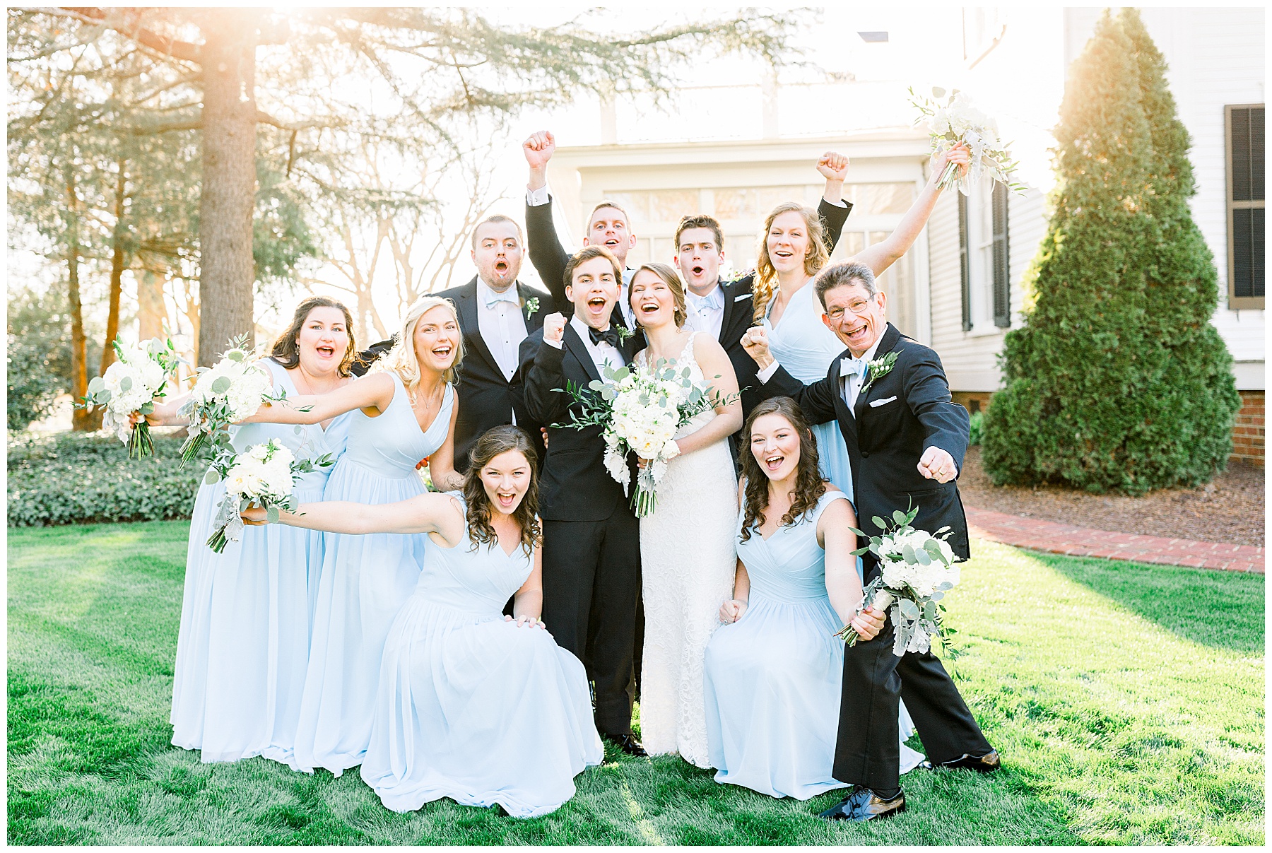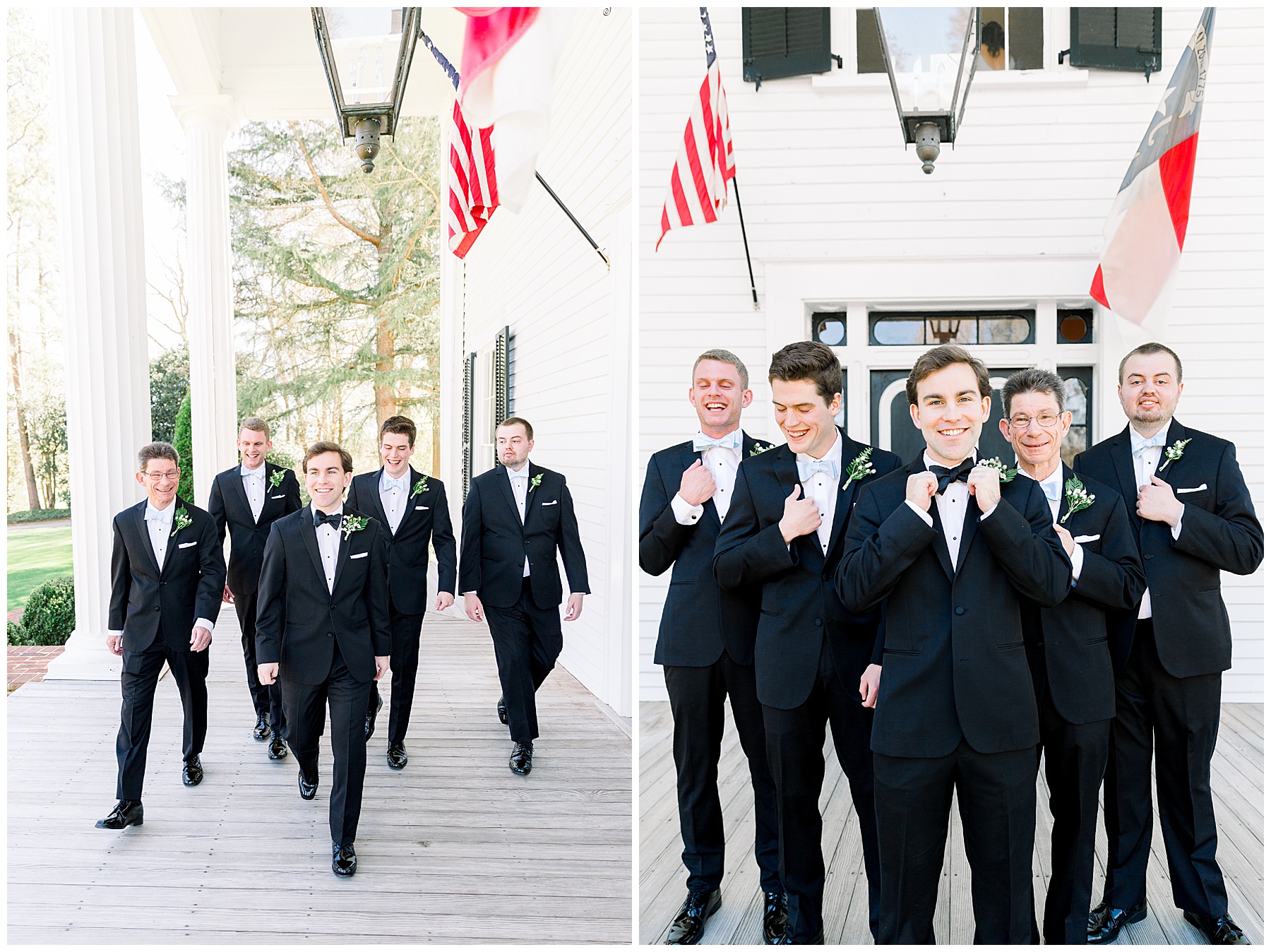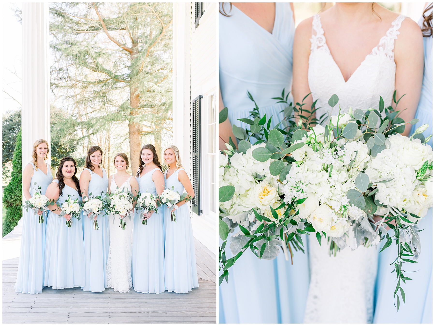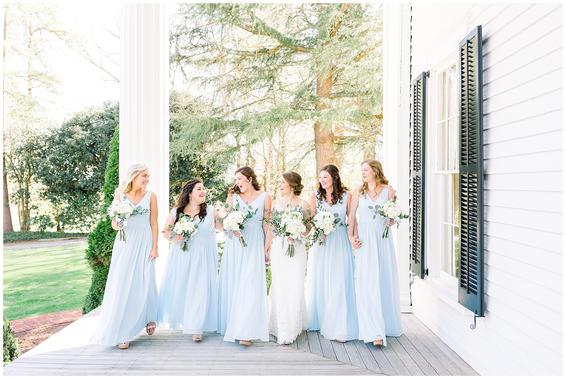 As both UNC grads, Emily and Matthew used touches of soft “Tarheel blue” throughout the day, and I LOVED how classic the guys looked in their tuxes, with a little pop of blue on their bowties! The ladies looked stunning in the blue with white and greenery in their bouquets! It was one of my FAVORITE bridal party combinations I’ve ever photographed!