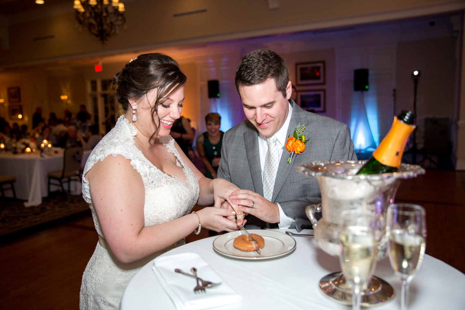 They treated their guests to really yummy food (shout out to the mac-n-cheese chef! YUM!) and everyone had a blast on the dancefloor! A Krispy Kreme donut was cut instead of cake, and they had a whole dessert table of family favorites! The night ended with a glowstick exit.