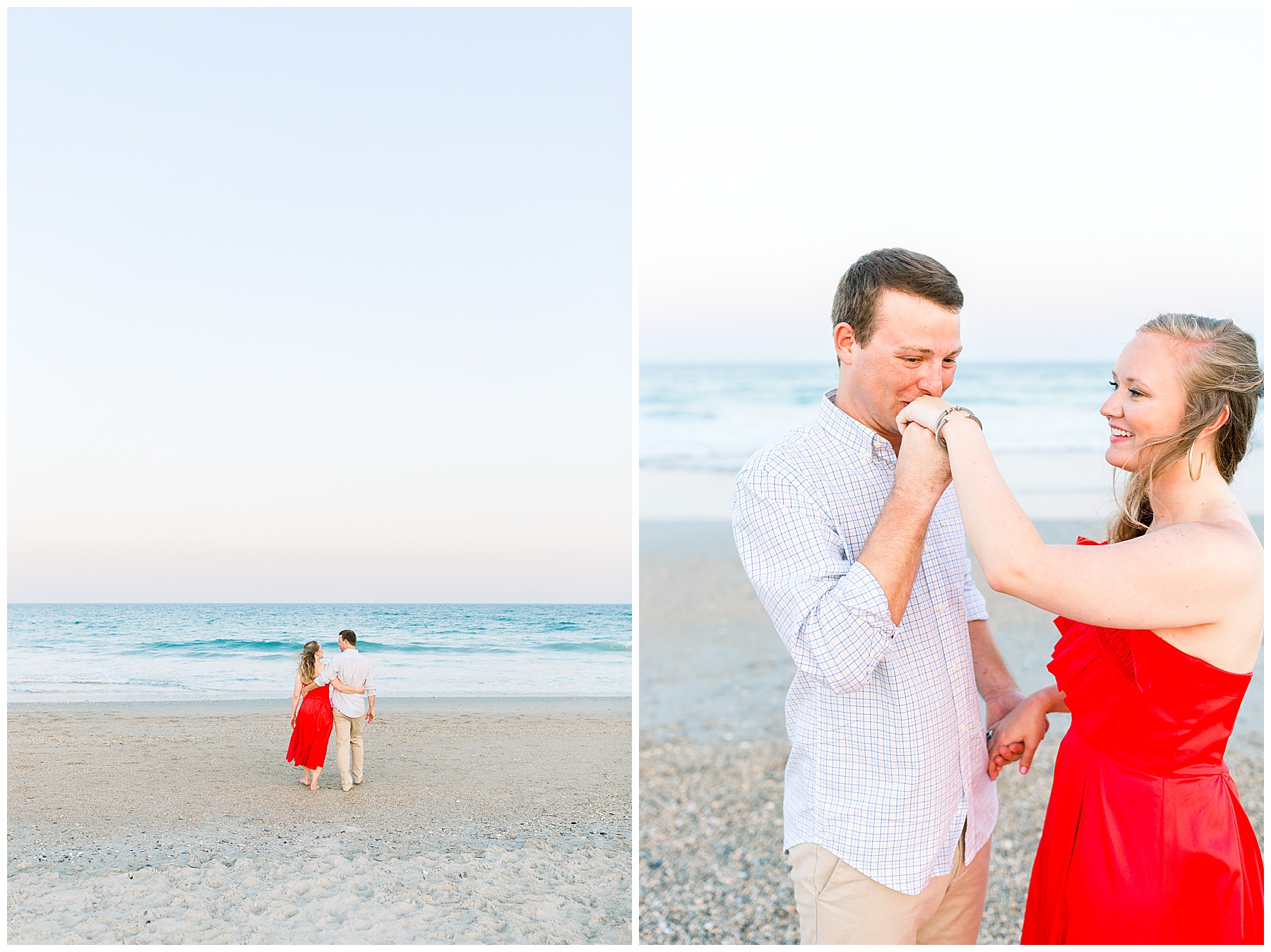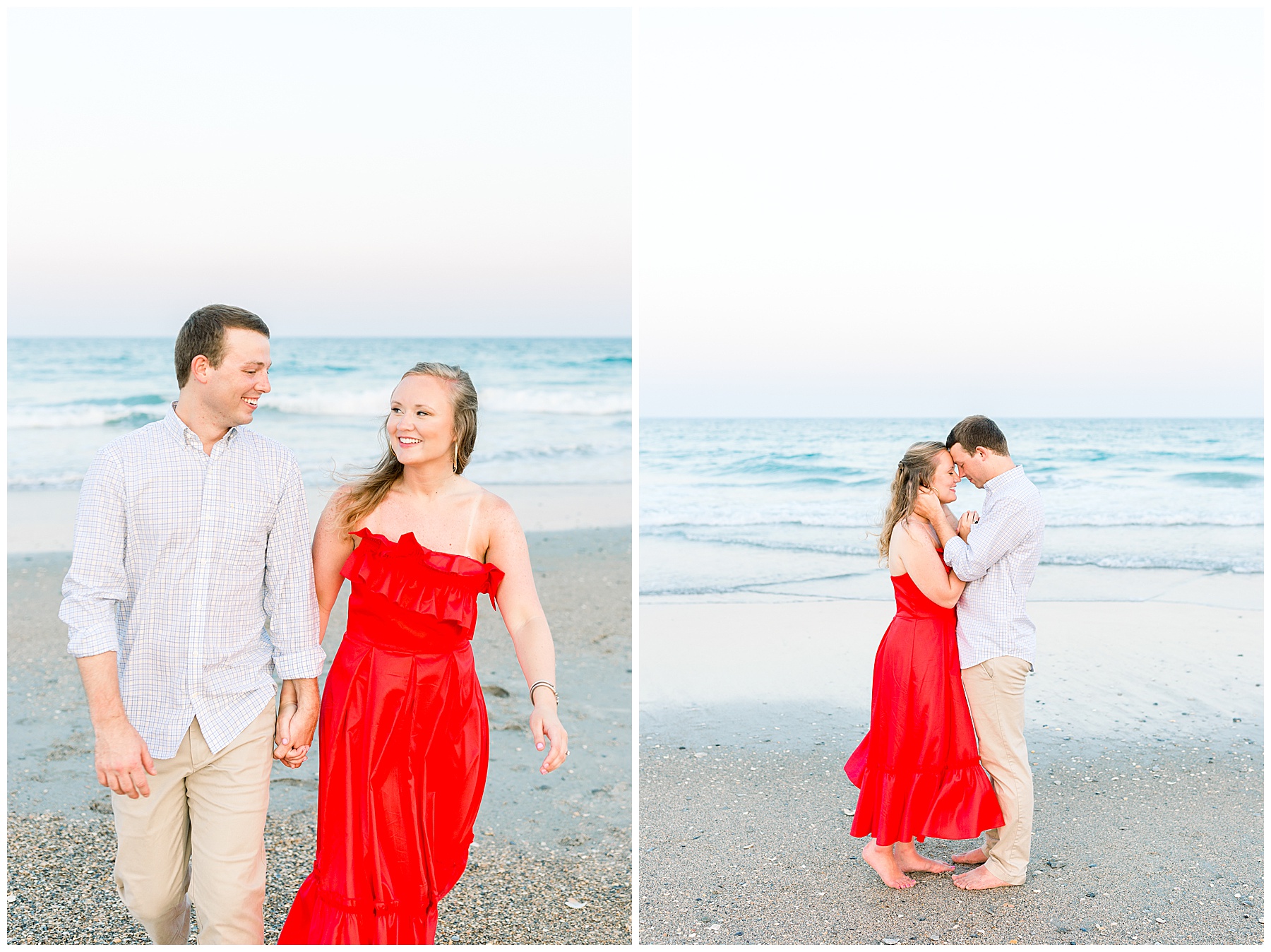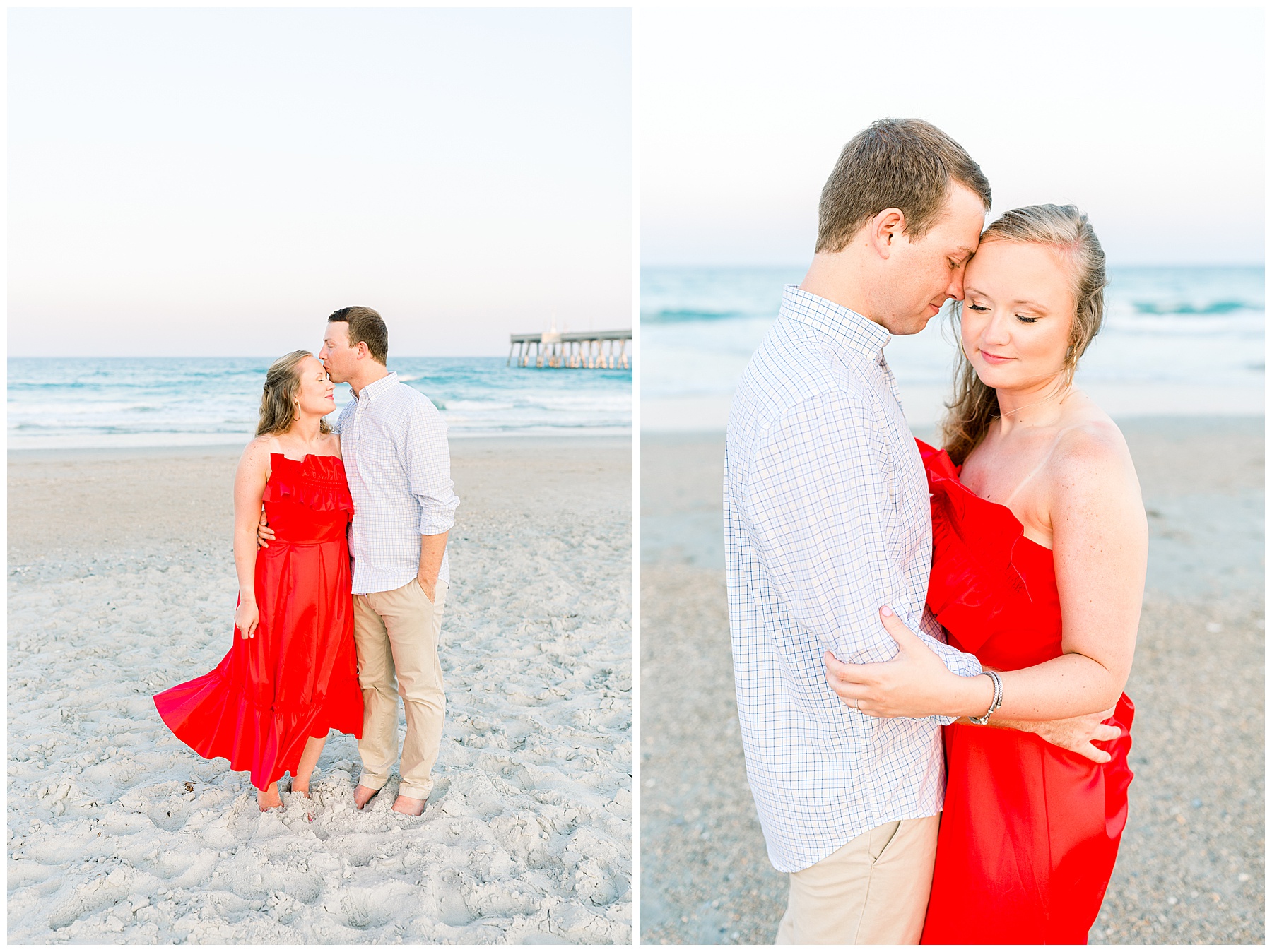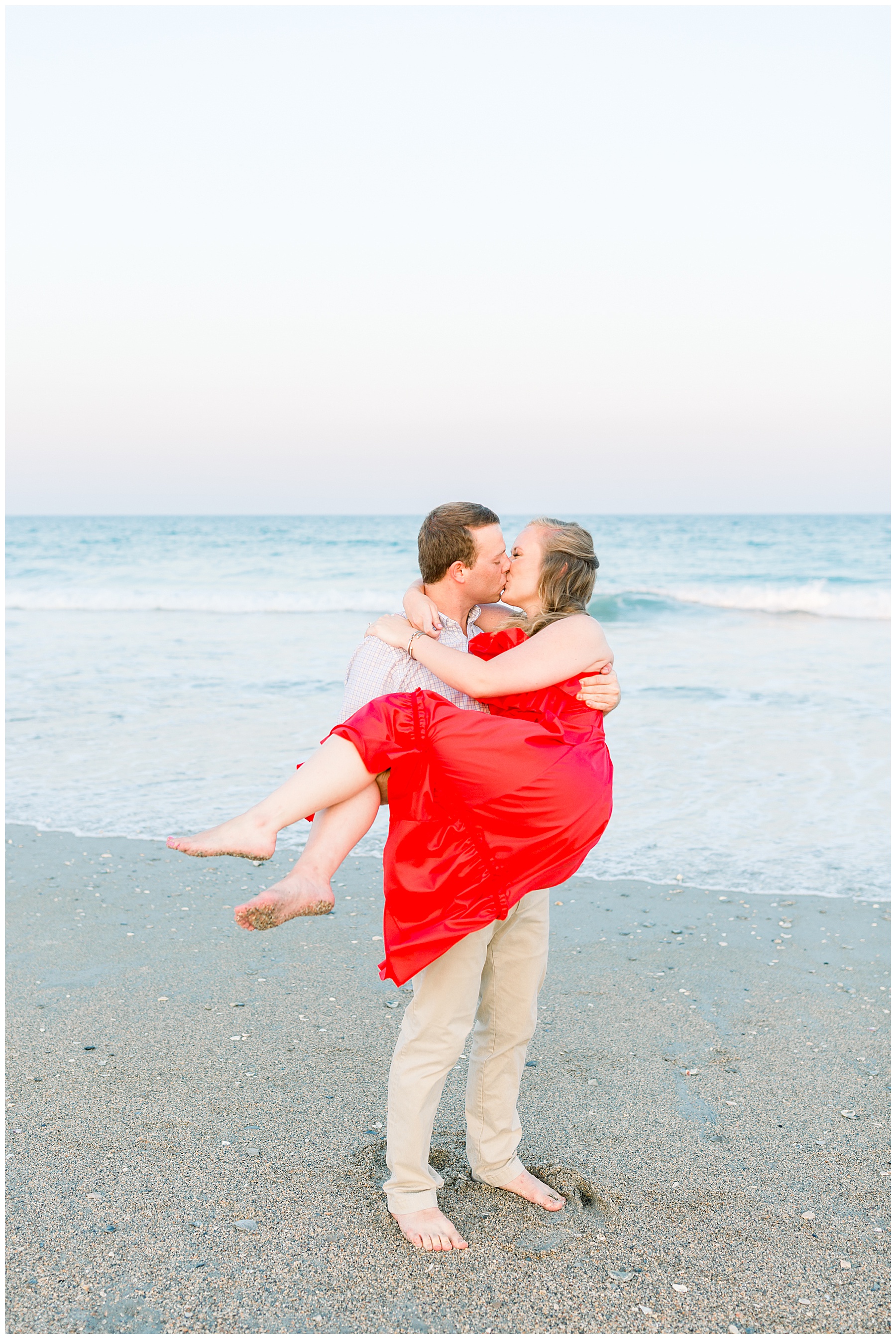 We started the session walking around a tree-lined neighborhood, and a sweet resident offered us to use her dock! Lots of flowers were in bloom, and the sunshine filtering through the trees was so beautiful! As the sun got softer, we headed down to the beach, and Jen changed into an “NC State red dress” as I called it (They both graduated from NC State with engineering degrees!) and it looked so pretty against the blue of the ocean!!!!
