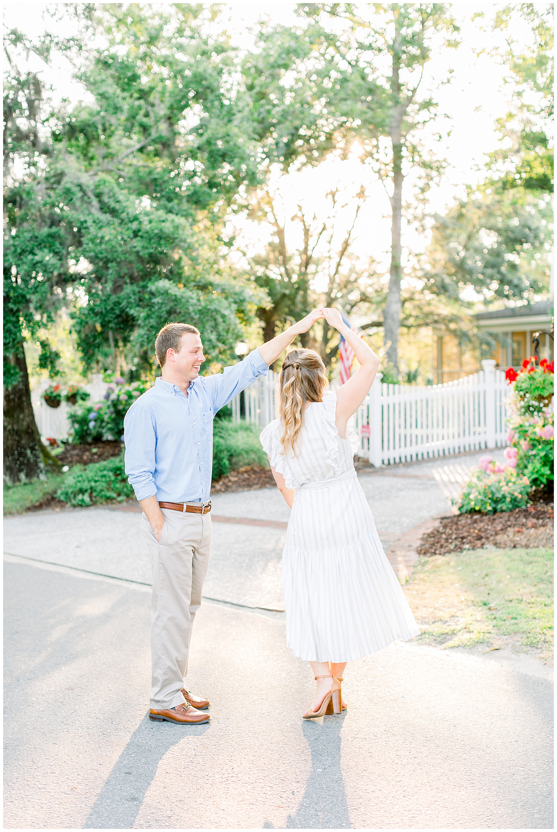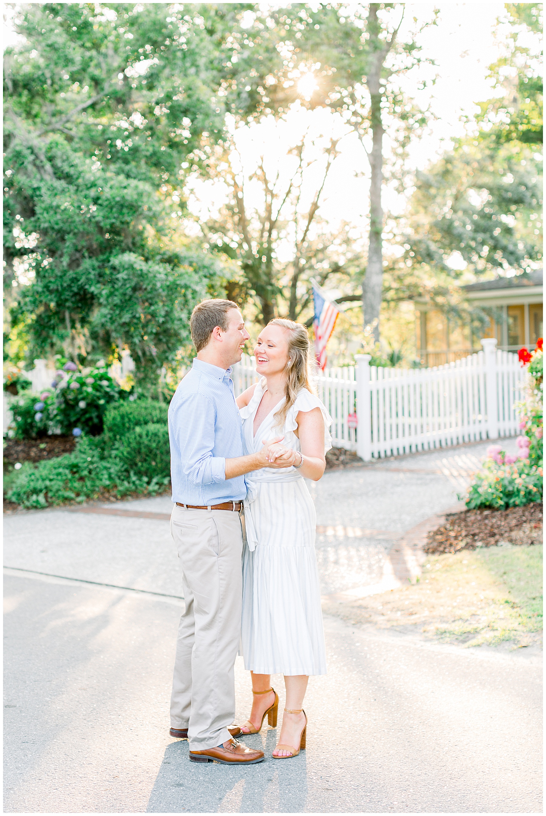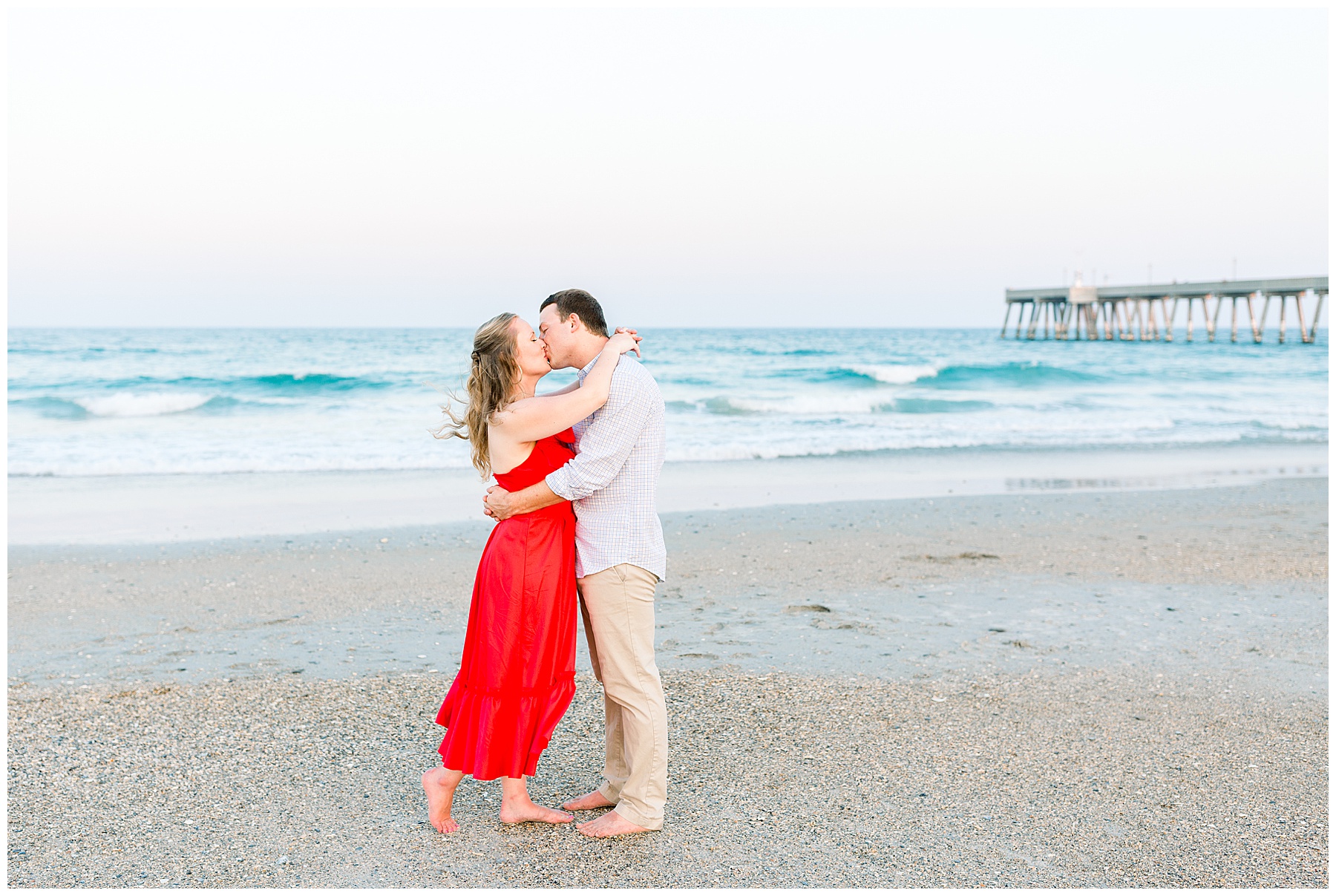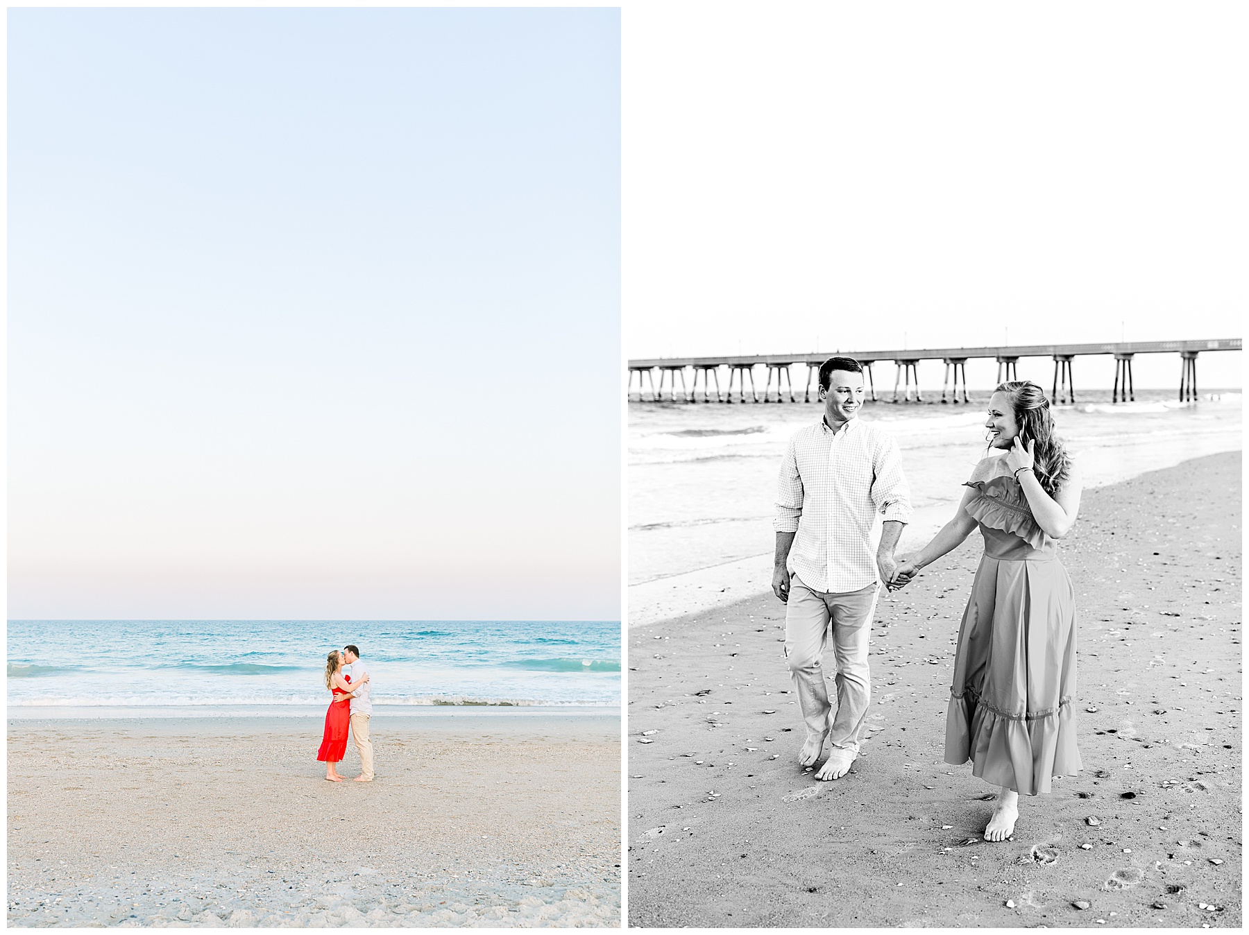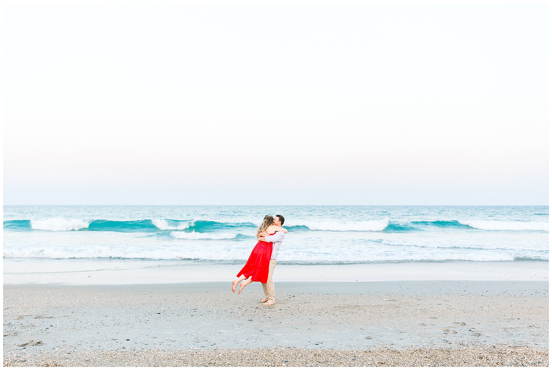We started the session walking around a tree-lined neighborhood, and a sweet resident offered us to use her dock! Lots of flowers were in bloom, and the sunshine filtering through the trees was so beautiful! As the sun got softer, we headed down to the beach, and Jen changed into an “NC State red dress” as I called it (They both graduated from NC State with engineering degrees!) and it looked so pretty against the blue of the ocean!!!!