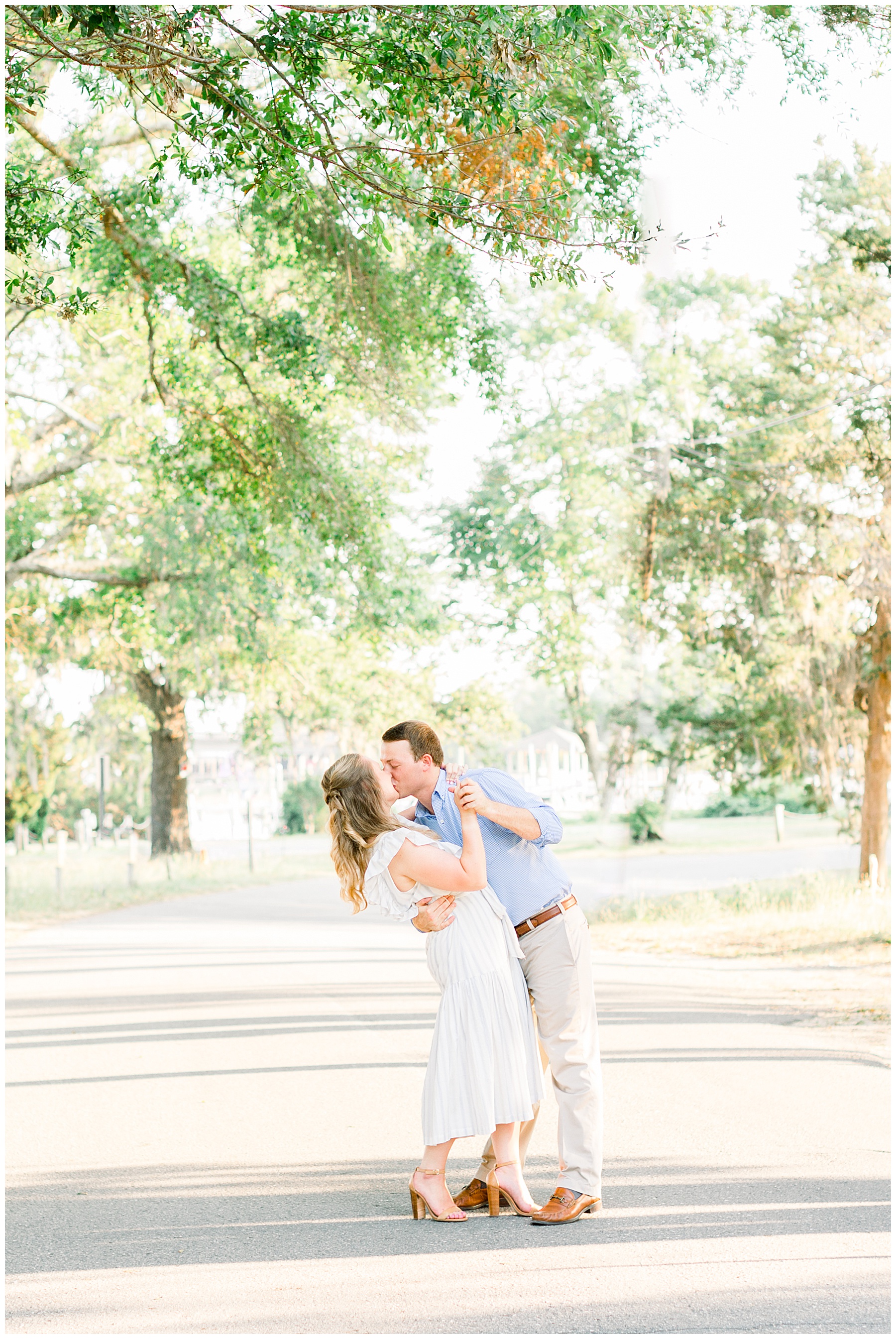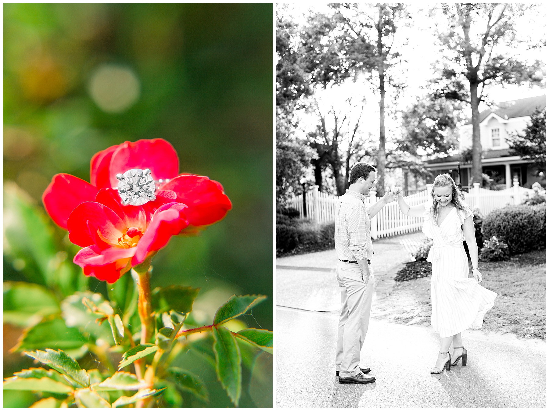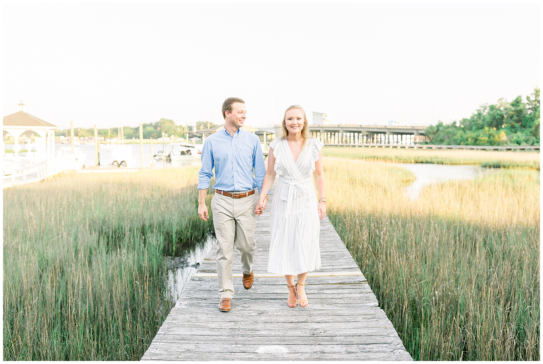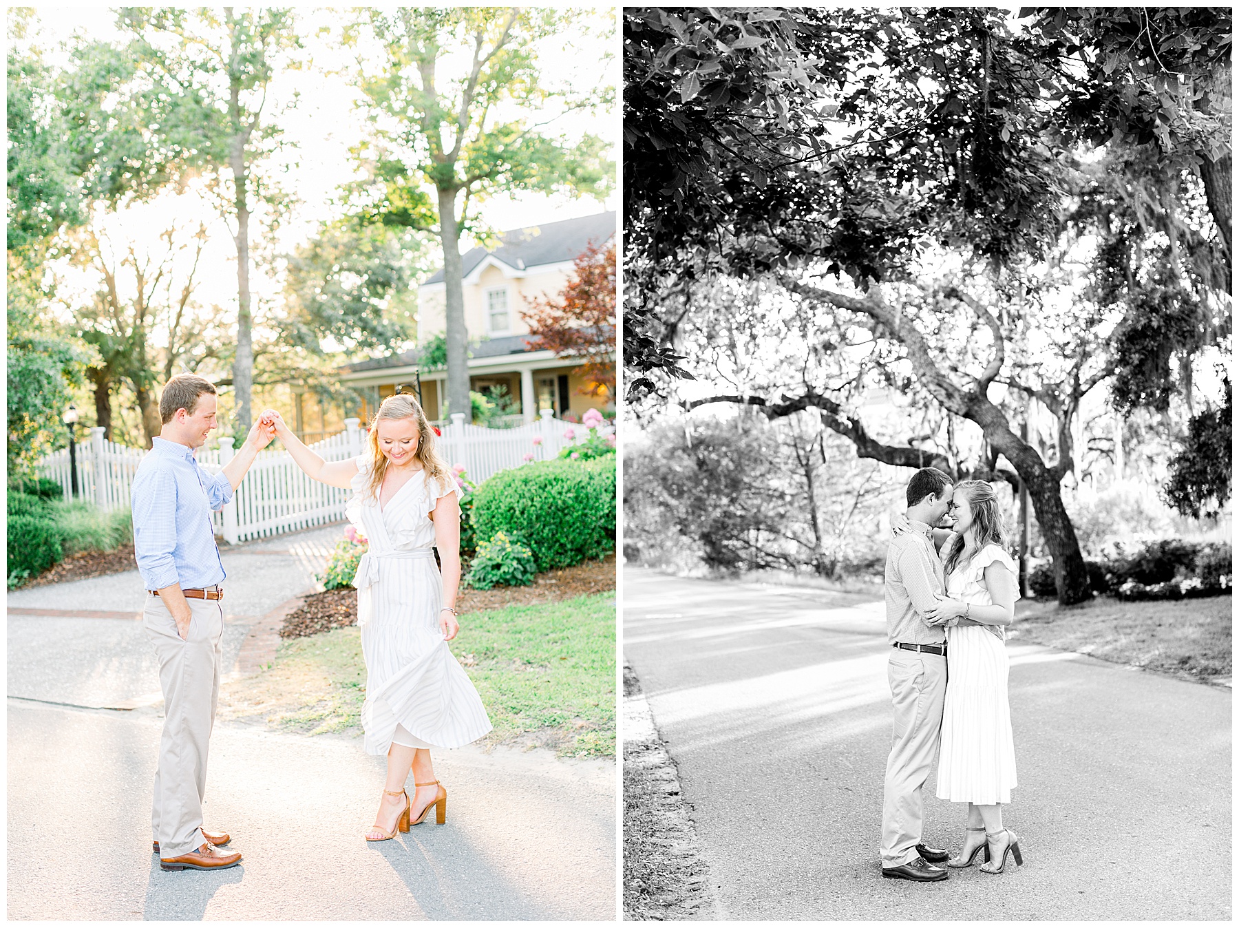 We started the session walking around a tree-lined neighborhood, and a sweet resident offered us to use her dock! Lots of flowers were in bloom, and the sunshine filtering through the trees was so beautiful! As the sun got softer, we headed down to the beach, and Jen changed into an “NC State red dress” as I called it (They both graduated from NC State with engineering degrees!) and it looked so pretty against the blue of the ocean!!!!