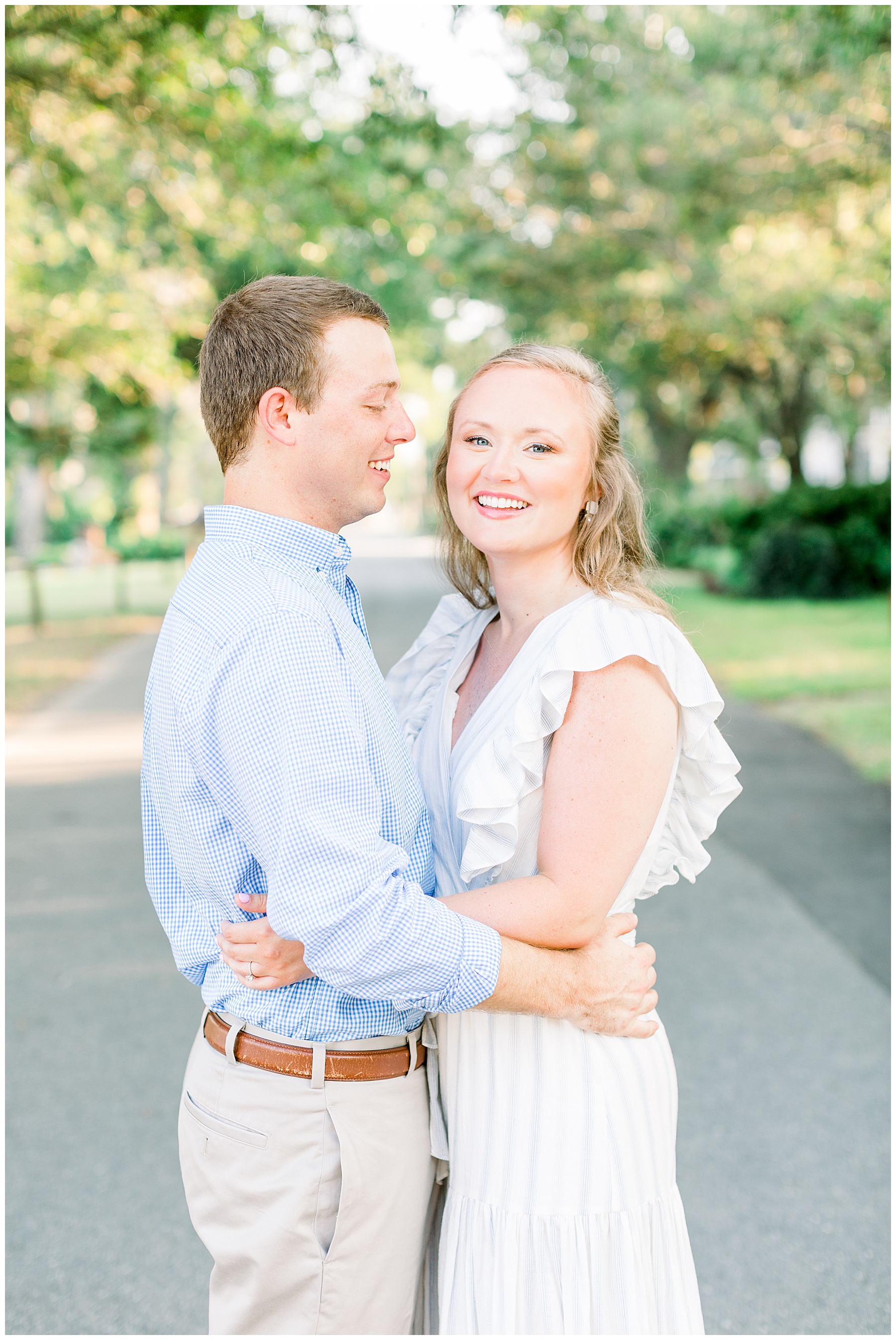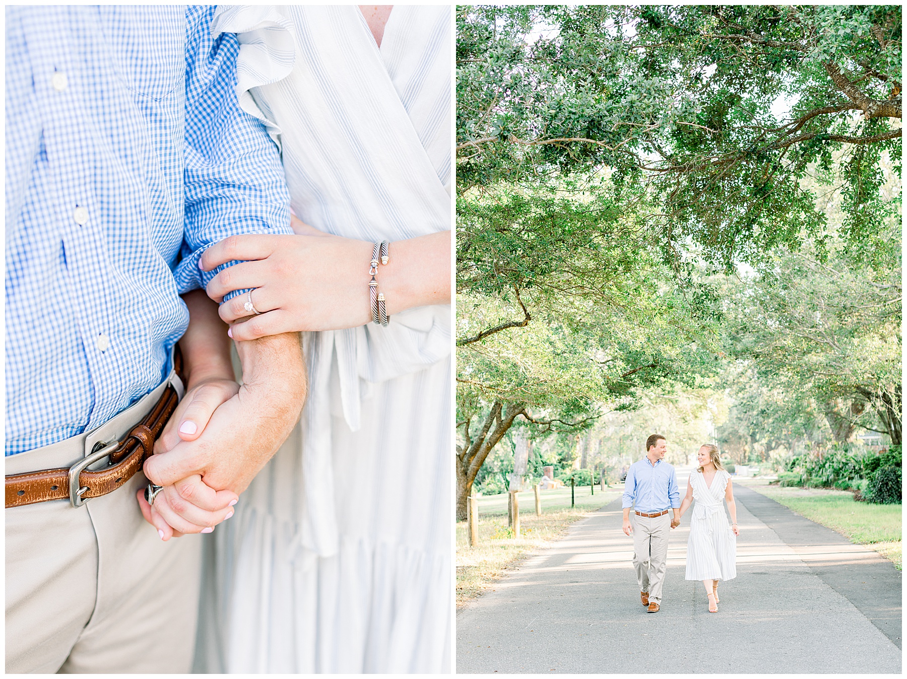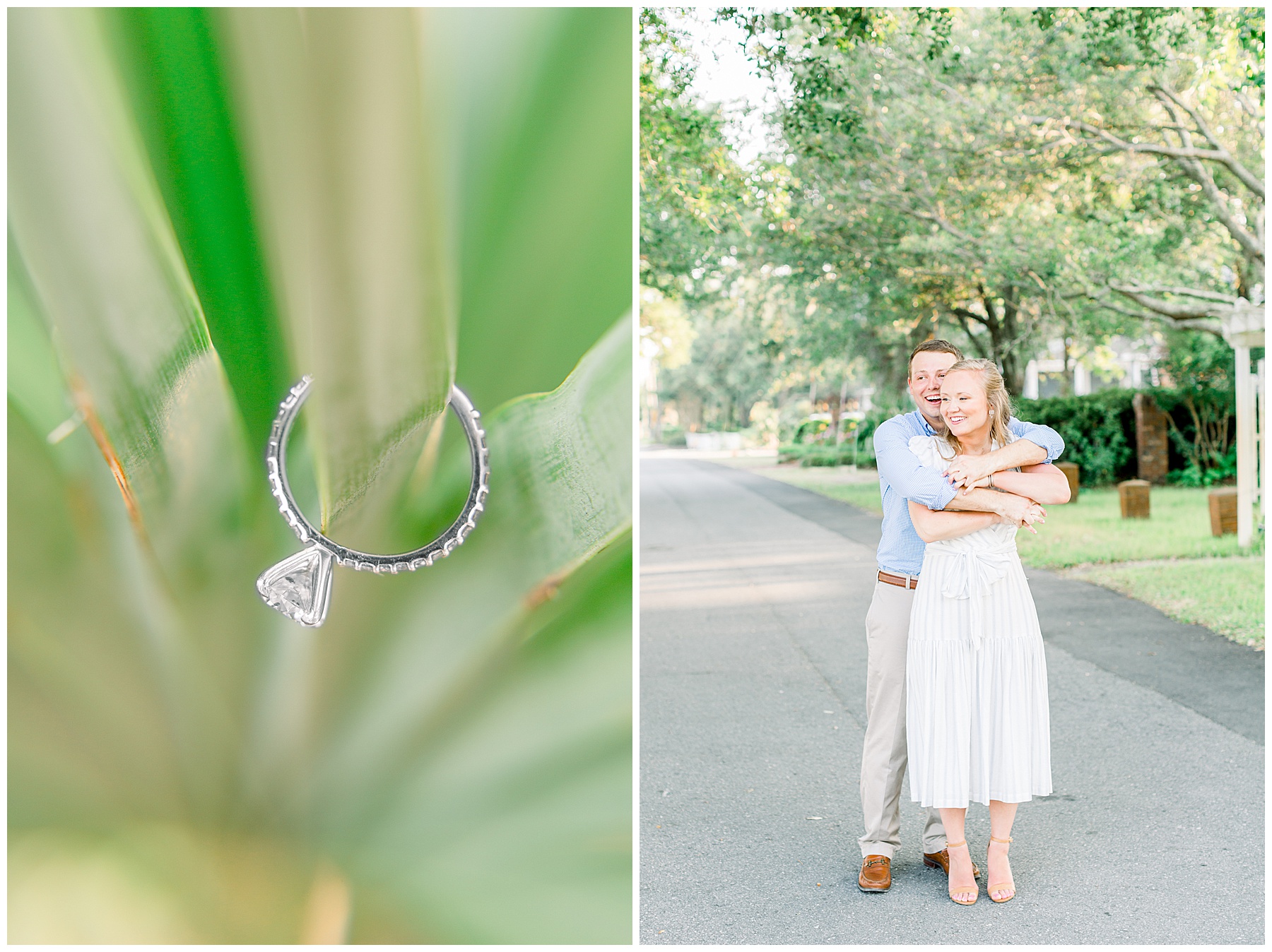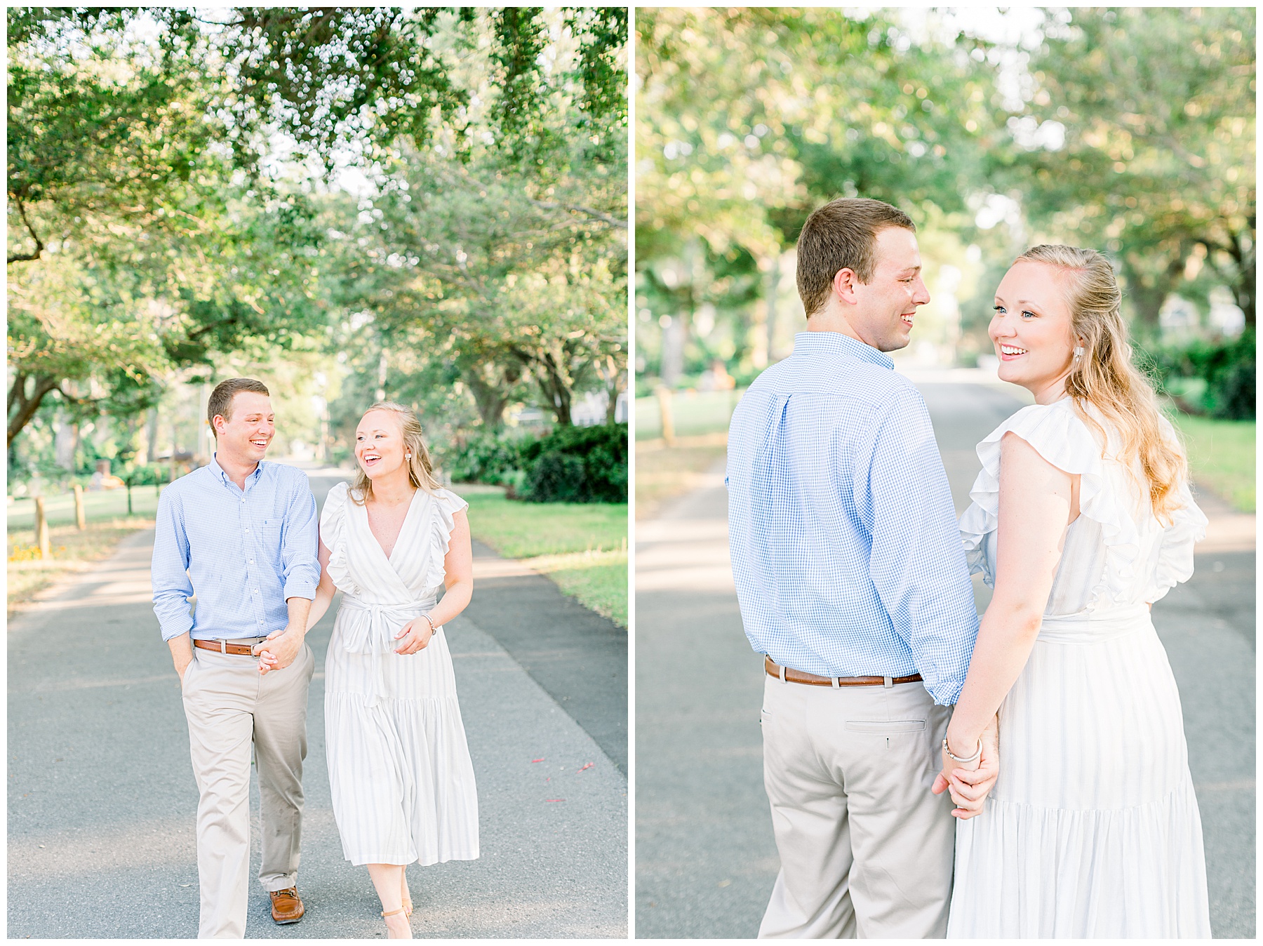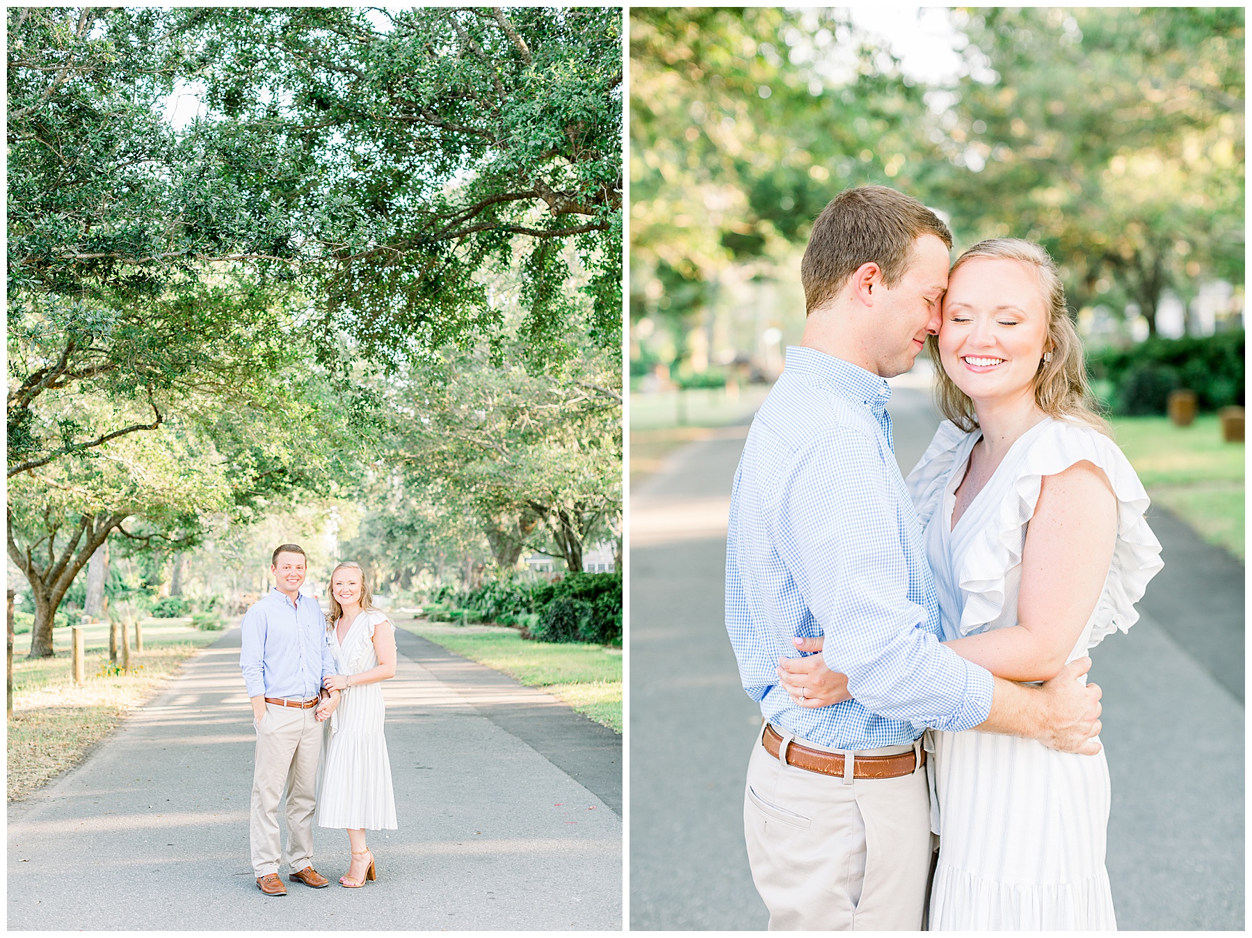 We started the session walking around a tree-lined neighborhood, and a sweet resident offered us to use her dock! Lots of flowers were in bloom, and the sunshine filtering through the trees was so beautiful! As the sun got softer, we headed down to the beach, and Jen changed into an “NC State red dress” as I called it (They both graduated from NC State with engineering degrees!) and it looked so pretty against the blue of the ocean!!!!