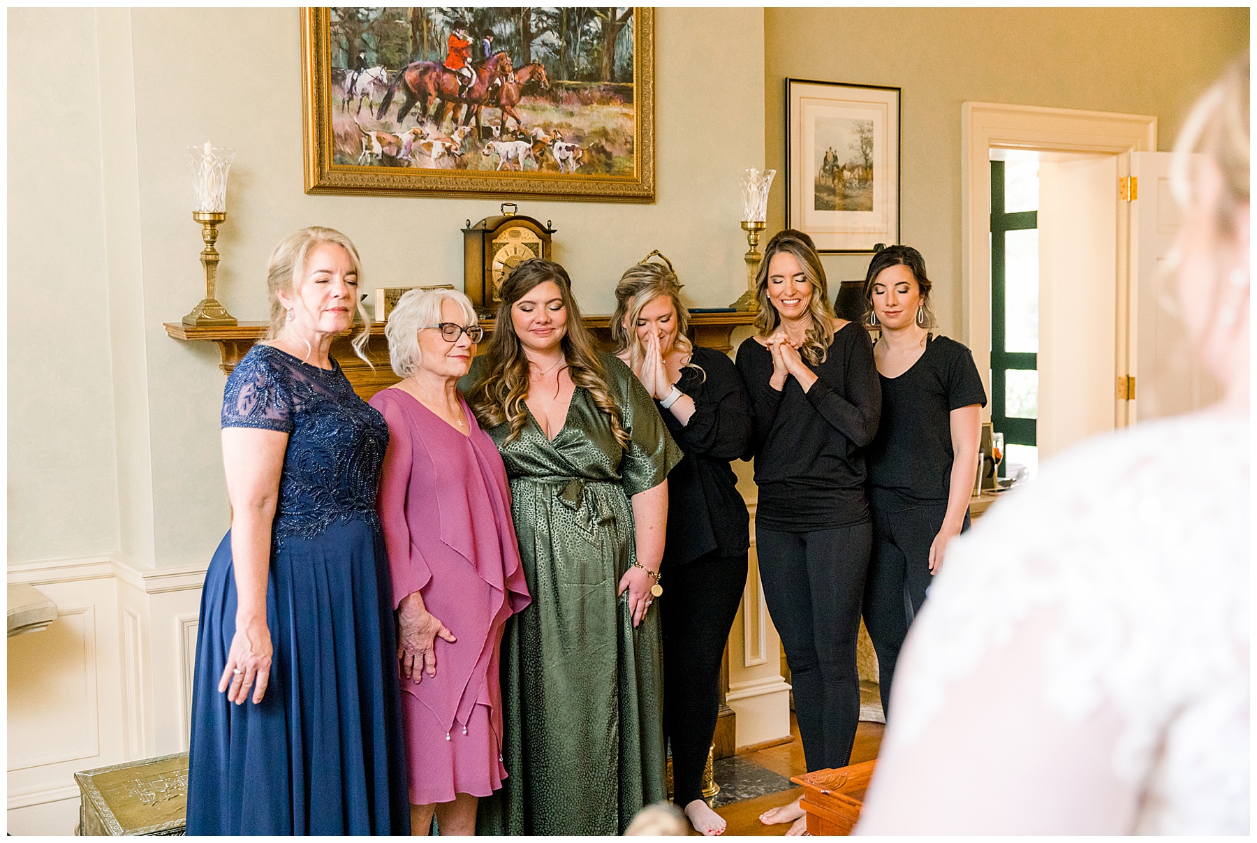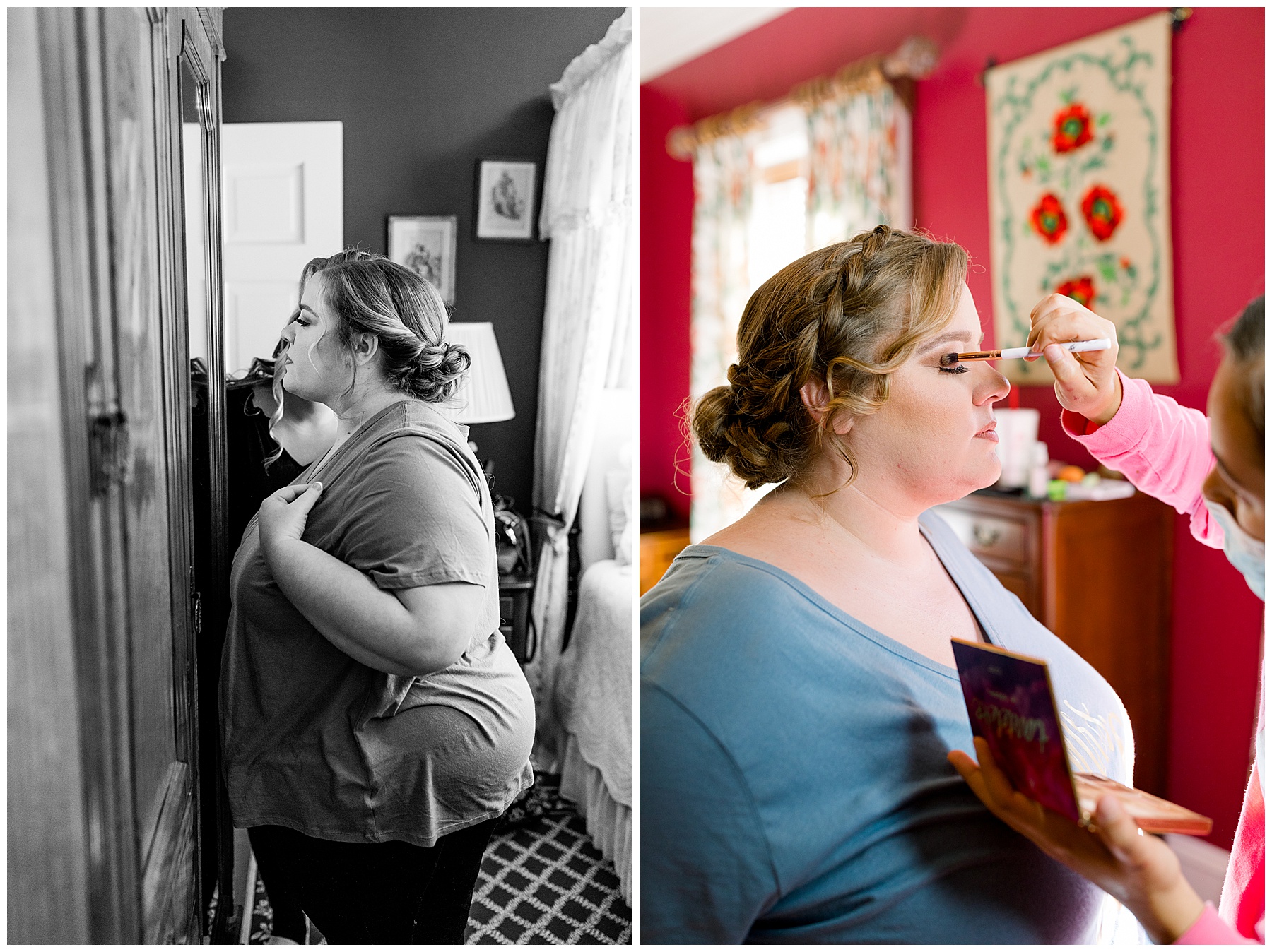 Even though Katherine didn’t have a true “bridal party” – Katherine, her family, and closest friends still got hair/makeup done together, jammed out to music, and enjoyed a beautiful spread of food and a fruity drink bar! It was SO special to see all of Katherine’s family again and give everyone hugs. Even more special was the location Katherine chose – a stunning home located right next door to her childhood home. (Scroll down to see a few photos we took in front of Katherine’s old house that was next door!)