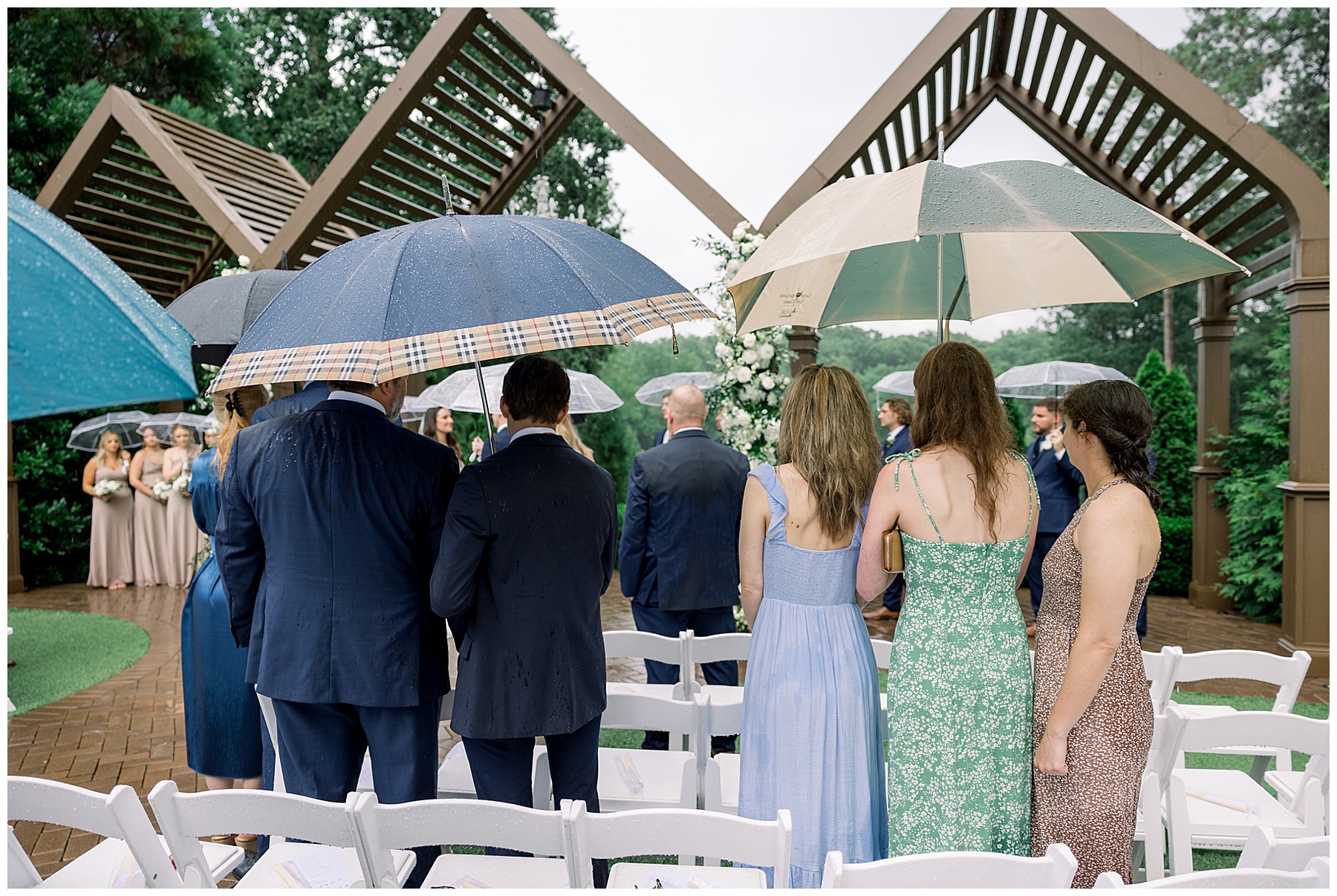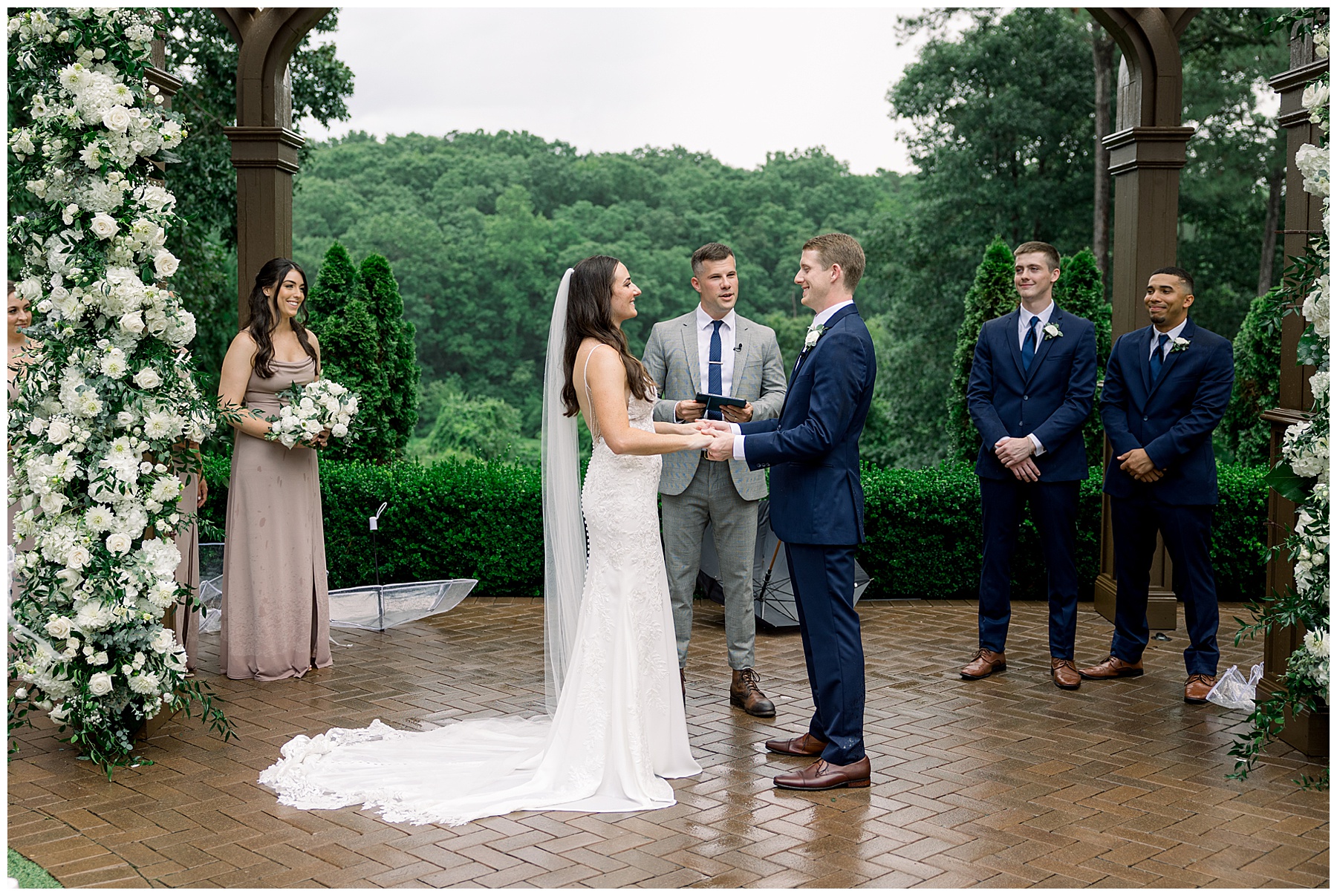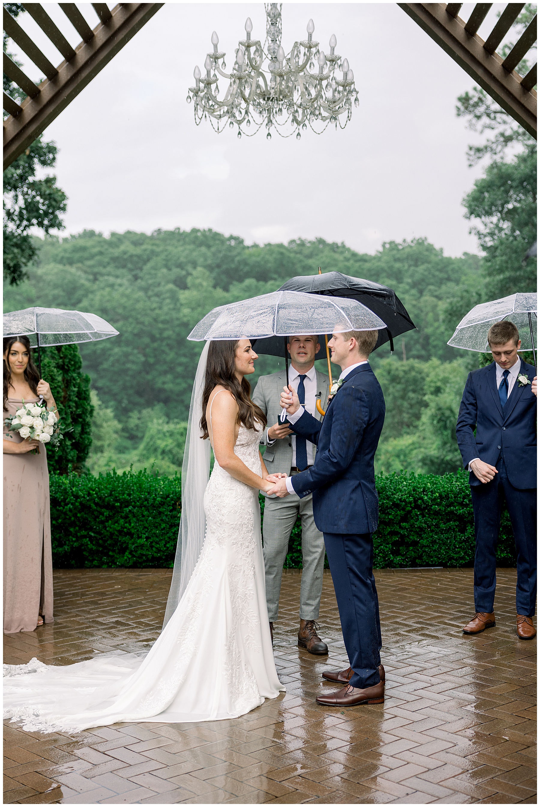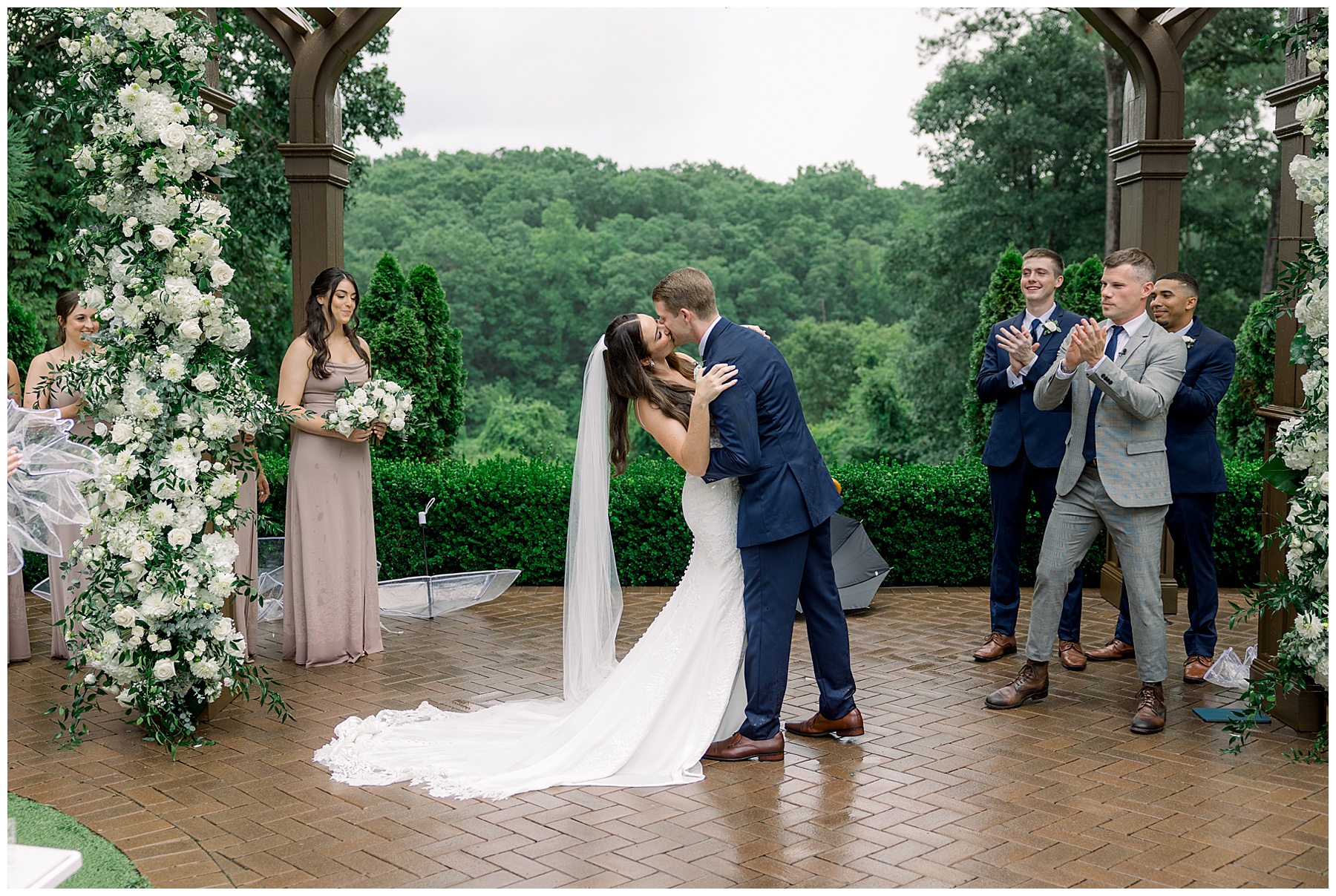 Thankfully, we photographed ALL bridal party photos pre-ceremony too – which turned out wonderfully because out of NOWHERE a huge downpour of rain started just as the ceremony was supposed to get started. They opted to wait about 20 minutes, but when the rain wasn’t letting up, Kelsey & Corey decided to just go with it – and their ceremony was in the RAIN (literally a downpour) yet they embraced it! After the ceremony, the rain slowed, and they even had a RAINBOW literally right above the pergola. How special!!!