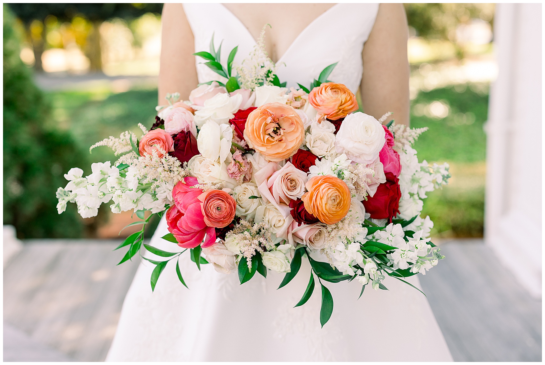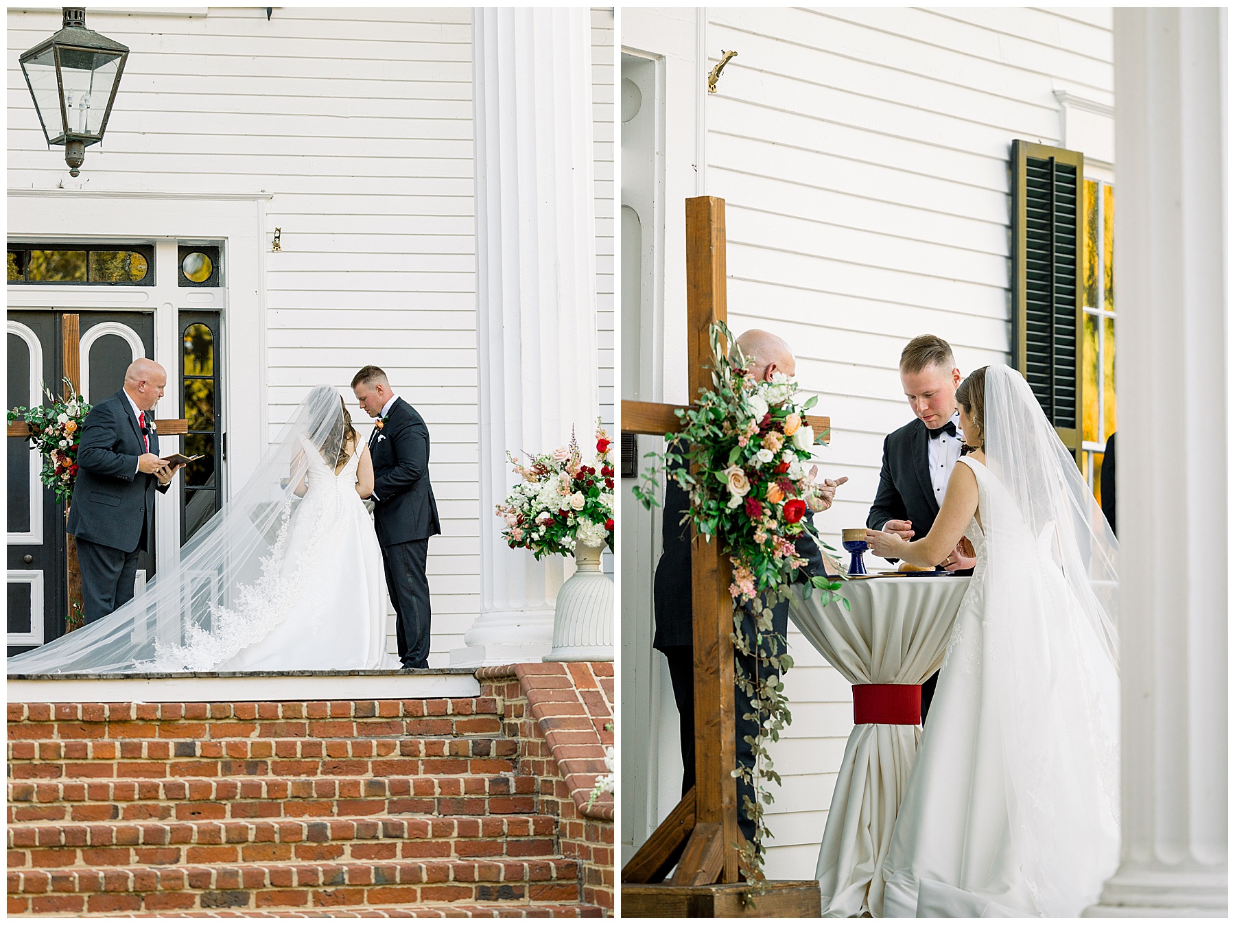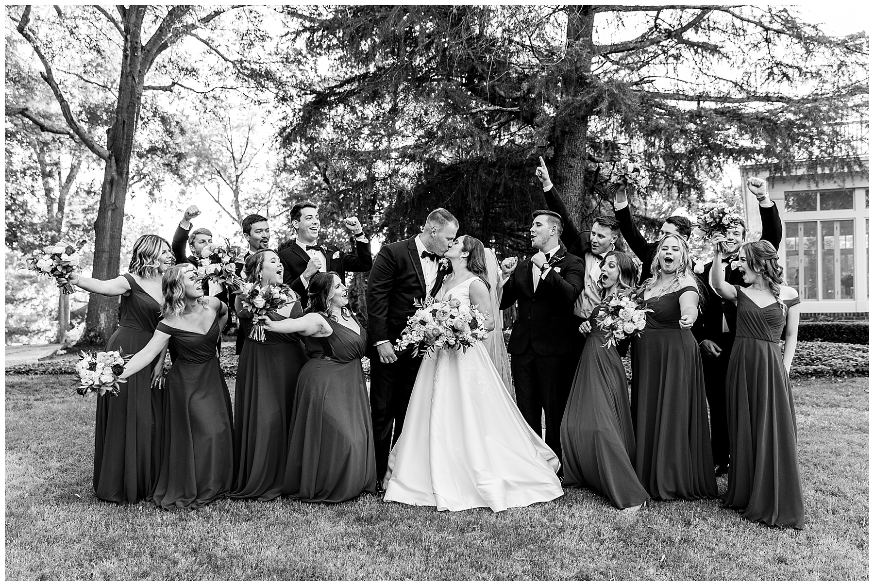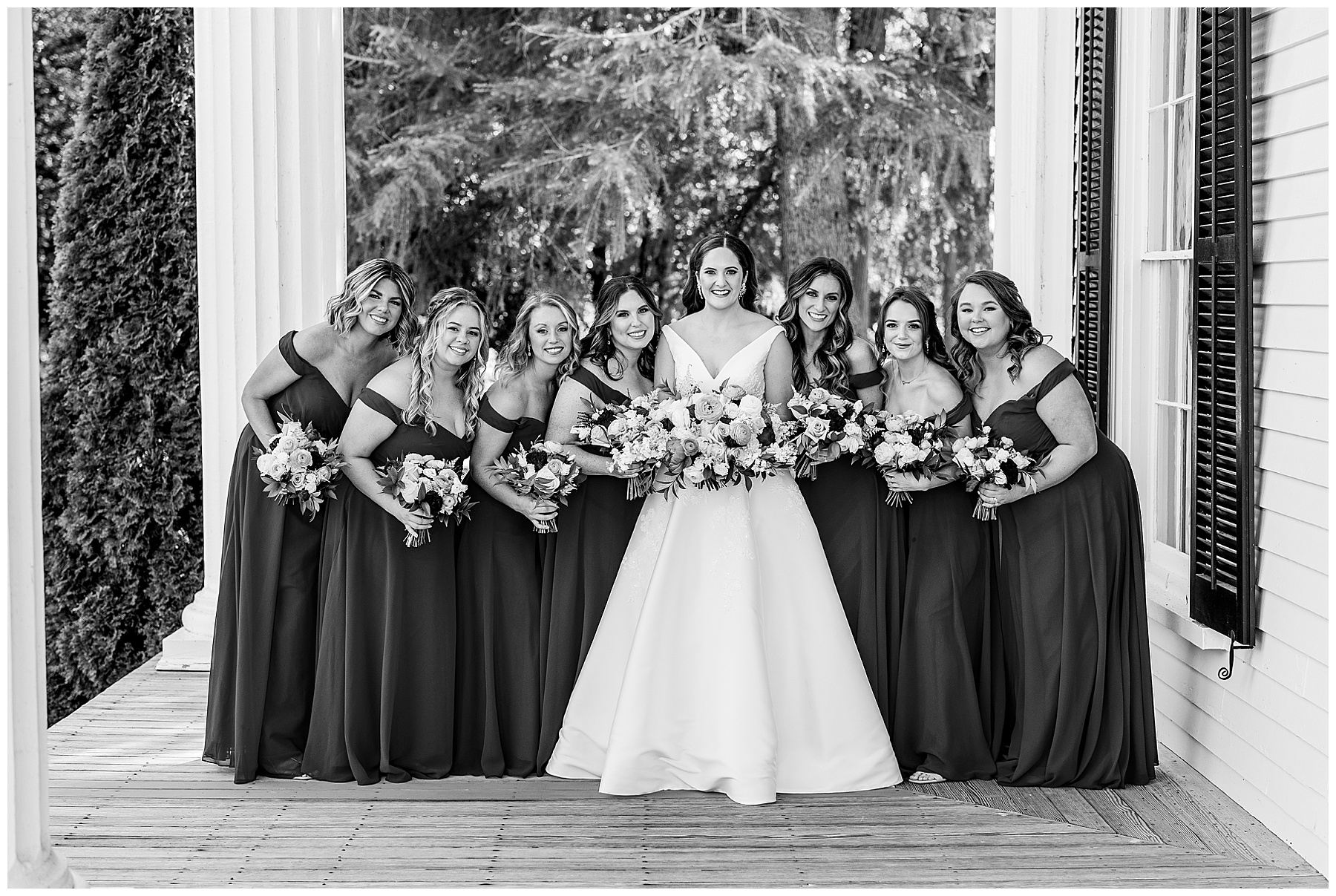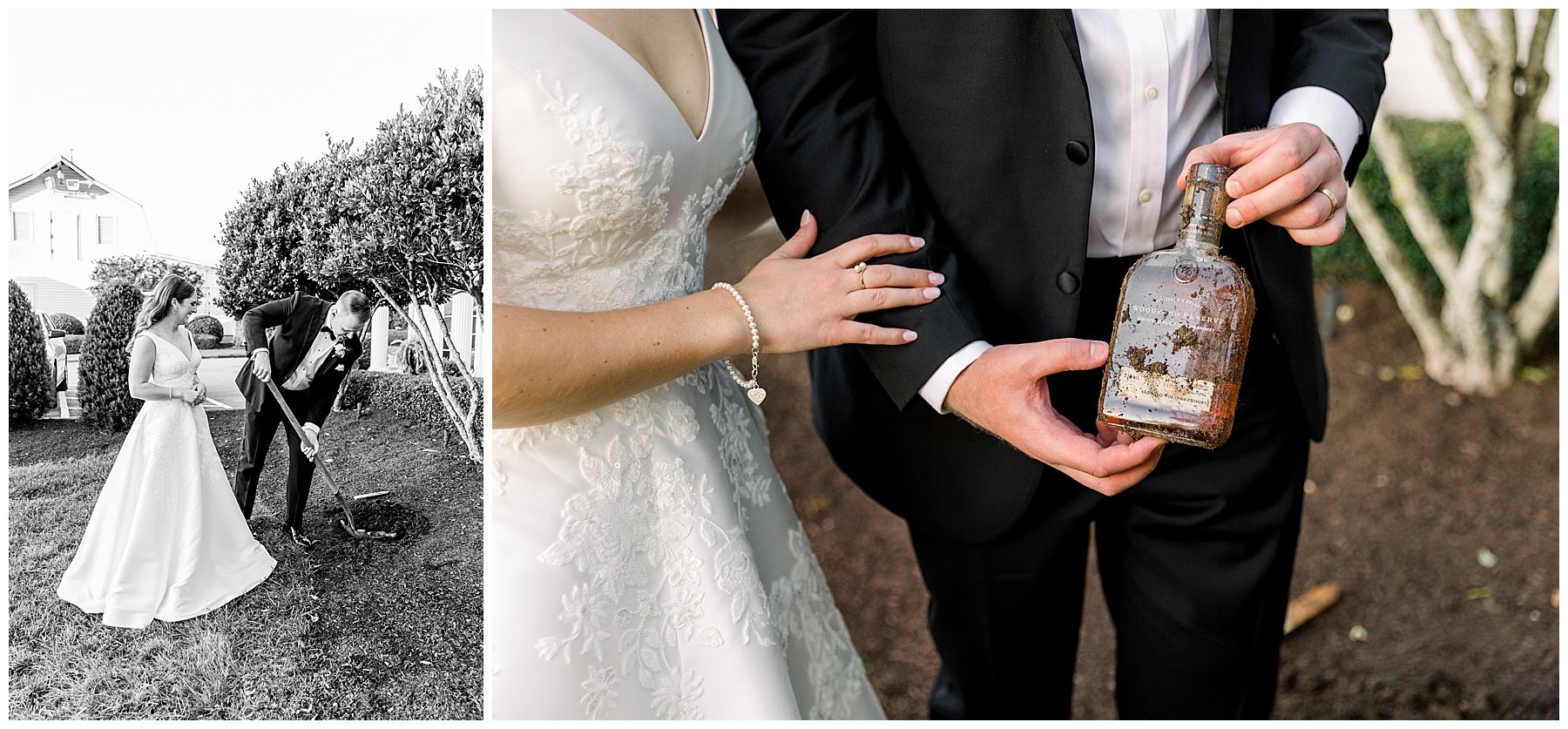 The ceremony took place on the front of the Manor house, and Expressions of Love Florist did an incredible job (as always) with creating beautiful floral pieces – with such texture and colors! The bright colors were such a nice contrast between the black/white of the Manor House. The ceremony was beautiful and I love that Ryan & Kerri chose to have communion together as their first act as husband and wife! It was really meaningful. After the ceremony & all the portraits – Kerri & Ryan dug up their bourbon and then entered their reception!