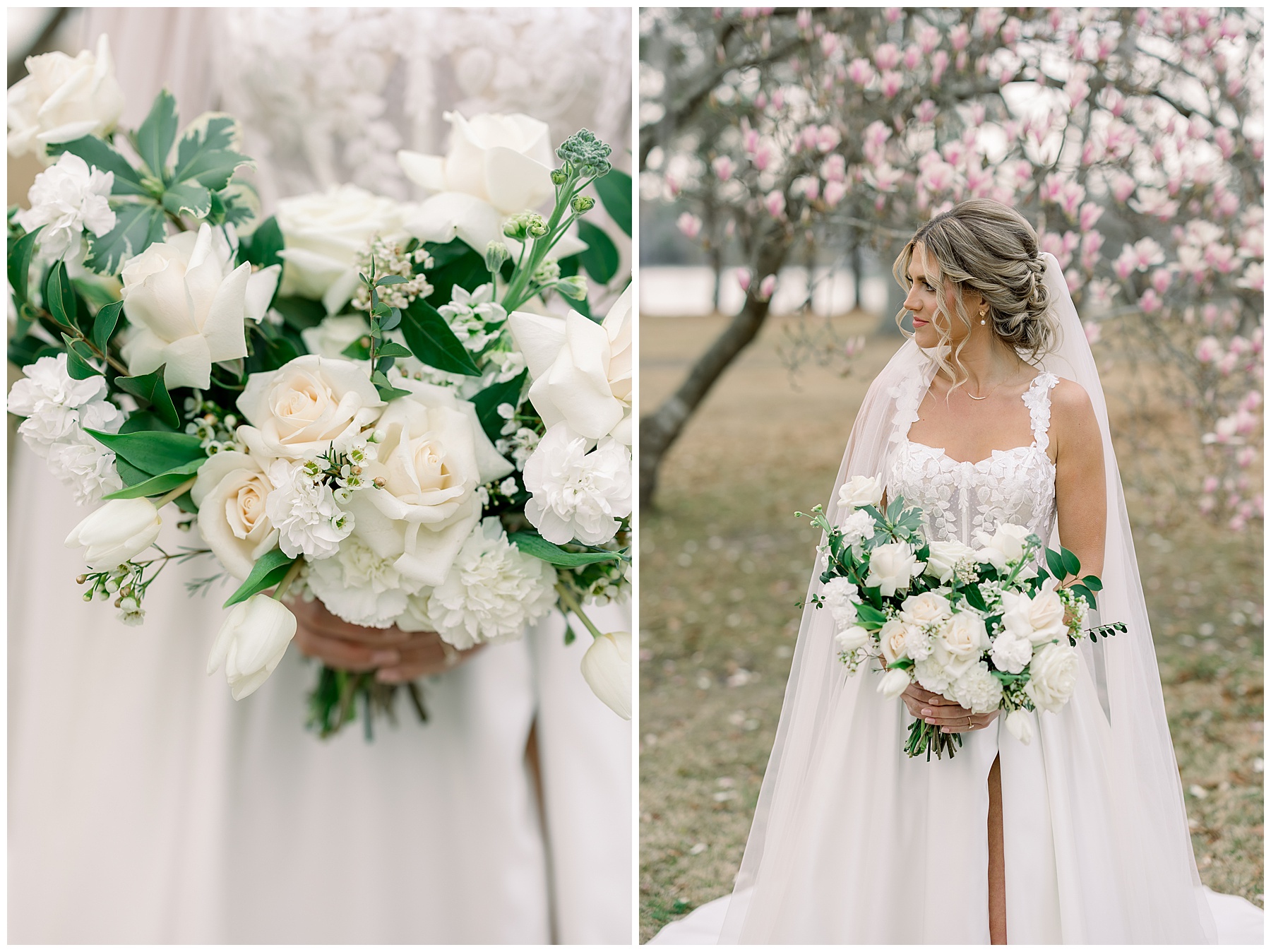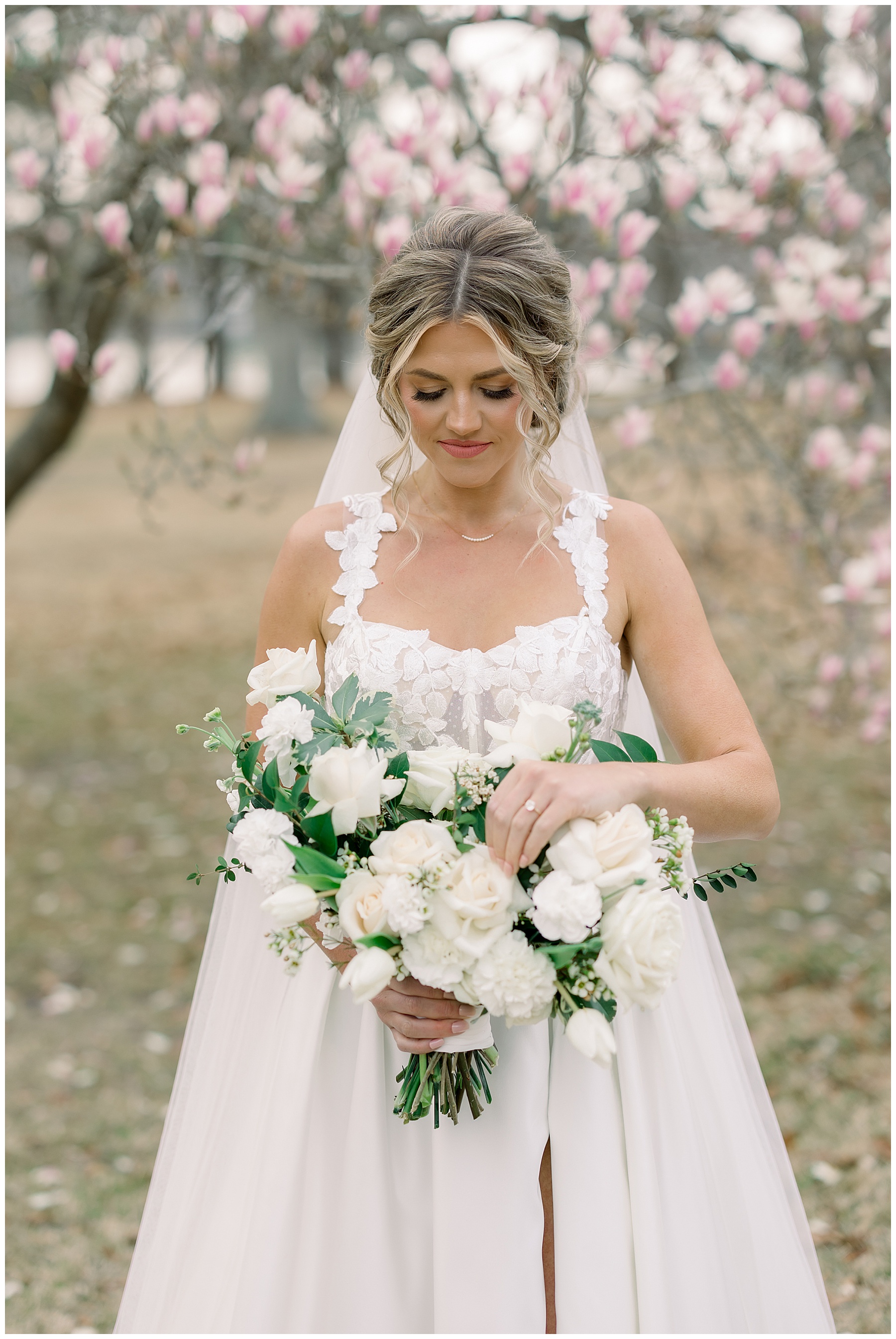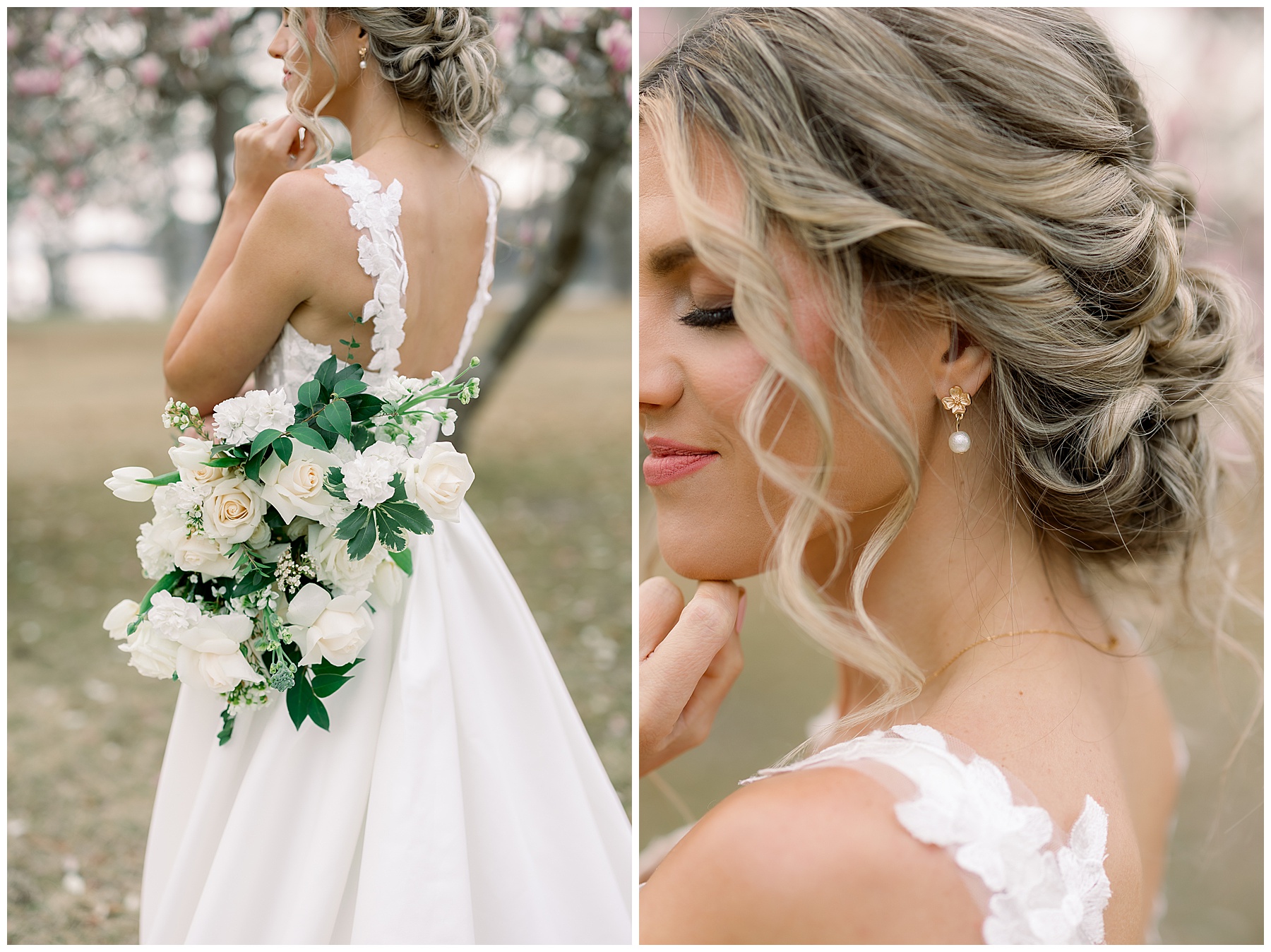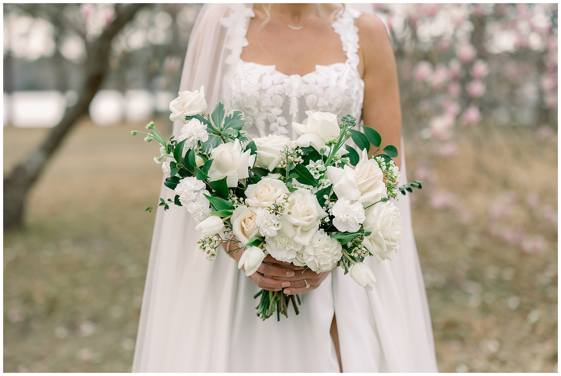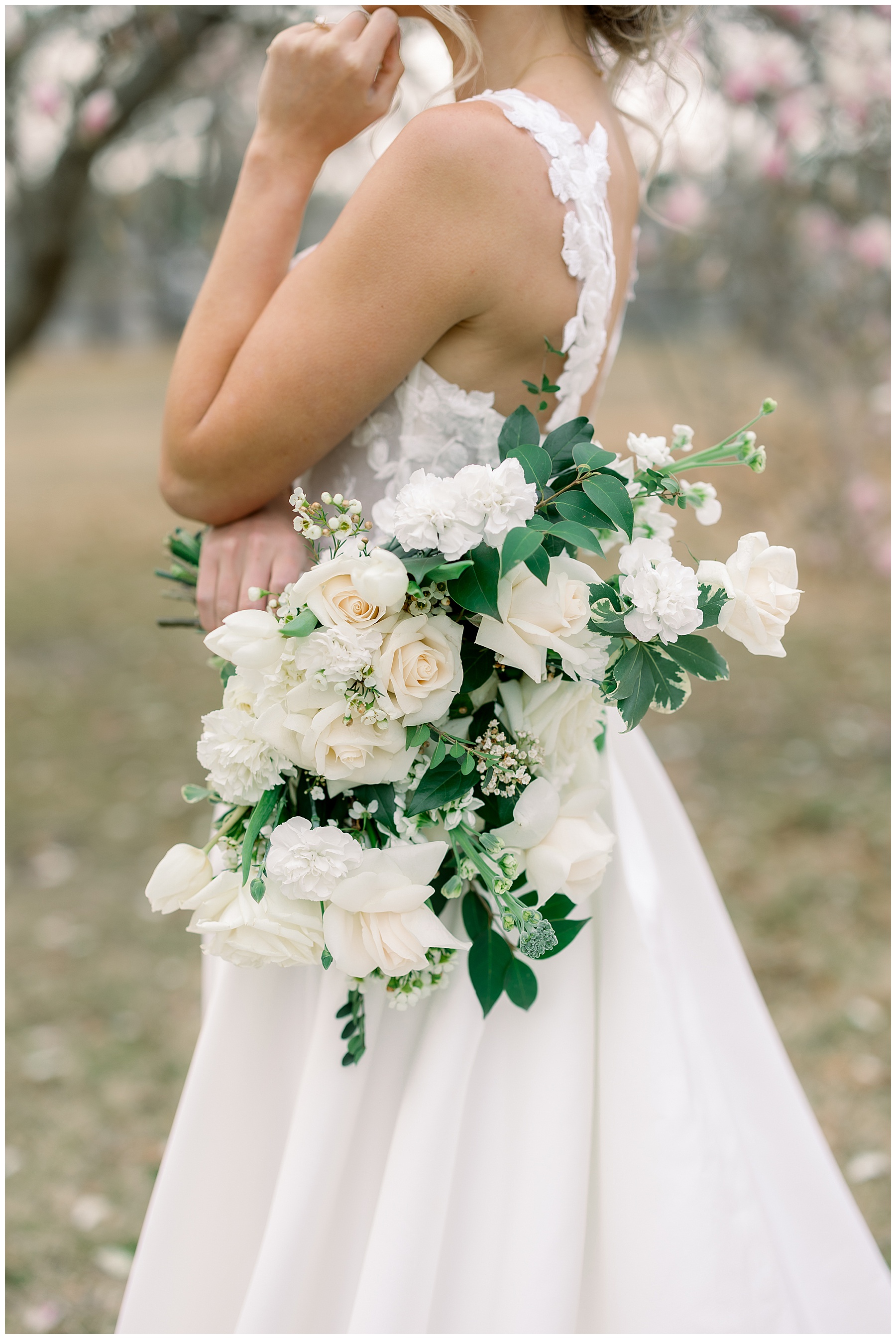 Mom and I had the fun experience of making Kristy’s bouquet, with flowers & greenery sourced from literally 5 places haha – and we tried to showcase a whimsical vibe with fun textures, lots of white, and a more “heart shaped” design shape! It was a whole experience – so we have a TON of respect for all our florist friends who make it look effortless! (No amount of YouTube videos will prepare you for the hand + arm aches of building a bouquet for an hour, haha)