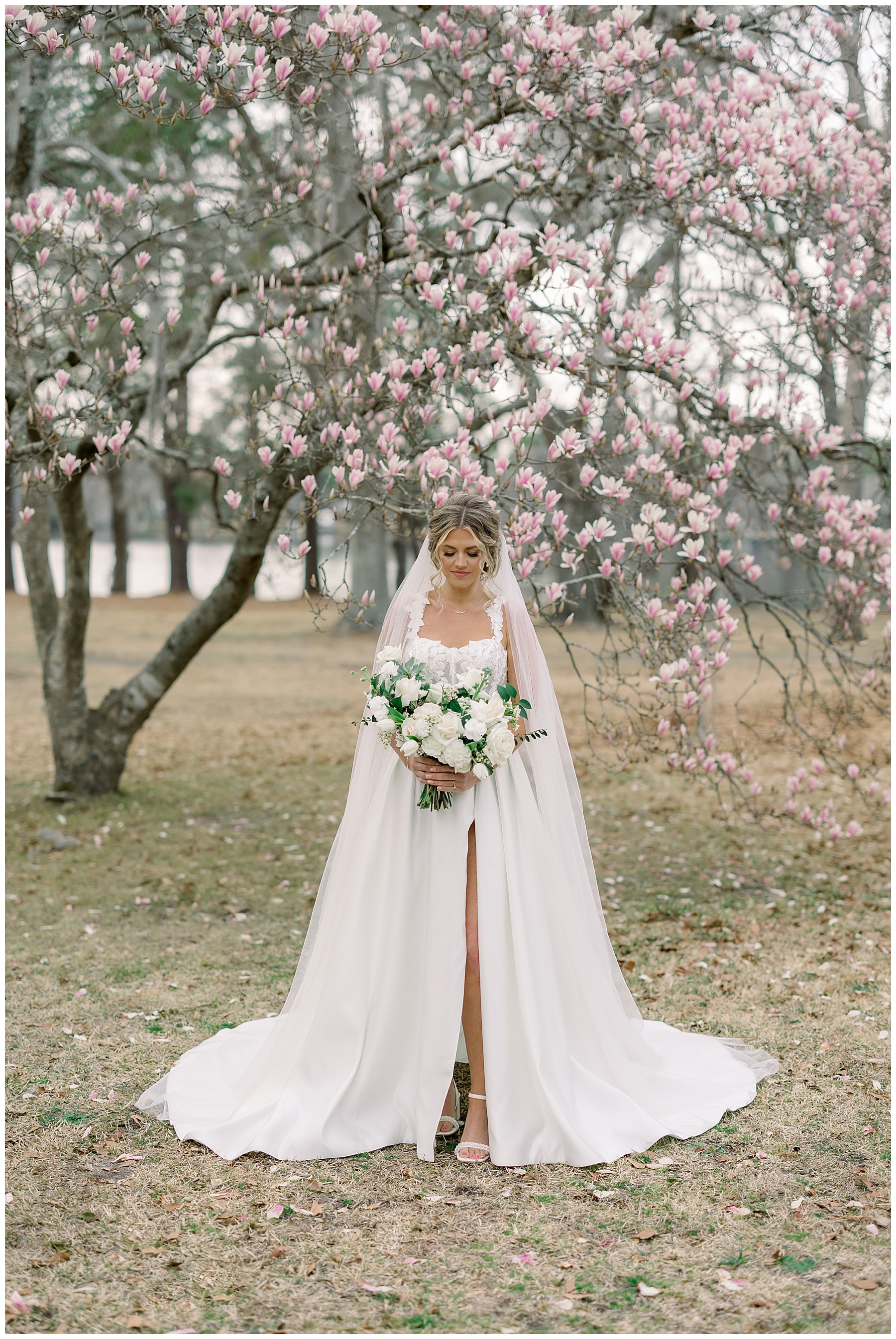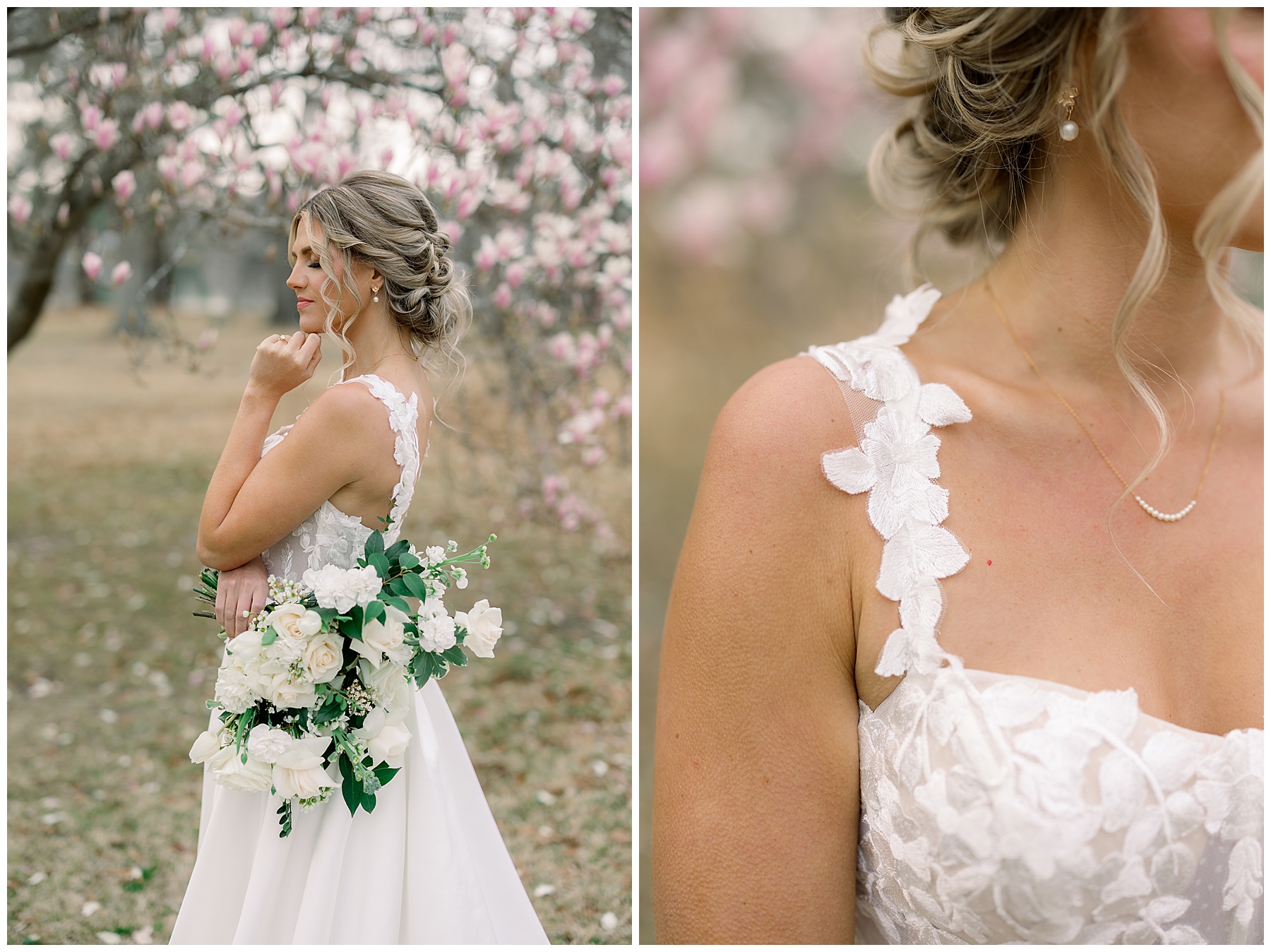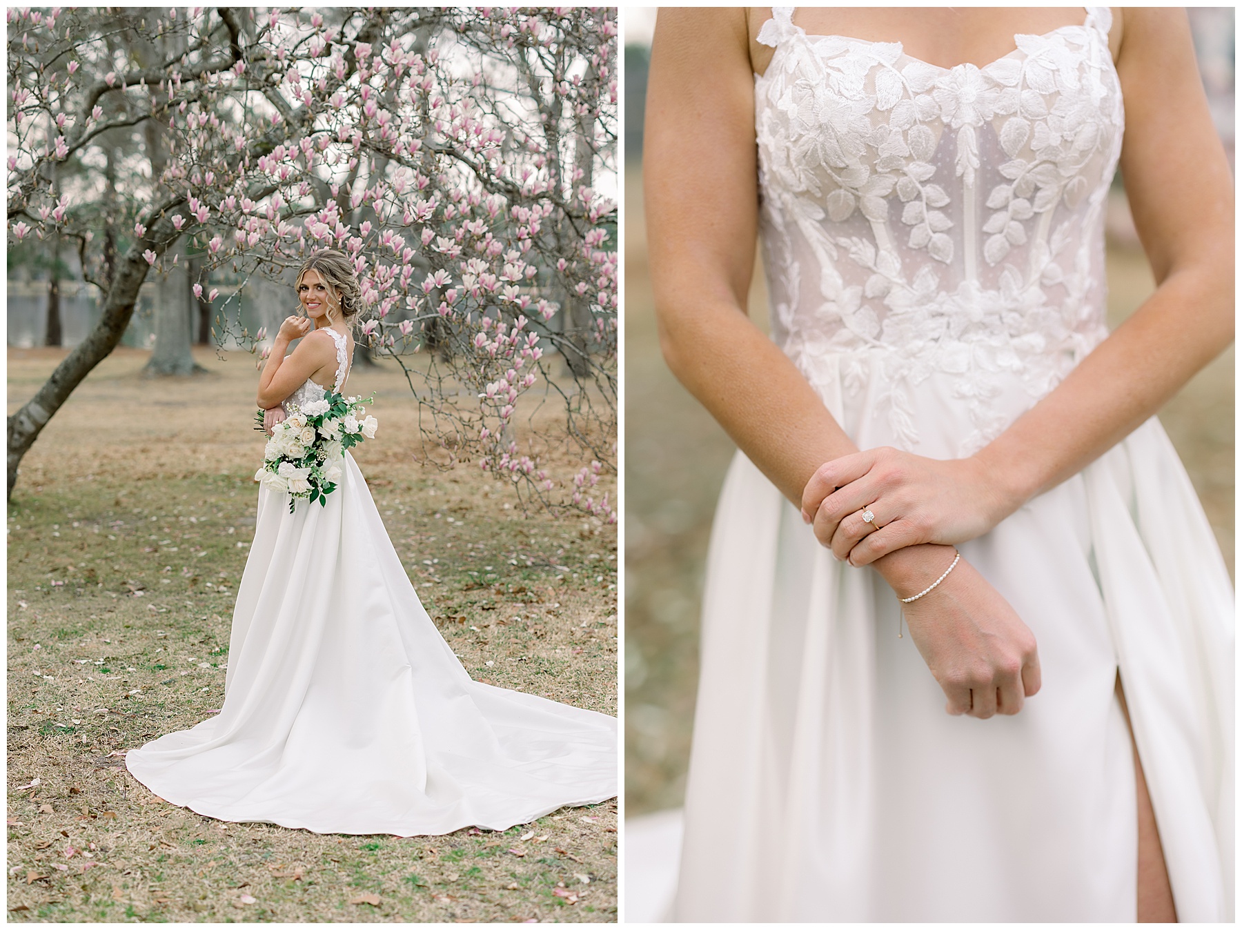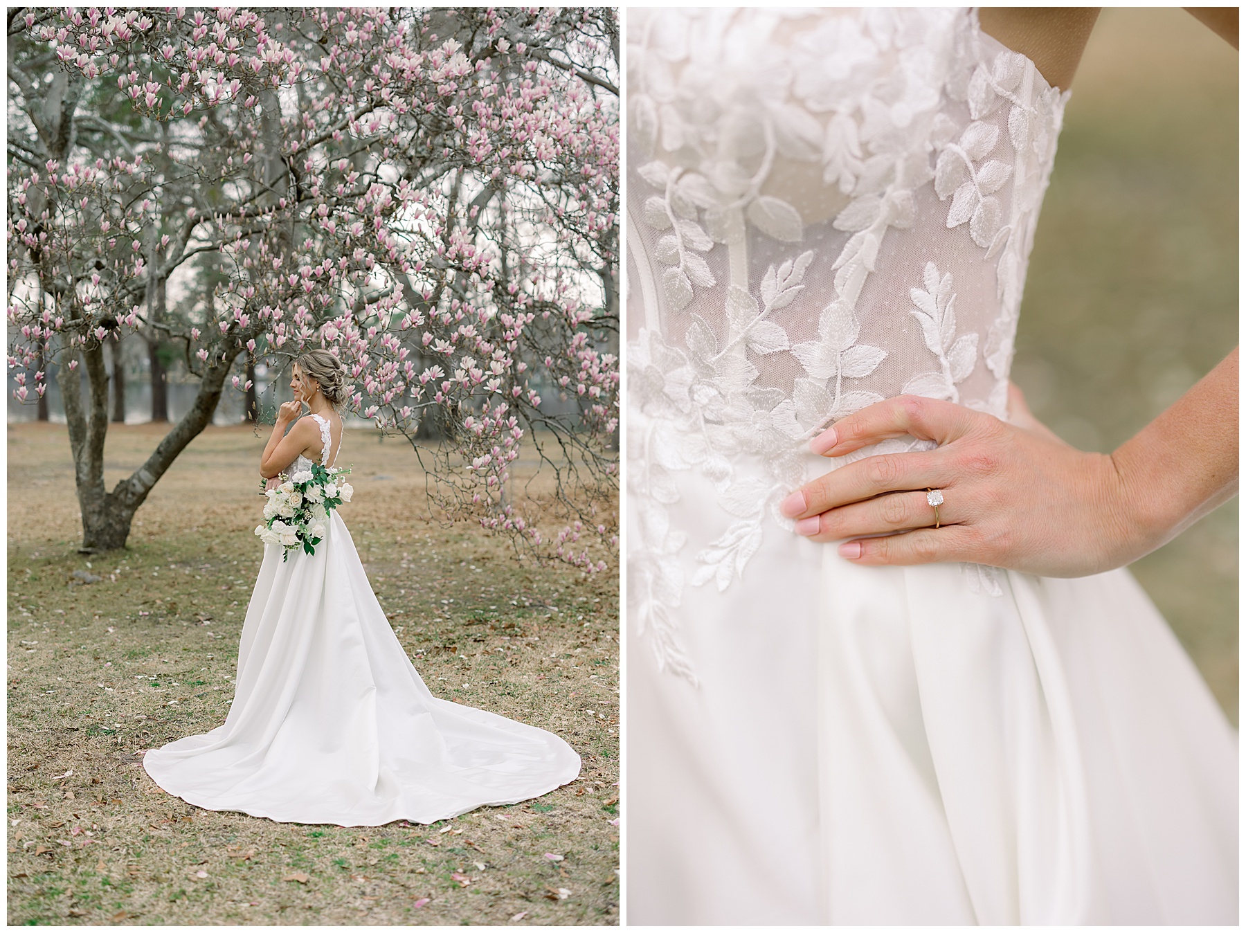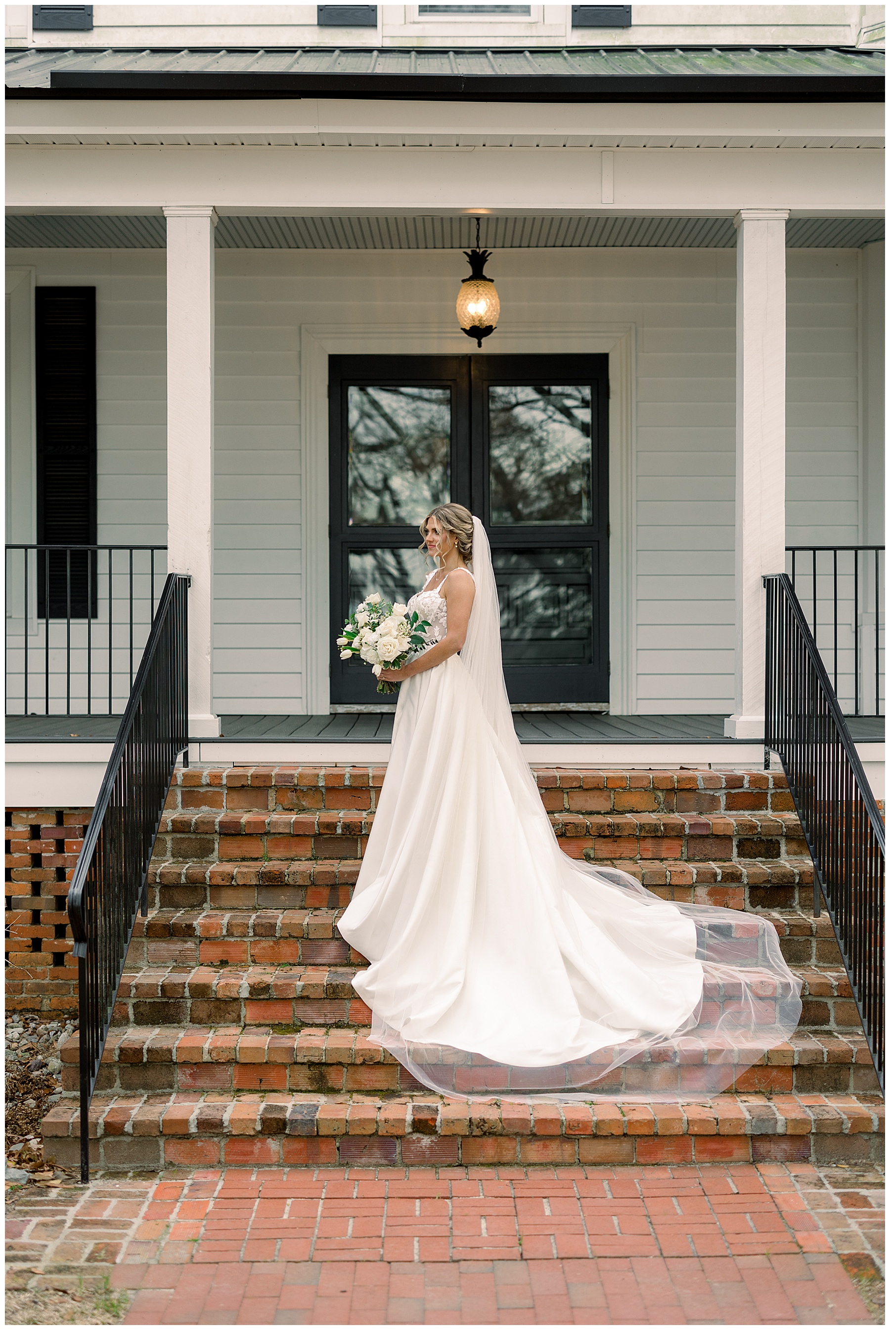 We had the best girls day going wedding dress shopping together! We found Kristy’s beautiful dress at NYB&G of Raleigh, and they always have amazing customer service and give such a great experience to their brides. Kristy’s face LIT UP when we walked up to the mirror in this dress, so we KNEW it was “THE ONE” immediately. That gown fits all the boxes – whimsical, romantic, feminine, unique, but also flirty with that corset bodice and the fun slit in the front! Kristy has an amazing seamstress, so she custom made straps for Kristy! (Also a huge thank you to our favorite Research Queen, Beverly Lee, who originally found this beautiful veil that matches Kristy’s dress color perfectly! I literally ordered from her link!)