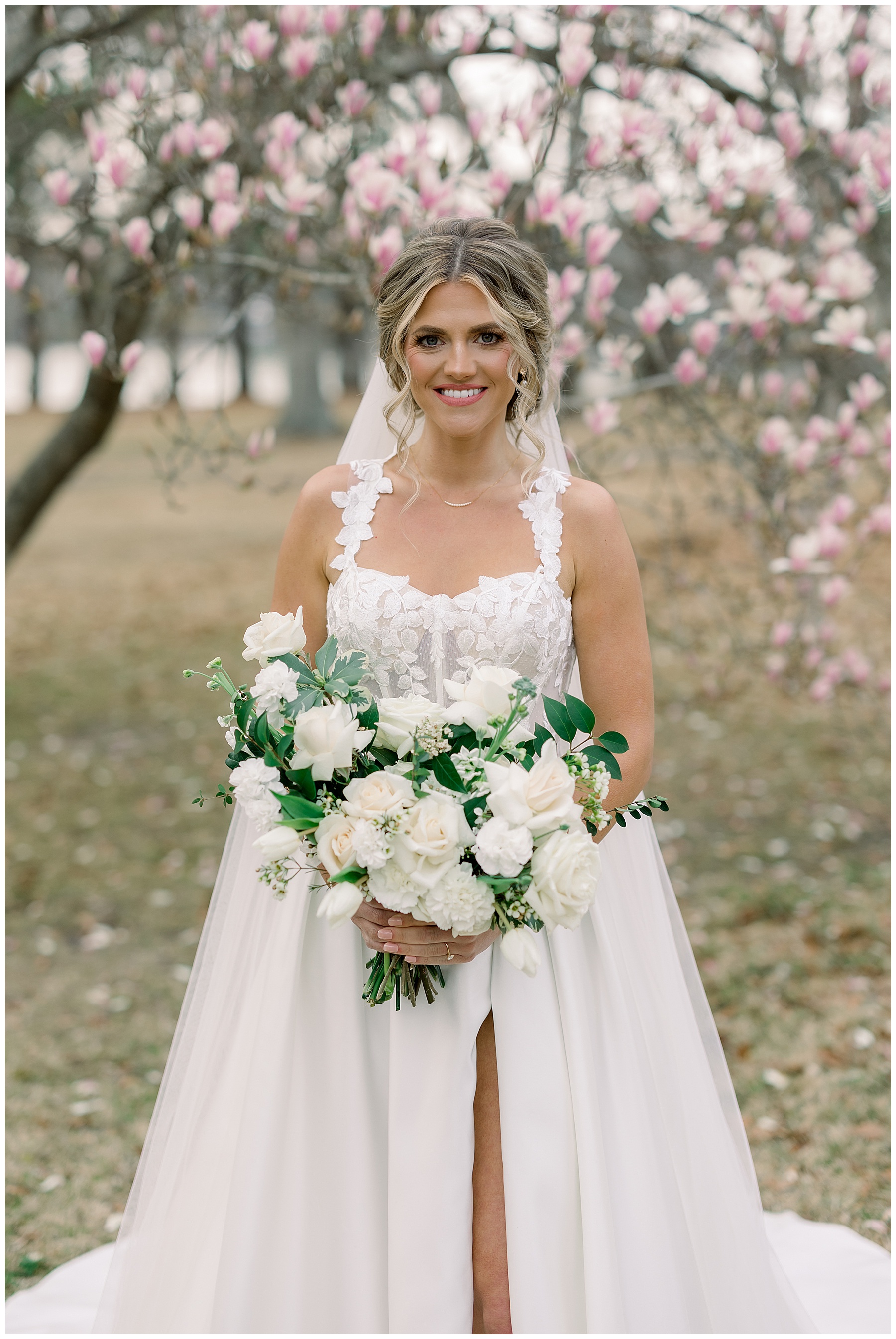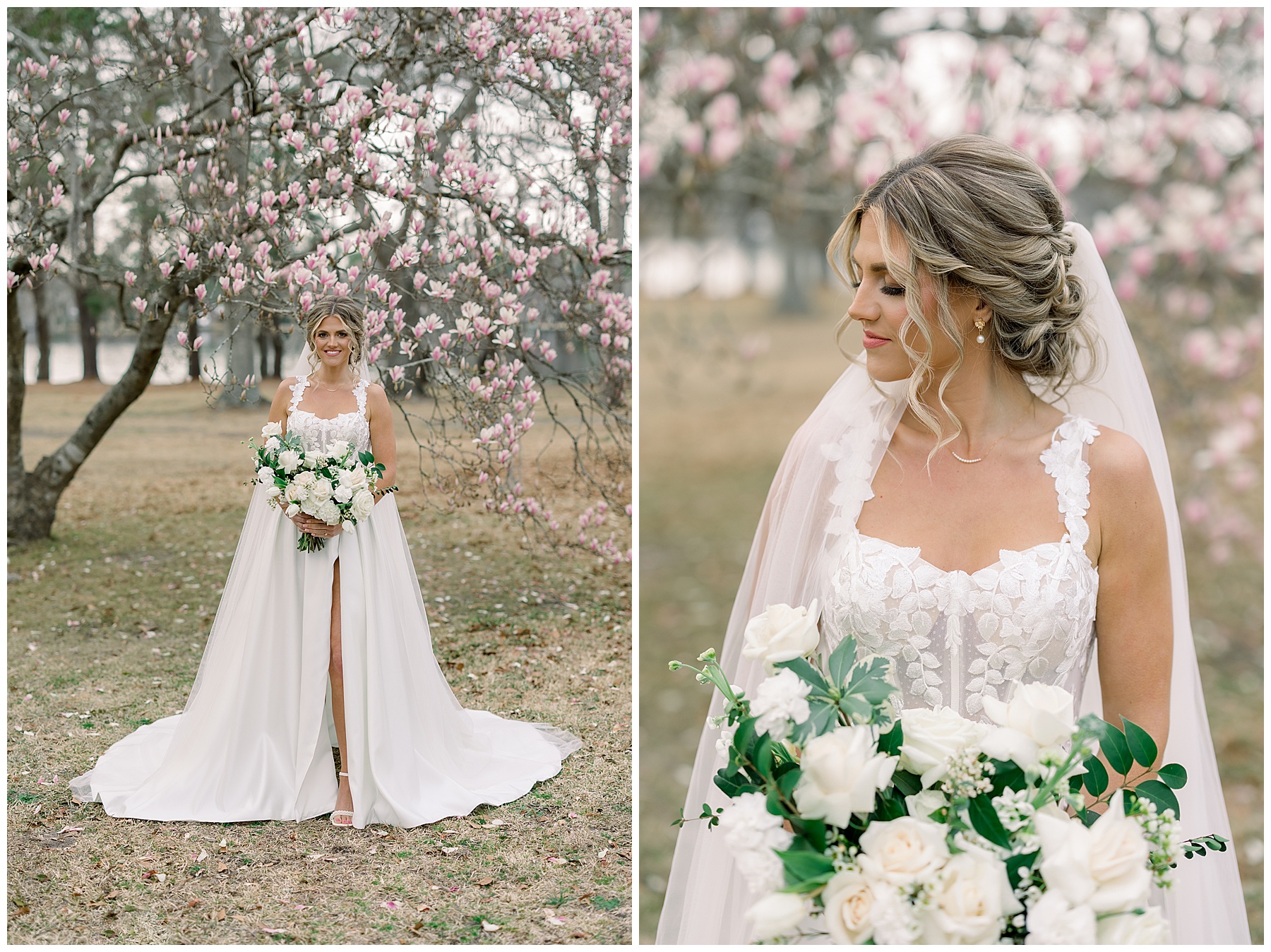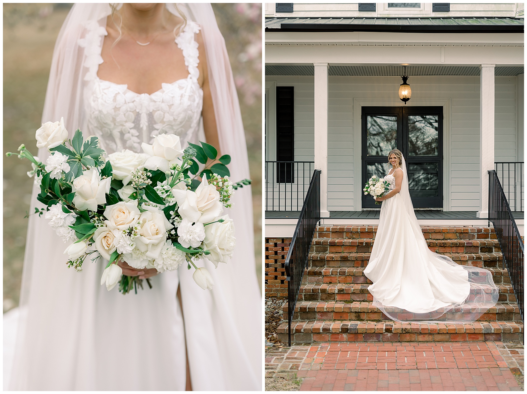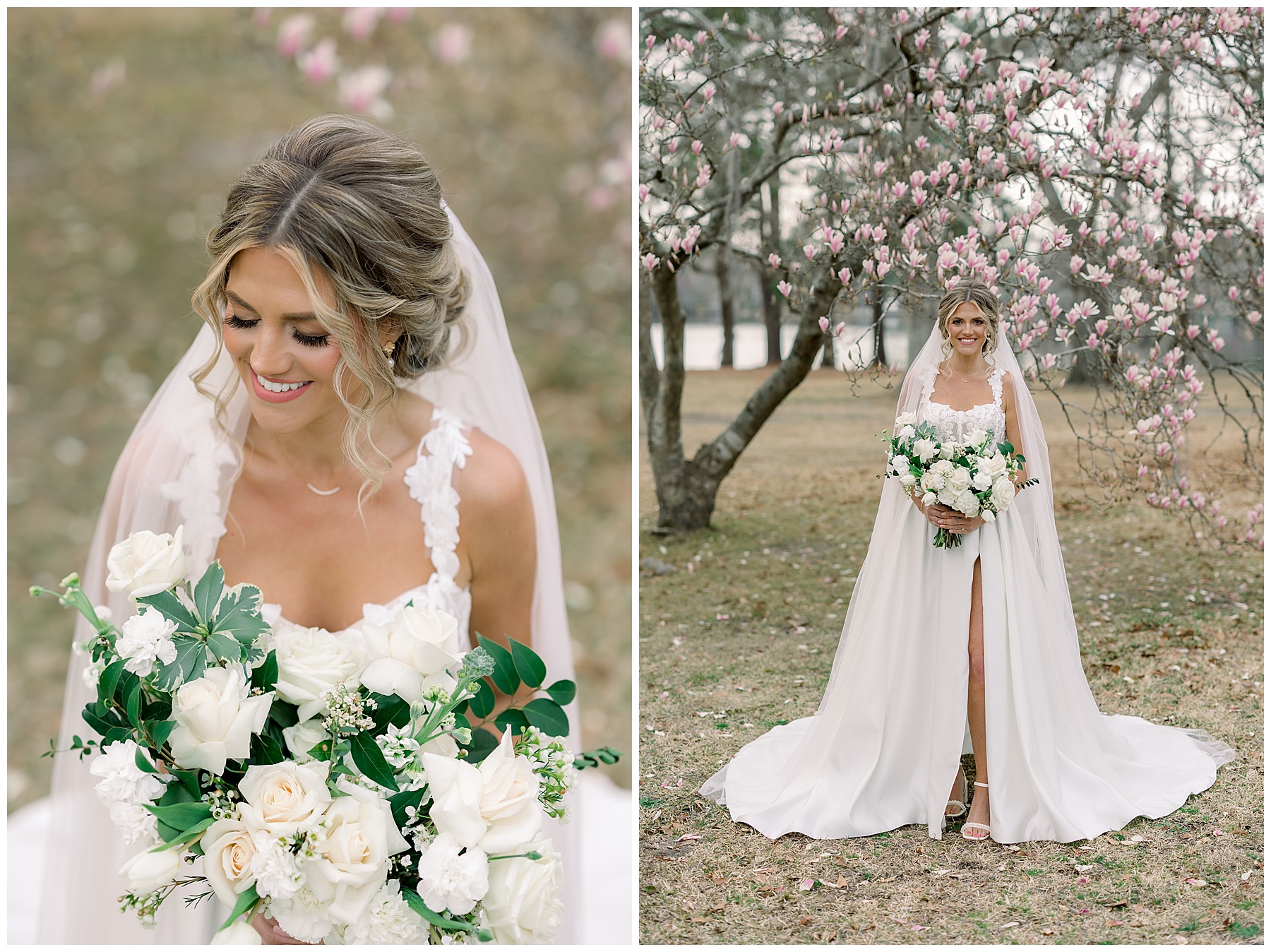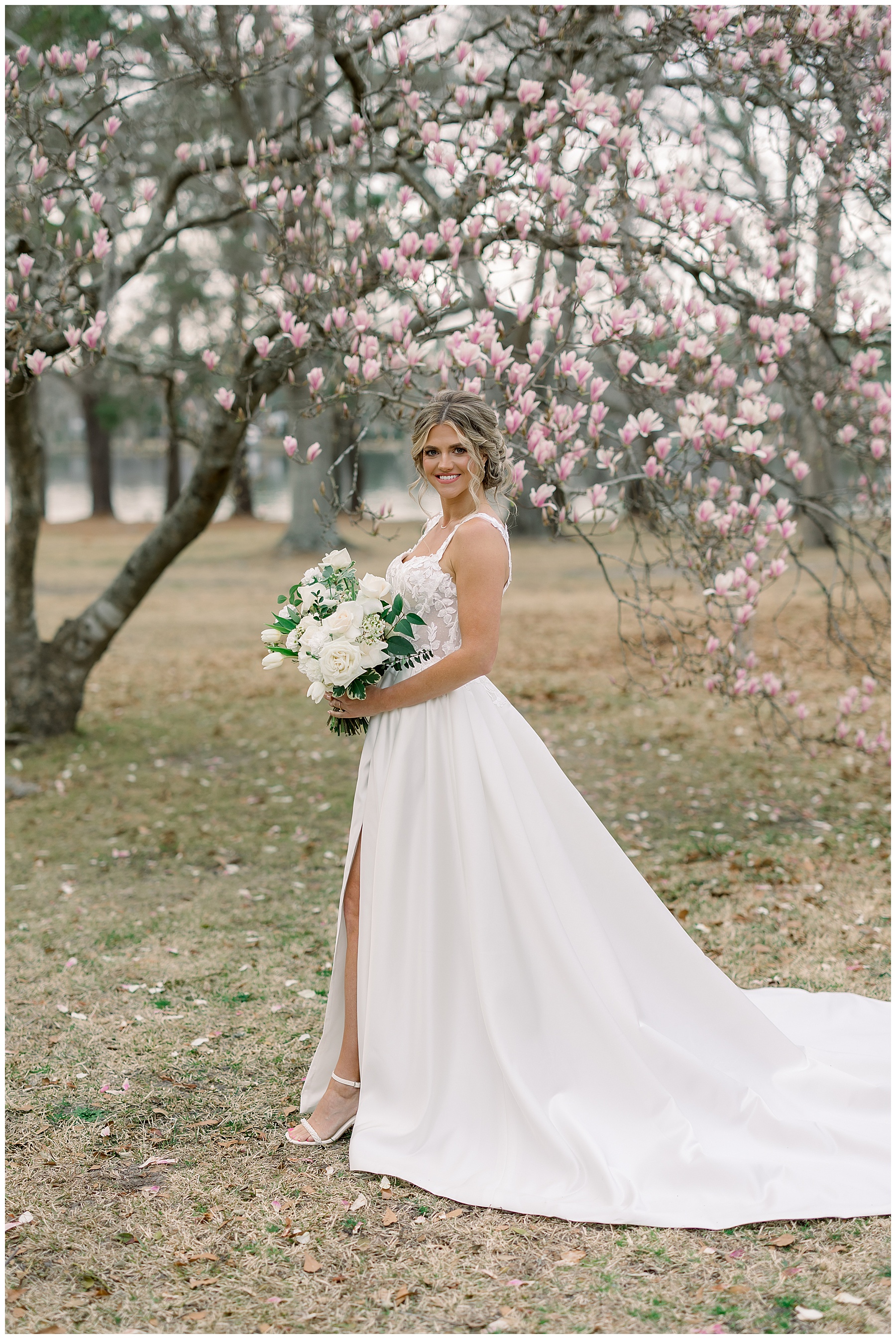 We had the best girls day going wedding dress shopping together! We found Kristy’s beautiful dress at NYB&G of Raleigh, and they always have amazing customer service and give such a great experience to their brides. Kristy’s face LIT UP when we walked up to the mirror in this dress, so we KNEW it was “THE ONE” immediately. That gown fits all the boxes – whimsical, romantic, feminine, unique, but also flirty with that corset bodice and the fun slit in the front! Kristy has an amazing seamstress, so she custom made straps for Kristy! (Also a huge thank you to our favorite Research Queen, Beverly Lee, who originally found this beautiful veil that matches Kristy’s dress color perfectly! I literally ordered from her link!)