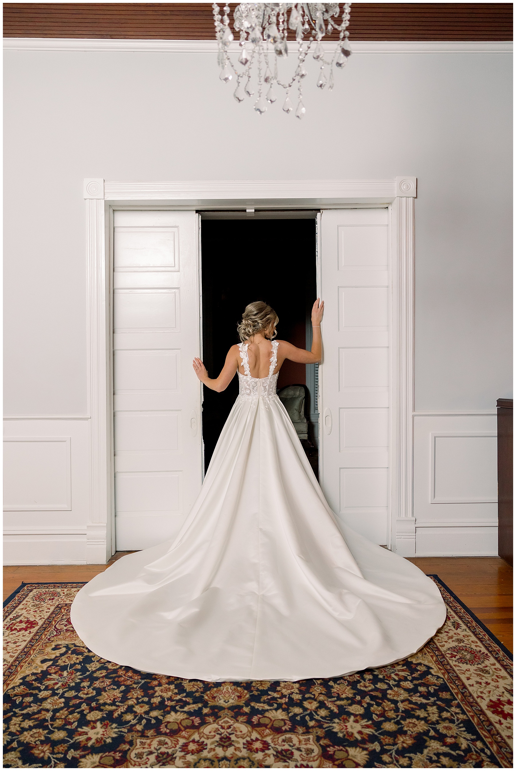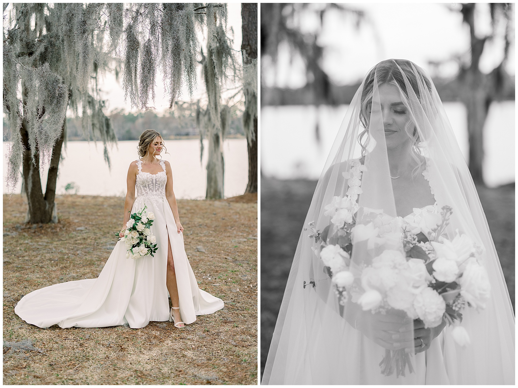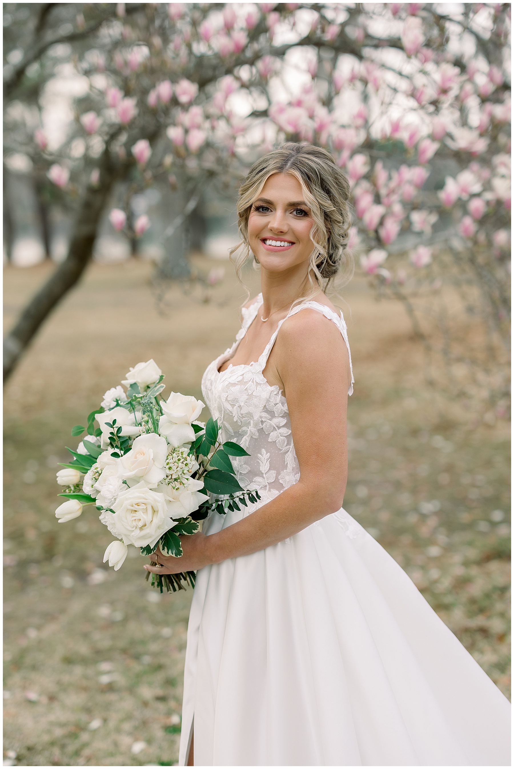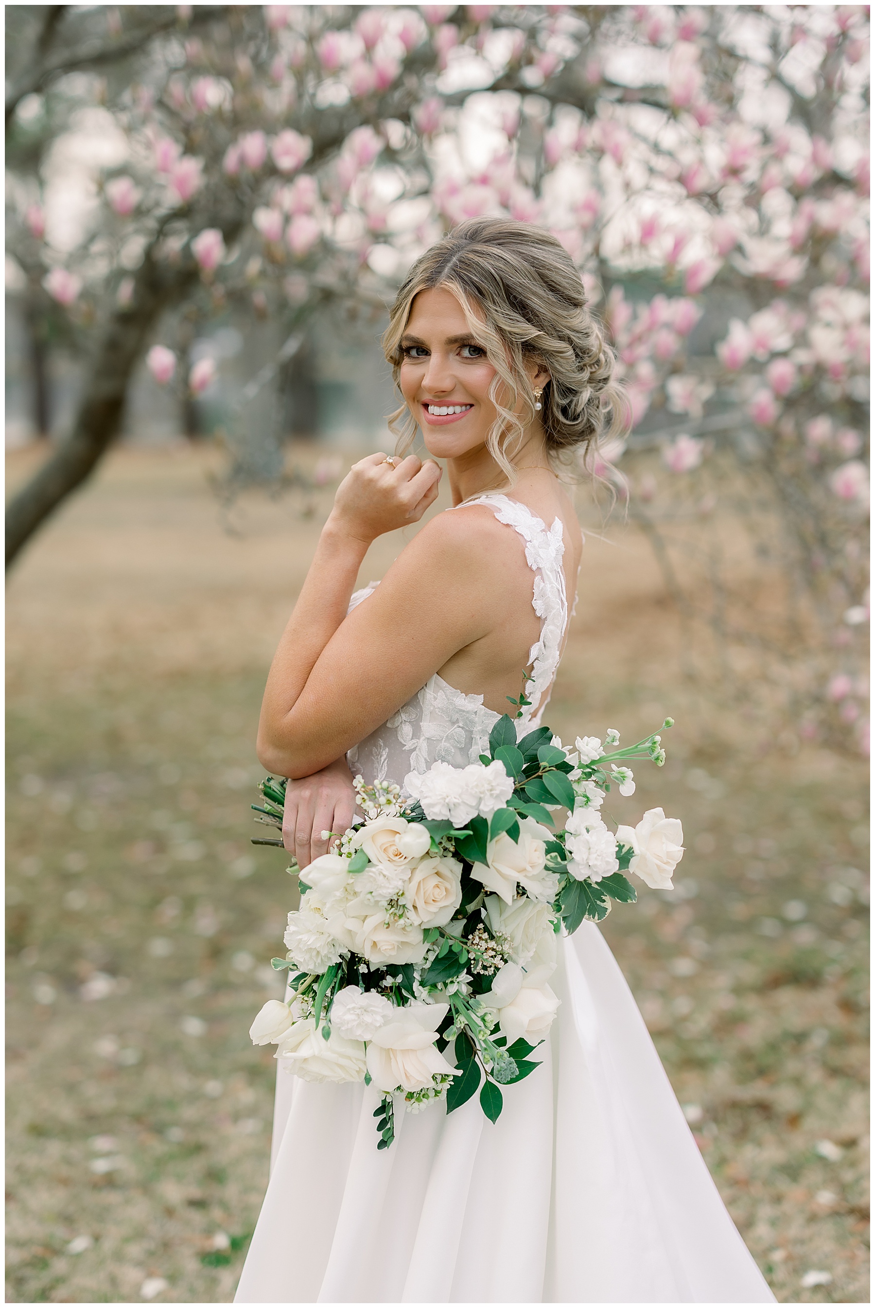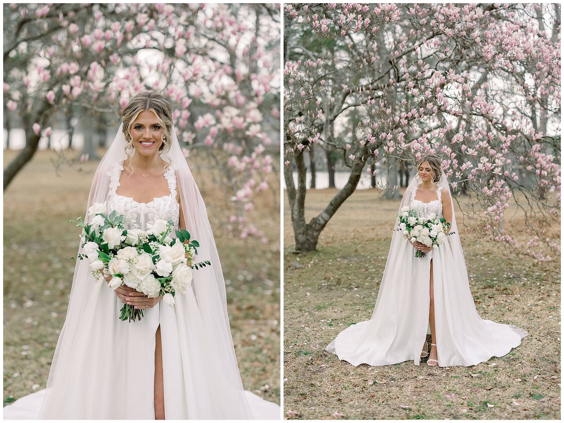 We had the best girls day going wedding dress shopping together! We found Kristy’s beautiful dress at NYB&G of Raleigh, and they always have amazing customer service and give such a great experience to their brides. Kristy’s face LIT UP when we walked up to the mirror in this dress, so we KNEW it was “THE ONE” immediately. That gown fits all the boxes – whimsical, romantic, feminine, unique, but also flirty with that corset bodice and the fun slit in the front! Kristy has an amazing seamstress, so she custom made straps for Kristy! (Also a huge thank you to our favorite Research Queen, Beverly Lee, who originally found this beautiful veil that matches Kristy’s dress color perfectly! I literally ordered from her link!)