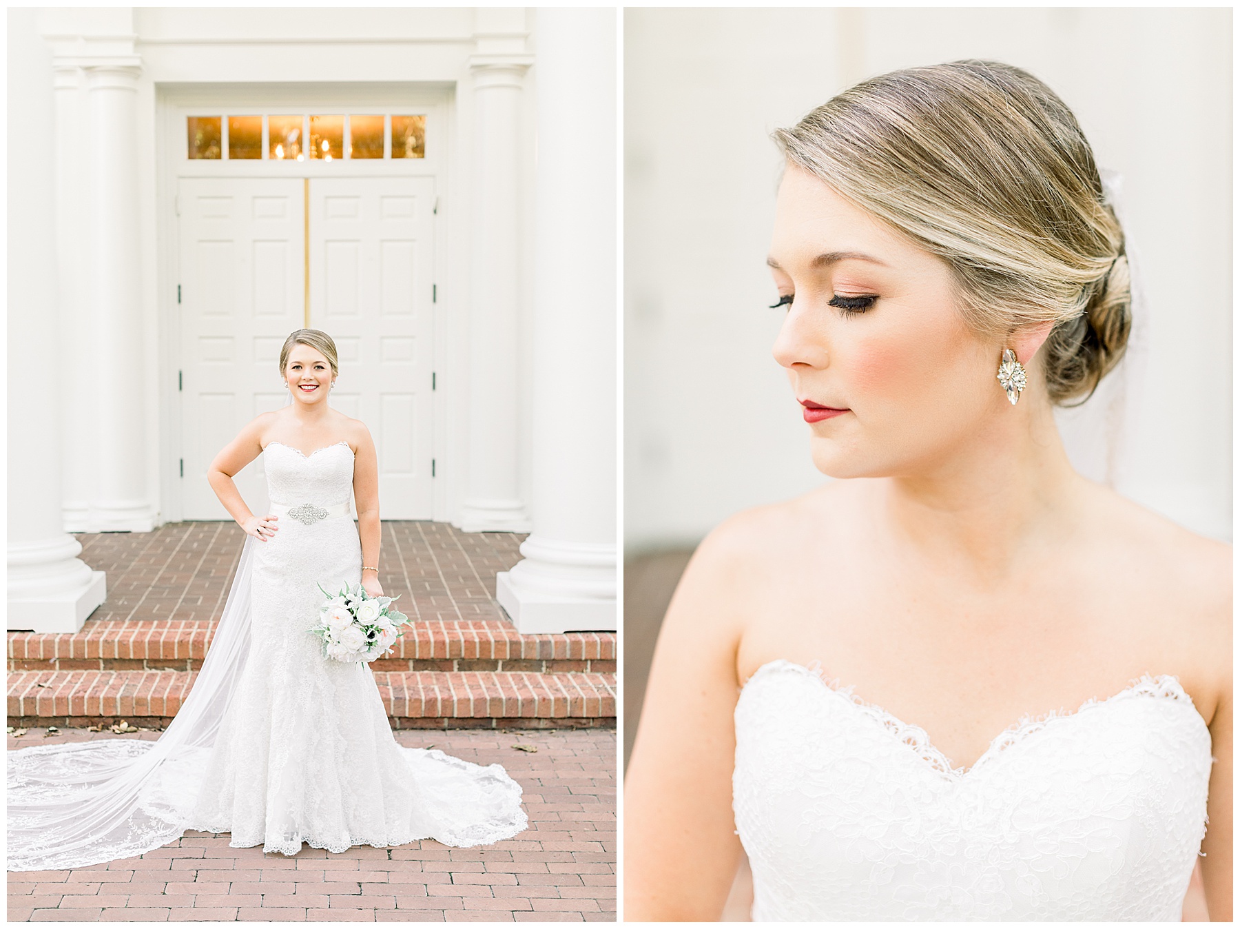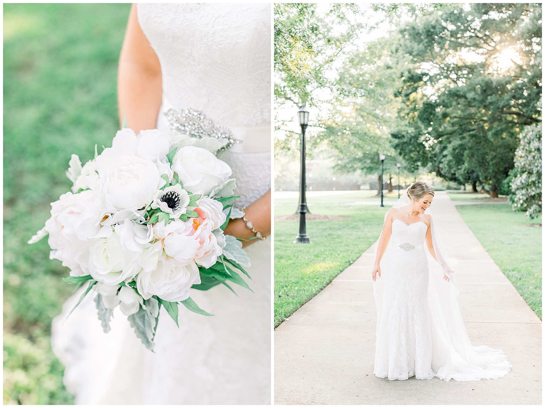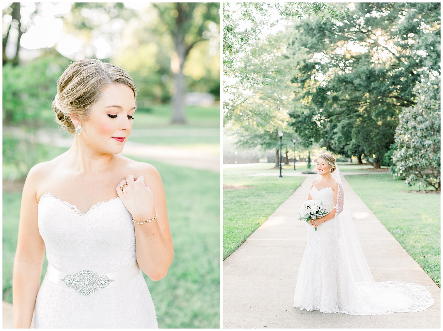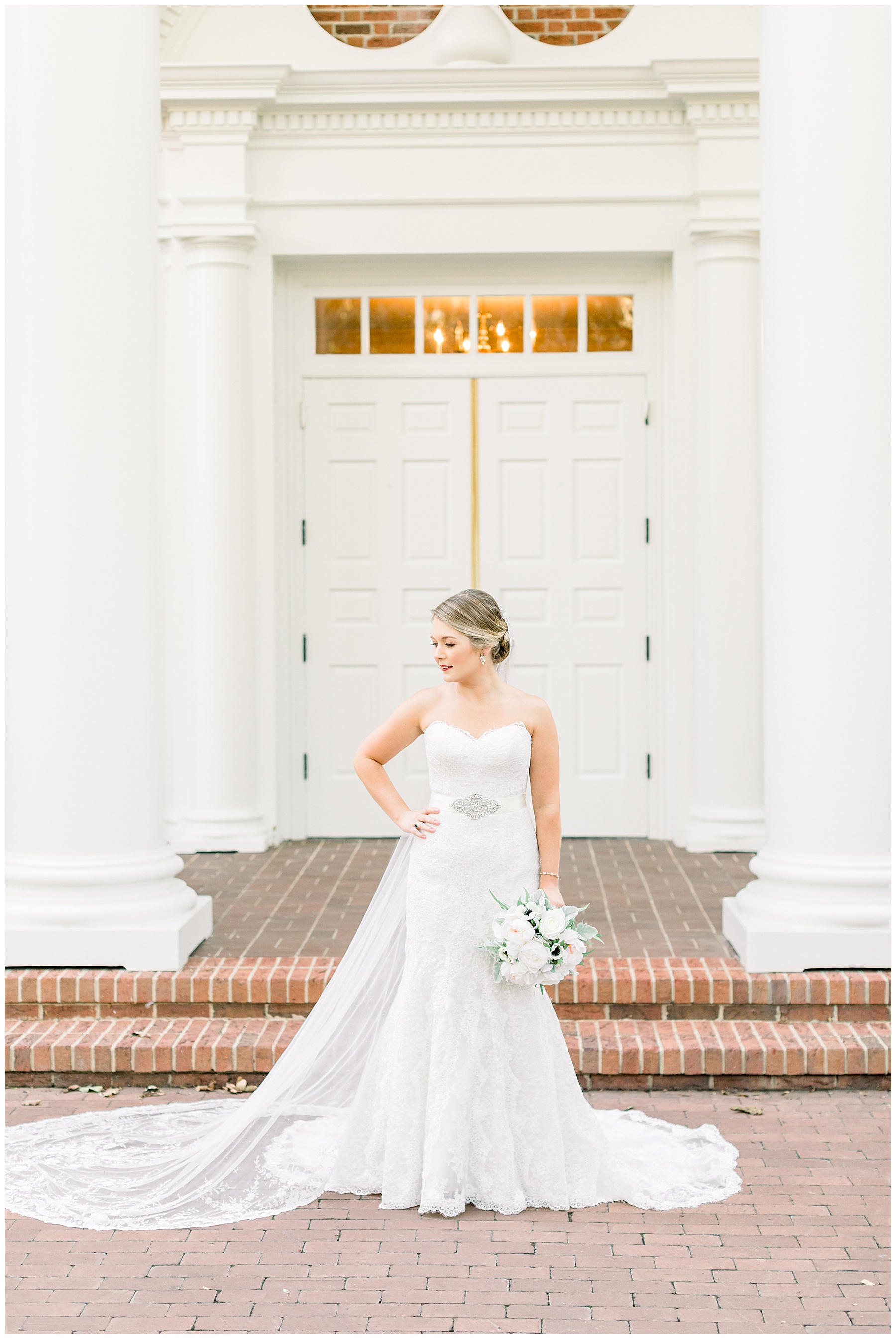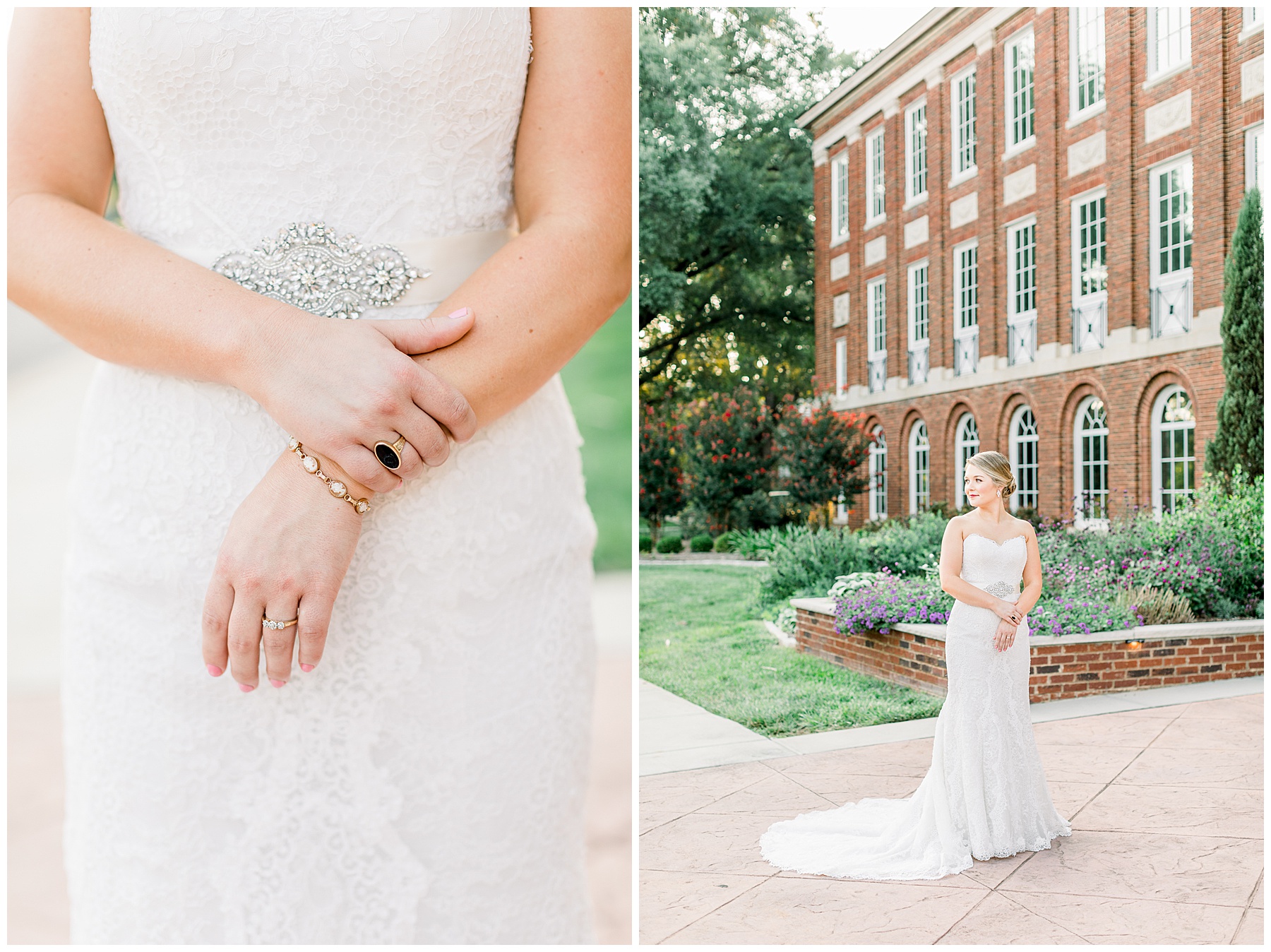 It’s always a great day to be shooting on Meredith College’s campus! We arrived and met Laura Beth at the chapel, and she looked STUNNING! Her hair was in a gorgeous updo, with sparkly earrings that matched her belt. Her dress had the most beautiful texture, and fit her perfectly. Laura Beth wore two heirloom pieces – one was a cameo bracelet of her mom’s, another was her veil! The veil is actually passed down for 60 years in Gilliam’s family, and over 30 ladies have worn it! I loved how delicate the lace was, and it looked so fitting on Laura Beth!