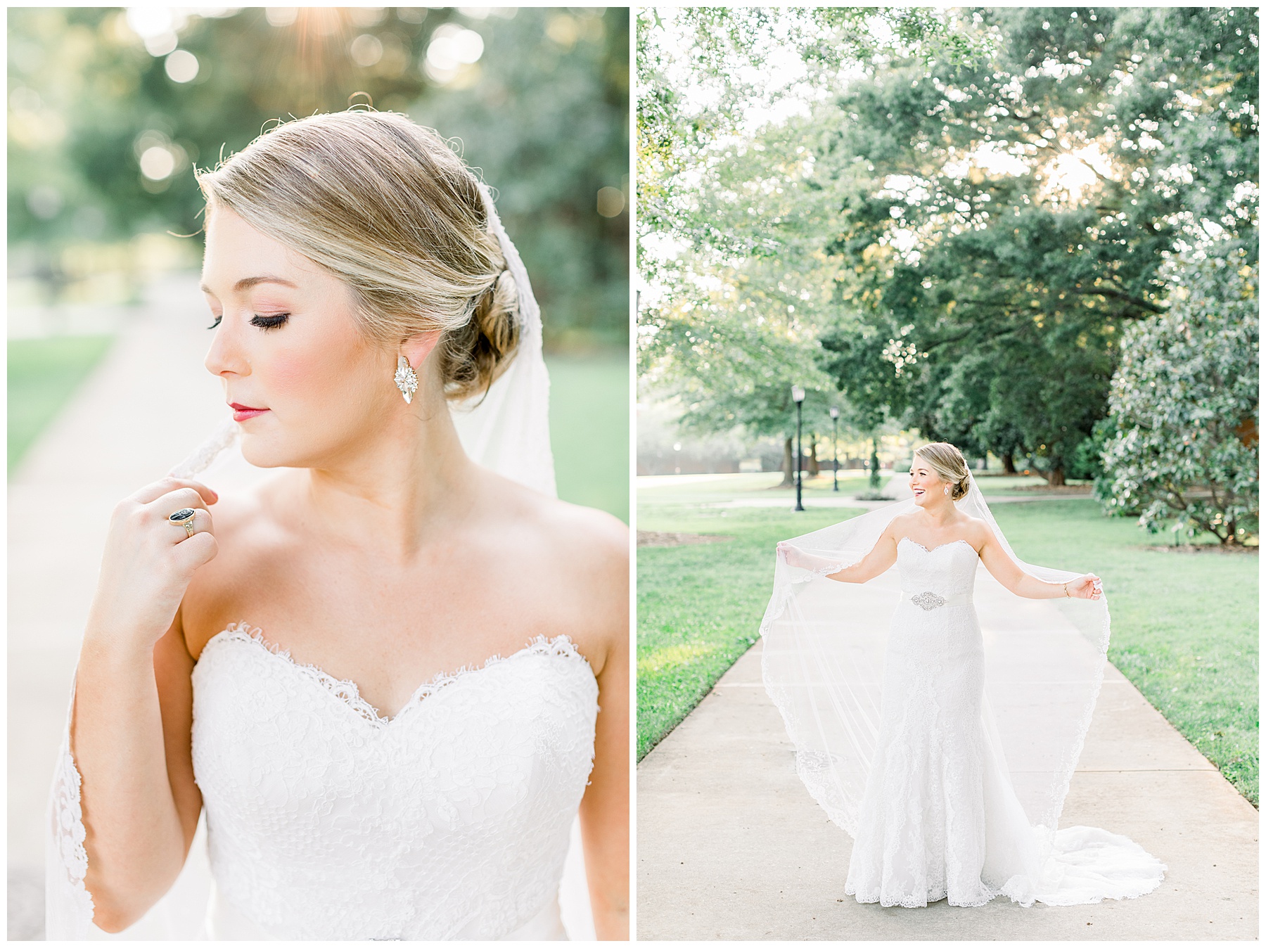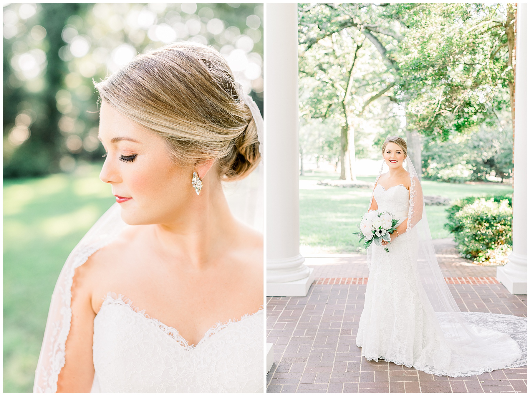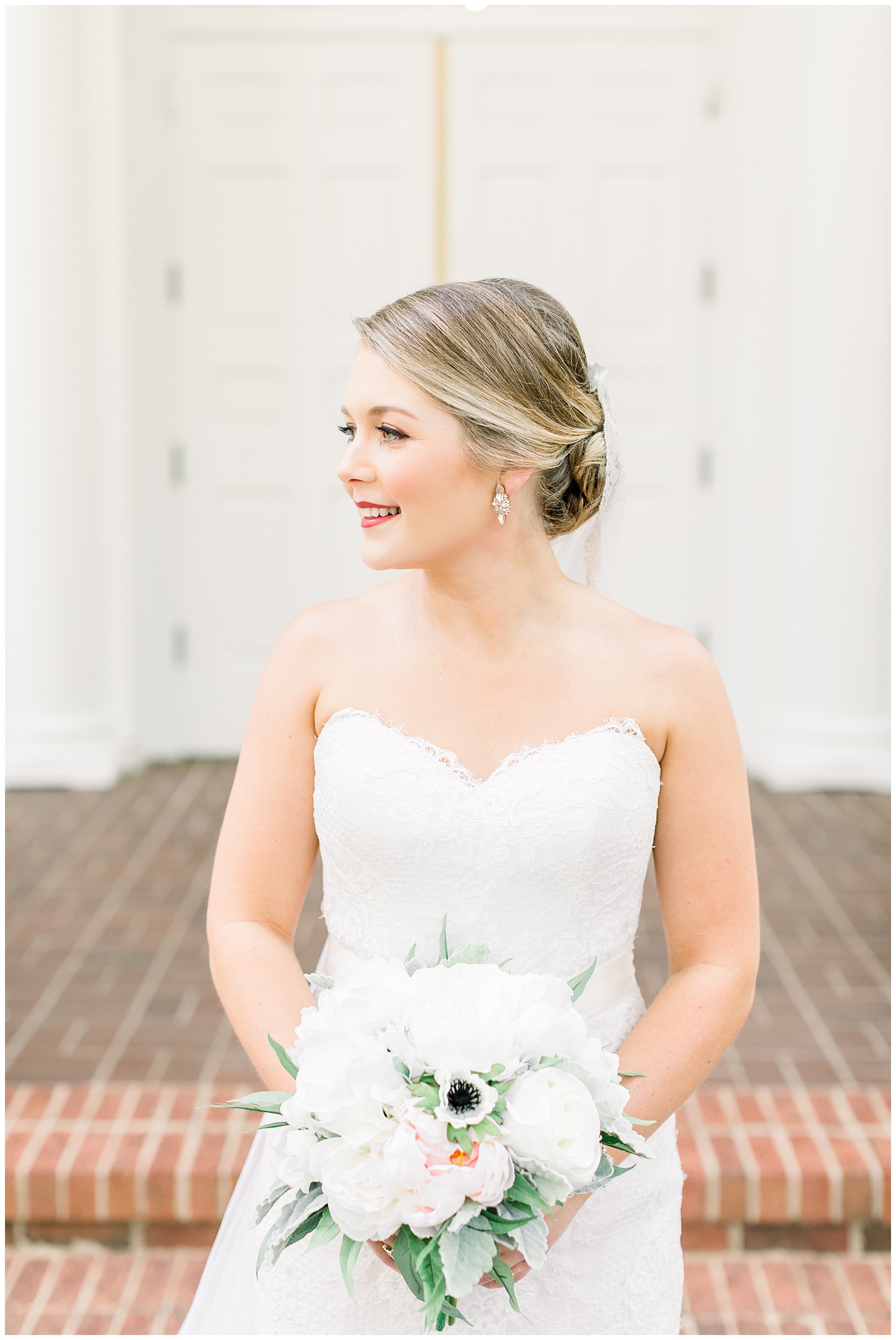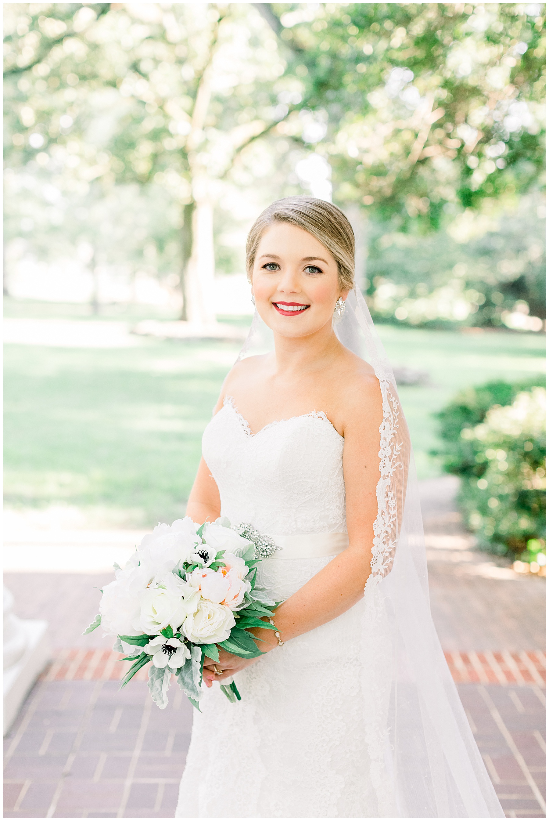 It’s always a great day to be shooting on Meredith College’s campus! We arrived and met Laura Beth at the chapel, and she looked STUNNING! Her hair was in a gorgeous updo, with sparkly earrings that matched her belt. Her dress had the most beautiful texture, and fit her perfectly. Laura Beth wore two heirloom pieces – one was a cameo bracelet of her mom’s, another was her veil! The veil is actually passed down for 60 years in Gilliam’s family, and over 30 ladies have worn it! I loved how delicate the lace was, and it looked so fitting on Laura Beth!