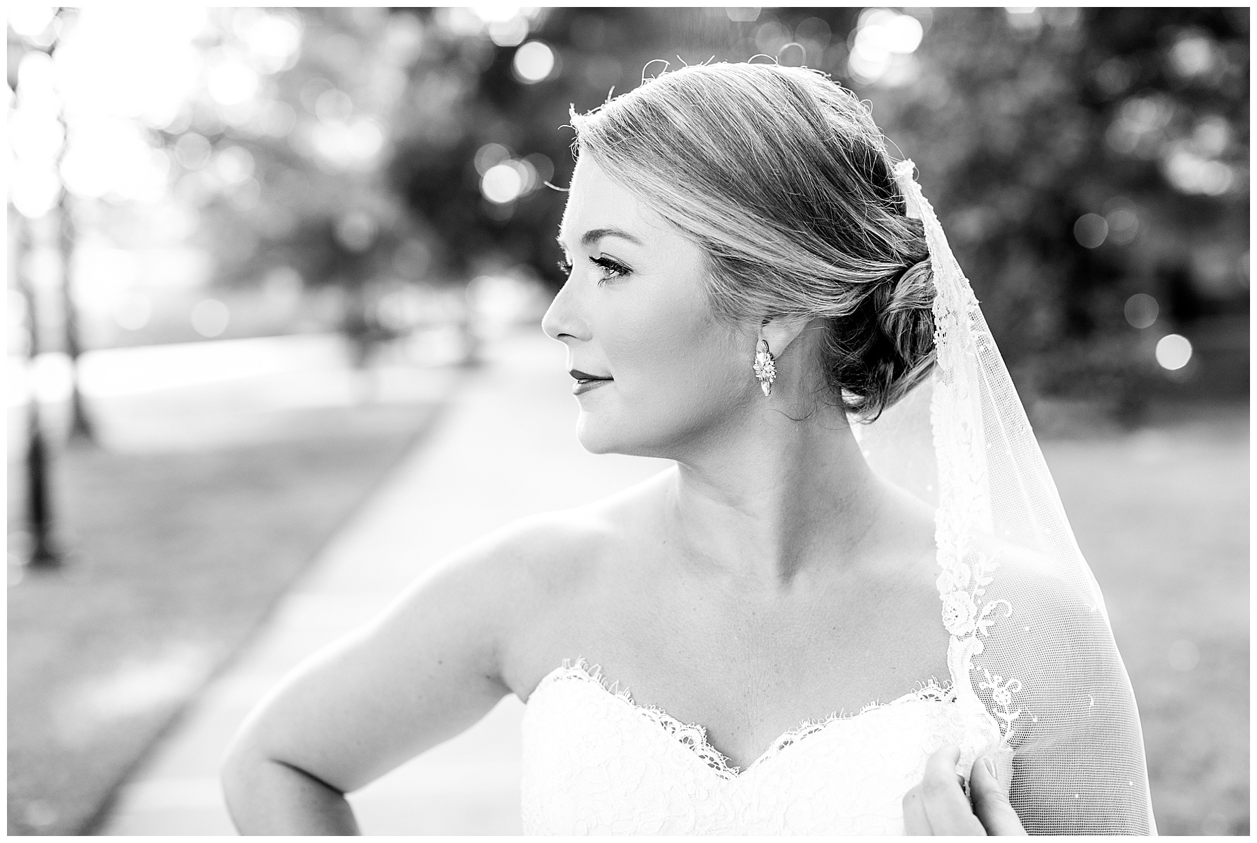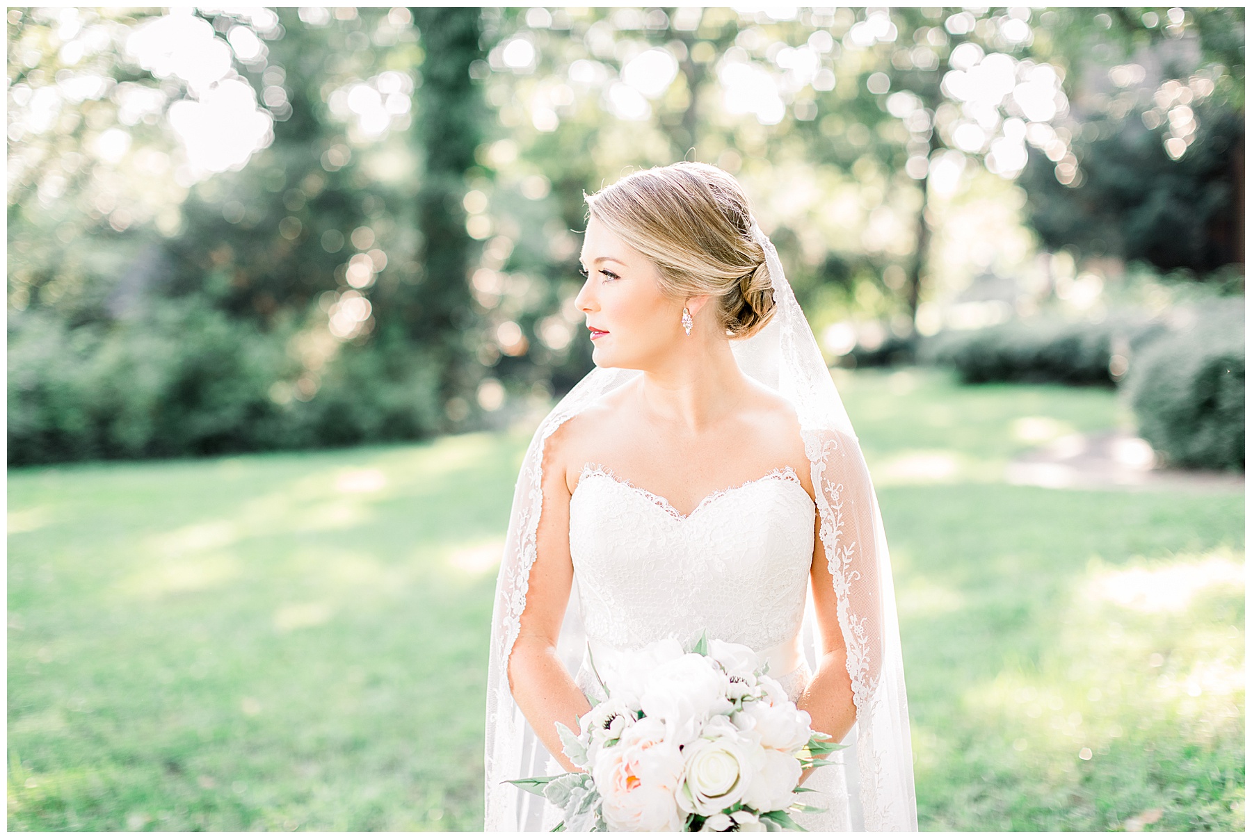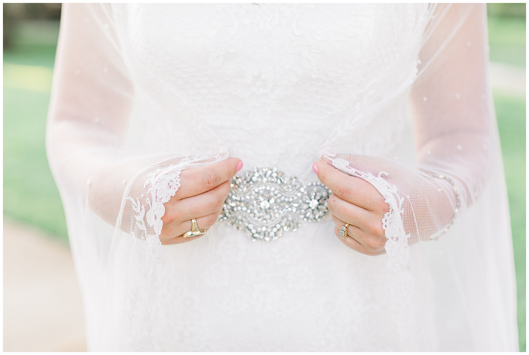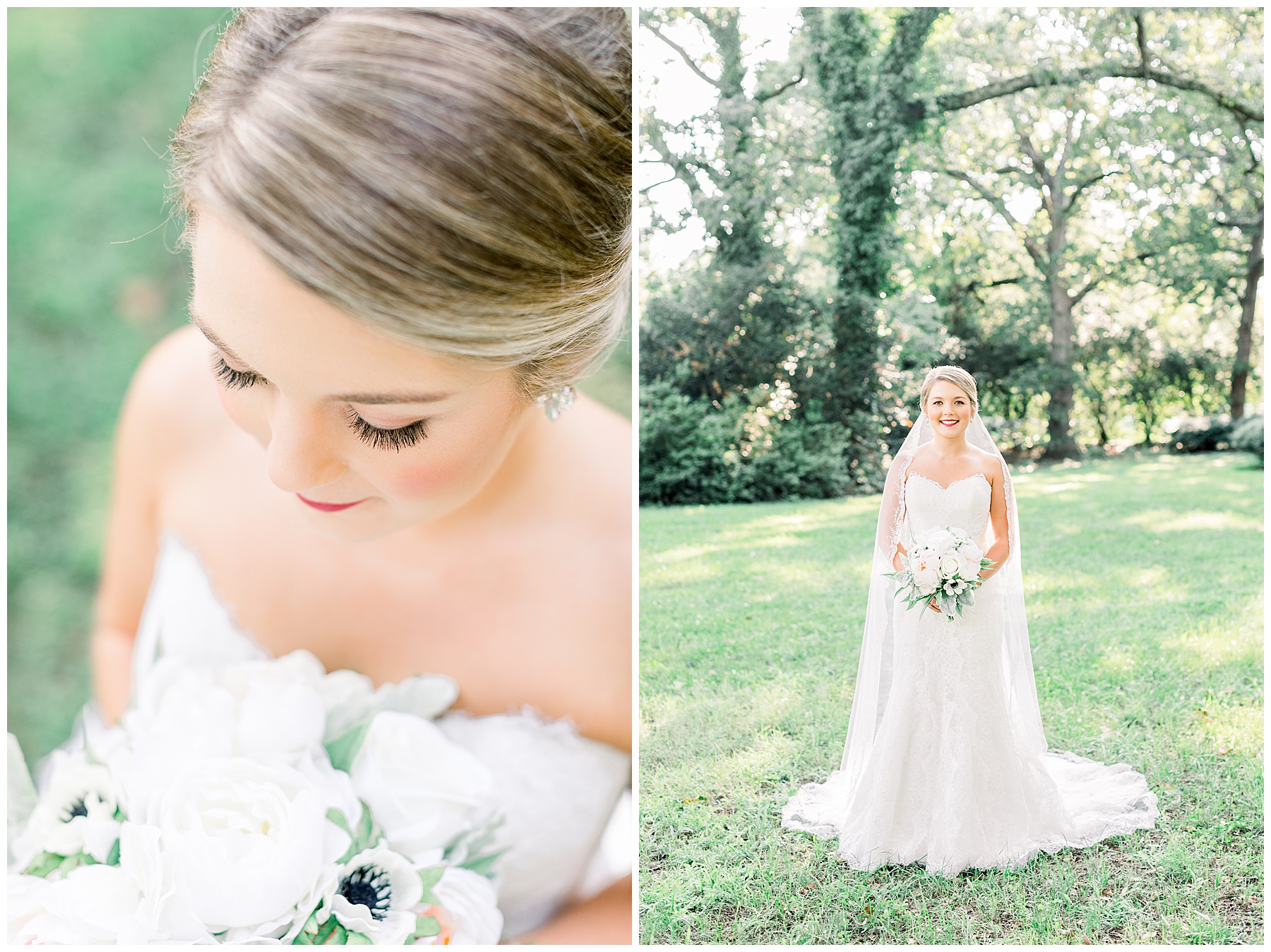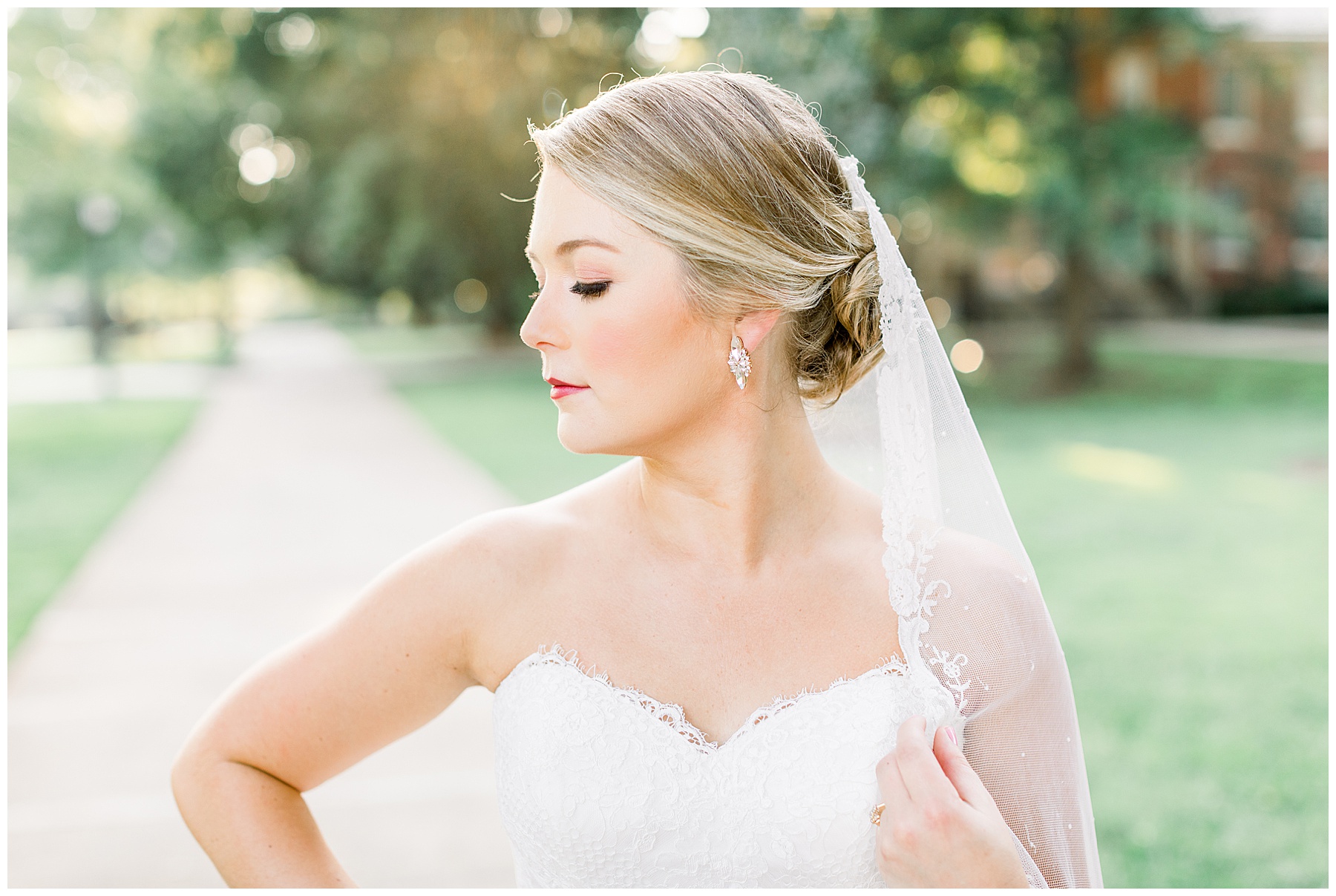 It’s always a great day to be shooting on Meredith College’s campus! We arrived and met Laura Beth at the chapel, and she looked STUNNING! Her hair was in a gorgeous updo, with sparkly earrings that matched her belt. Her dress had the most beautiful texture, and fit her perfectly. Laura Beth wore two heirloom pieces – one was a cameo bracelet of her mom’s, another was her veil! The veil is actually passed down for 60 years in Gilliam’s family, and over 30 ladies have worn it! I loved how delicate the lace was, and it looked so fitting on Laura Beth!