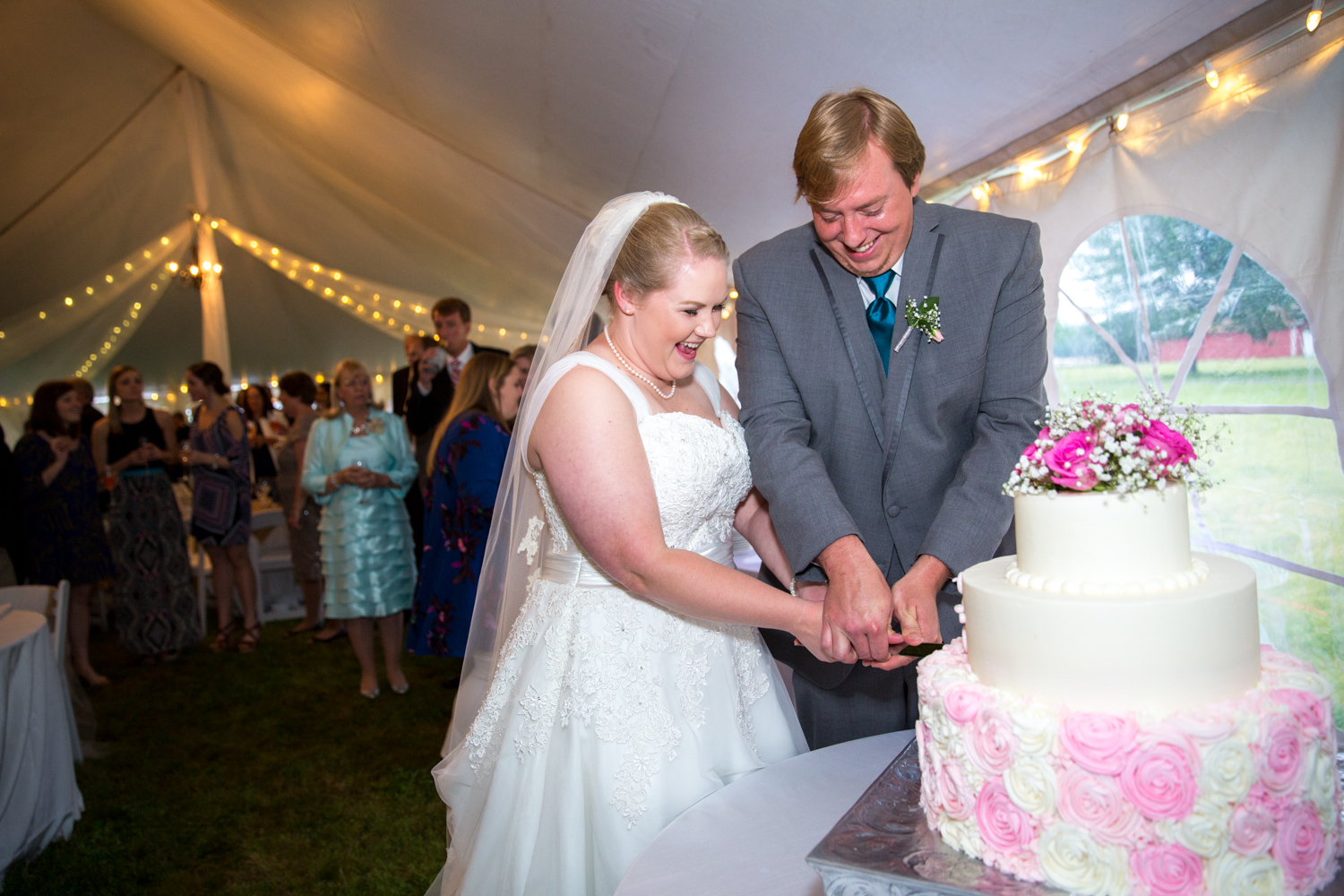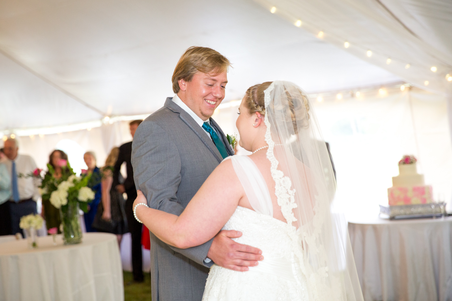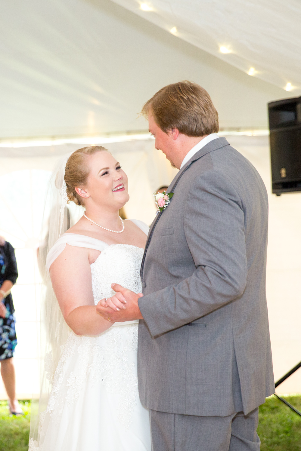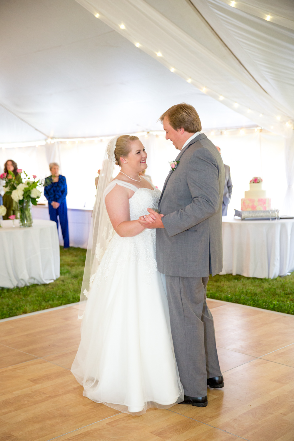 After the ceremony, we headed to the Bluegrass Barn for the reception. (Sound familiar? That’s where Phillip and I got married!) I was absolutely BLOWN AWAY at how Leigh and her planner, Robin Williams had transformed a tent and the downstairs of the barn into a gorgeous, softly colored venue. There were fresh flowers everywhere, and tons of décor.