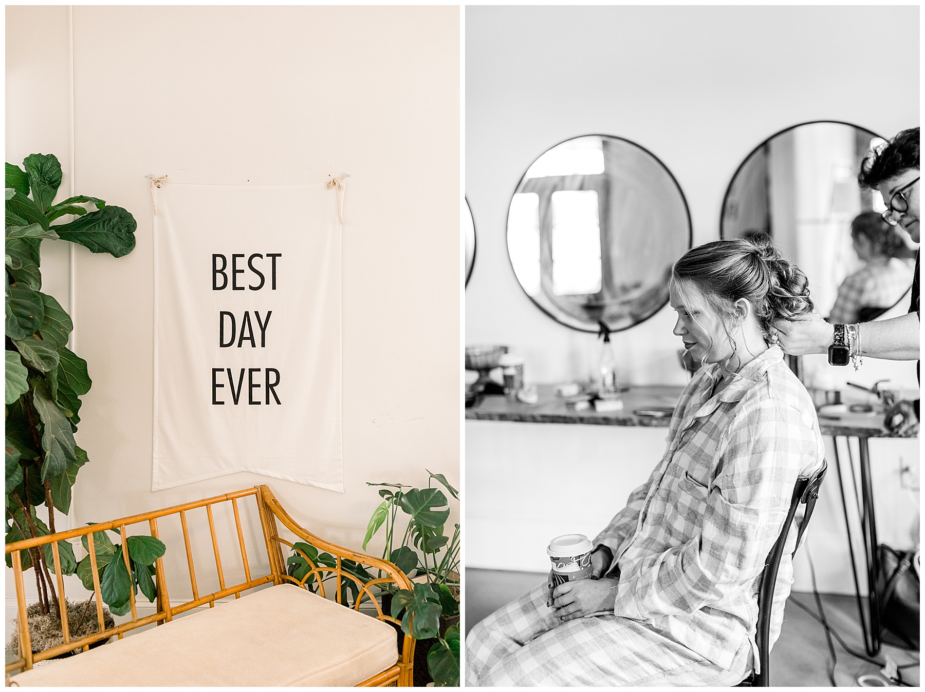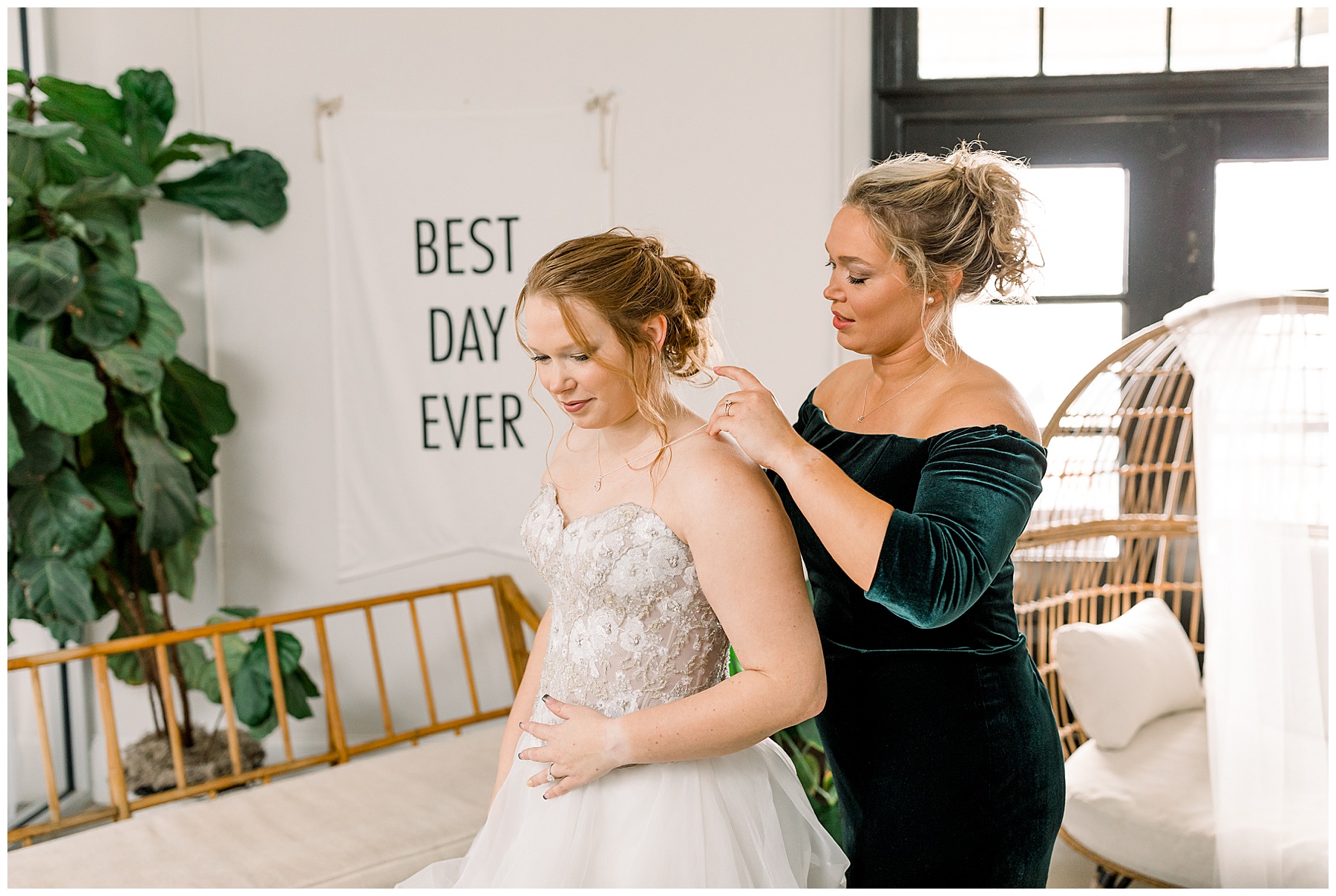 The girls got glammed up in the Bridal Suite with a buffet of food, mimosas, starbucks coffee, music playing, and the two pups (Kiowa and HELO) running around keeping everyone entertained! We started off photographing Madison’s details (I actually designed their wedding invitation suite – and it was SO fun!) and I especially loved their gold wax seal & her pear shaped ring. It was also our first time photographing a TWO piece dress – super unique!!! The photos of the girls on the couch with the dogs are some of my FAVORITE “getting ready” photos I’ve taken, I can’t wait for you to see those! :)