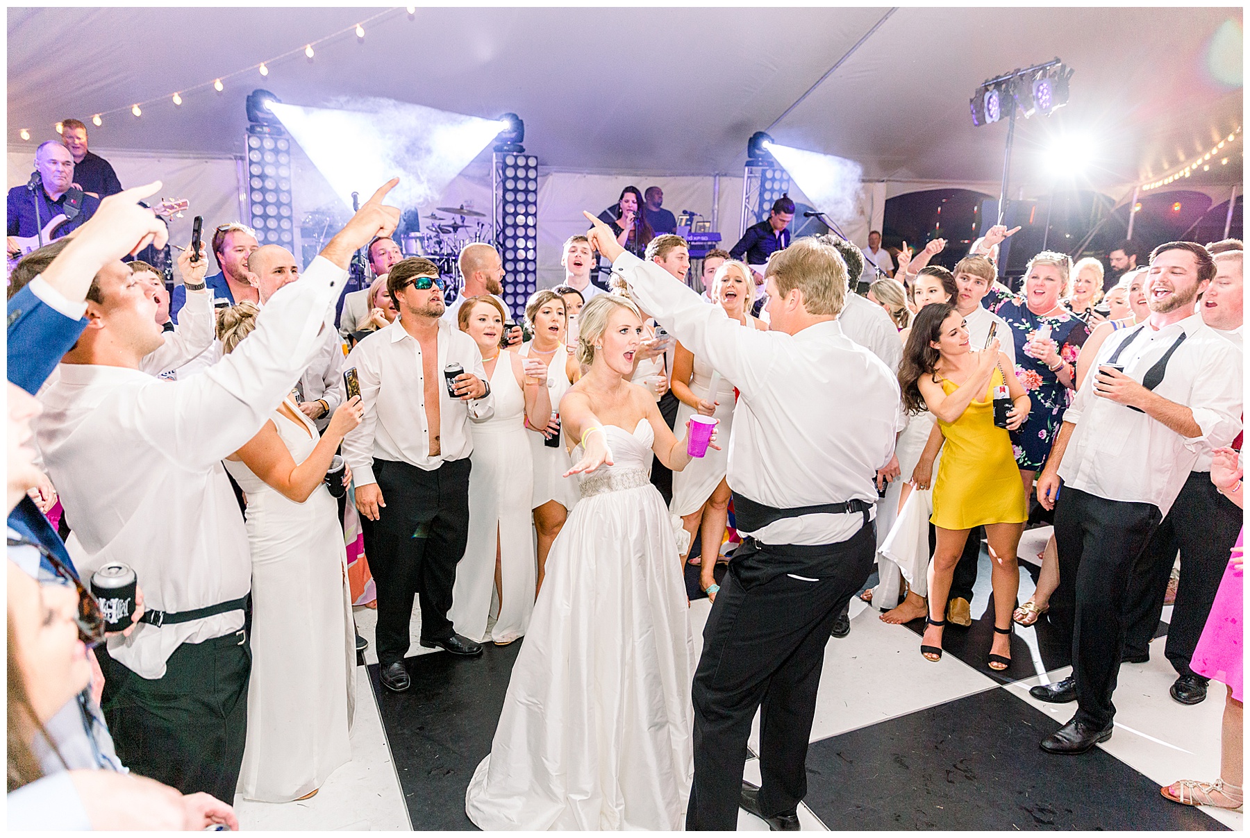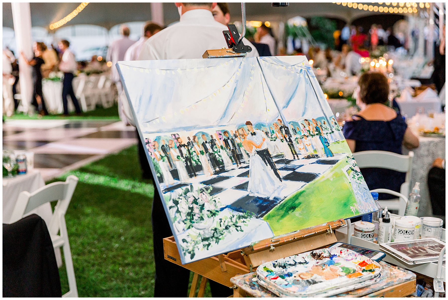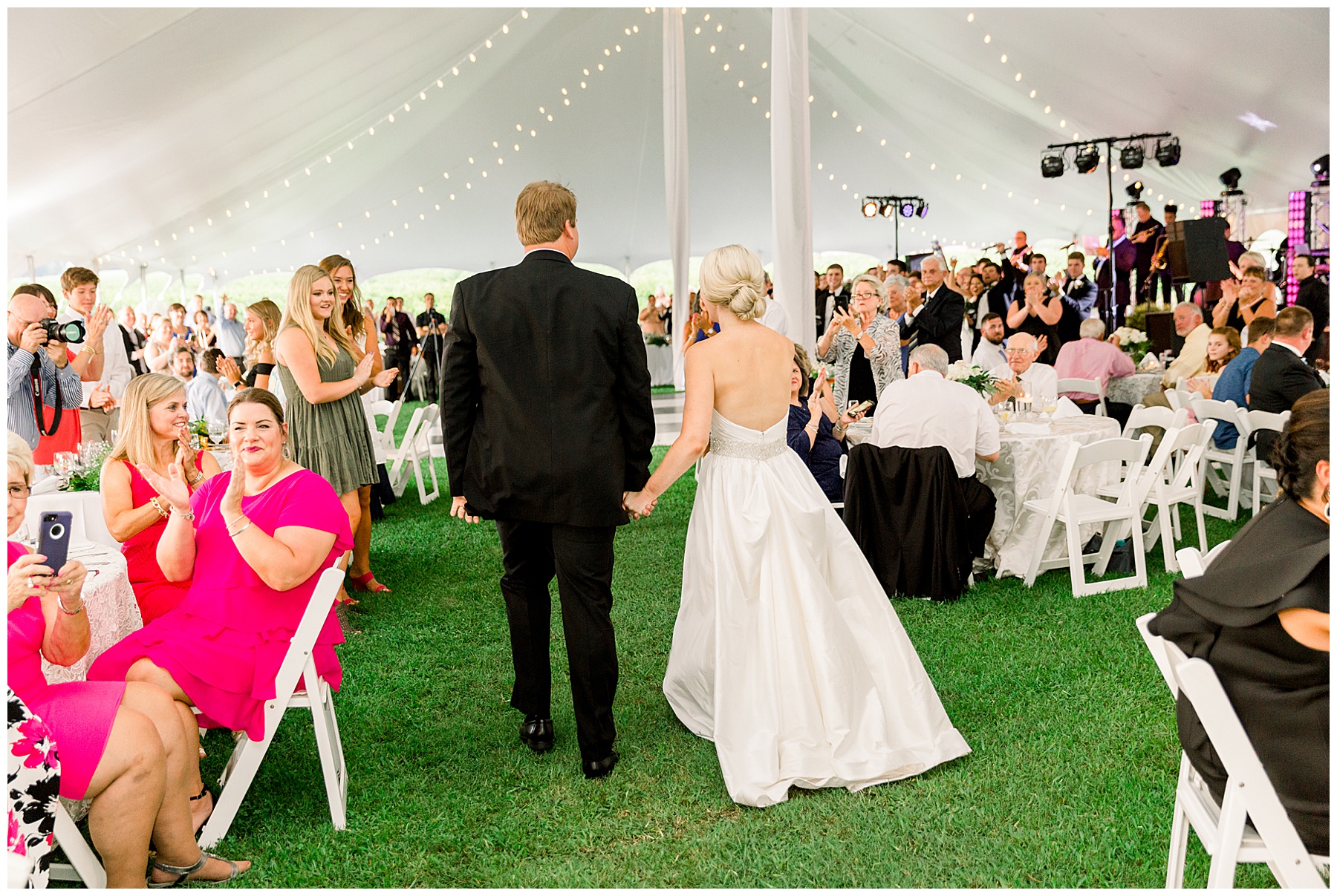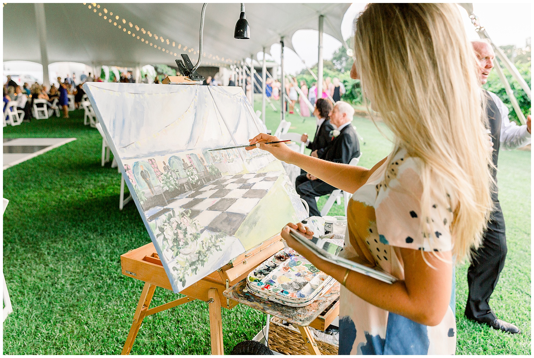 After their ceremony, everyone headed over to the reception! It was a HUGE event fit for their 500 guests – with a 3-peaked white tent, a lounge area with cocktail tables, and then all the food buffets were indoors! They had the BIGGEST cake I’ve ever seen, multiple bars with signature cocktails and wine straight from the vineyard, Brittany Rawls live painting their first dance on site, and the MOST FUN band (The Band Punch) jamming all night long!!!!
