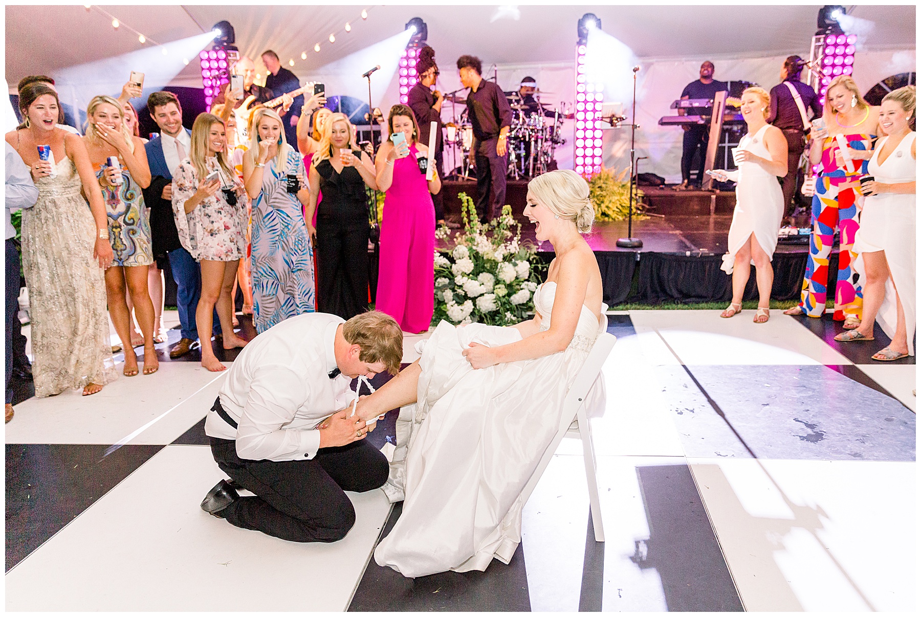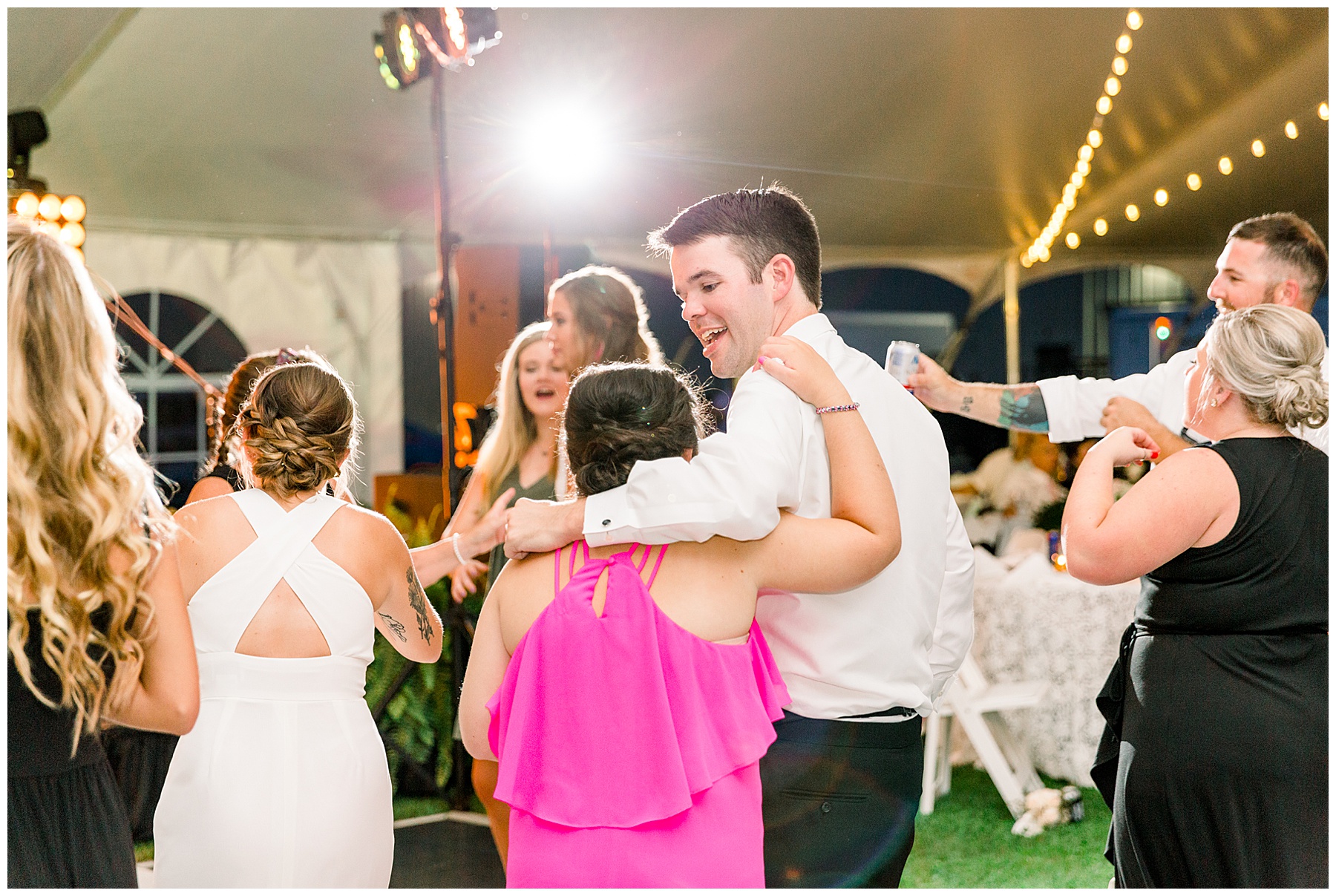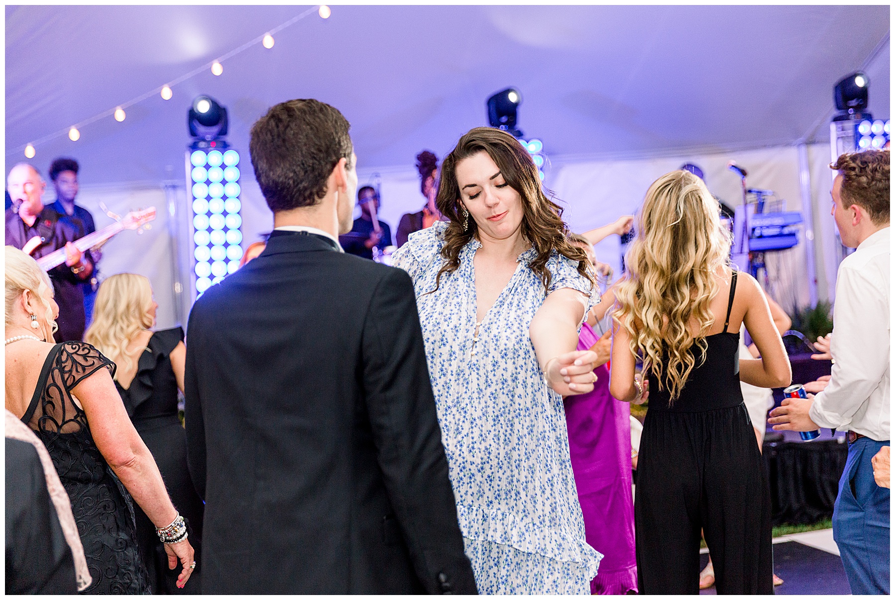 After their ceremony, everyone headed over to the reception! It was a HUGE event fit for their 500 guests – with a 3-peaked white tent, a lounge area with cocktail tables, and then all the food buffets were indoors! They had the BIGGEST cake I’ve ever seen, multiple bars with signature cocktails and wine straight from the vineyard, Brittany Rawls live painting their first dance on site, and the MOST FUN band (The Band Punch) jamming all night long!!!!