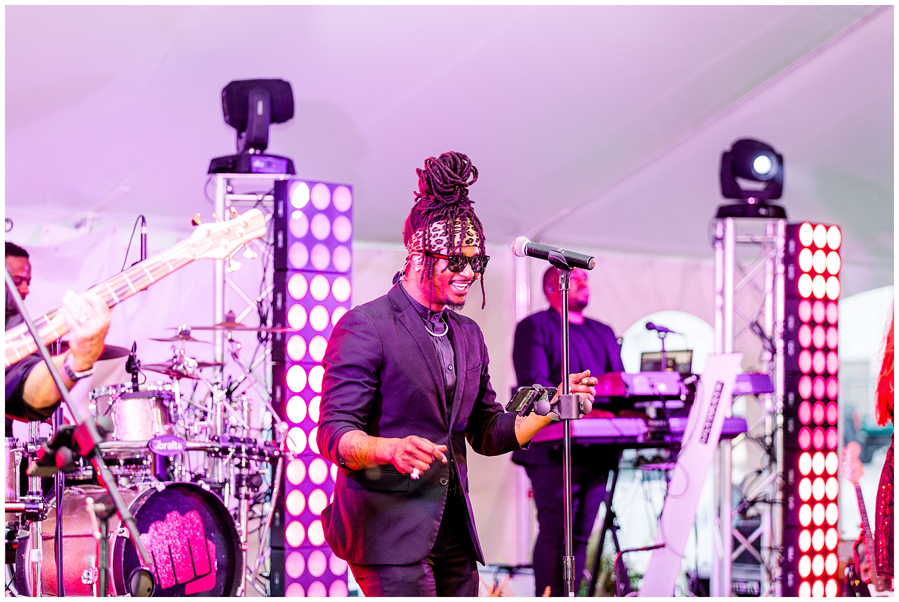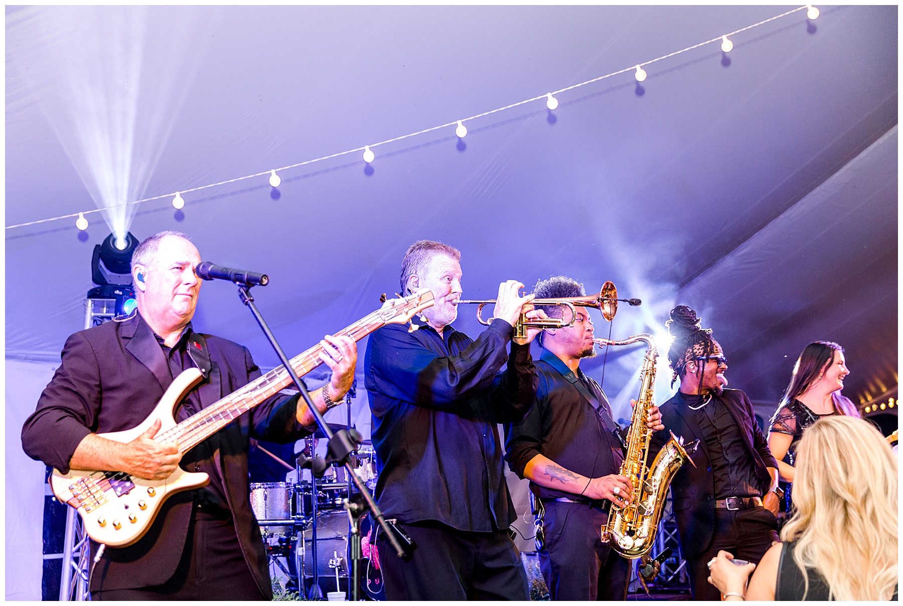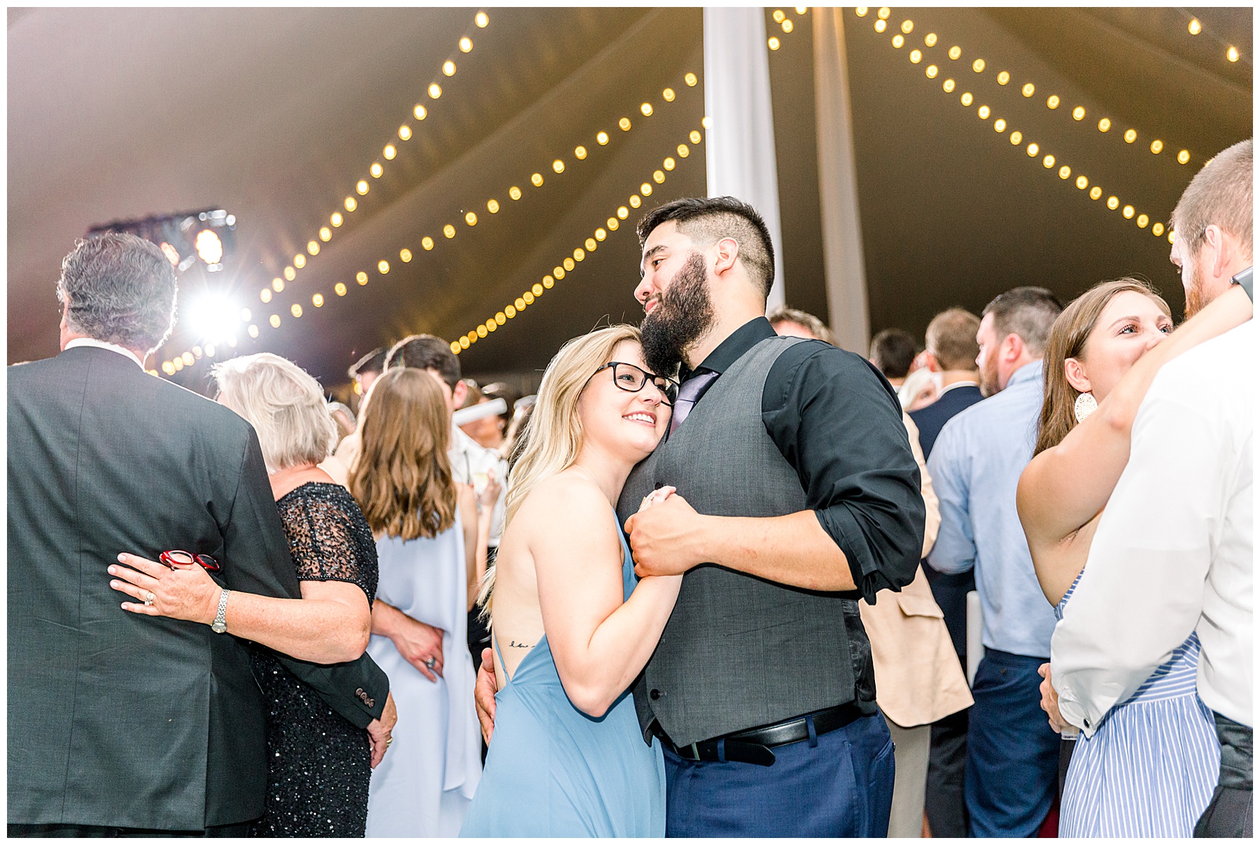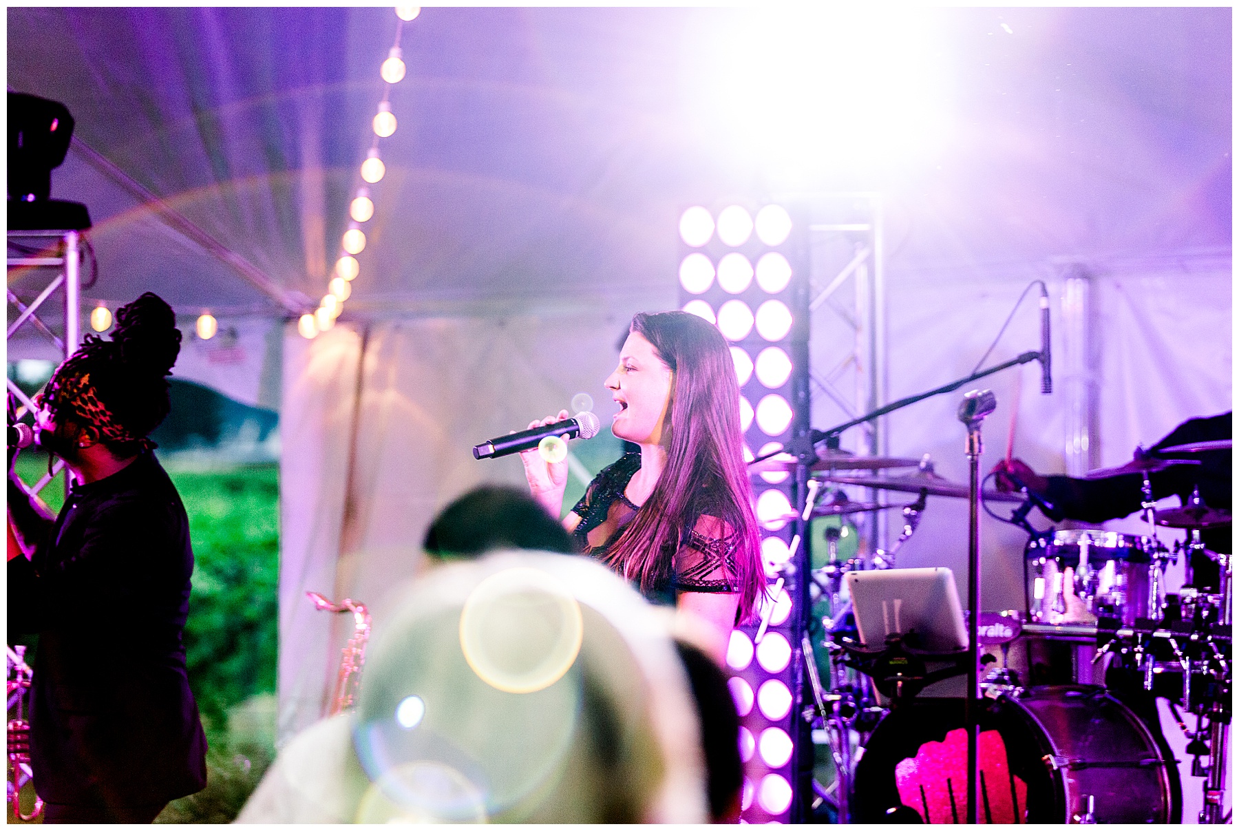 After their ceremony, everyone headed over to the reception! It was a HUGE event fit for their 500 guests – with a 3-peaked white tent, a lounge area with cocktail tables, and then all the food buffets were indoors! They had the BIGGEST cake I’ve ever seen, multiple bars with signature cocktails and wine straight from the vineyard, Brittany Rawls live painting their first dance on site, and the MOST FUN band (The Band Punch) jamming all night long!!!!