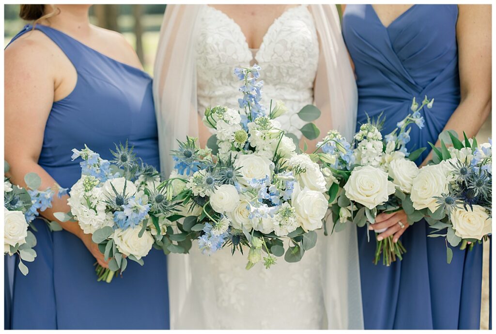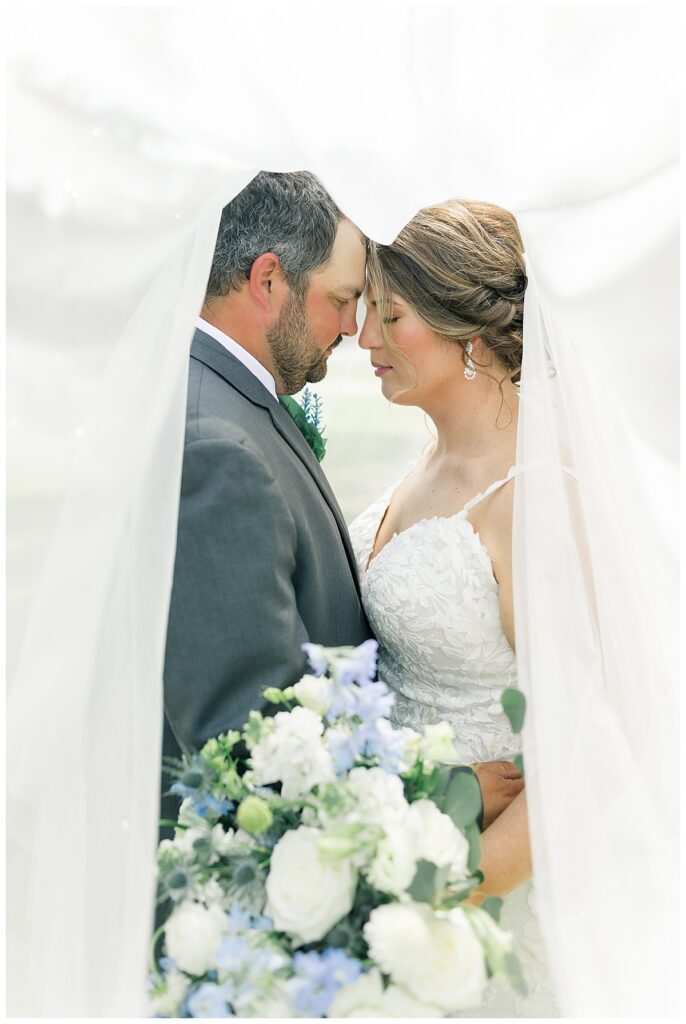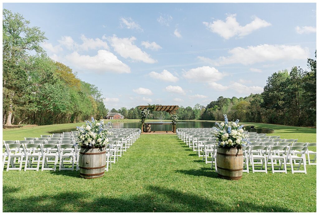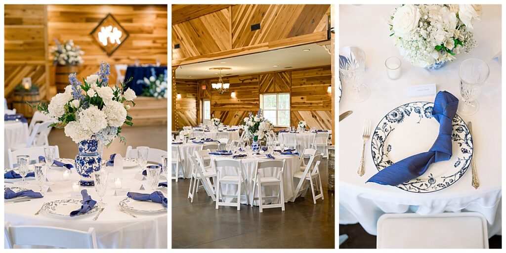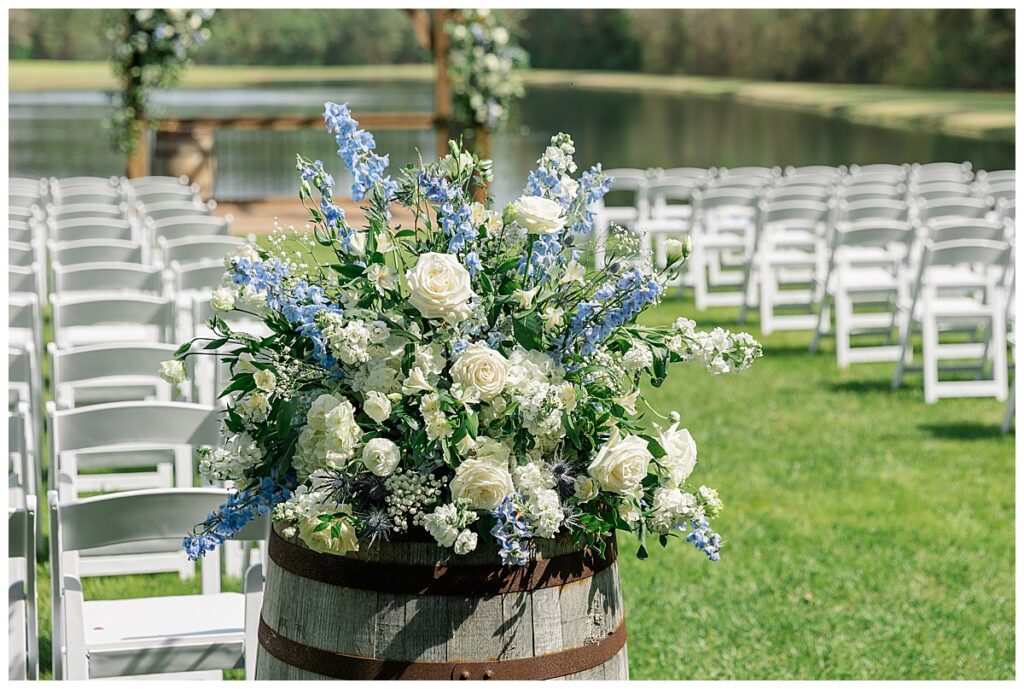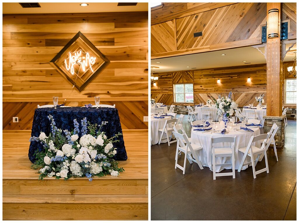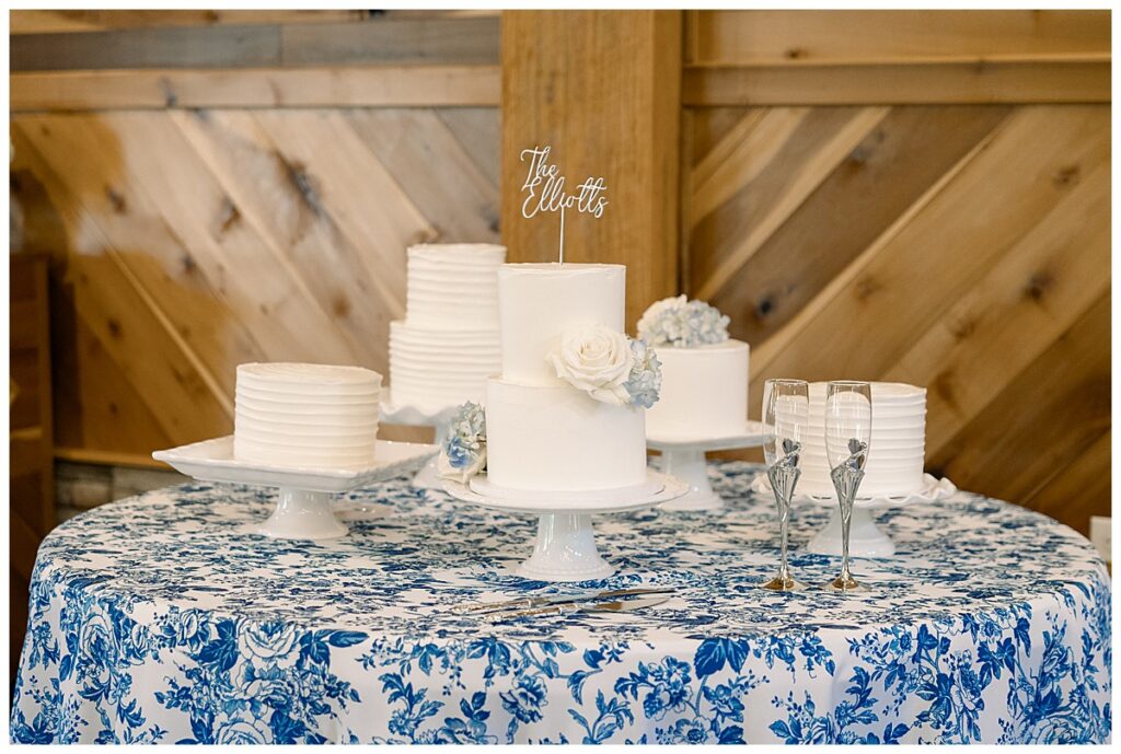 The ceremony was SO stunning at the pond, with an over-the-top floral design on the gazebo (shoutout to Brushed by Bec!) and Grey seeing Megan come down the aisle (even after doing a First Look!) he teared up and was emotional in that special moment! It was sooooo precious!! After the ceremony, they got to hangout with their guests & enjoy cocktail hour on the patio. The reception design was SOOO GORGEOUS with all heirloom chinoiserie vases from their family on the tables. I loved the varying heights and colors – and of course the beautiful sweetheart table with all the florals! The multiple cakes on the cake table was so unique and I also loved that idea a lot (bonus that the chocolate cake I tried was SO YUMMY) :)