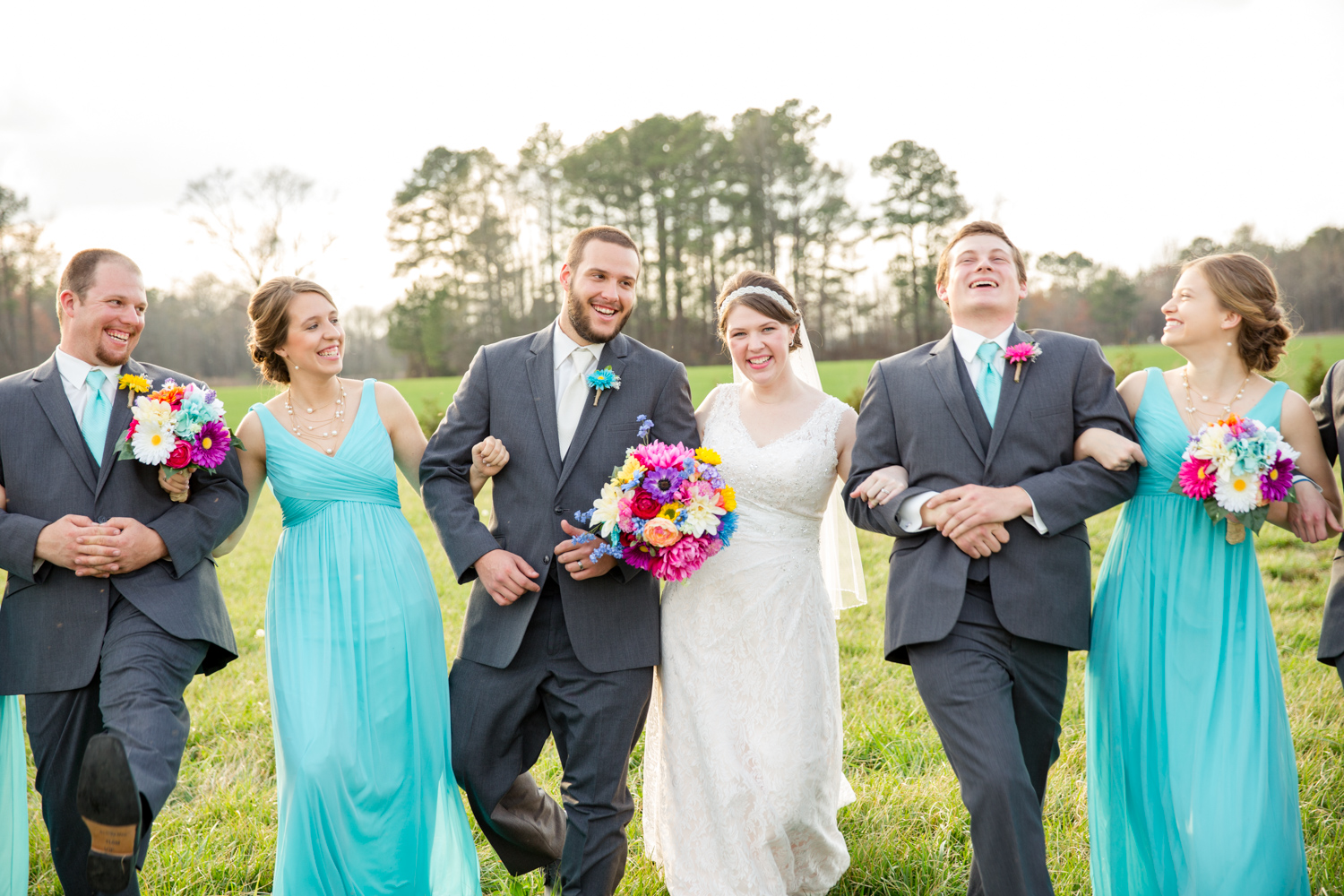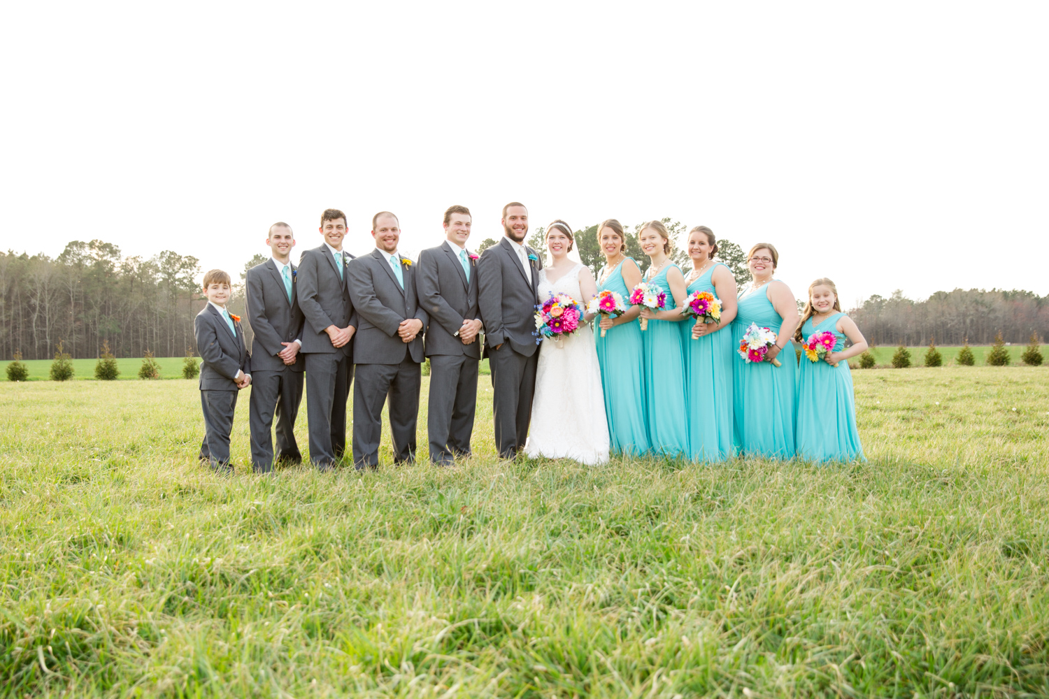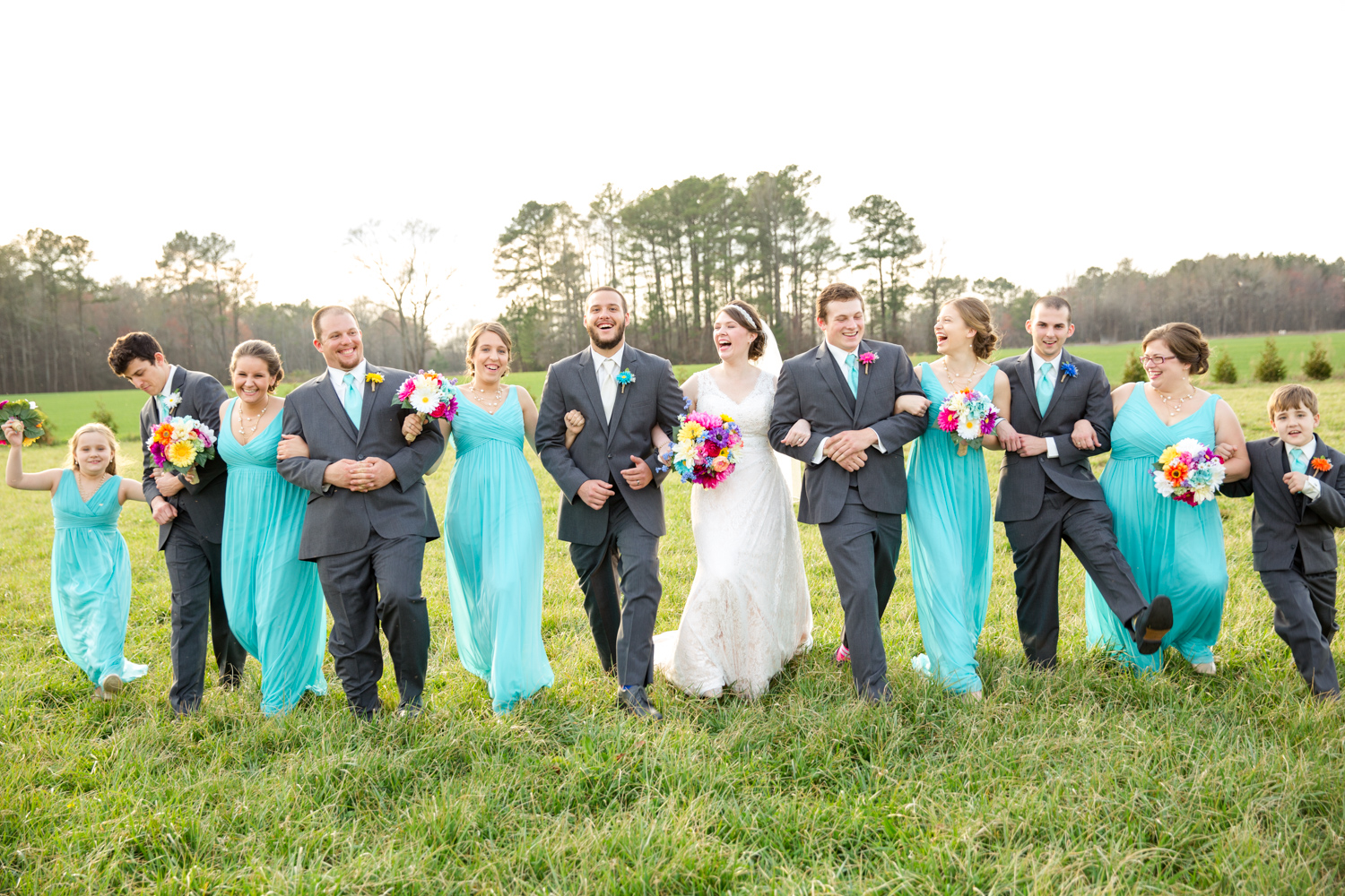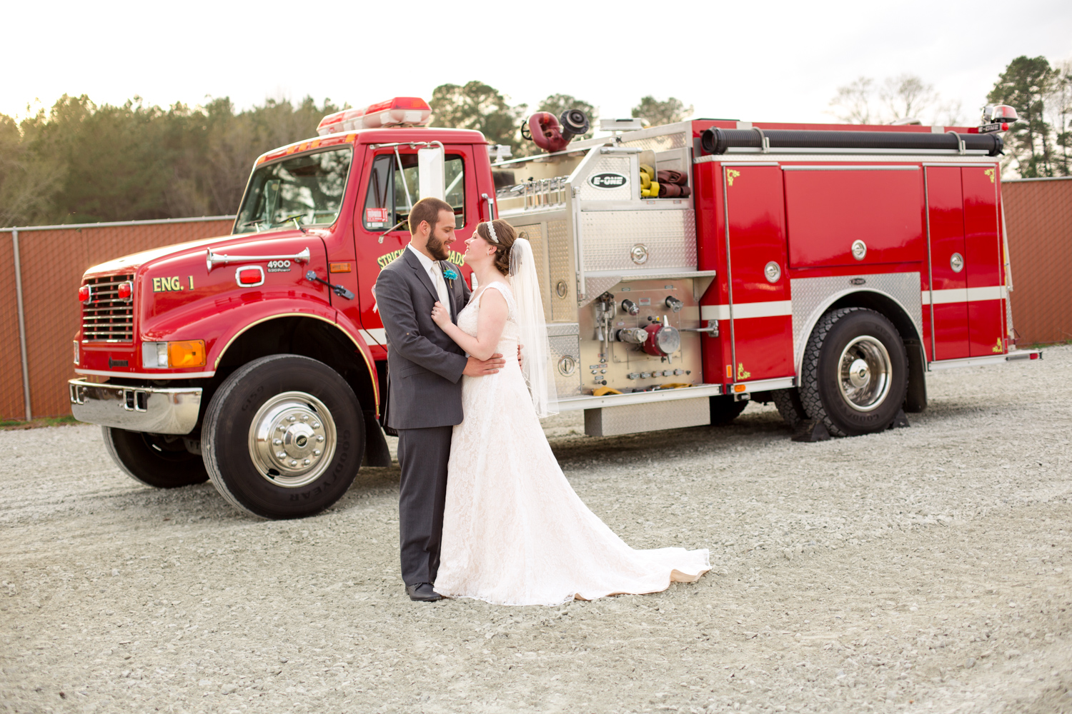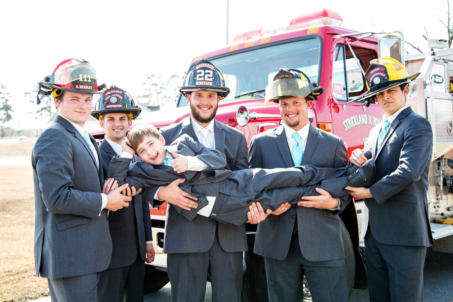 We had the most PERFECT day to have a March wedding. The sun peeked out, and it was warm. We went stomping through the tall grass to get Bridal Party shots, and the girls even had to jump over a little ditch – they did so in great spirits! Phillip had fun with the guys – they were ALL firefighters, so posing with the Firetuck was unique and awesome.