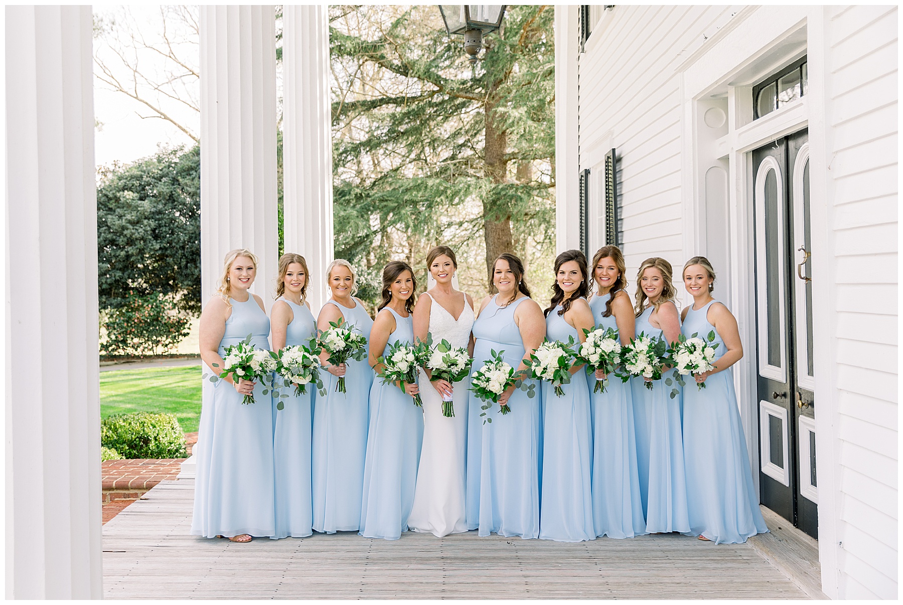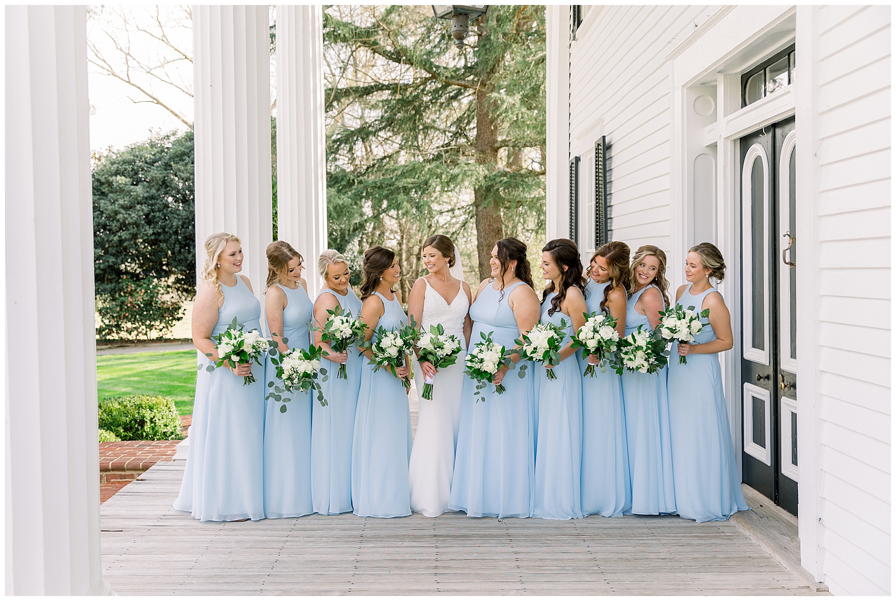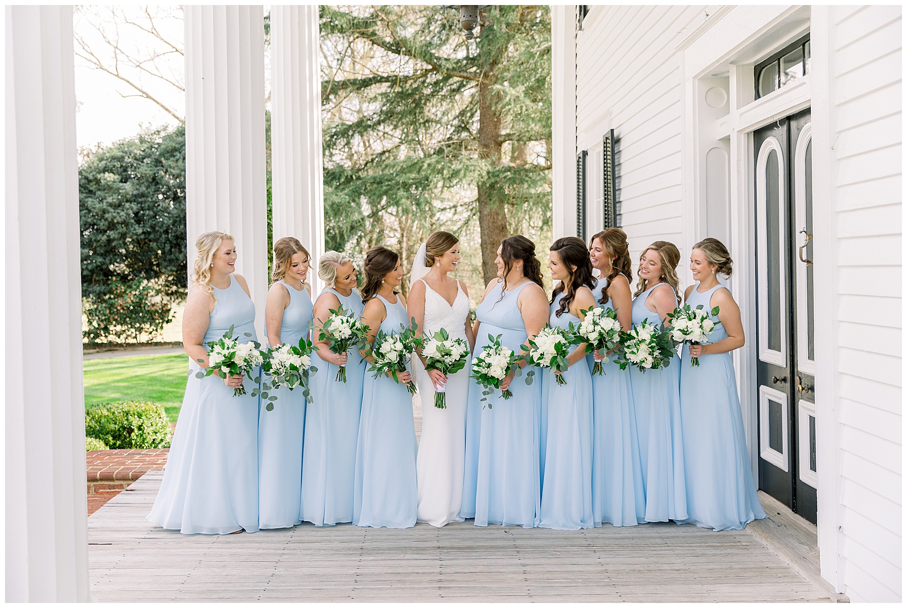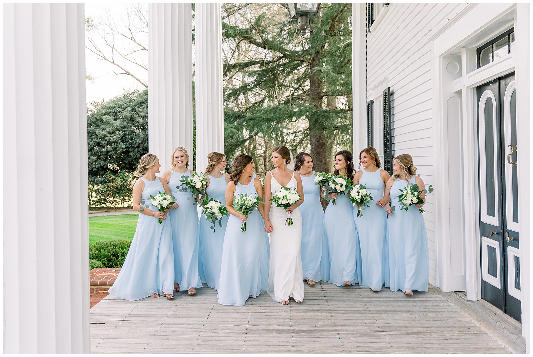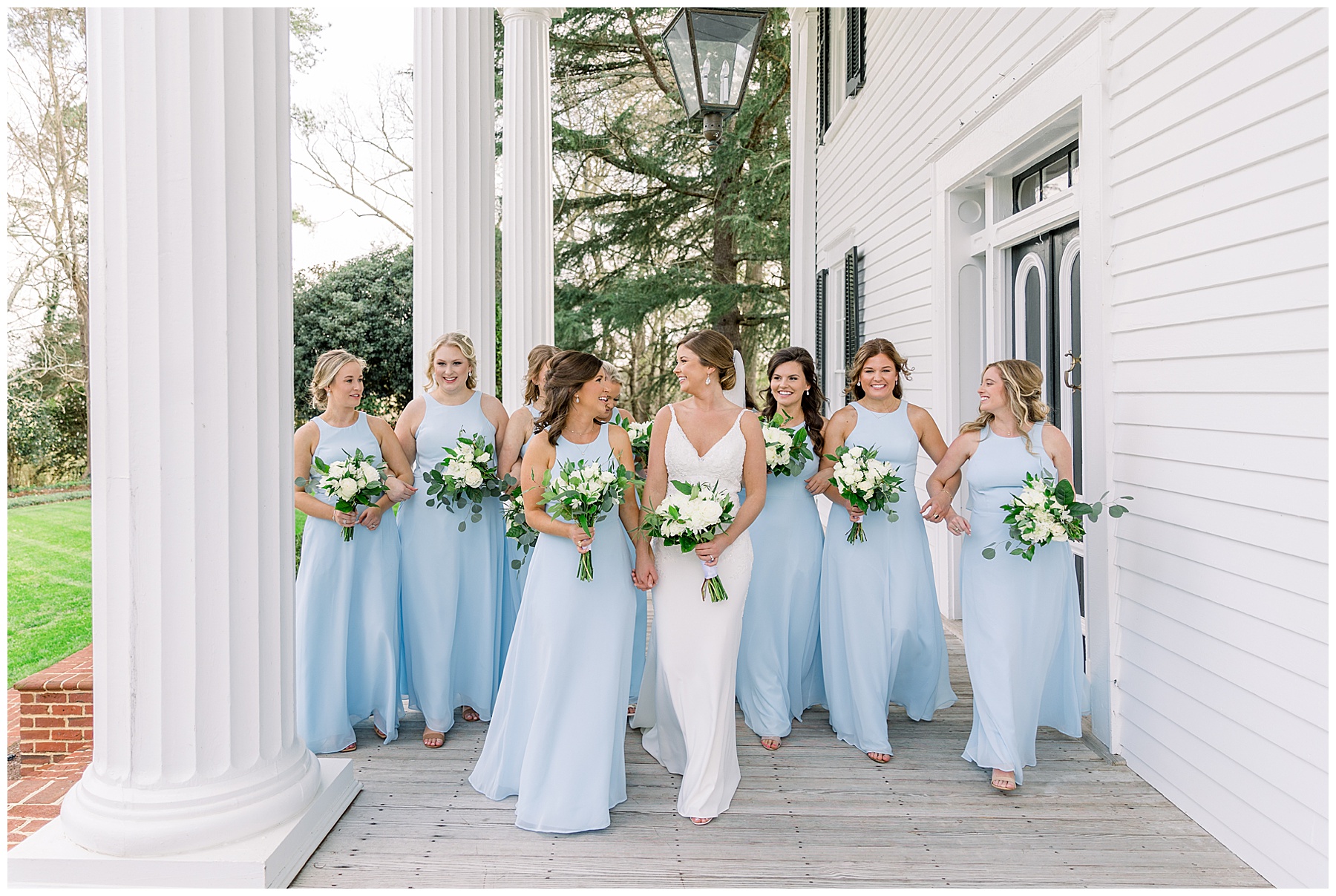 I loved getting to know Molly’s sweet bridesmaids. Cutchin’s 3 sisters were bridesmaids, and the relationship Molly has with them is really amazing! They were all so precious. One of my favorite parts of getting ready was when Molly got into her dress. Her sister Katherine started tearing up watching her little sister get ready, and having 2 younger sisters myself it hit home and I totally felt her emotions!!!! It was soooooo sweet!!! Molly had the cutest First Look with all her girls, and then one with her dad! It was a windy day outside, so we were grateful to have the front porch for all the portraits to block the wind for us! The blue bridesmaids dresses with all the white columns looked absolutely beautiful!