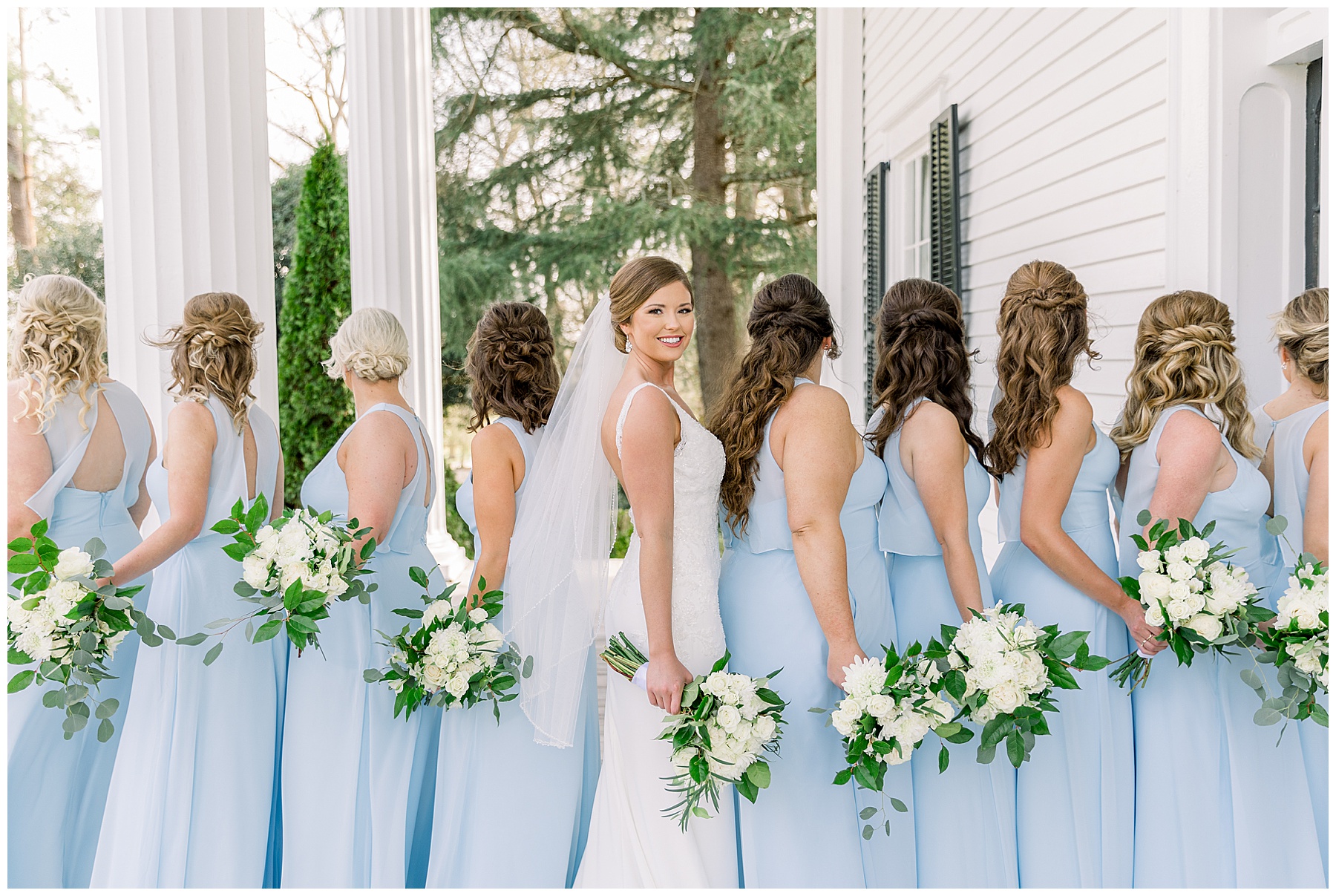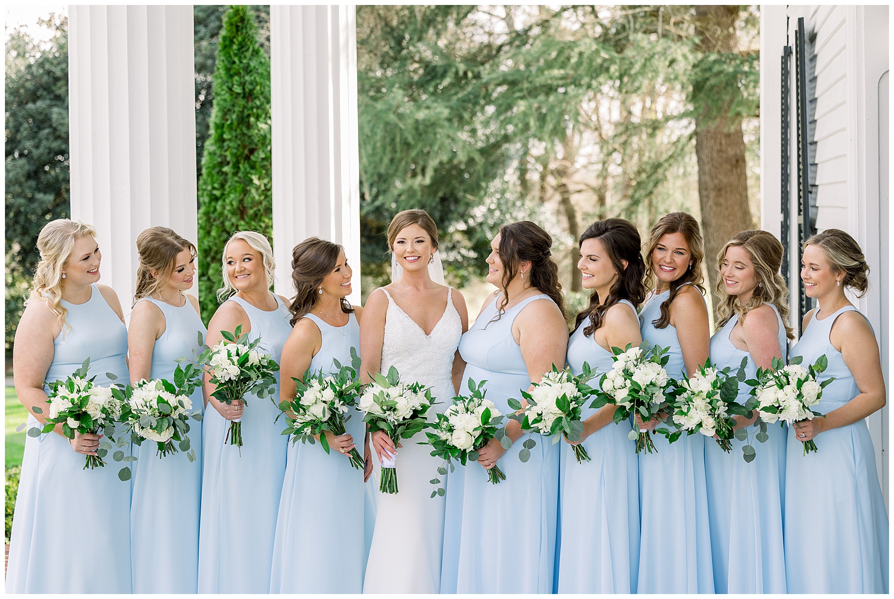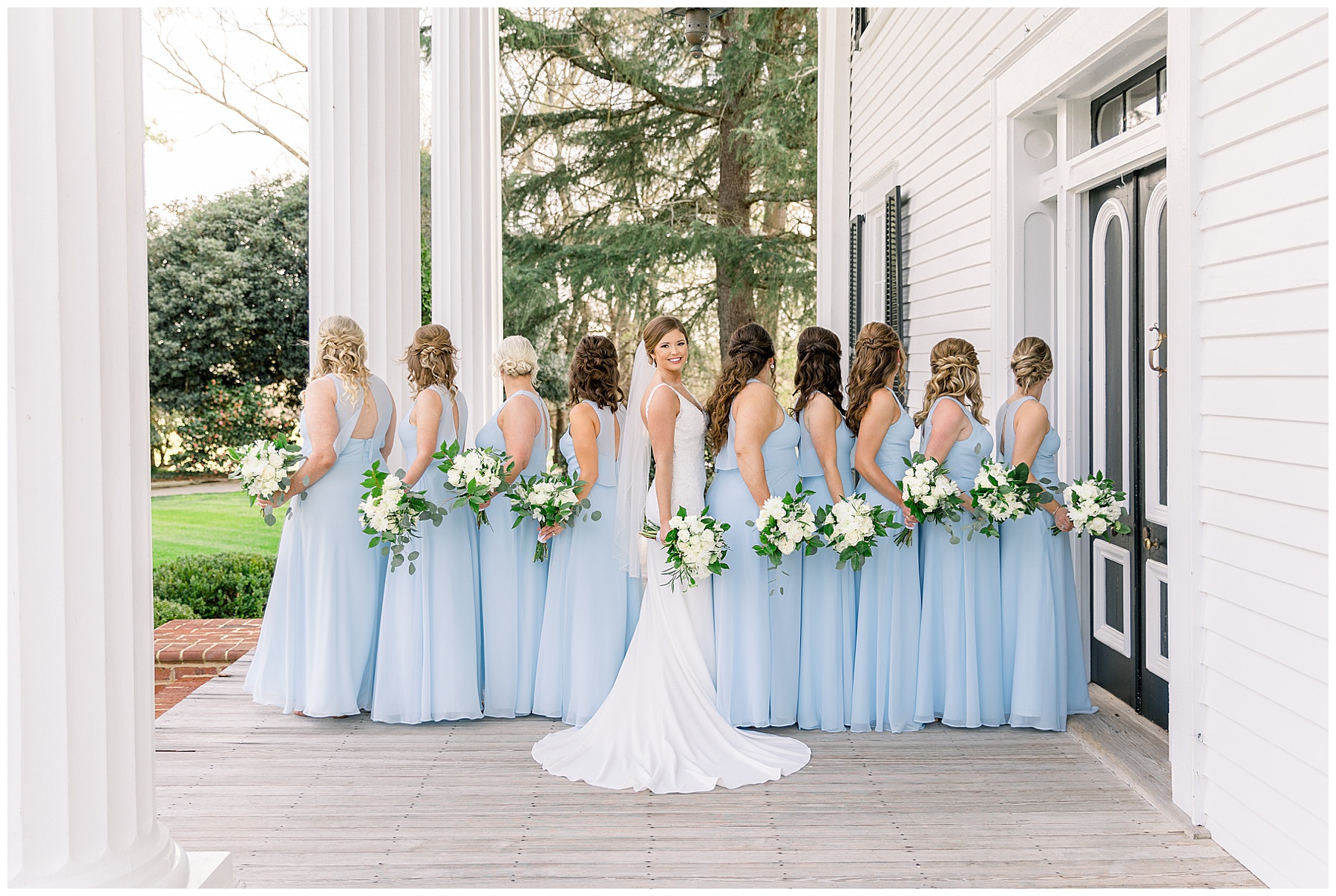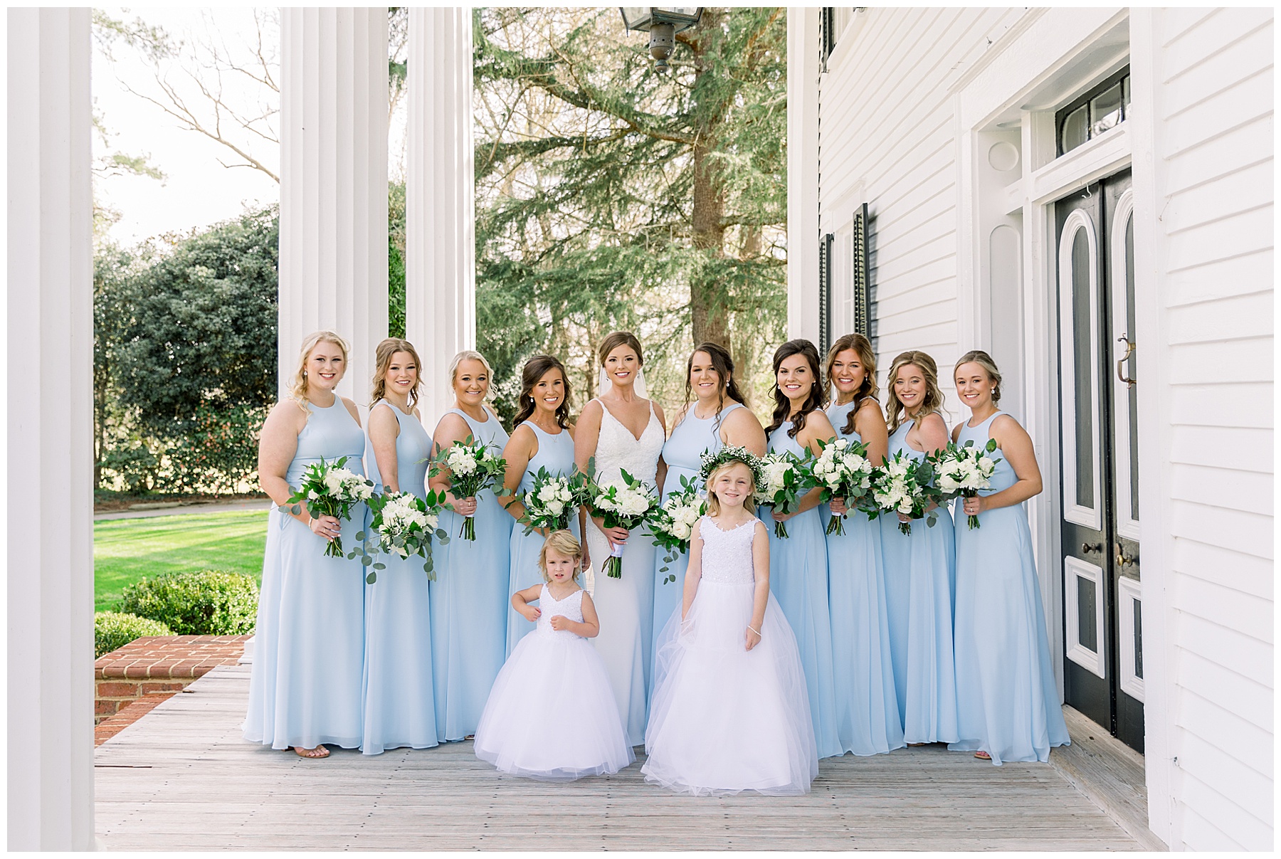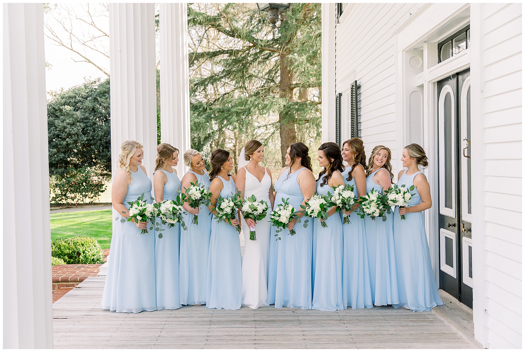 I loved getting to know Molly’s sweet bridesmaids. Cutchin’s 3 sisters were bridesmaids, and the relationship Molly has with them is really amazing! They were all so precious. One of my favorite parts of getting ready was when Molly got into her dress. Her sister Katherine started tearing up watching her little sister get ready, and having 2 younger sisters myself it hit home and I totally felt her emotions!!!! It was soooooo sweet!!! Molly had the cutest First Look with all her girls, and then one with her dad! It was a windy day outside, so we were grateful to have the front porch for all the portraits to block the wind for us! The blue bridesmaids dresses with all the white columns looked absolutely beautiful!
