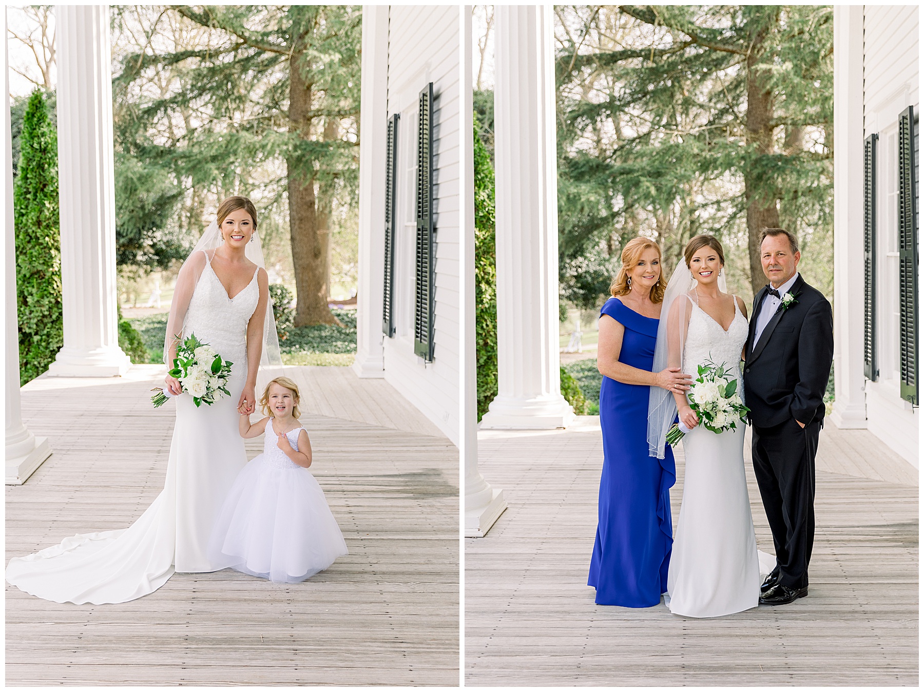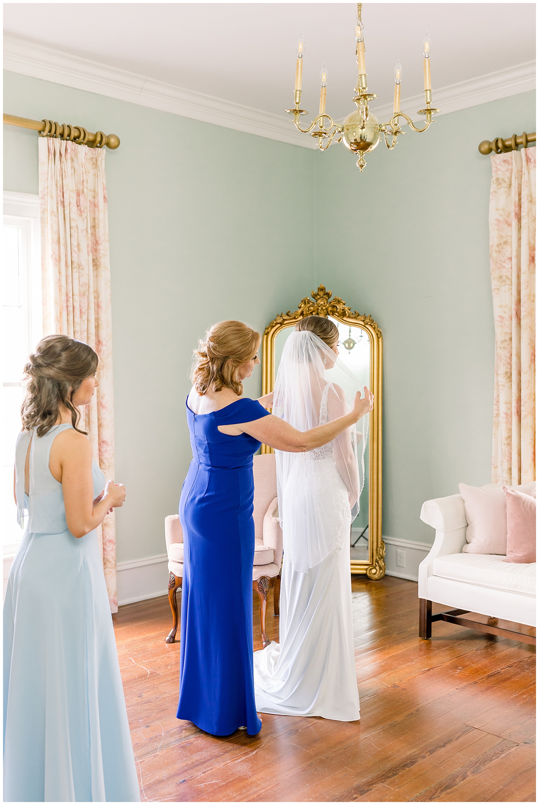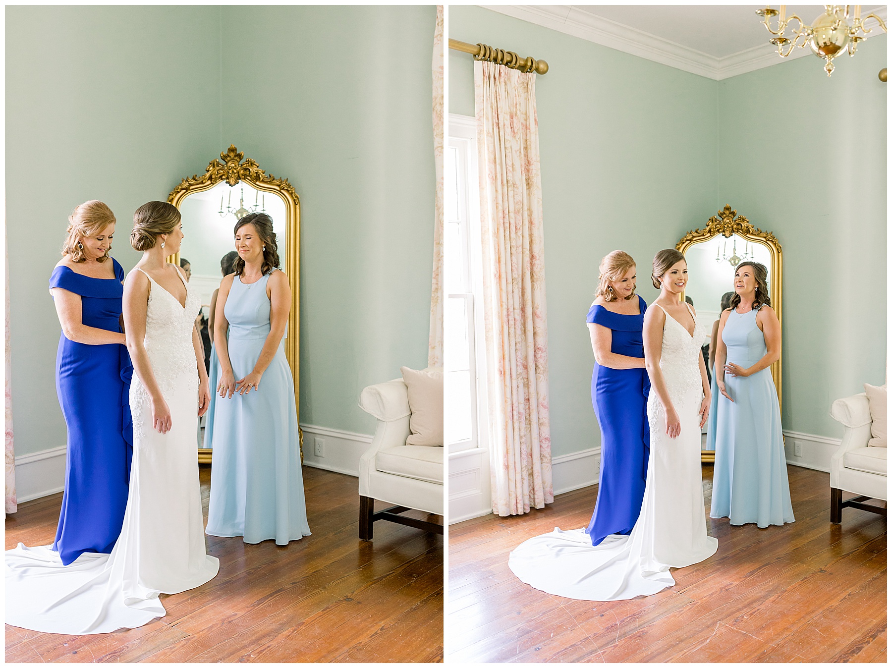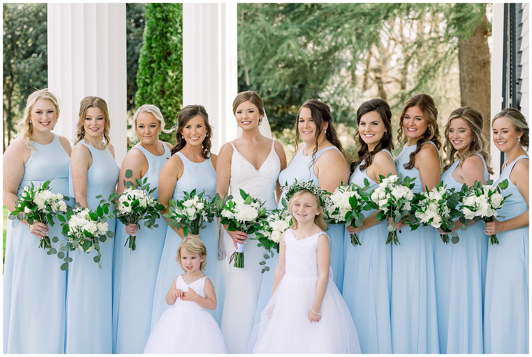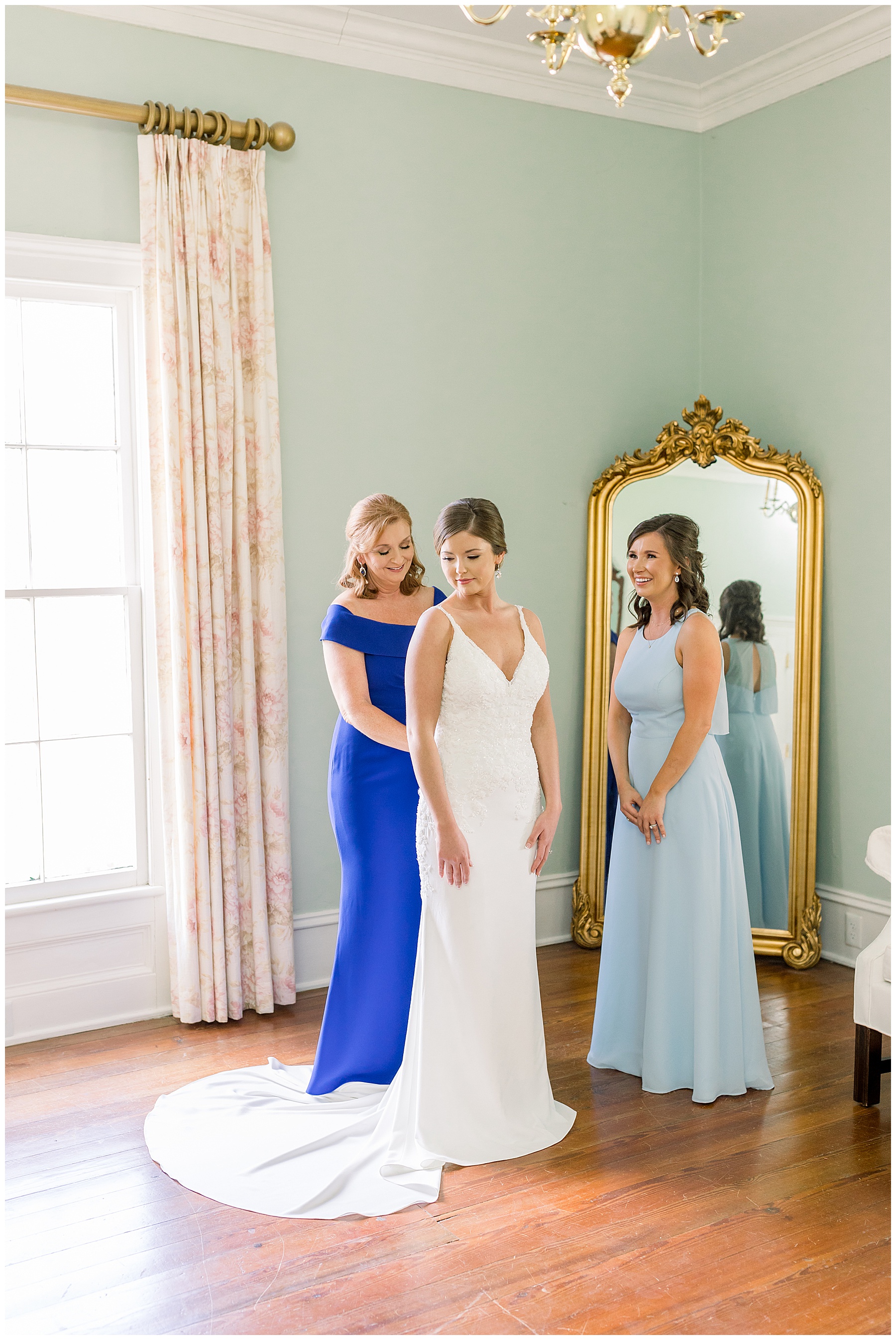 I loved getting to know Molly’s sweet bridesmaids. Cutchin’s 3 sisters were bridesmaids, and the relationship Molly has with them is really amazing! They were all so precious. One of my favorite parts of getting ready was when Molly got into her dress. Her sister Katherine started tearing up watching her little sister get ready, and having 2 younger sisters myself it hit home and I totally felt her emotions!!!! It was soooooo sweet!!! Molly had the cutest First Look with all her girls, and then one with her dad! It was a windy day outside, so we were grateful to have the front porch for all the portraits to block the wind for us! The blue bridesmaids dresses with all the white columns looked absolutely beautiful!
