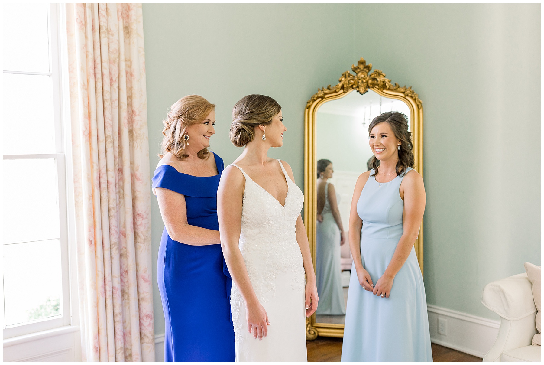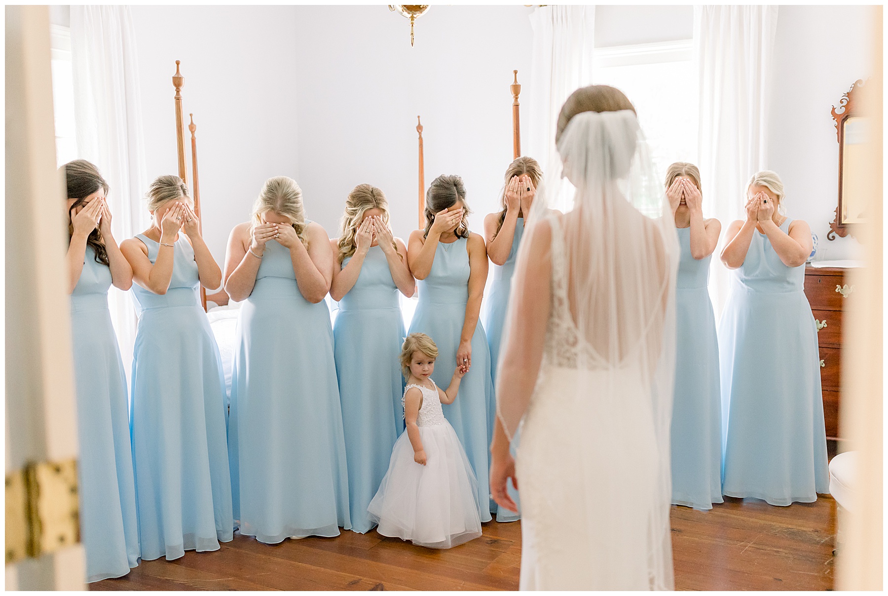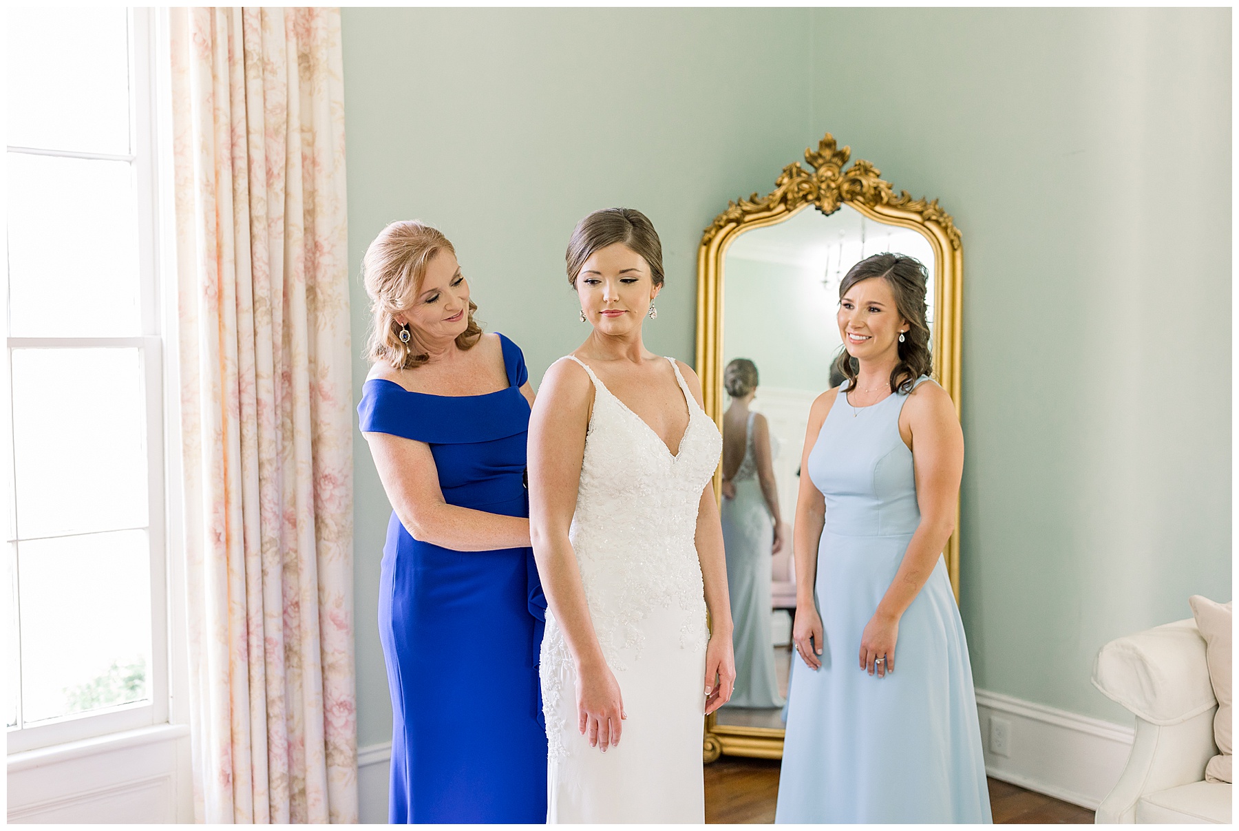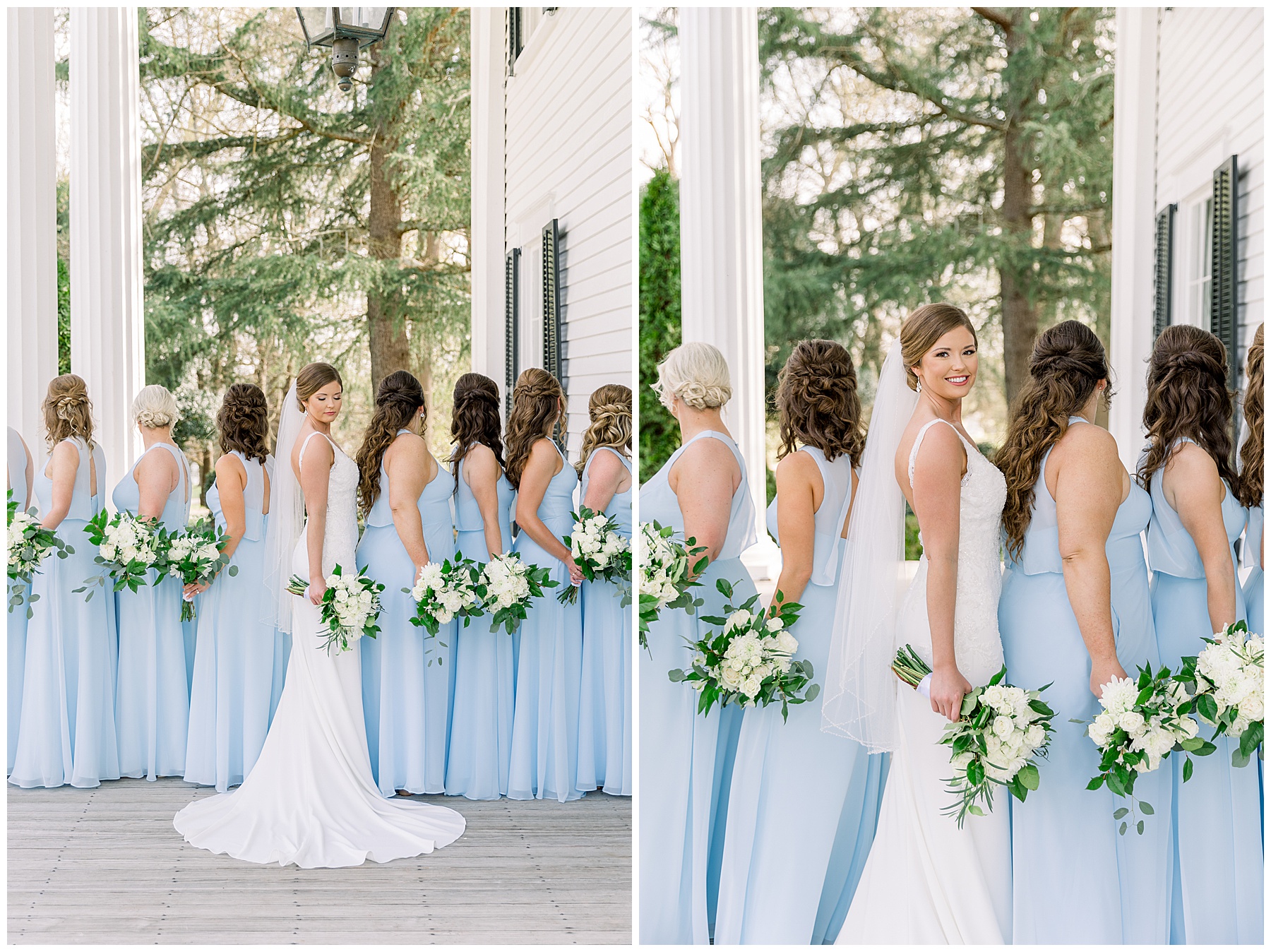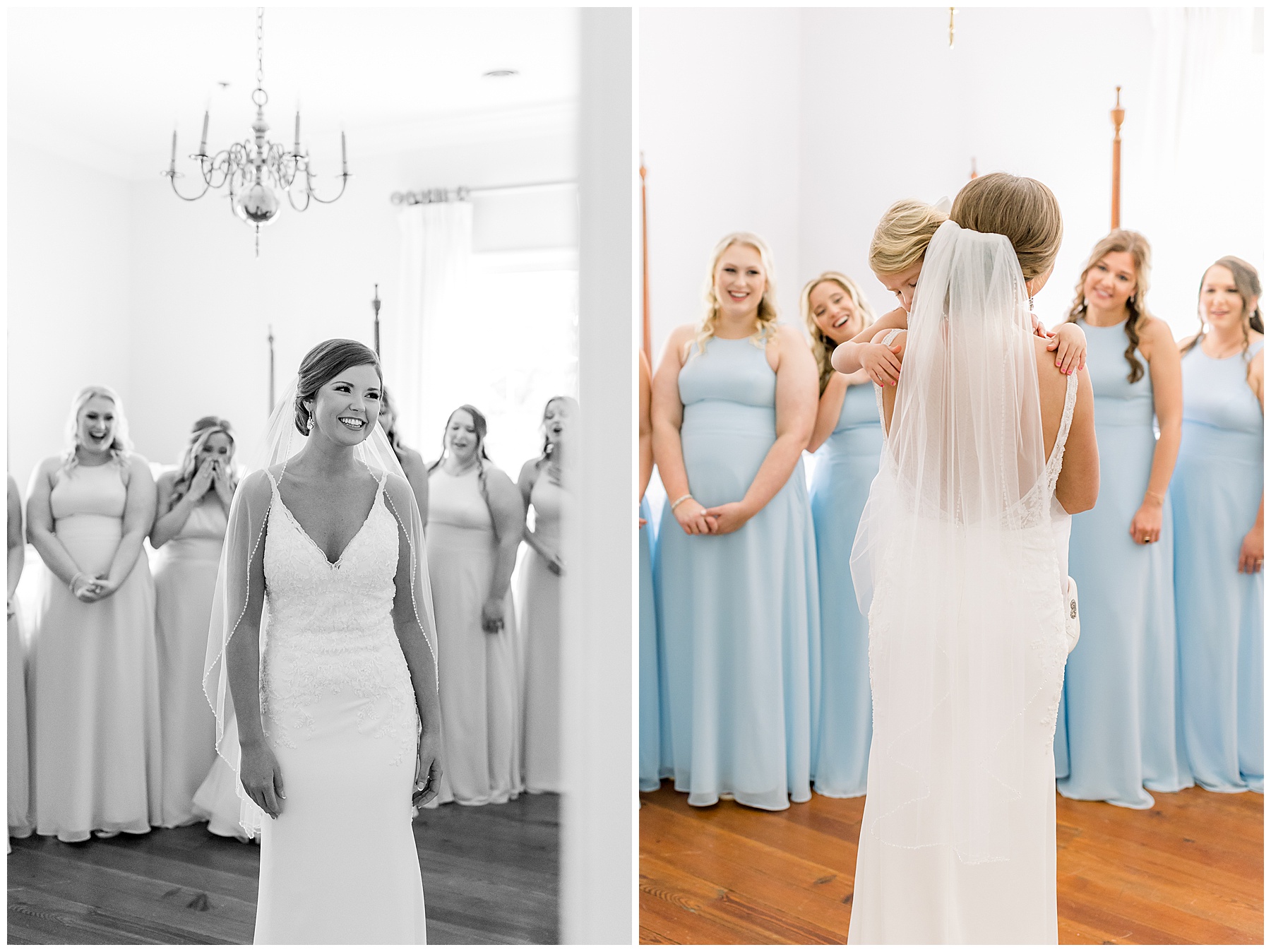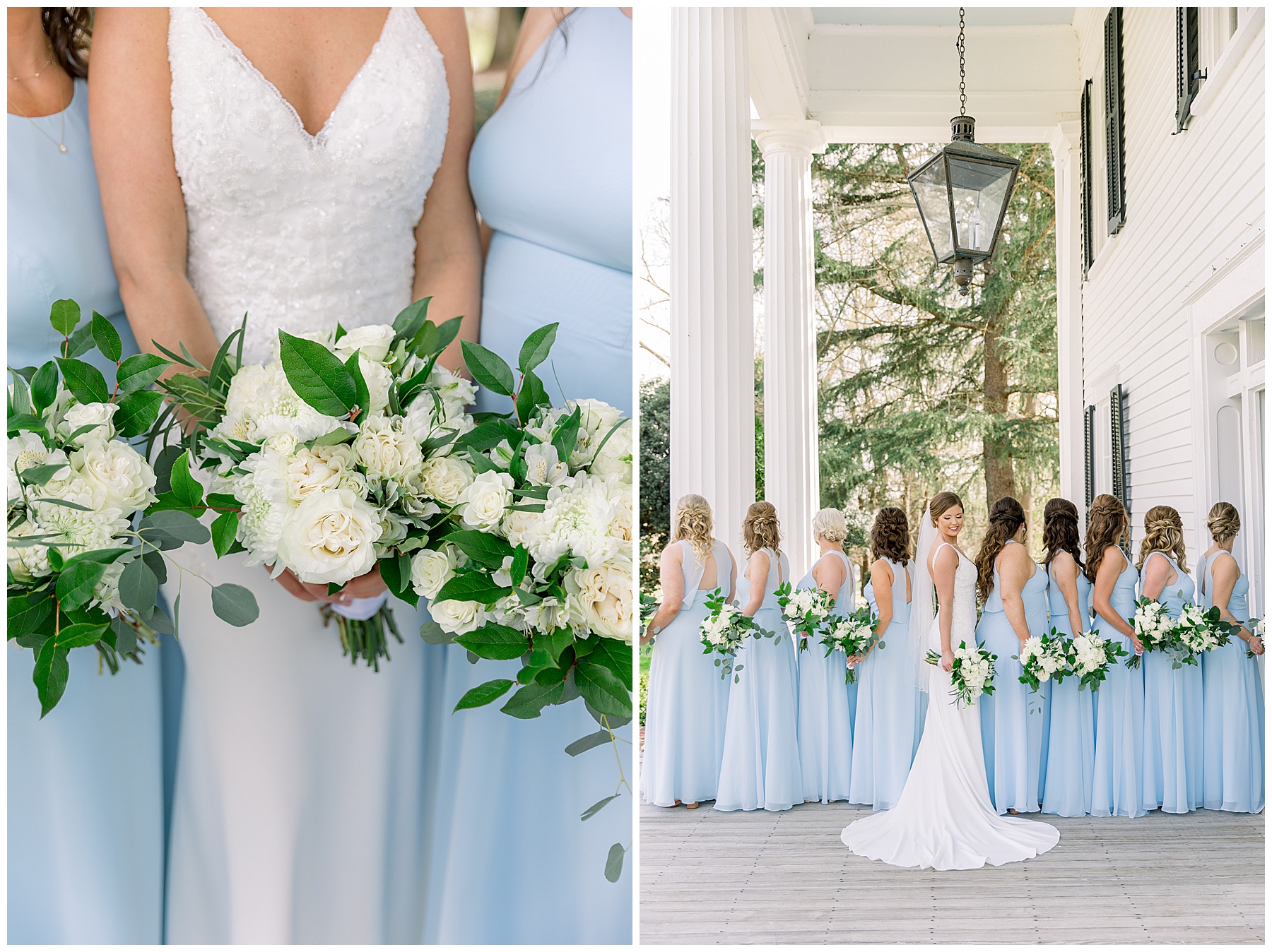 I loved getting to know Molly’s sweet bridesmaids. Cutchin’s 3 sisters were bridesmaids, and the relationship Molly has with them is really amazing! They were all so precious. One of my favorite parts of getting ready was when Molly got into her dress. Her sister Katherine started tearing up watching her little sister get ready, and having 2 younger sisters myself it hit home and I totally felt her emotions!!!! It was soooooo sweet!!! Molly had the cutest First Look with all her girls, and then one with her dad! It was a windy day outside, so we were grateful to have the front porch for all the portraits to block the wind for us! The blue bridesmaids dresses with all the white columns looked absolutely beautiful!