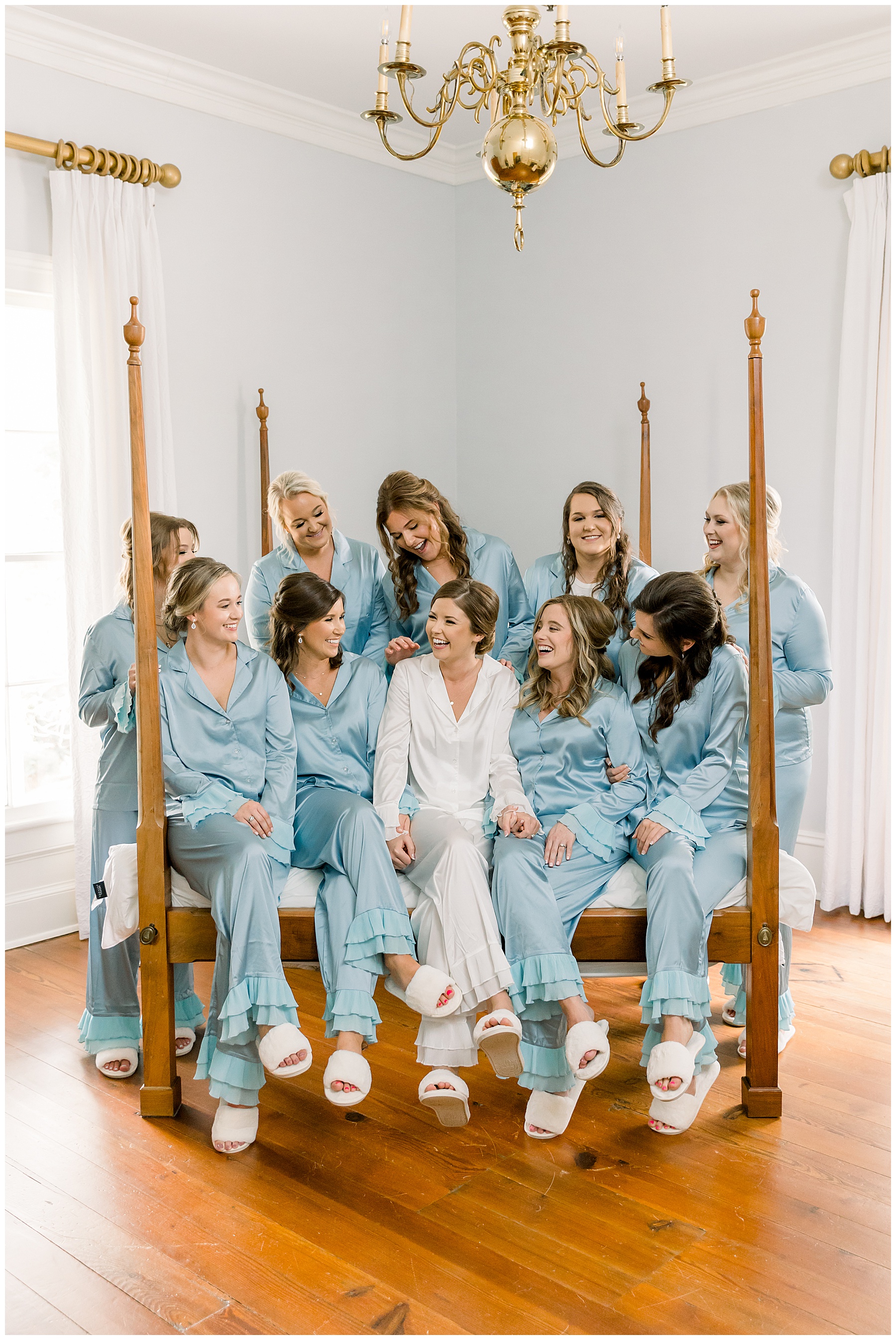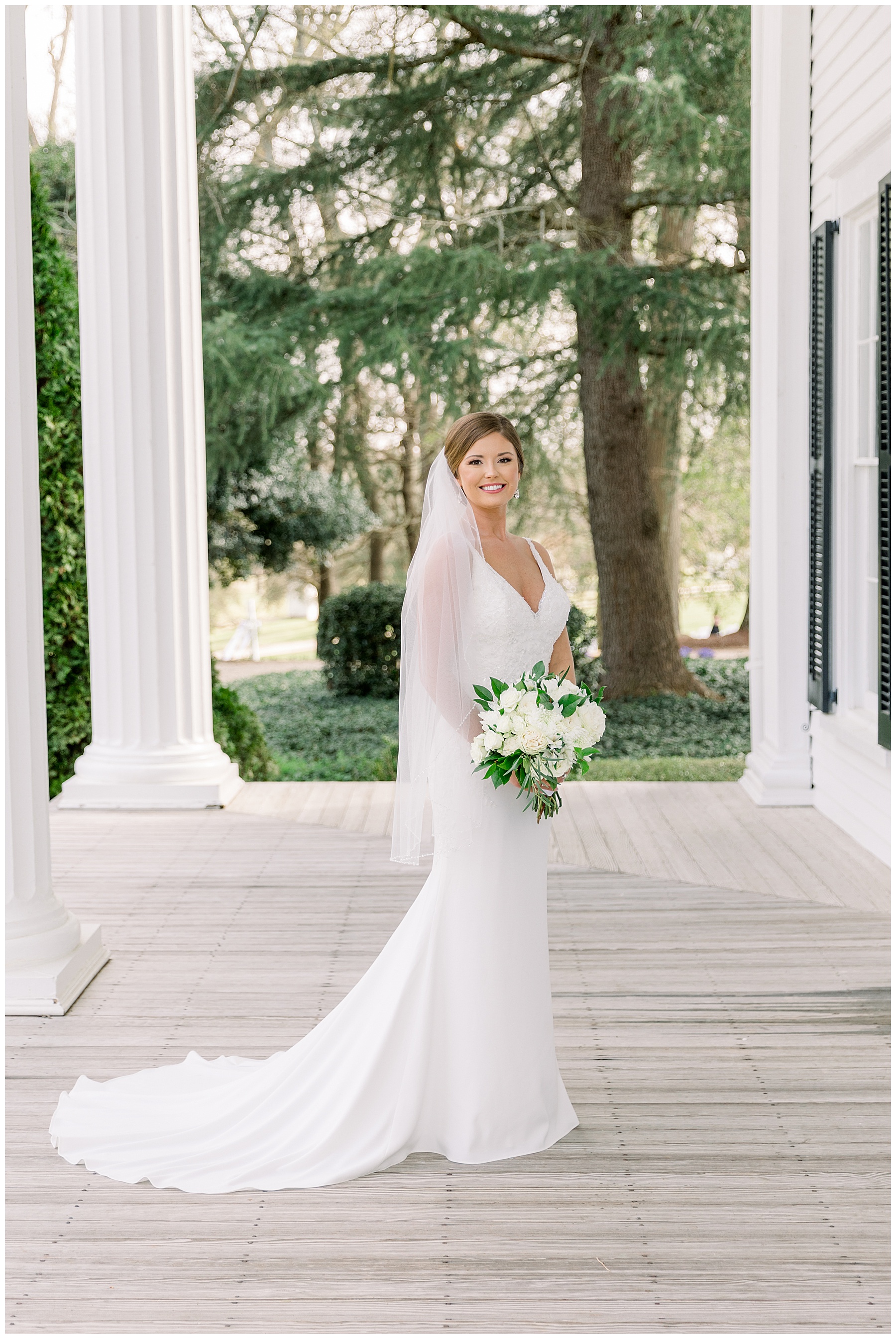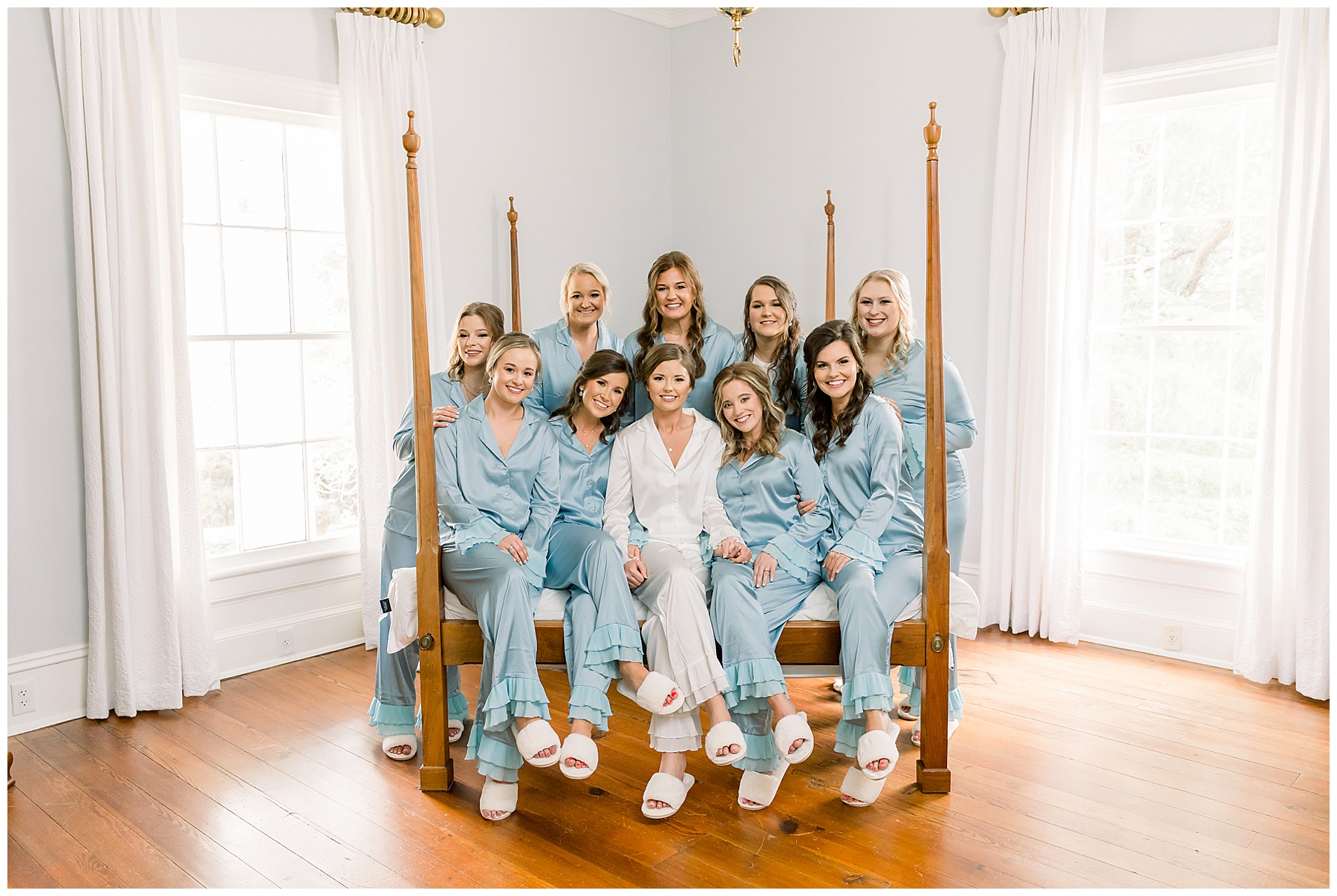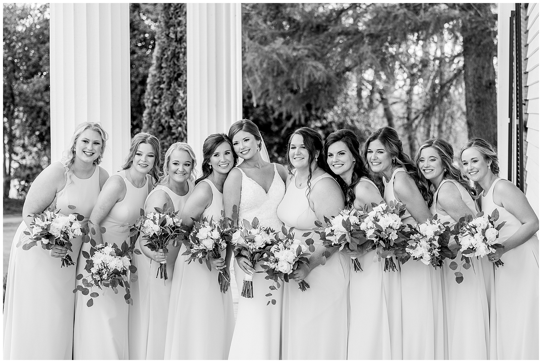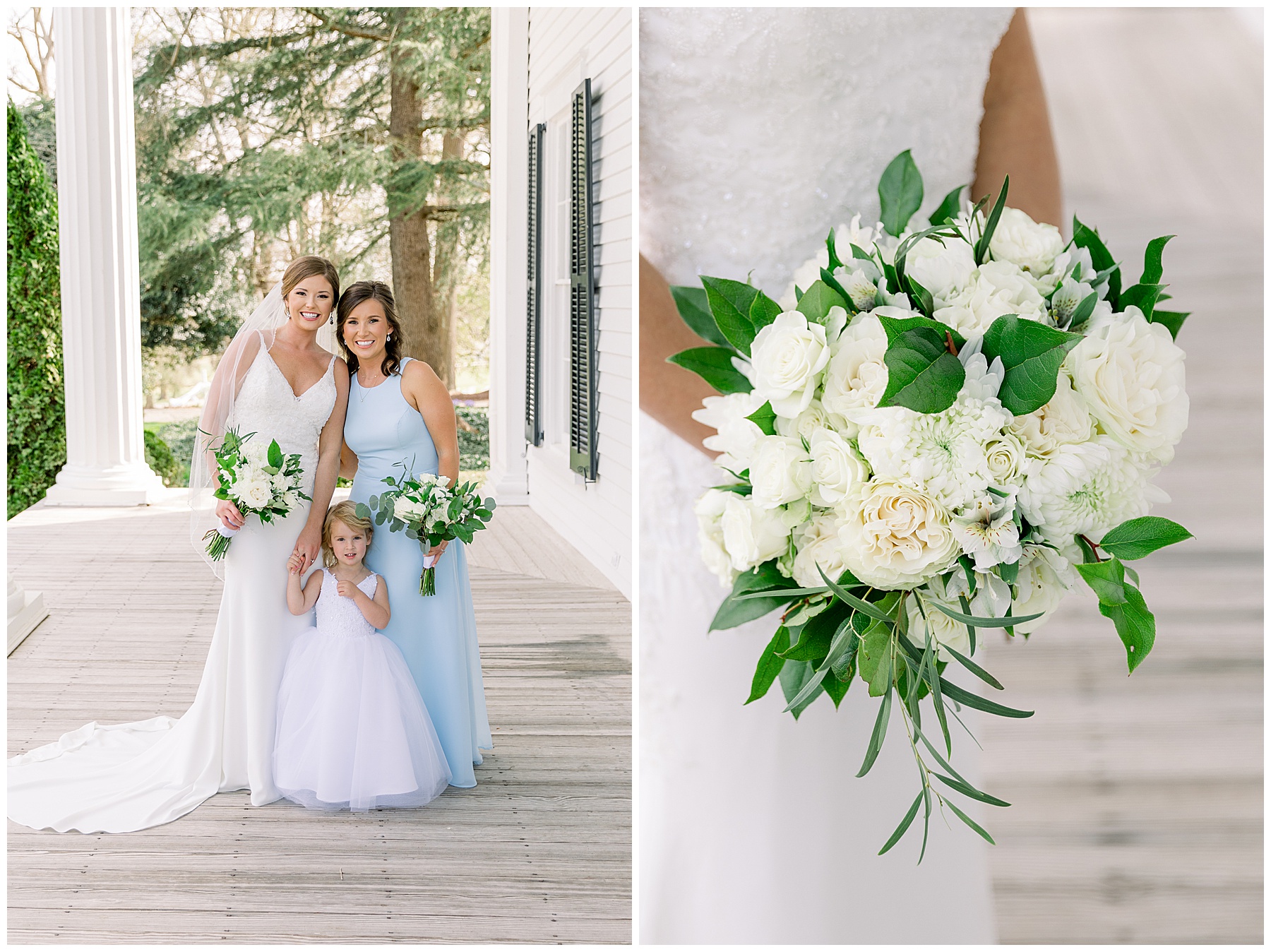 I loved getting to know Molly’s sweet bridesmaids. Cutchin’s 3 sisters were bridesmaids, and the relationship Molly has with them is really amazing! They were all so precious. One of my favorite parts of getting ready was when Molly got into her dress. Her sister Katherine started tearing up watching her little sister get ready, and having 2 younger sisters myself it hit home and I totally felt her emotions!!!! It was soooooo sweet!!! Molly had the cutest First Look with all her girls, and then one with her dad! It was a windy day outside, so we were grateful to have the front porch for all the portraits to block the wind for us! The blue bridesmaids dresses with all the white columns looked absolutely beautiful!